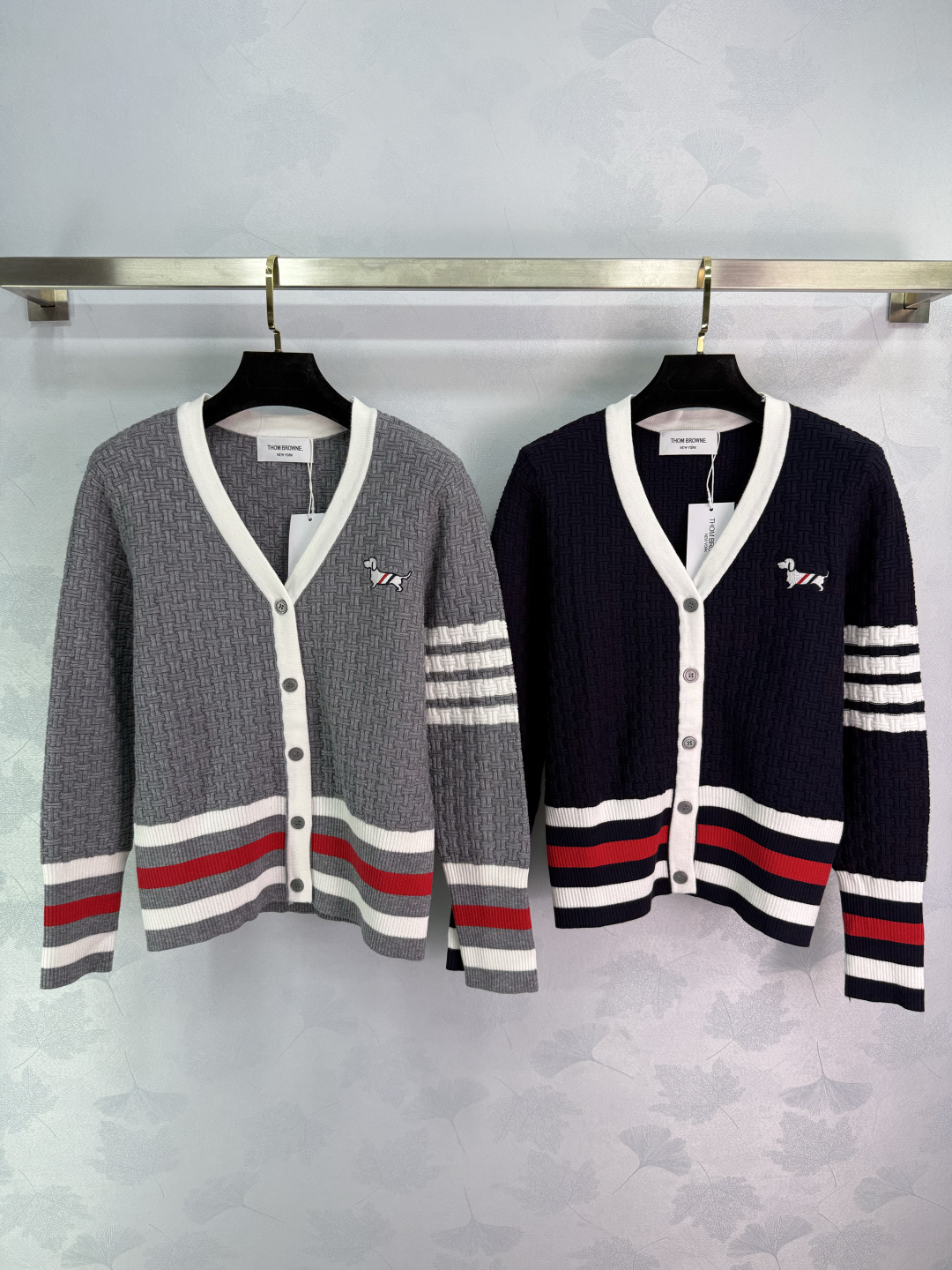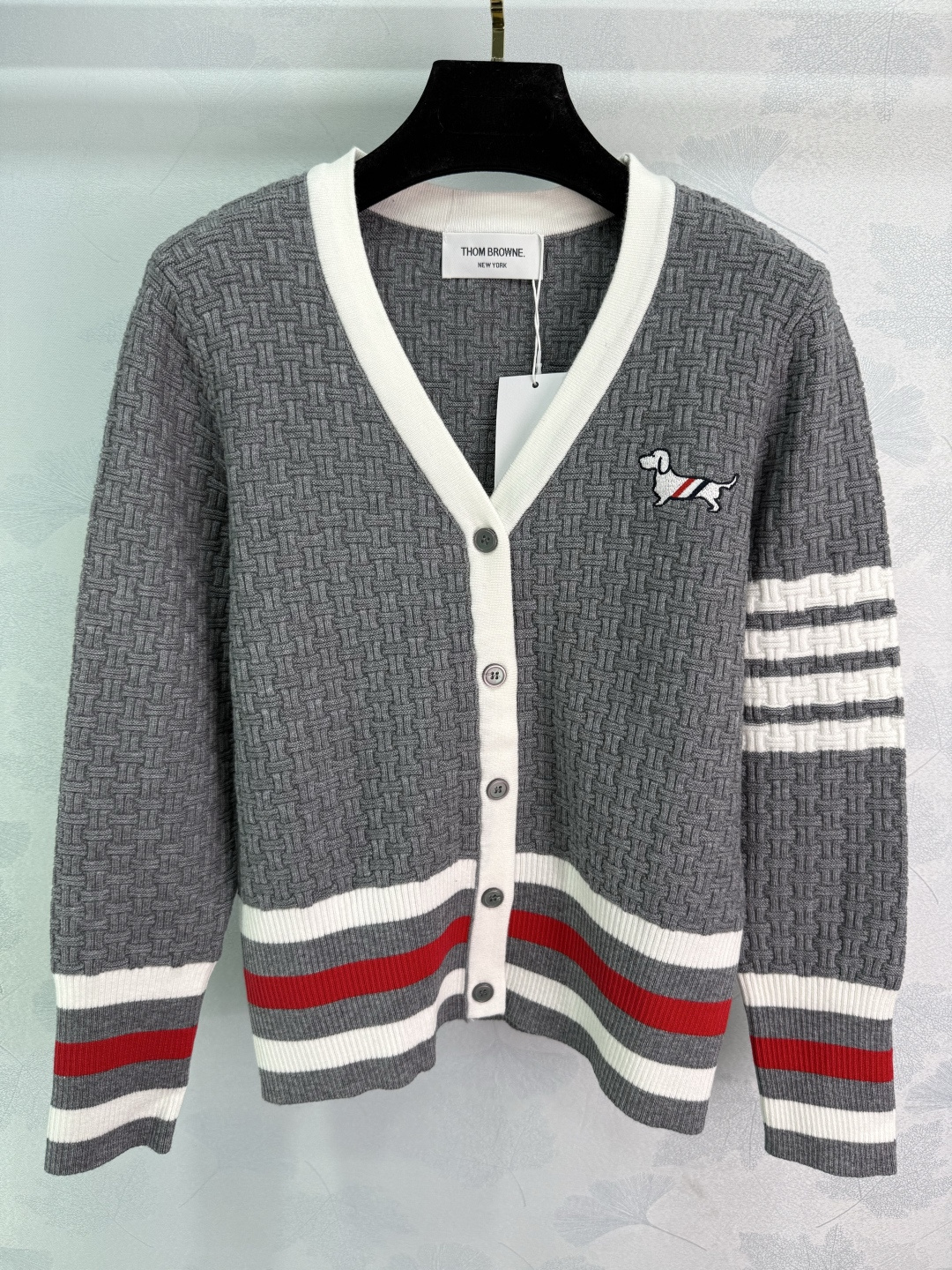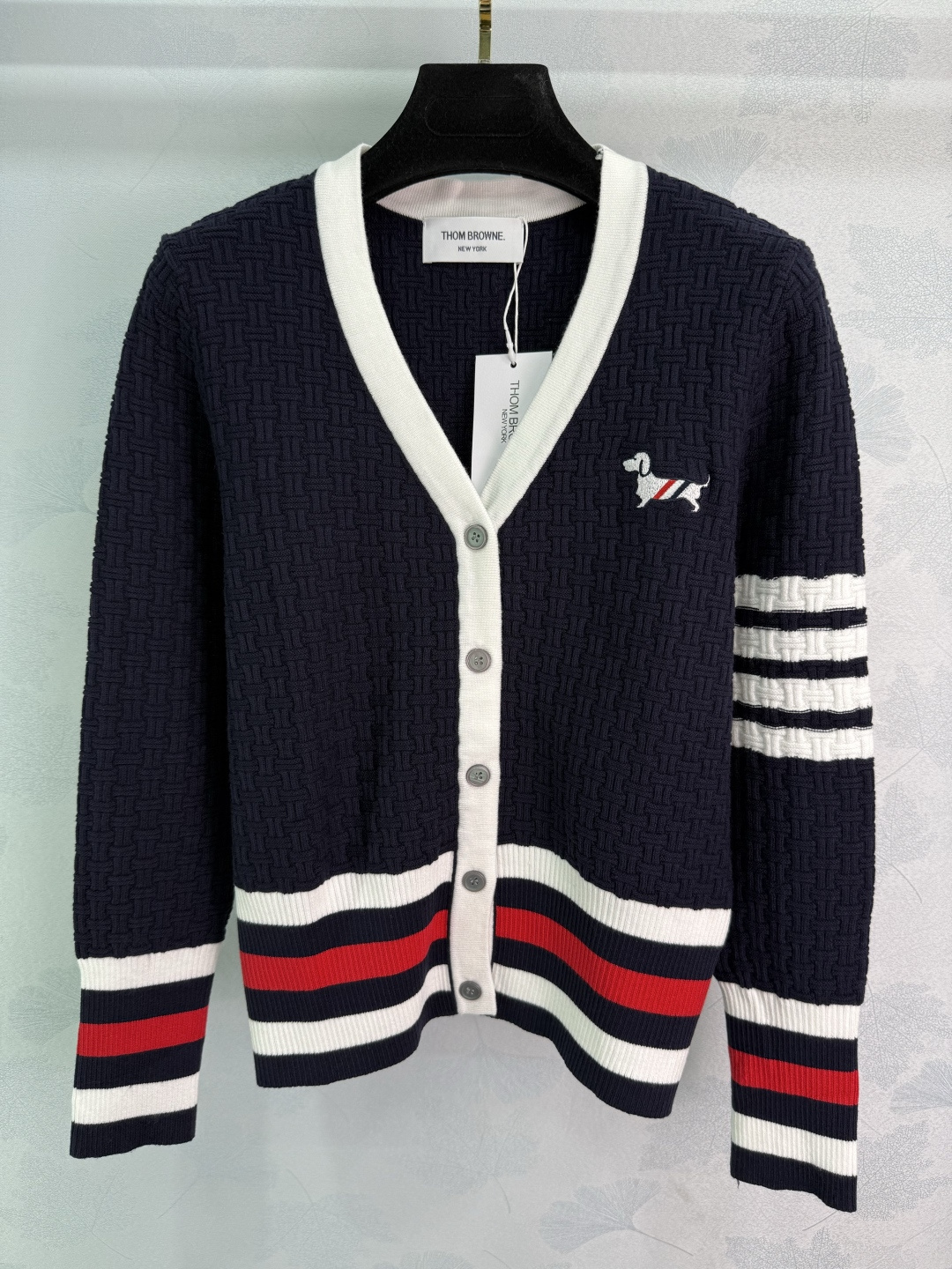 Details: Early autumn dog-embroidered knitted cardigan, classic striped cuffs, V-neck with white trim, slim fit.