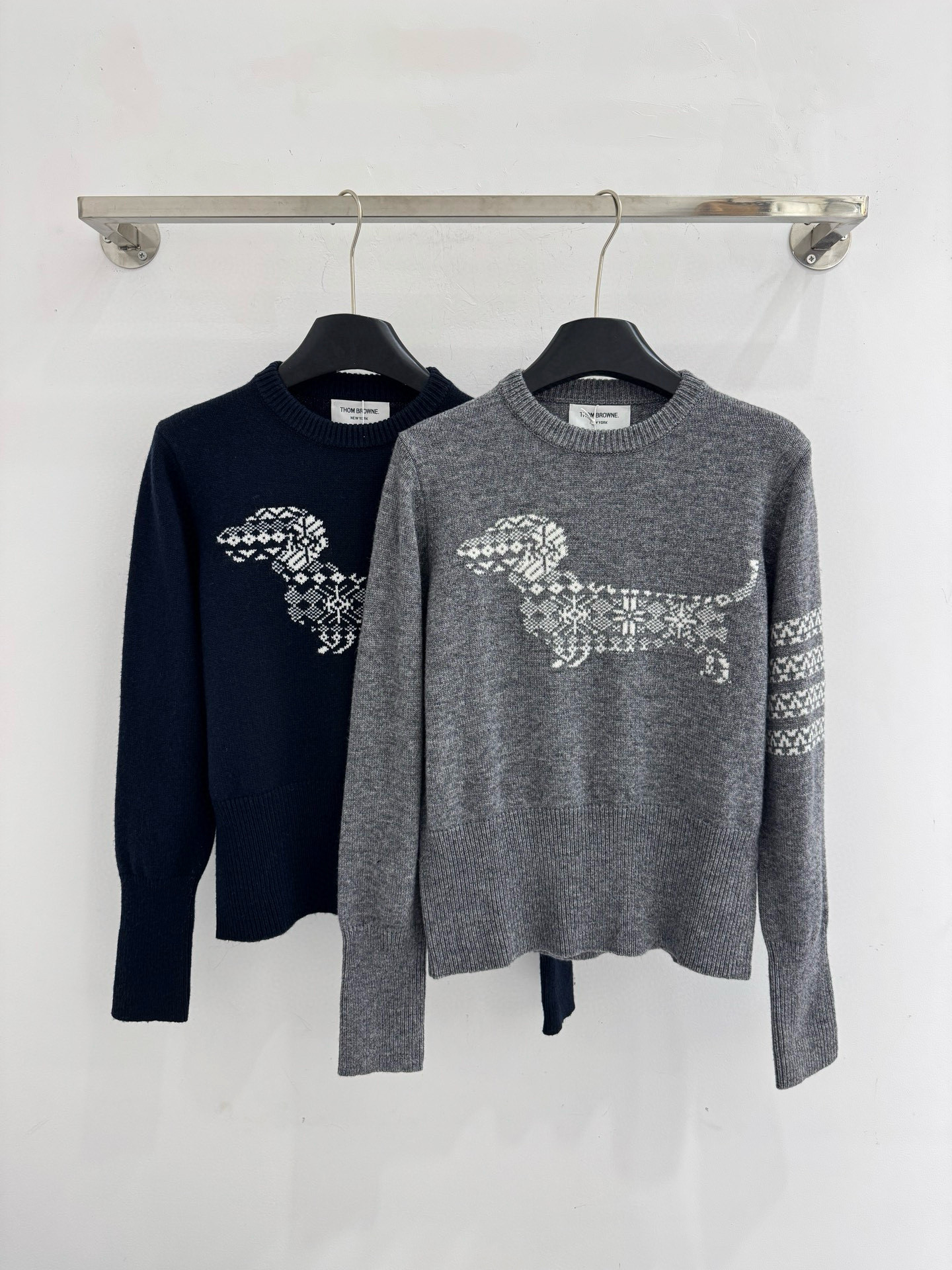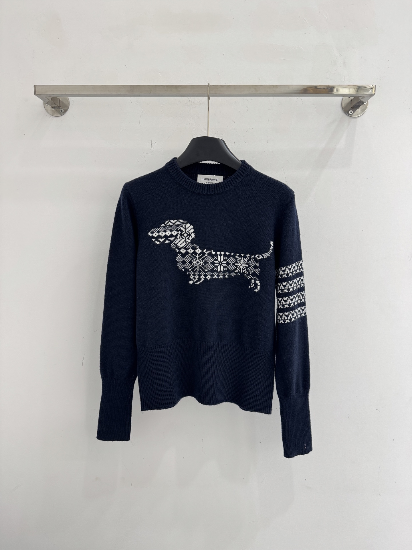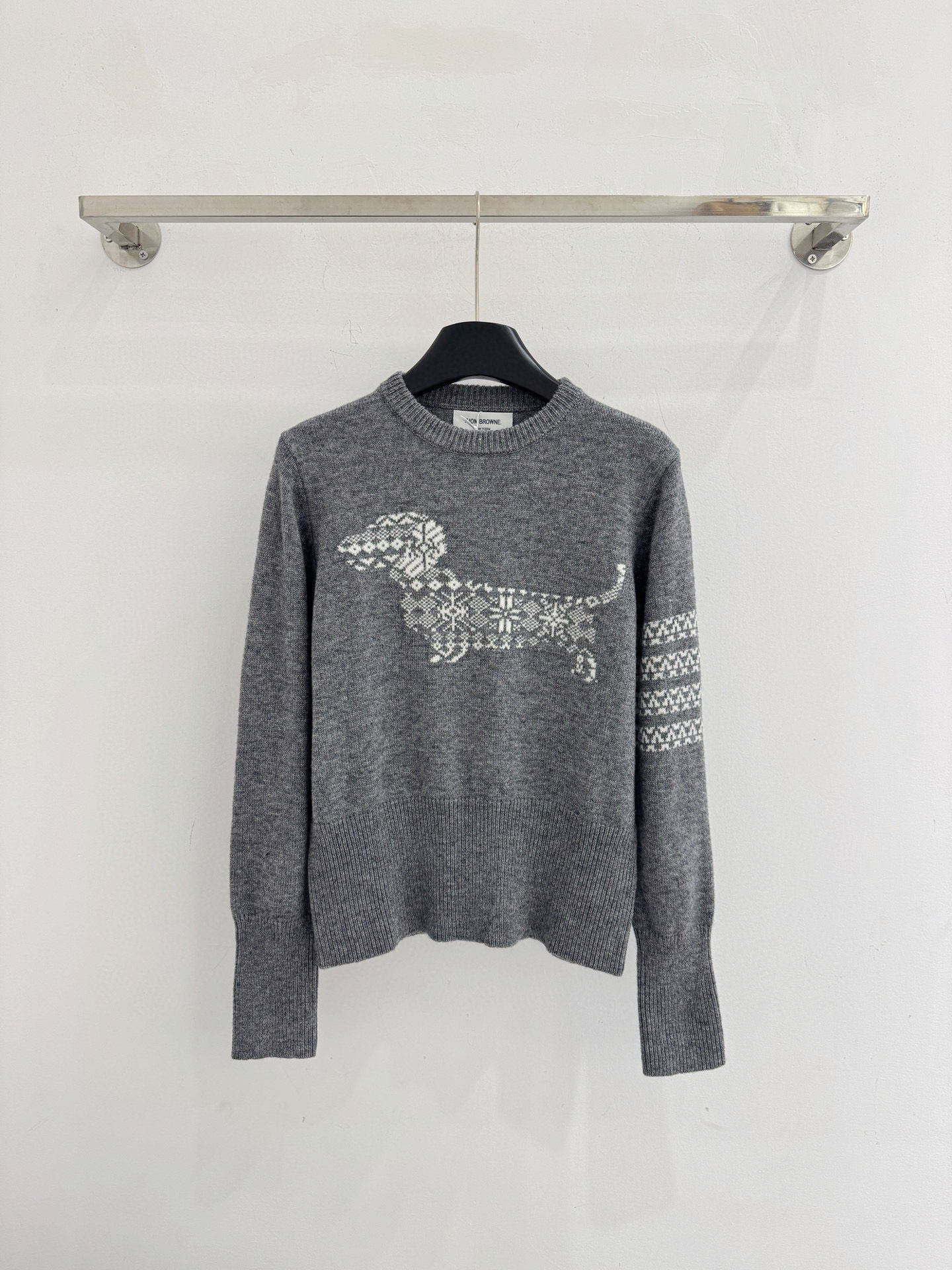 Details: Autumn and winter puppy jacquard round - neck knitted sweater with white stripe details on the left sleeve. High - end customization, fine workmanship