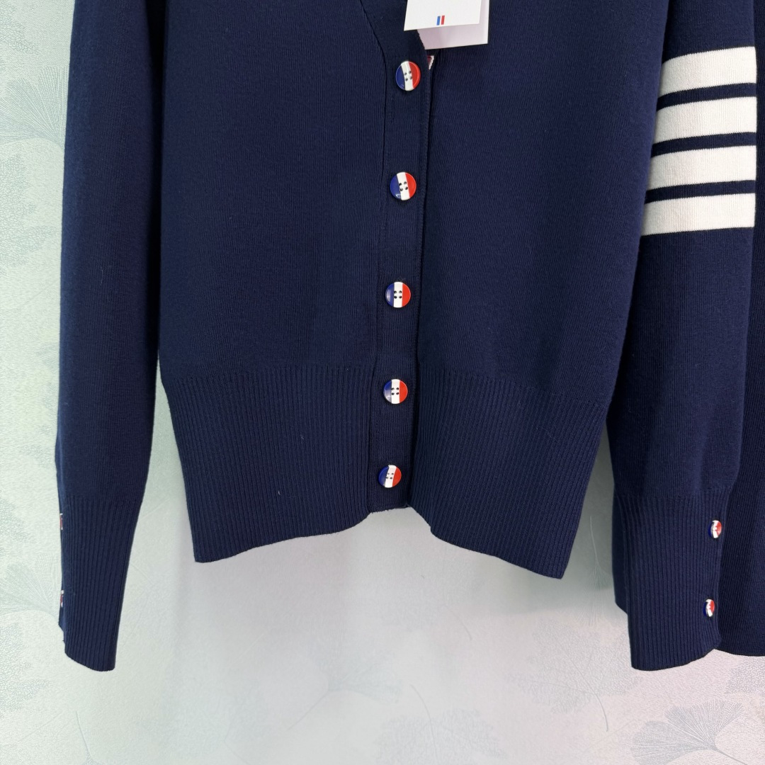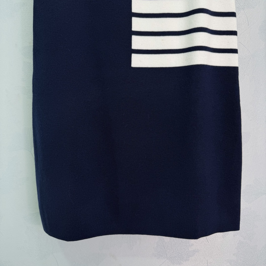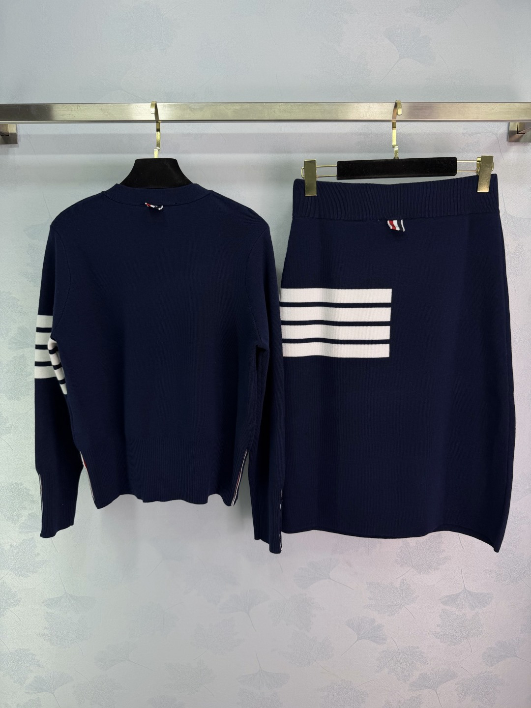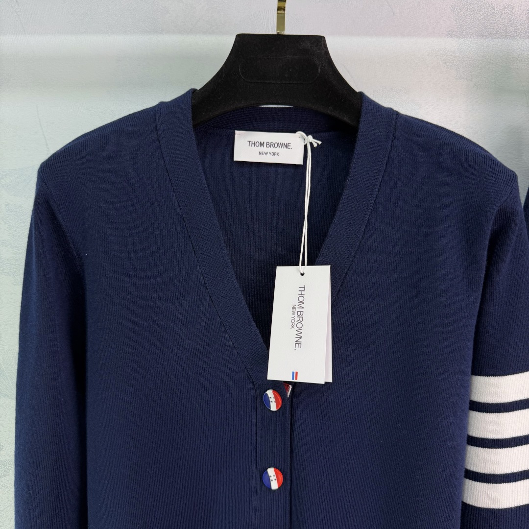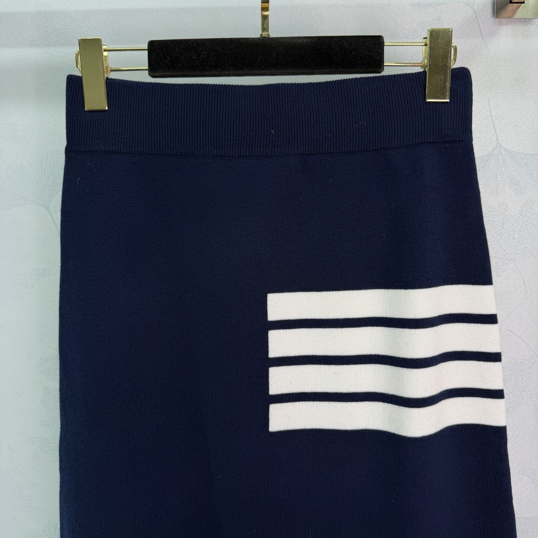 Details: Early spring classic knitted suit with V-neck cardigan and high-waisted skirt, 100% wool, iconic four-bar design, two colors, three sizes.