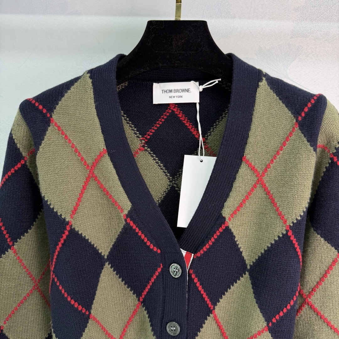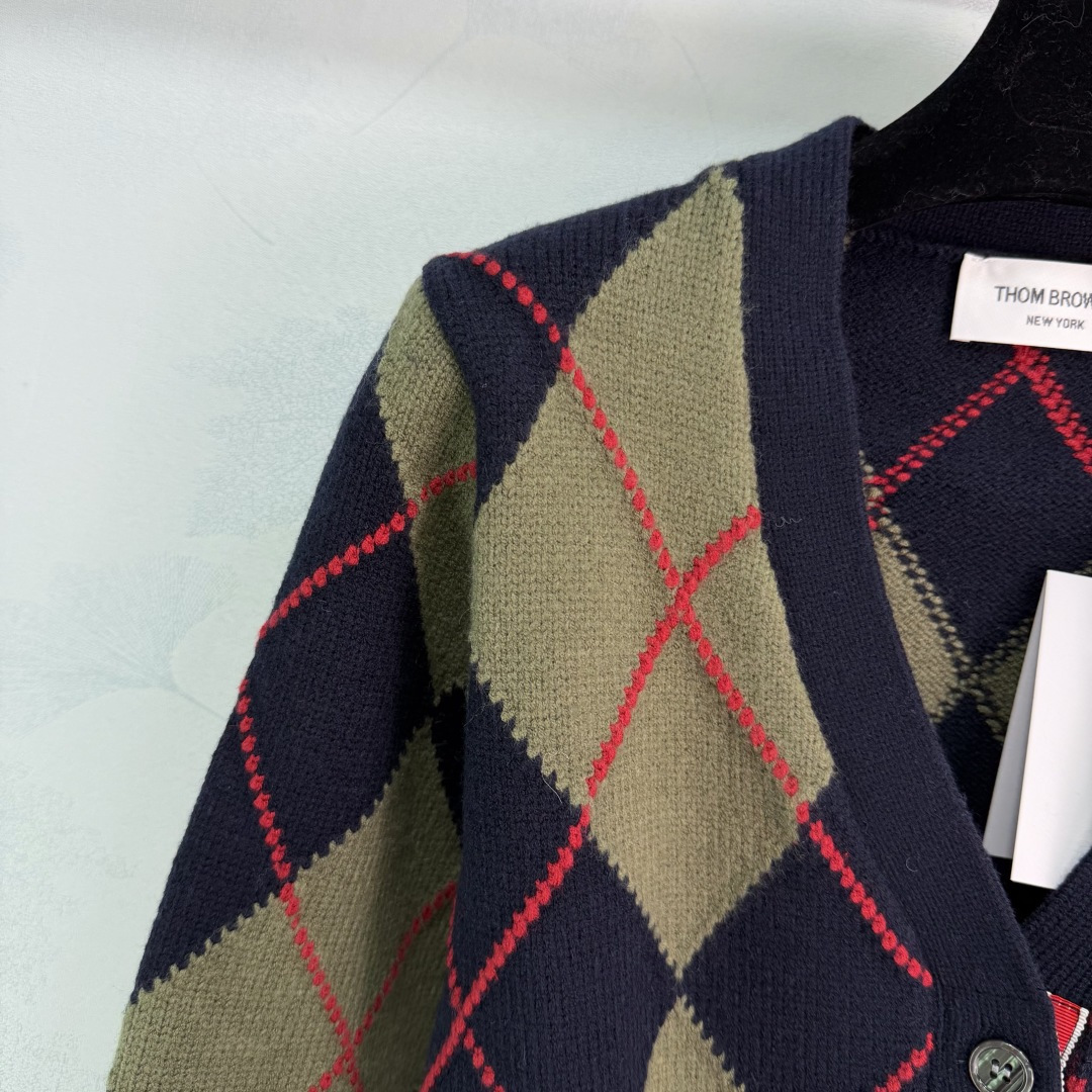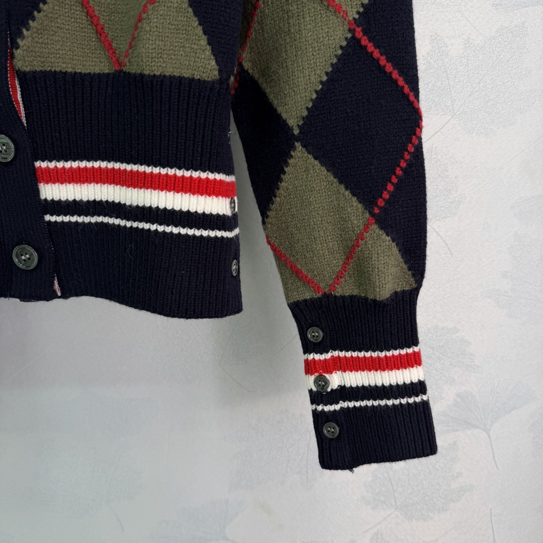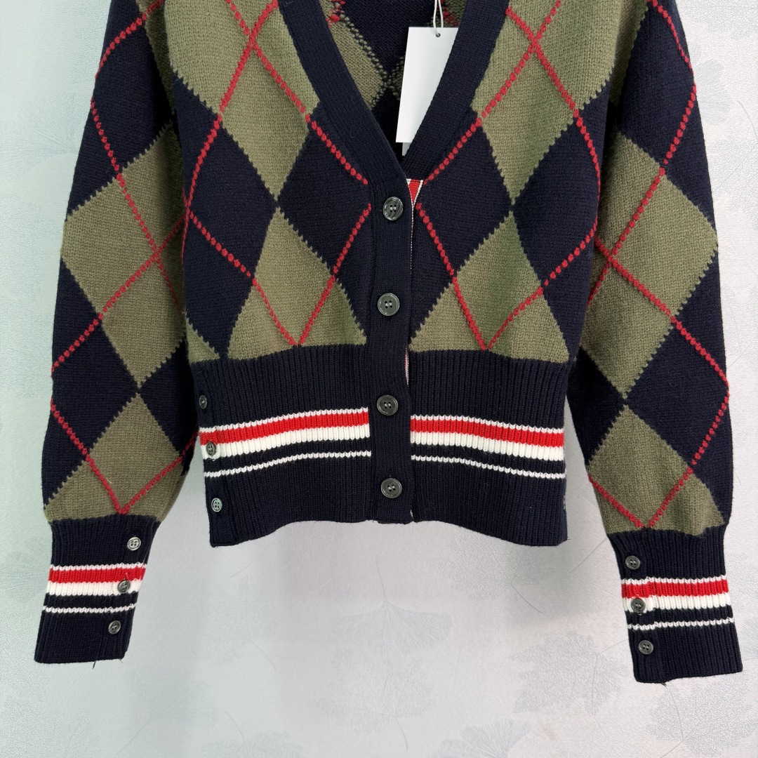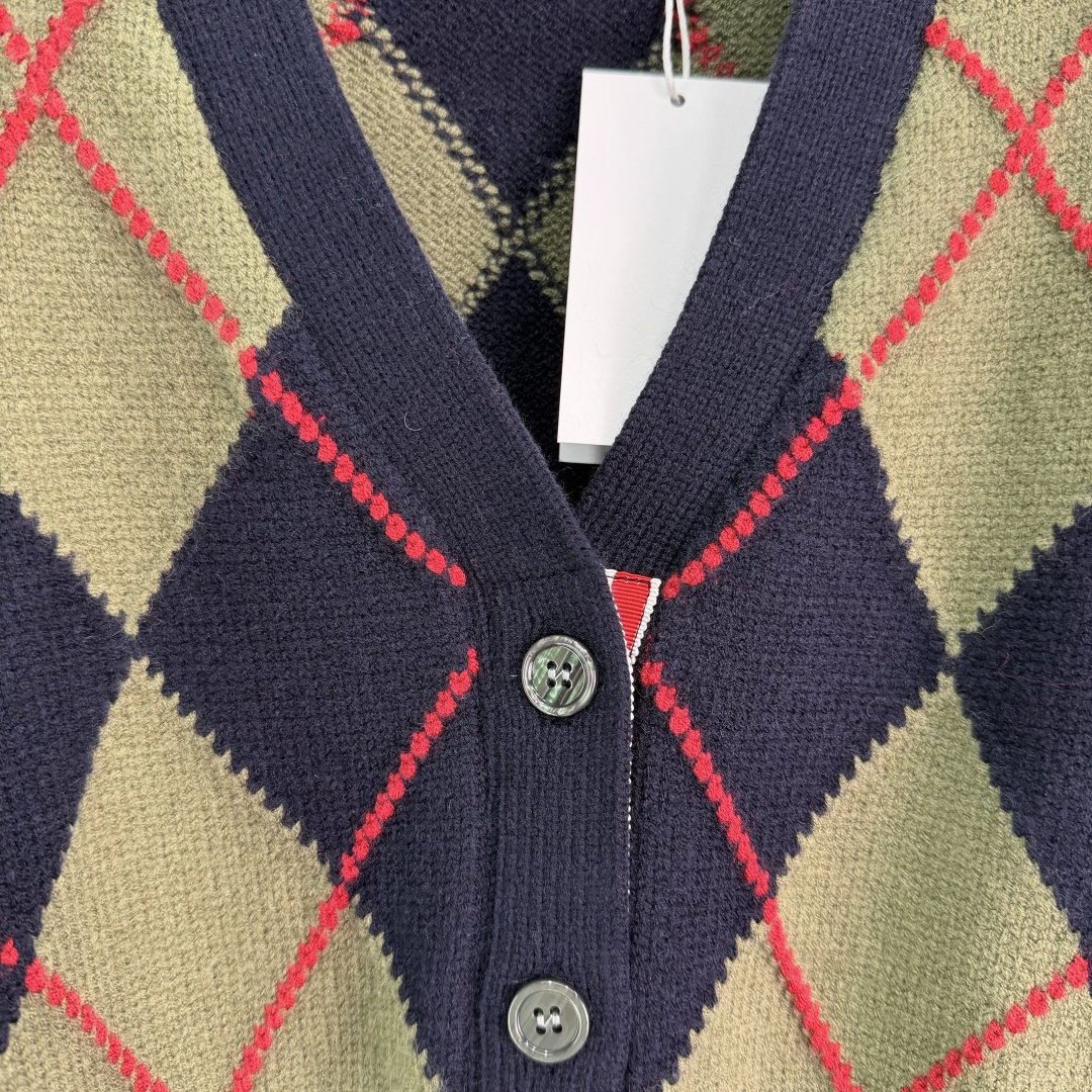Details: Early spring new diamond knit cardigan in navy and olive green with red accents. It has a collegiate style, made of high-quality wool, soft and warm. It has a V-neck and a button-up design.