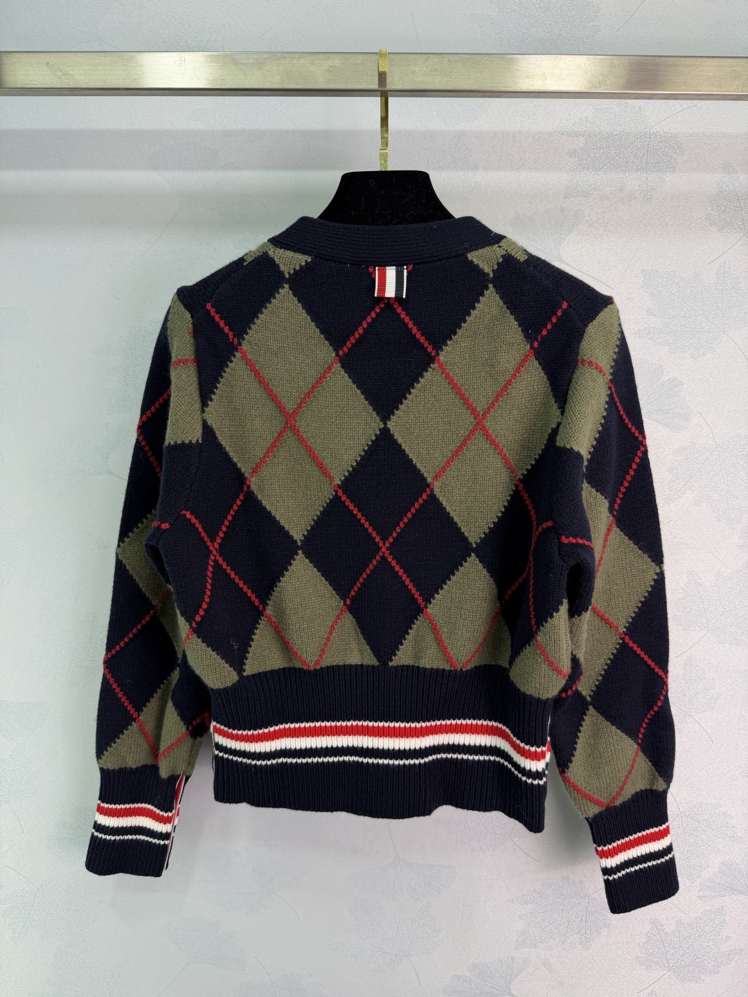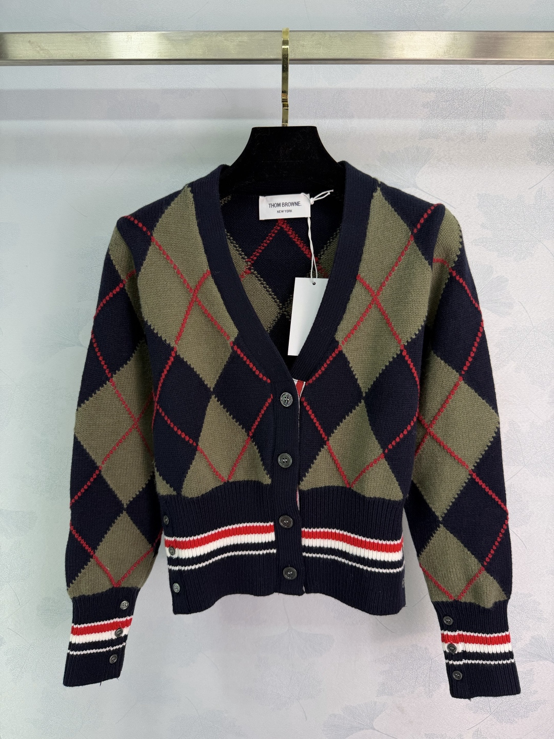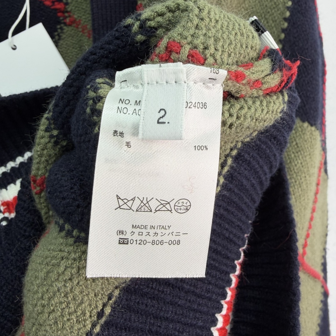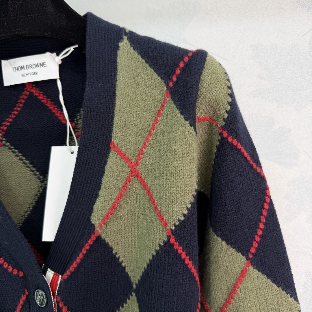 Details: Early spring new diamond knit cardigan in navy and olive green with red accents. It has a collegiate style, made of high-quality wool, soft and warm. It has a V-neck and a button-up design.