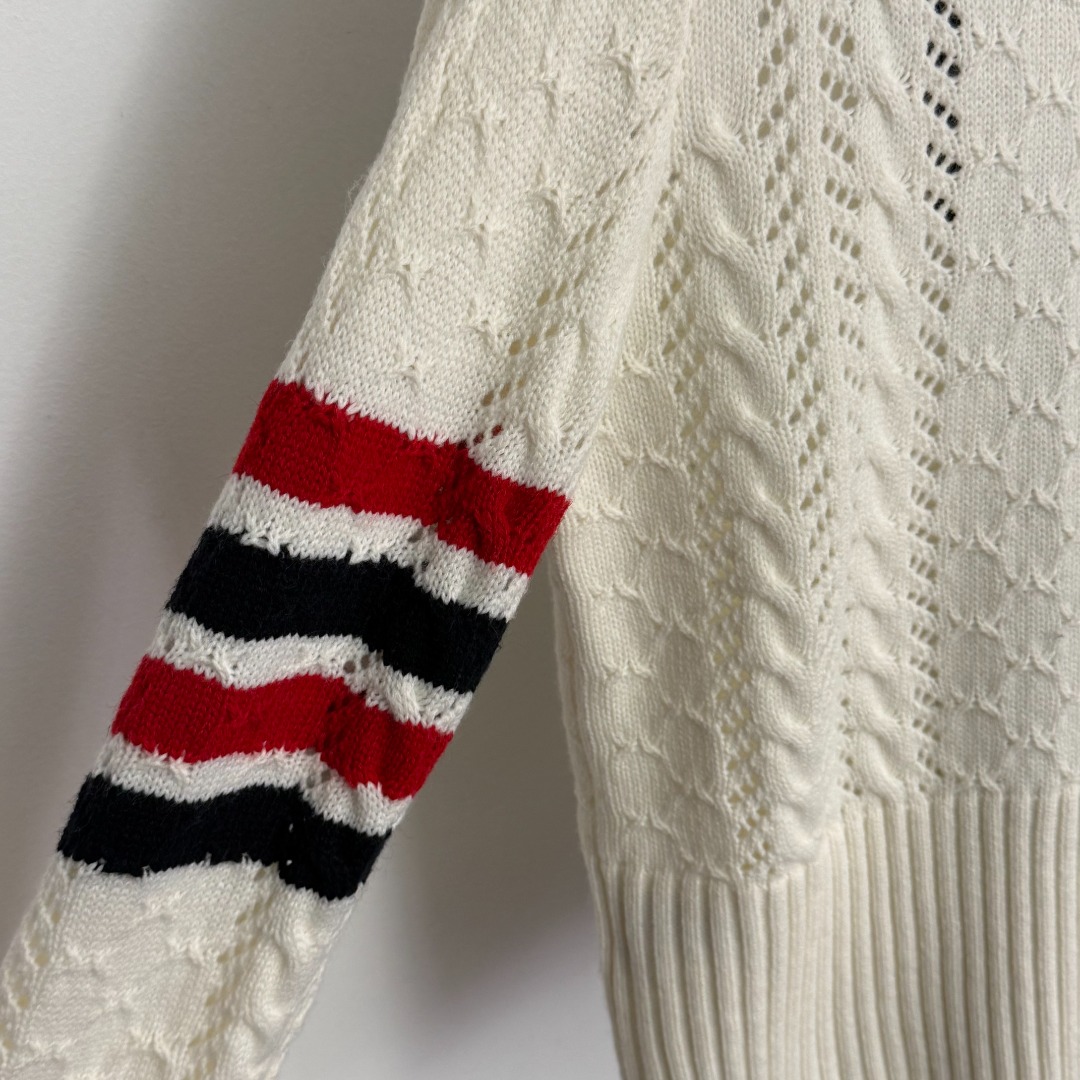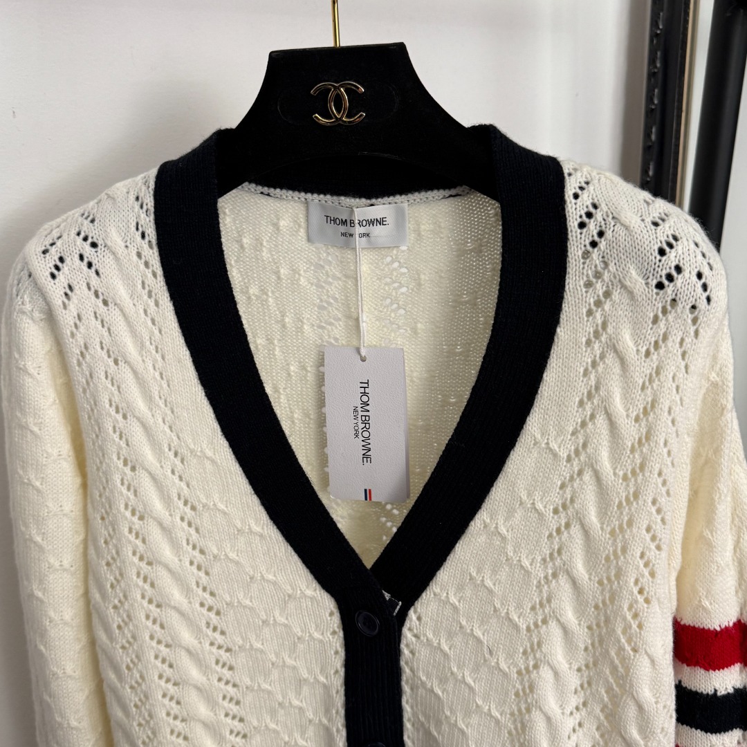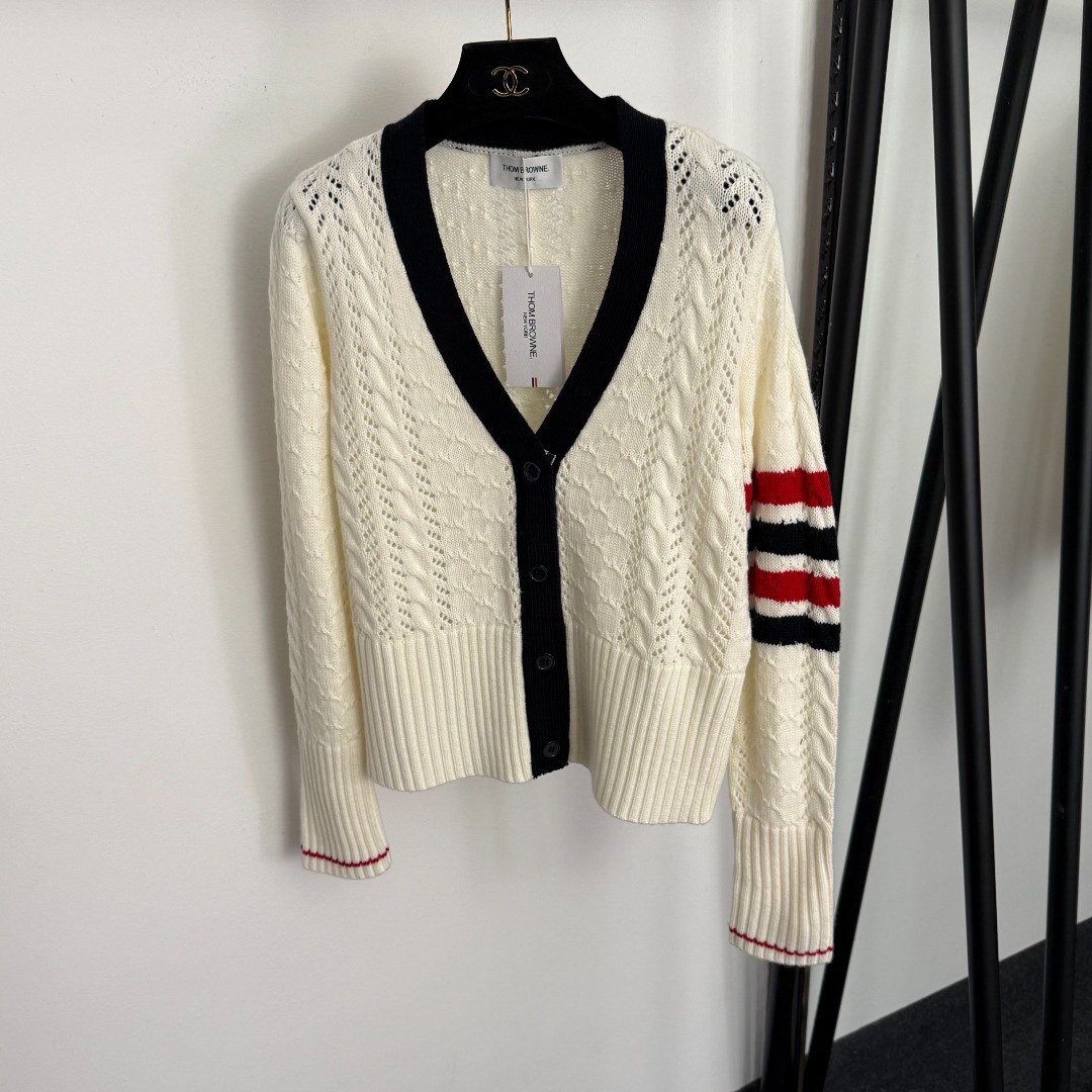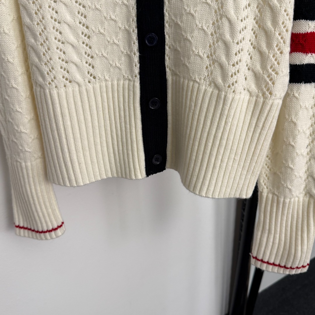 Details: New color-blocked V-neck cut-out long-sleeved wool knitted cardigan, in beige and navy, available in S, M and L sizes. Features advanced customization, fine workmanship