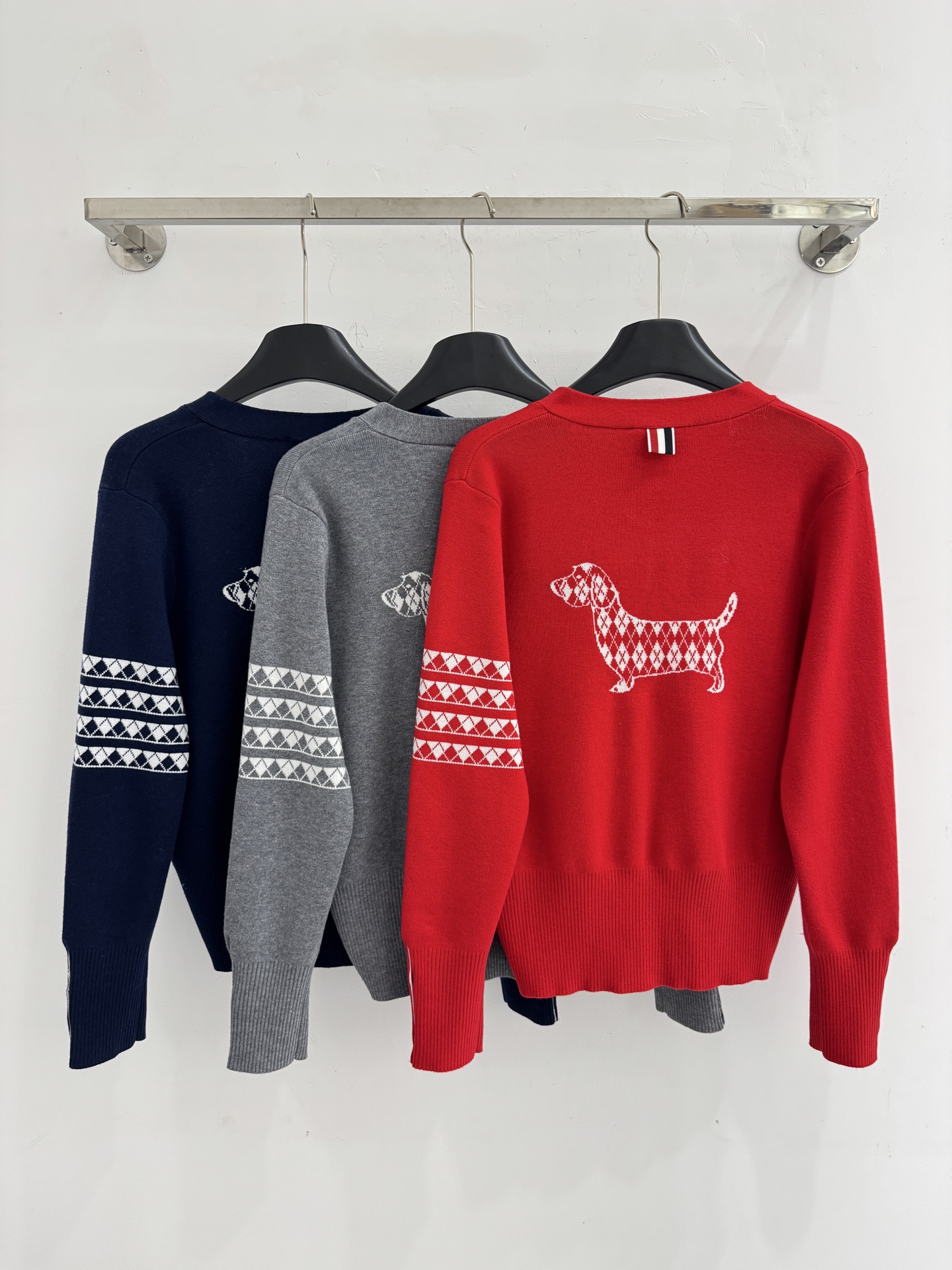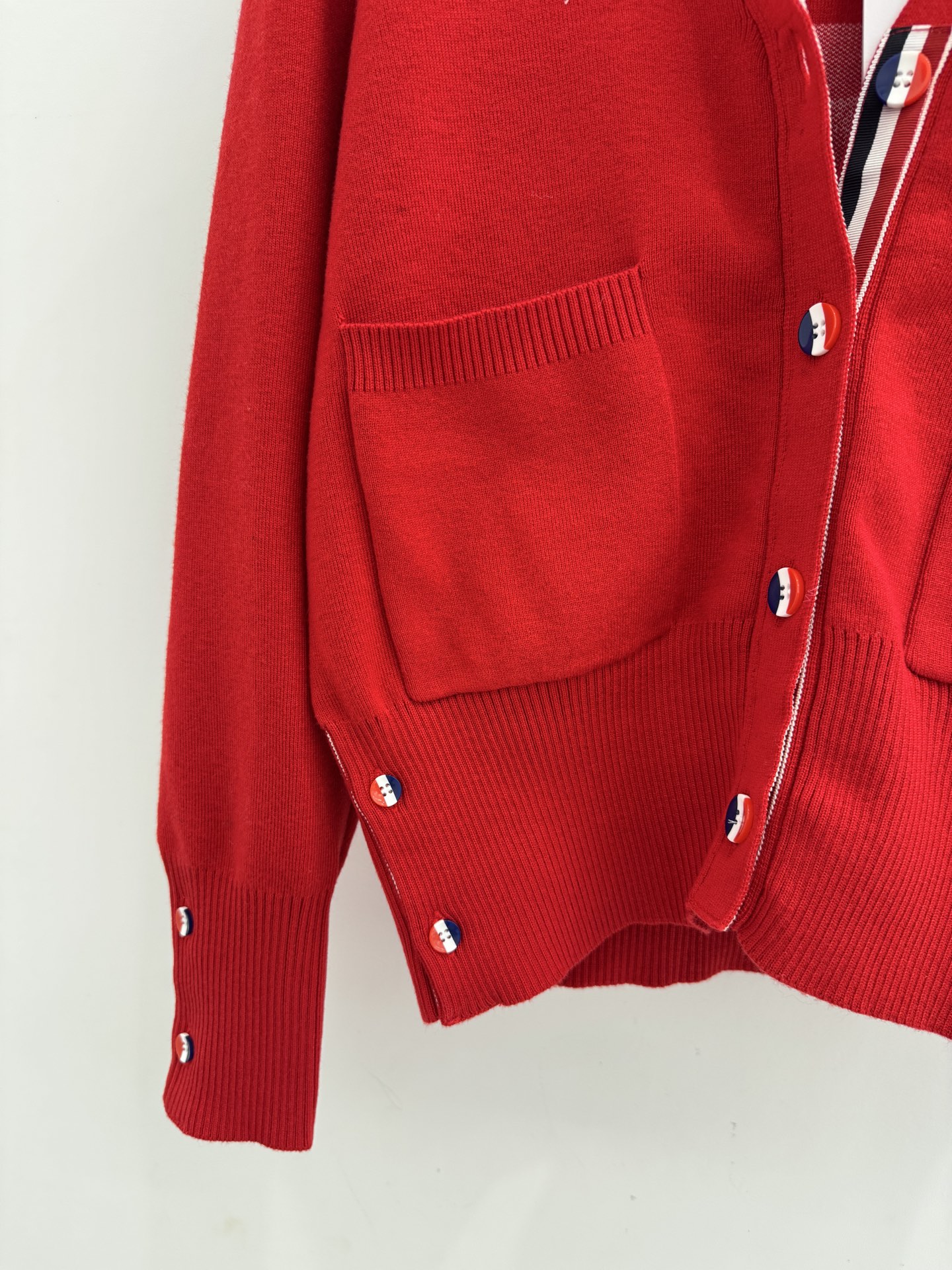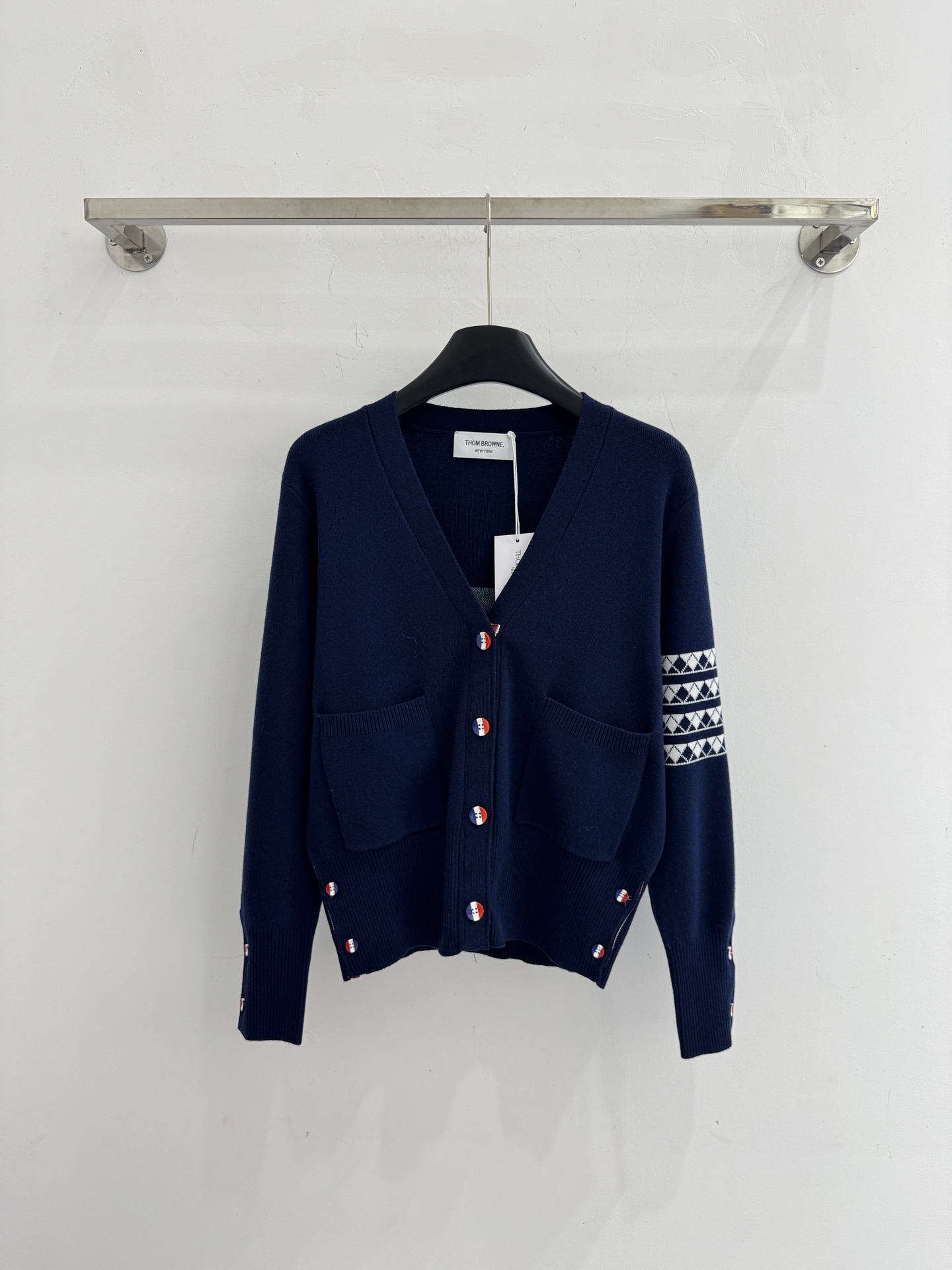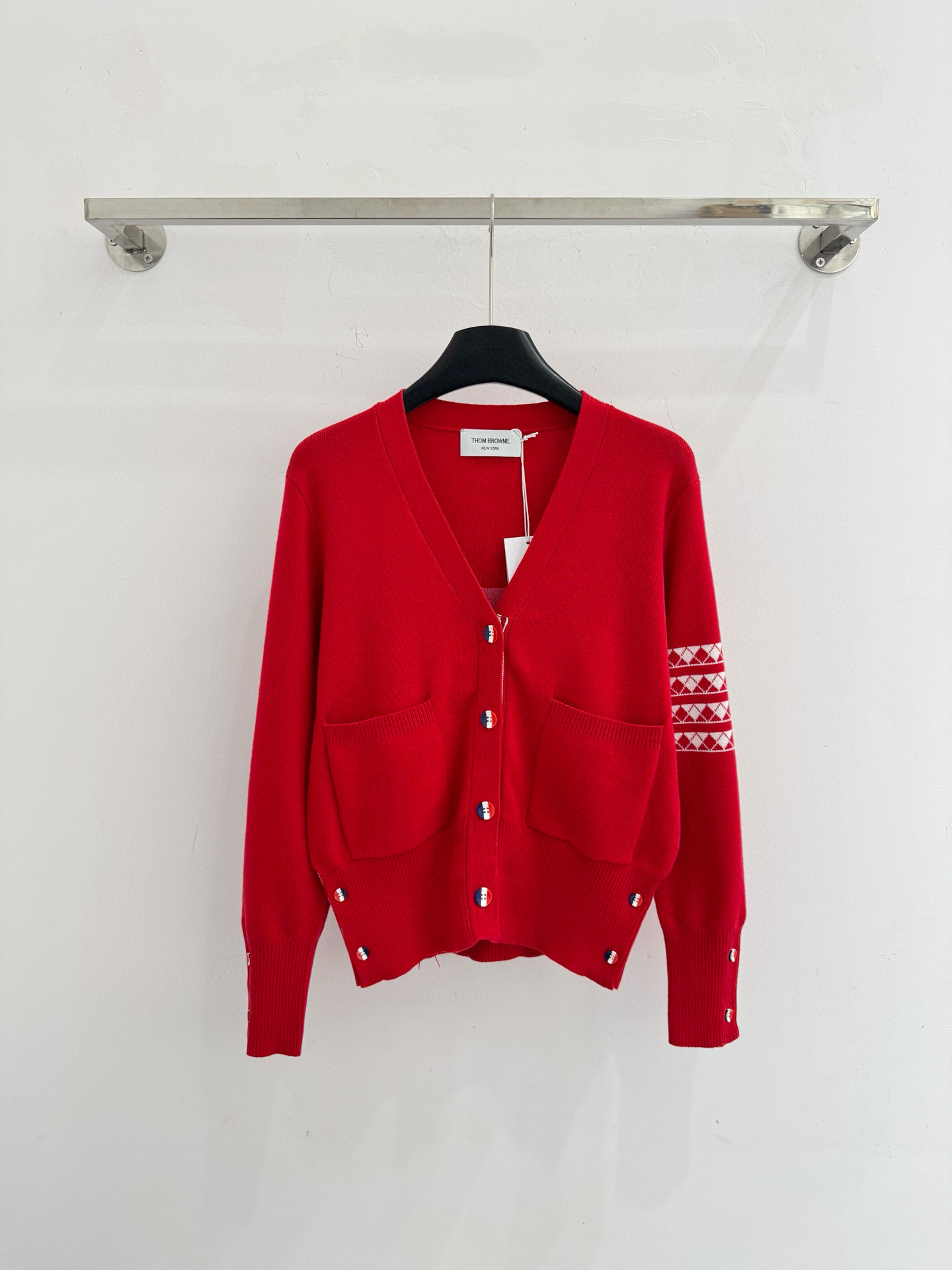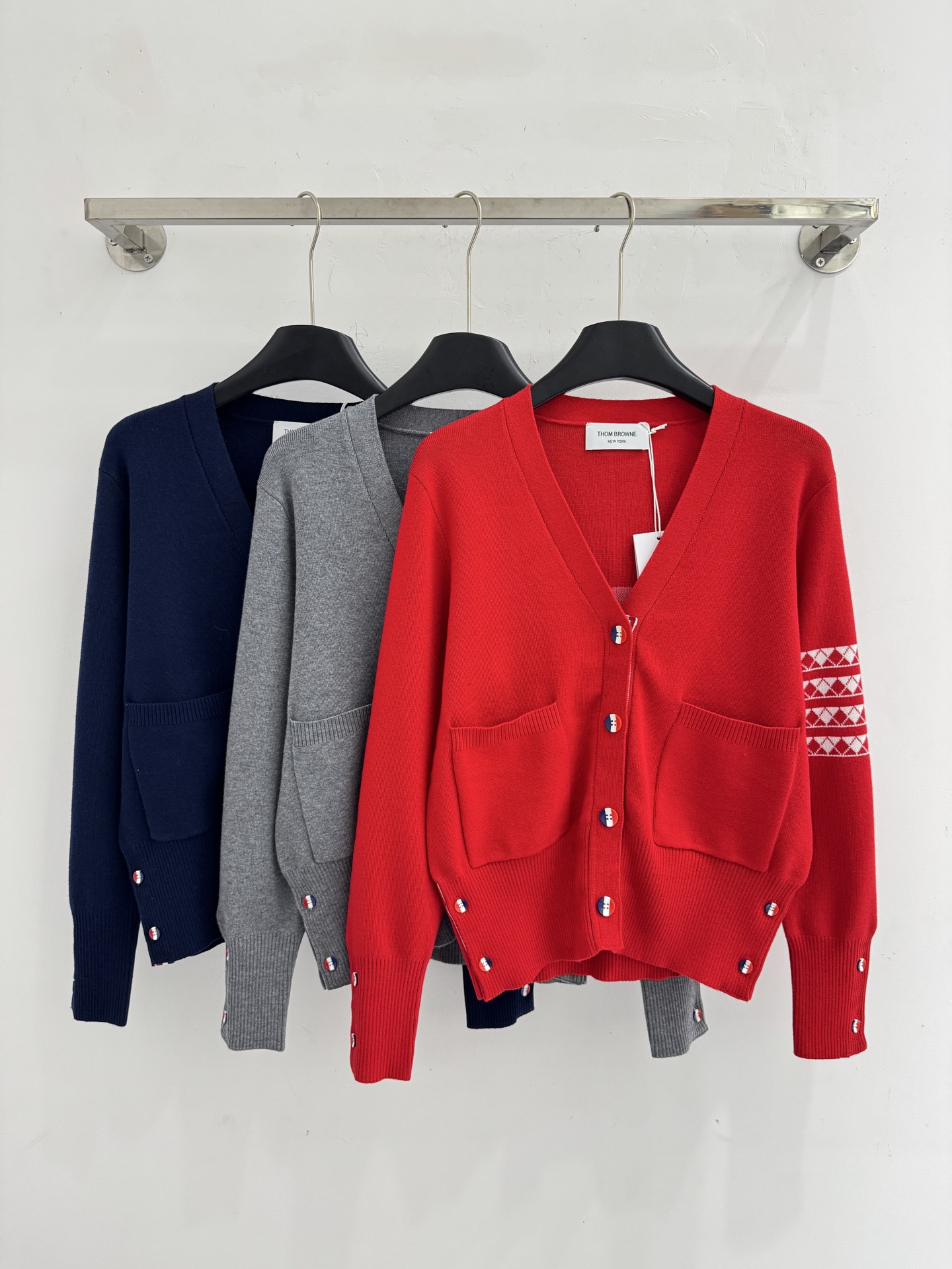 Details: Autumn and winter V-neck knit cardigan with color buttons and pocket, sleeve geometric pattern, multiple colors, available in S, M, L sizes. High-end customization, fine workmanship