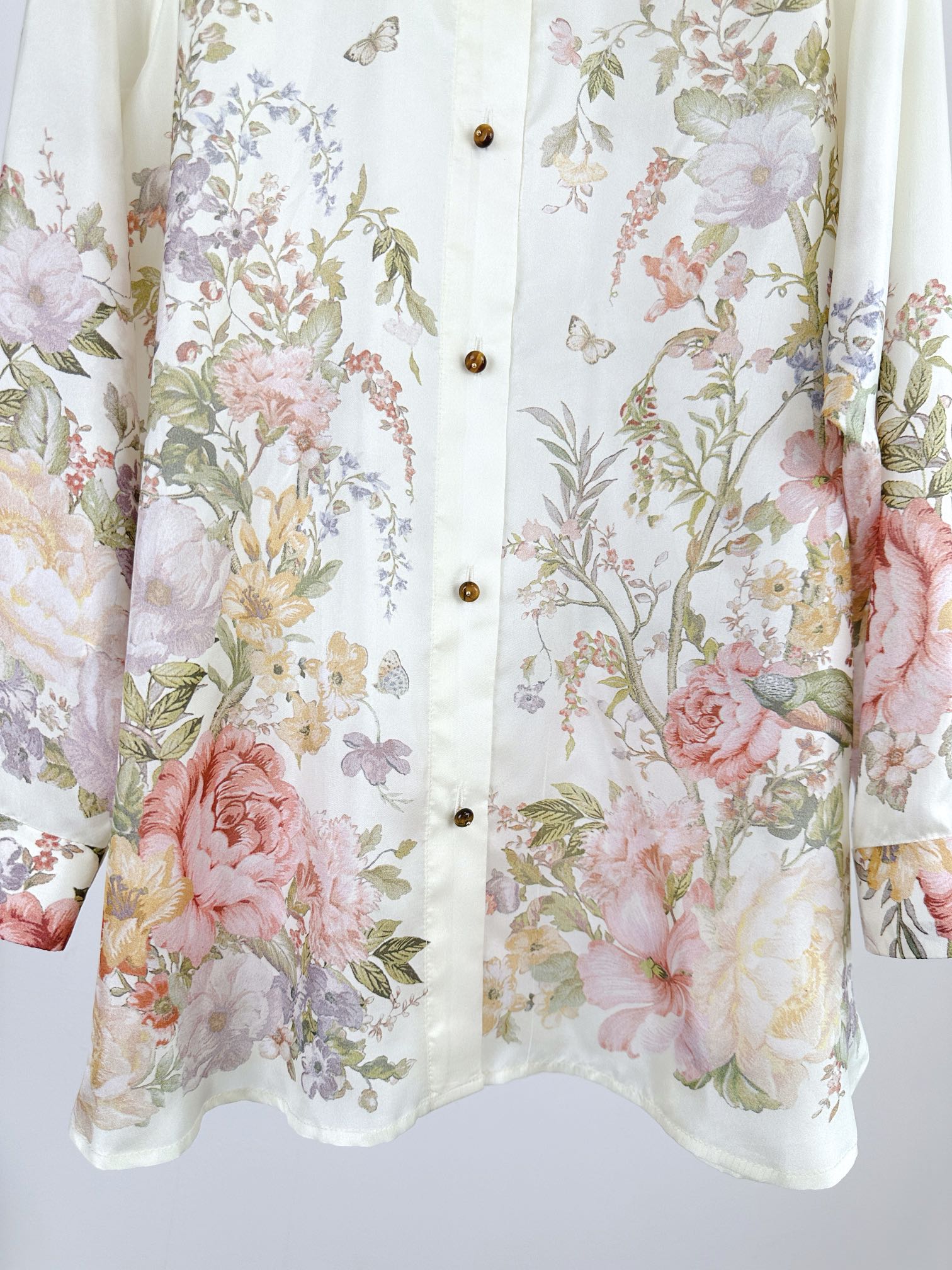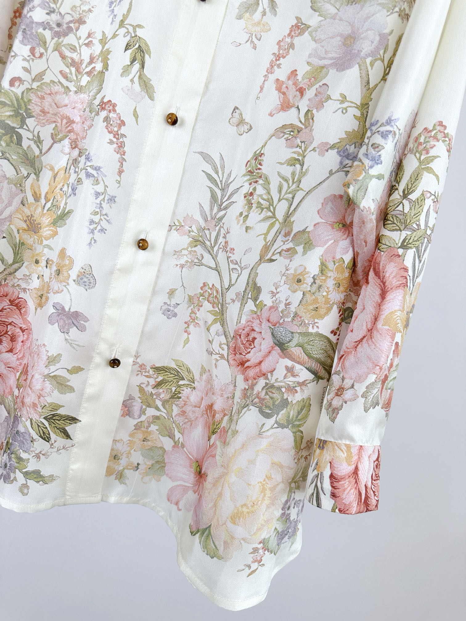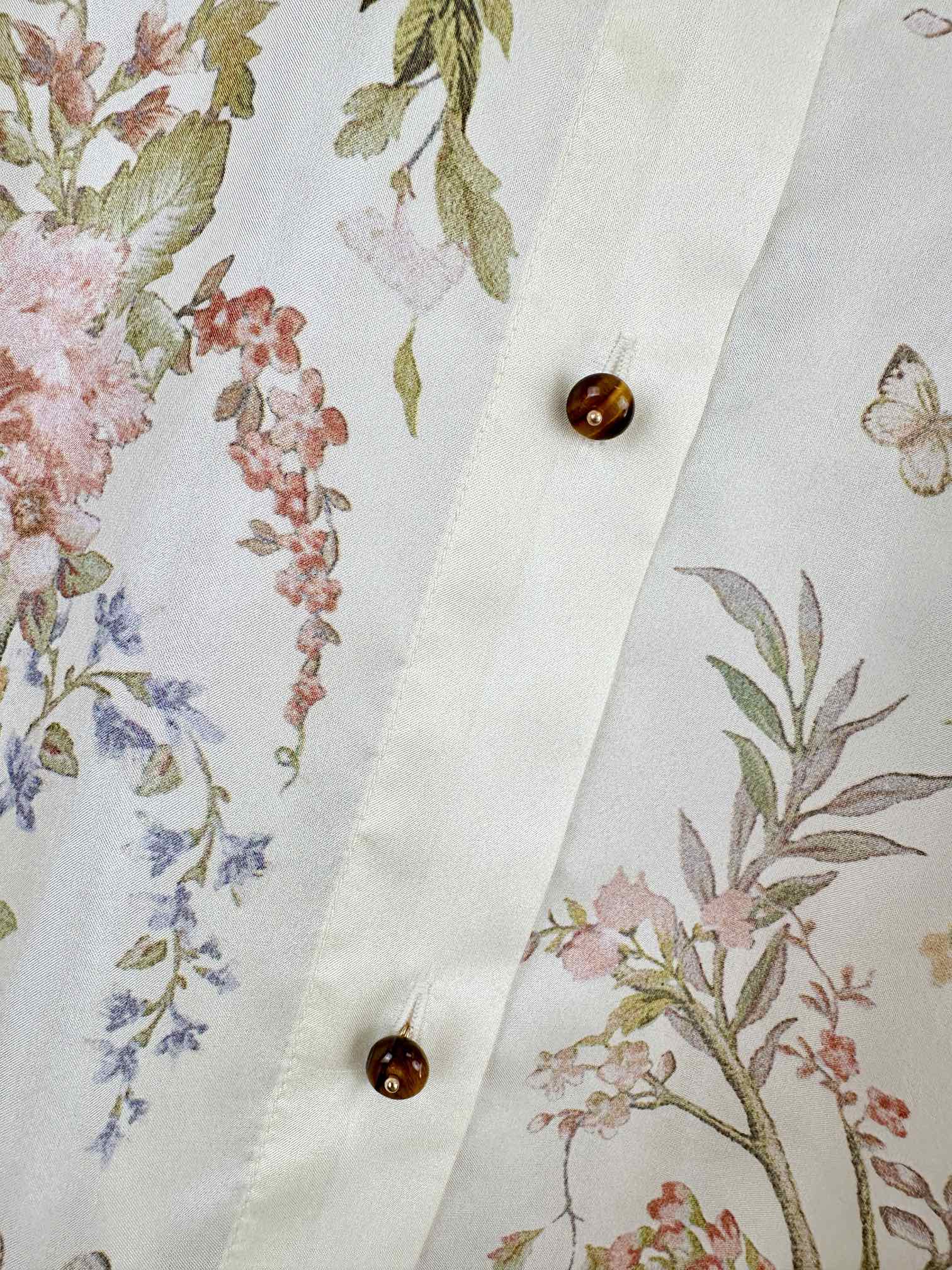 Details: Spring and Summer Silk Long-sleeve Shirt with Floral Pattern, Loose Fit, Classic Collar. High-end Customization, Fine Workmanship