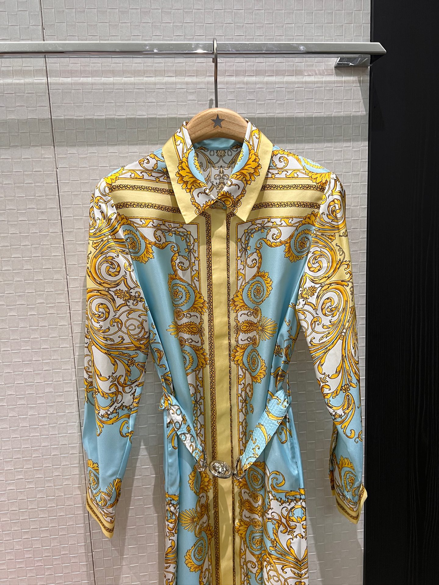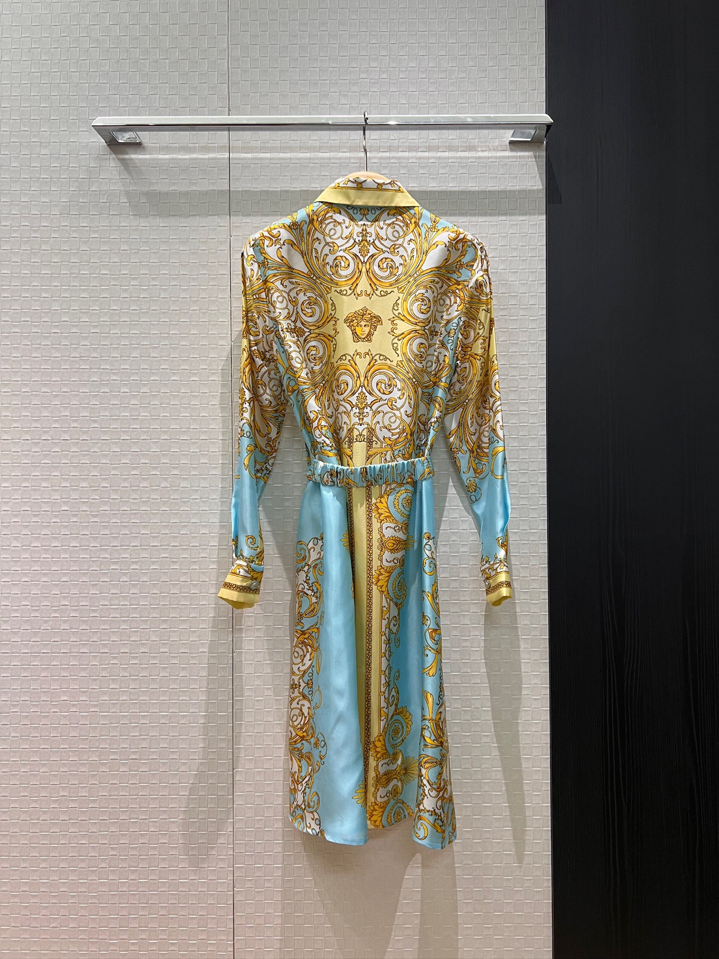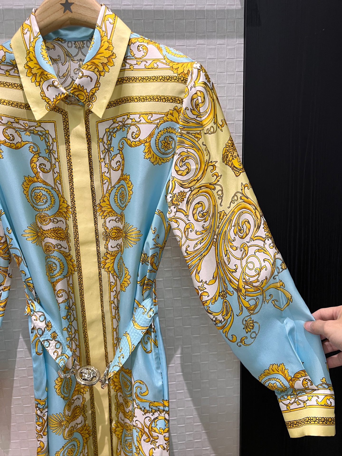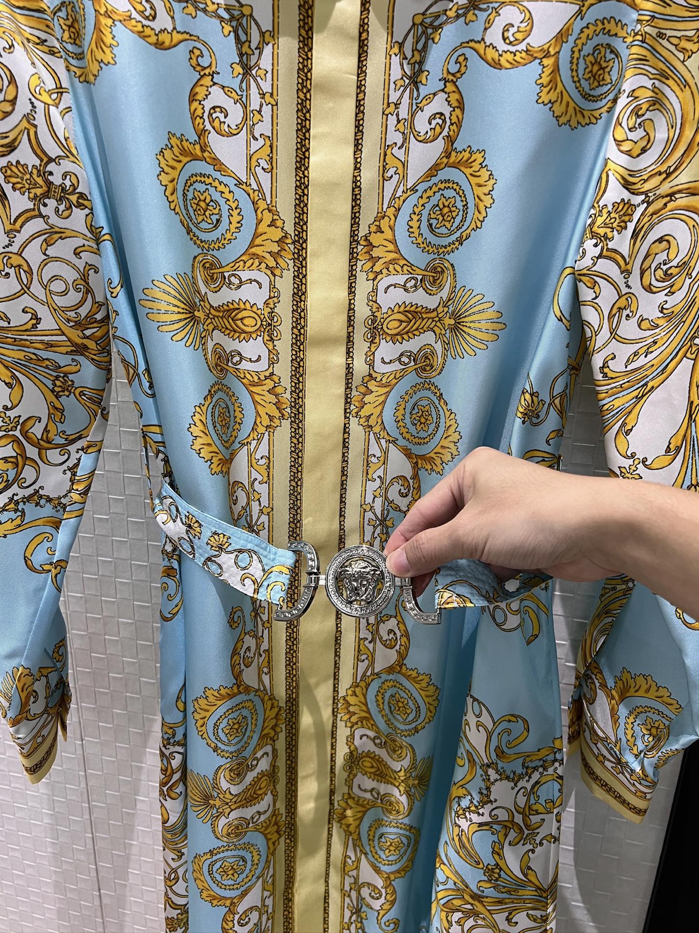 Details: Early spring silk dress with printed pattern and Medusa belt, slim and fashionable.