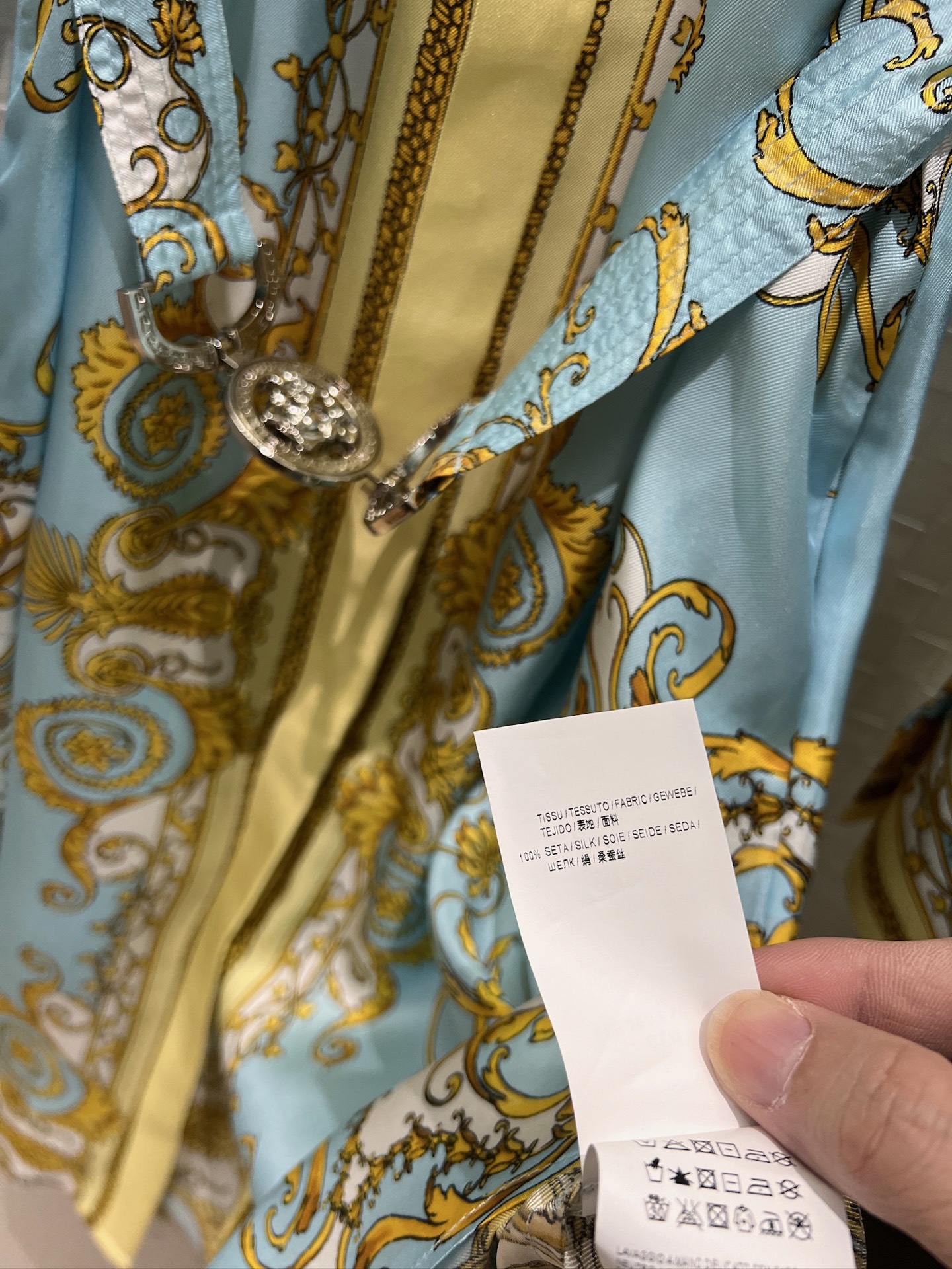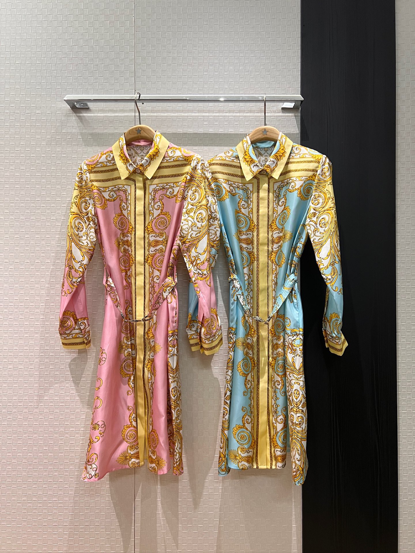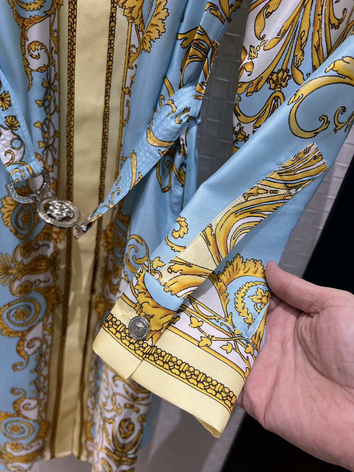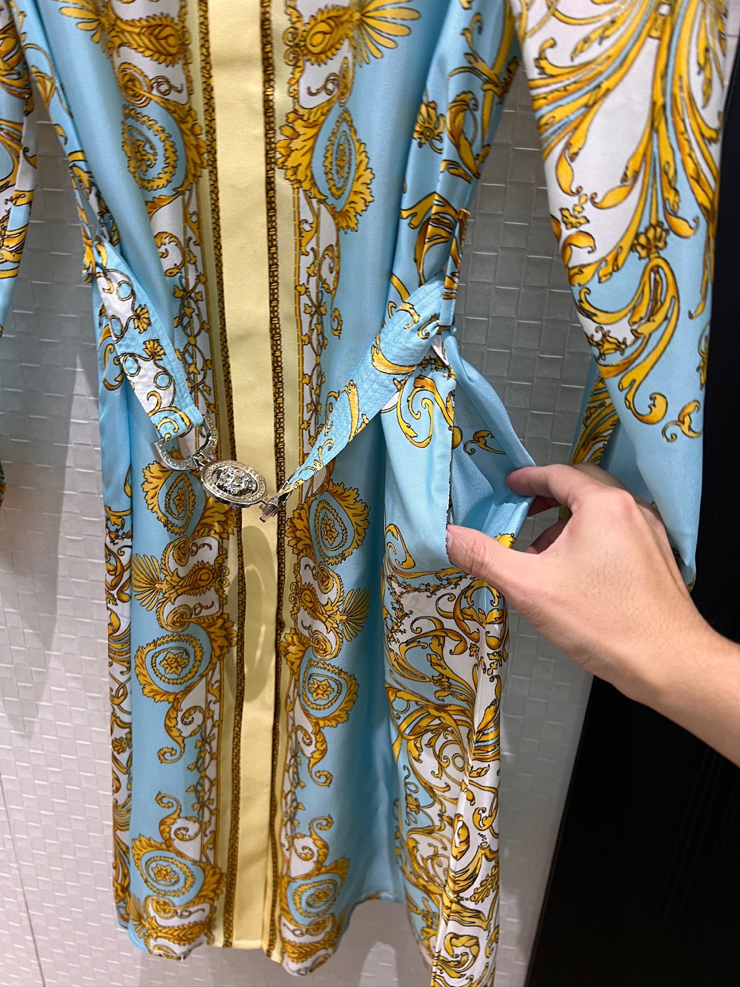 Details: Early spring silk dress with printed pattern and Medusa belt, slim and fashionable.