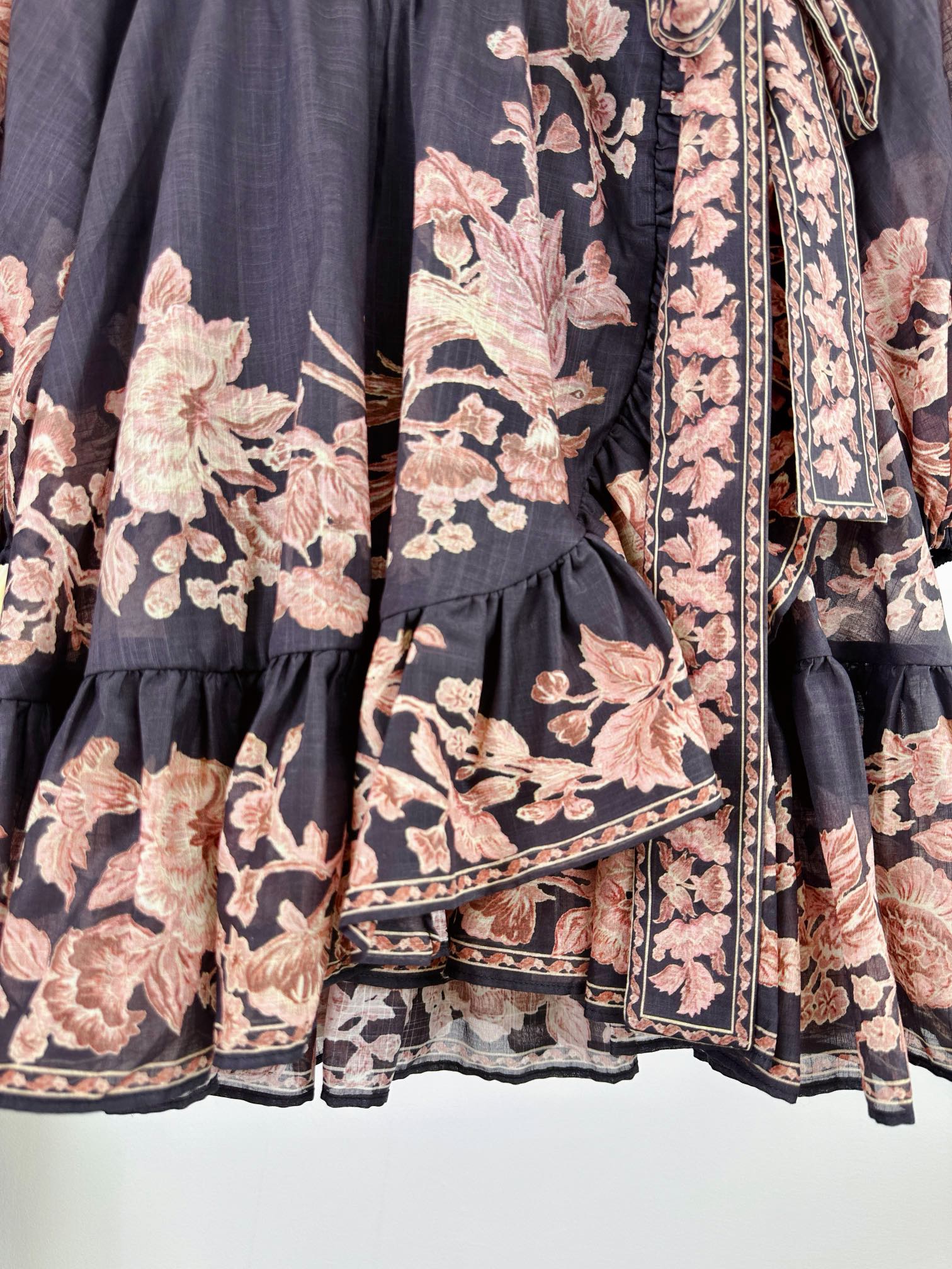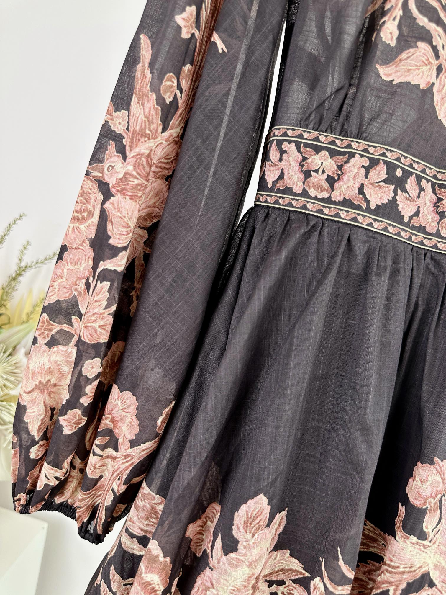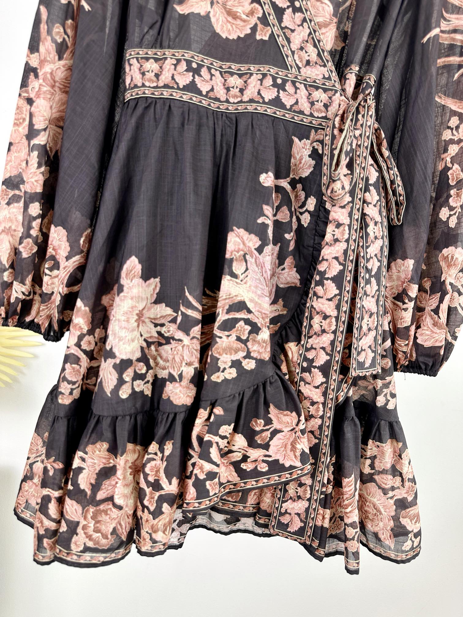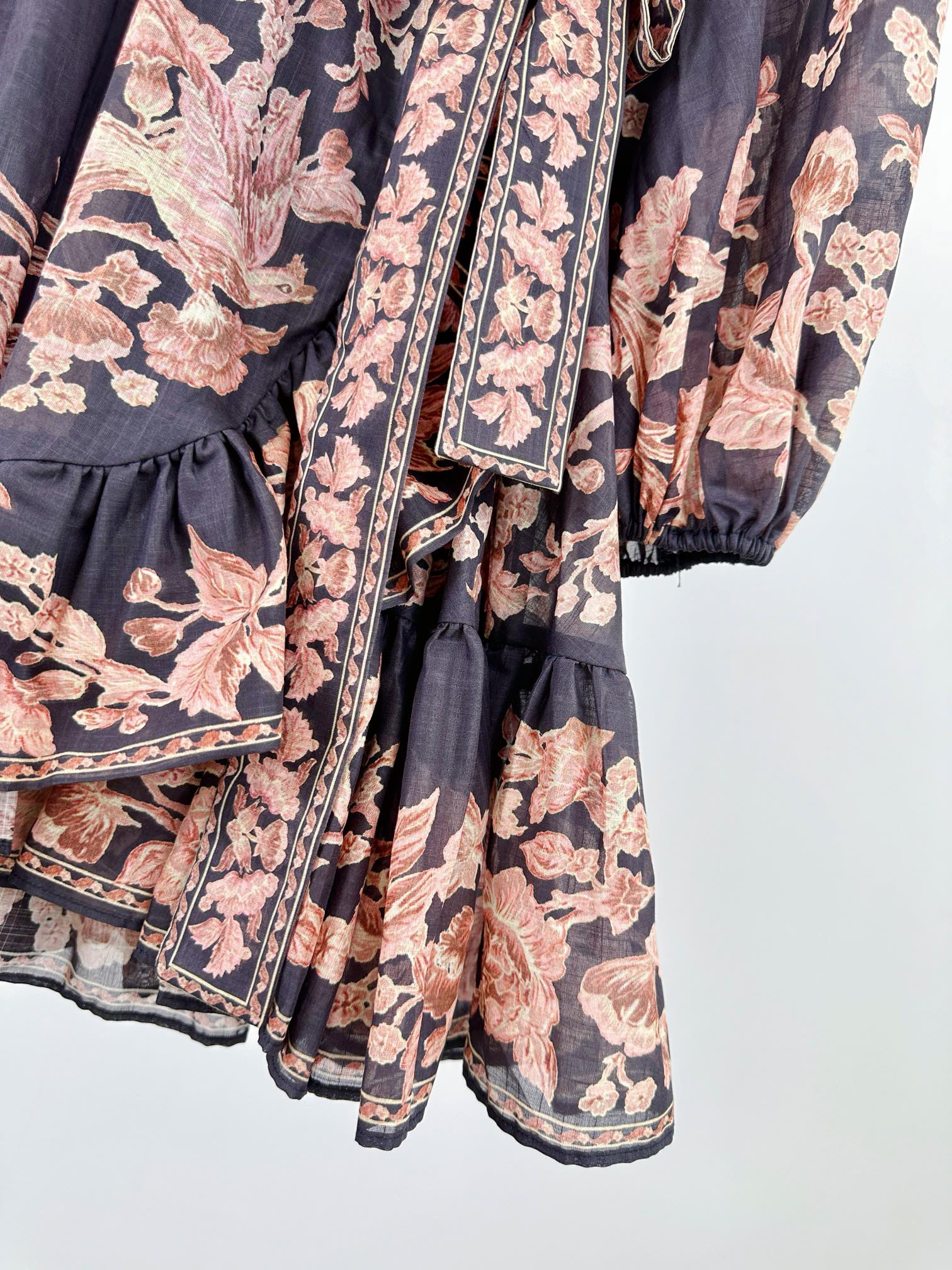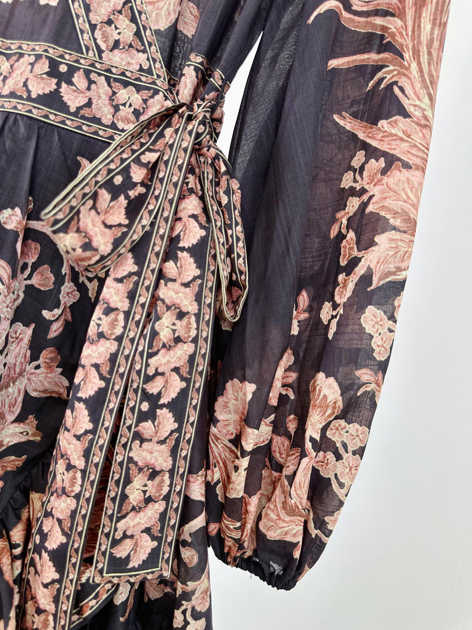 Details: Spring/Summer 100% Cotton Mini Dress with Pattern, Deep V-Neck, Lantern Sleeves, Wrap Design, Comes with a Belt, Custom-Tailored, Exquisite Craftsmanship