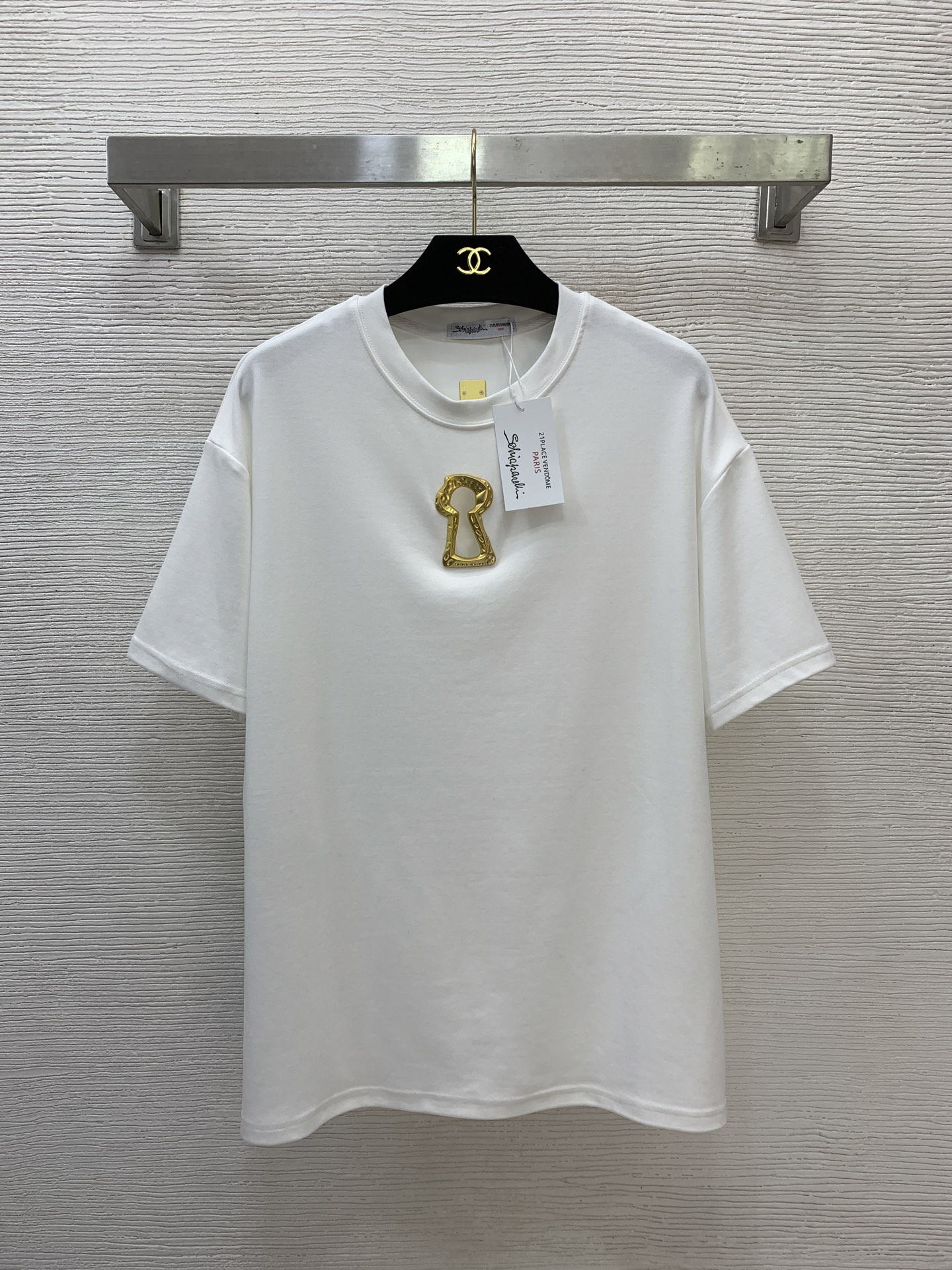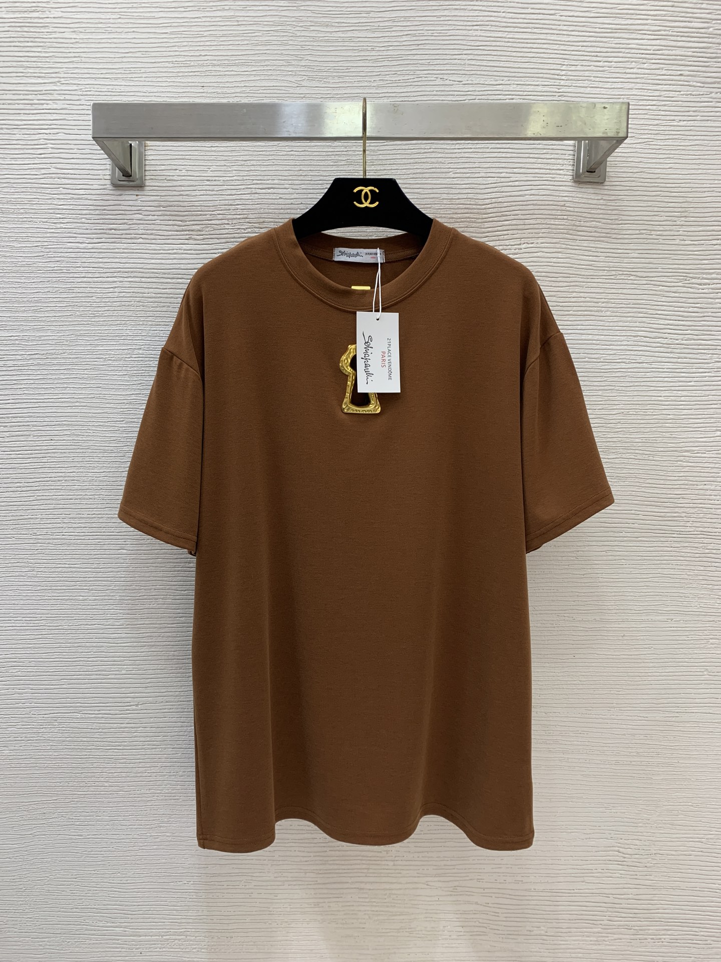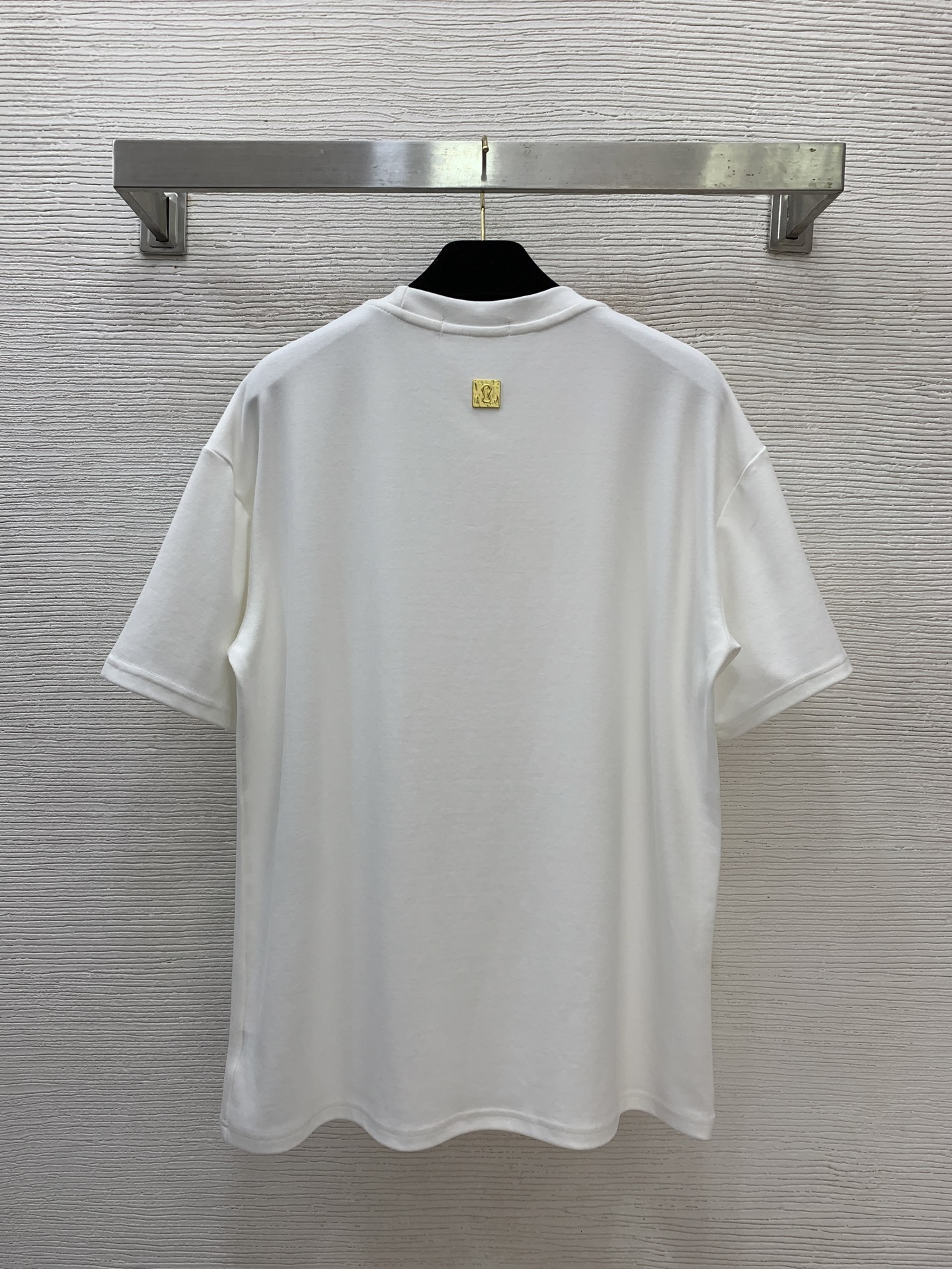 Details: New loose-fitting short-sleeved T-shirt with gold accents, made of stretch cotton, available in white, black, and brown.