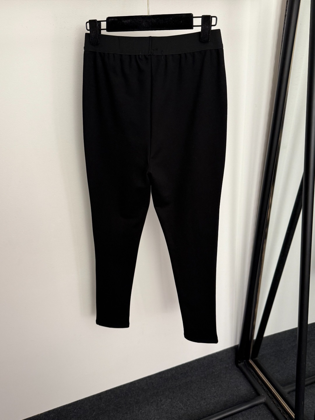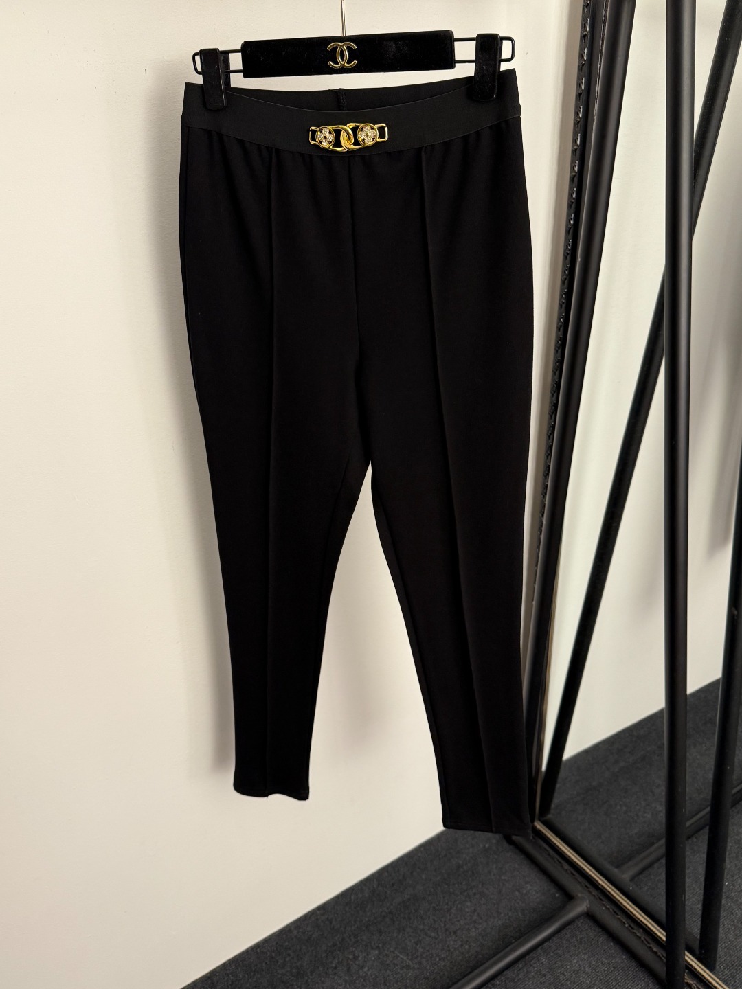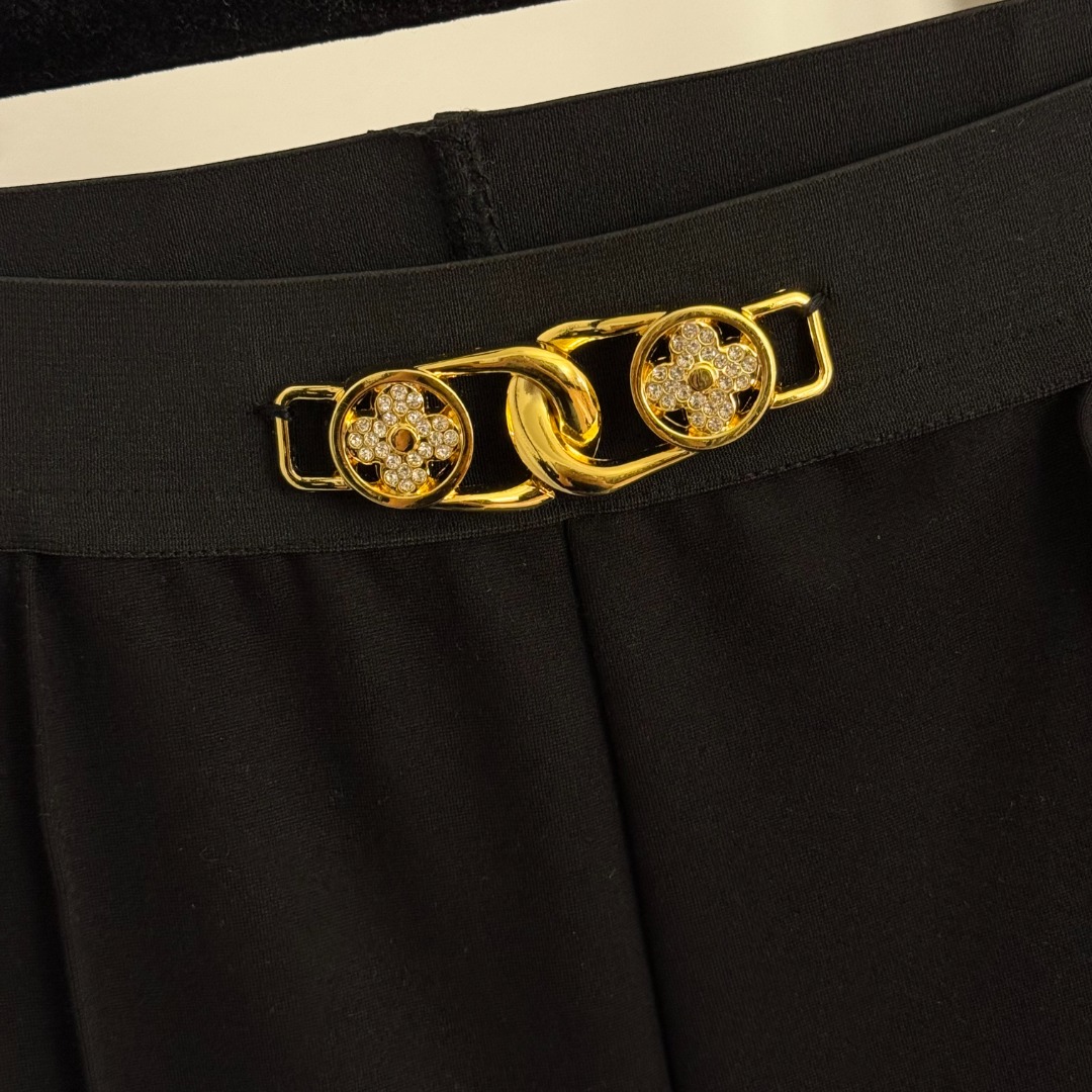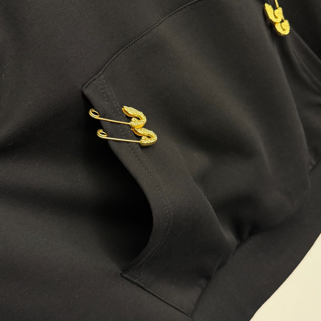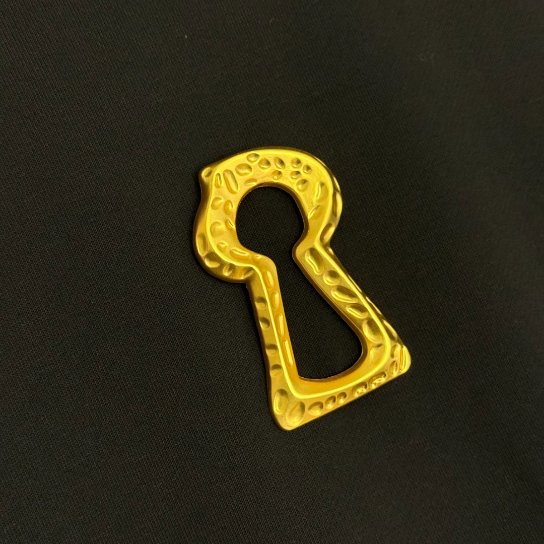 Details: New sweatshirt adorned with a gold keyhole pin, paired with elastic leggings, available in black. Sizes include S, M, and XL.