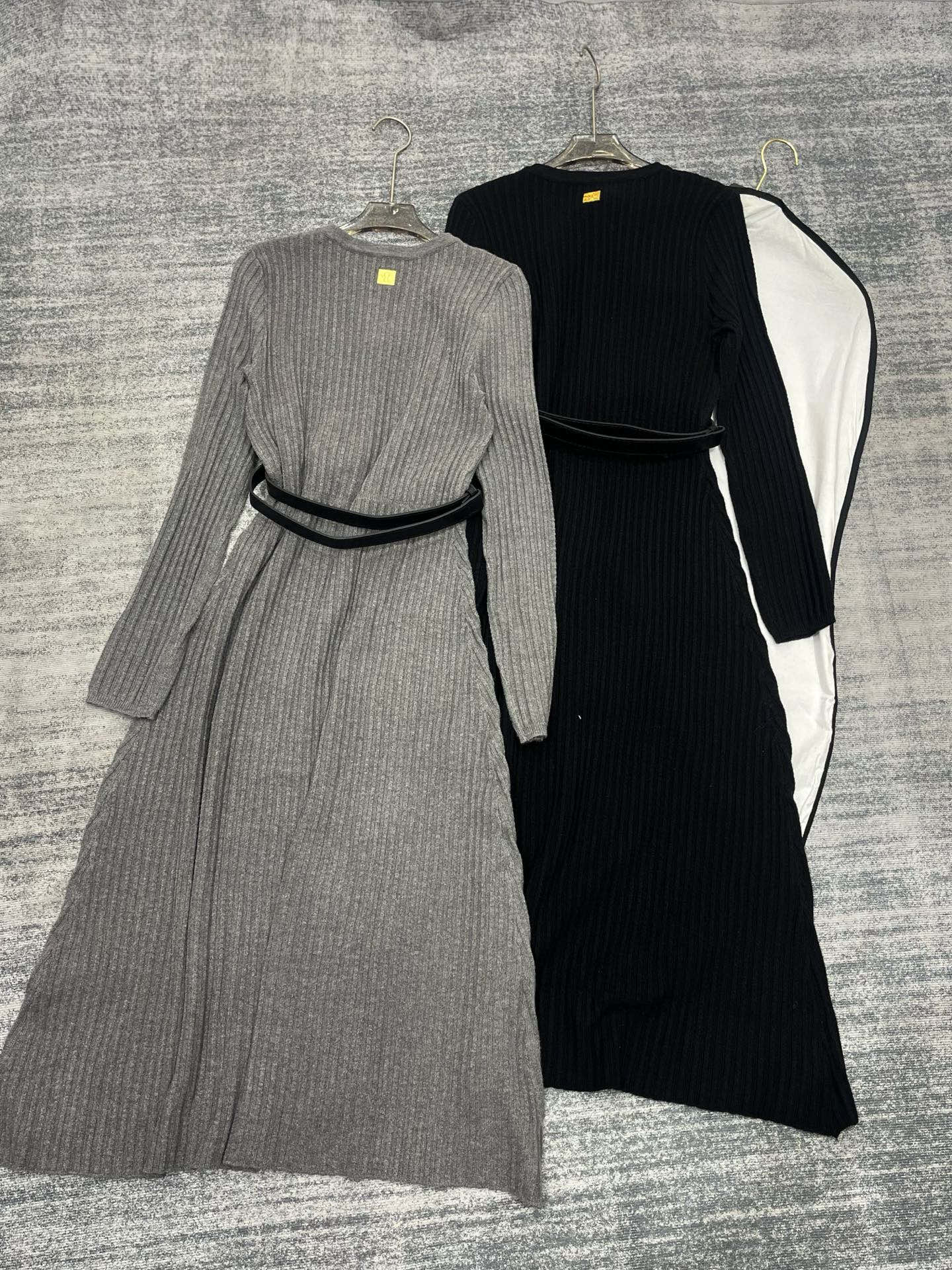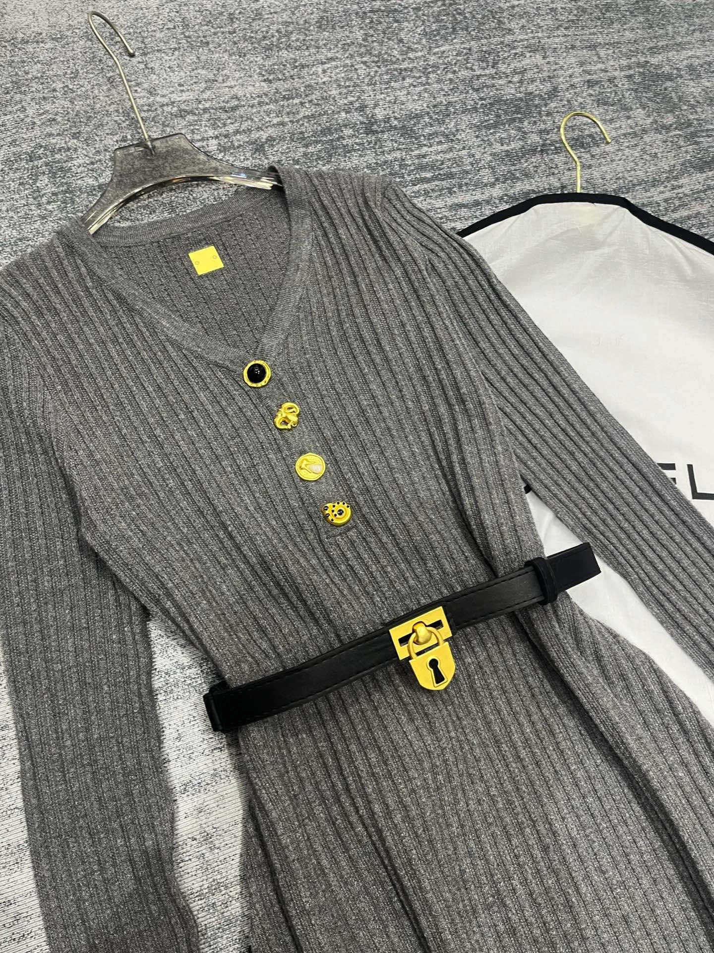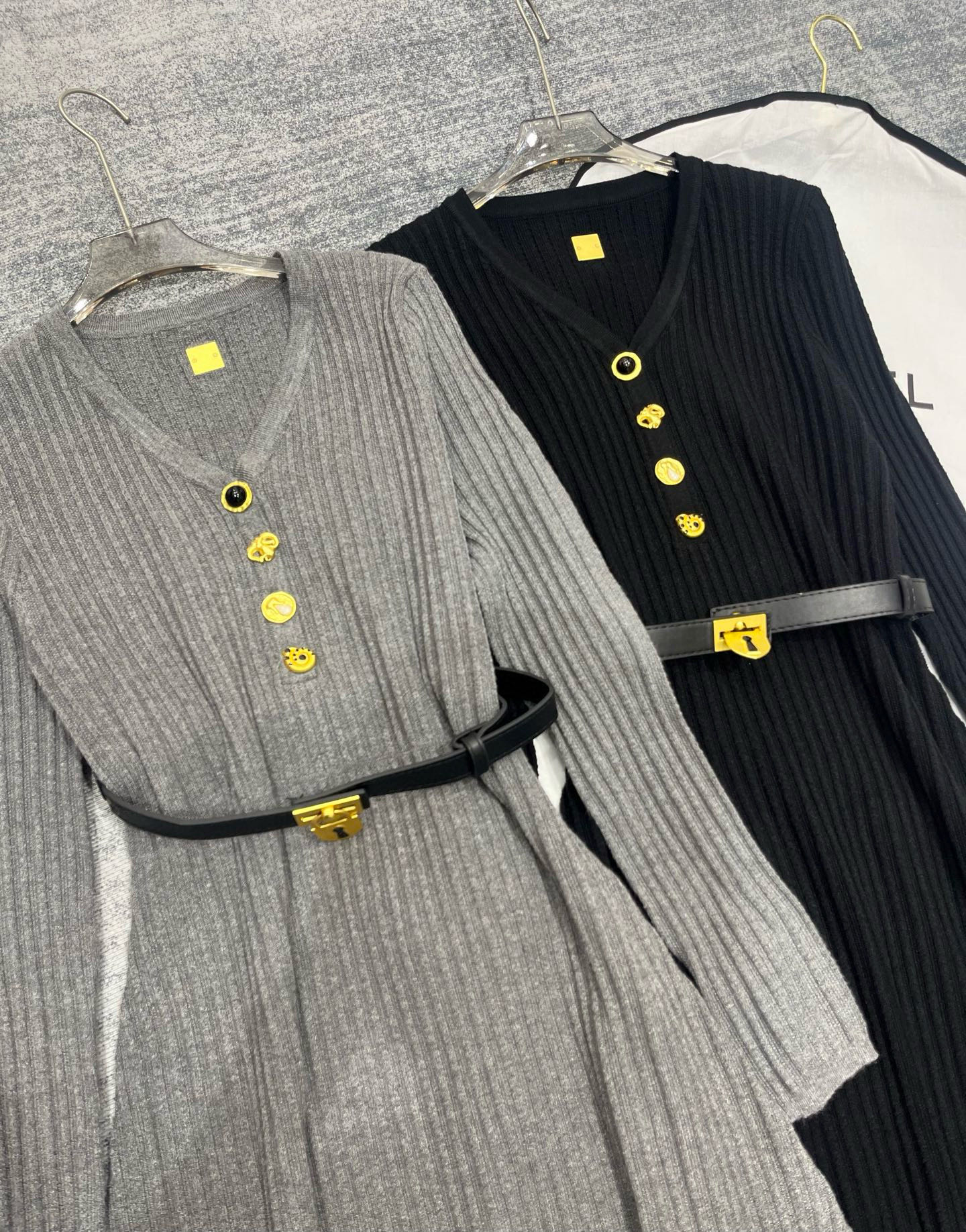 Details: Asymmetric Button V-neck Knit Belted Long Dress. Premium Custom, Fine Workmanship