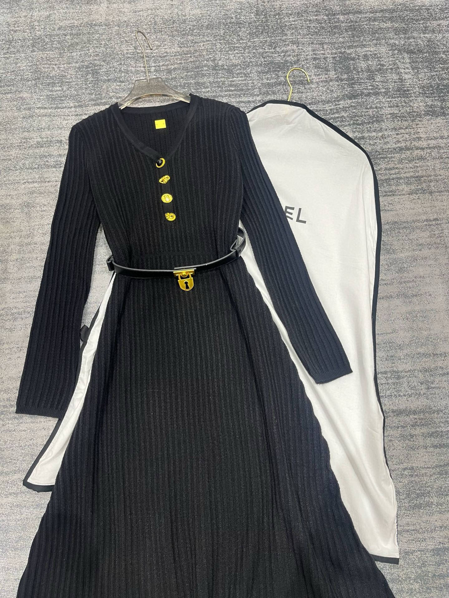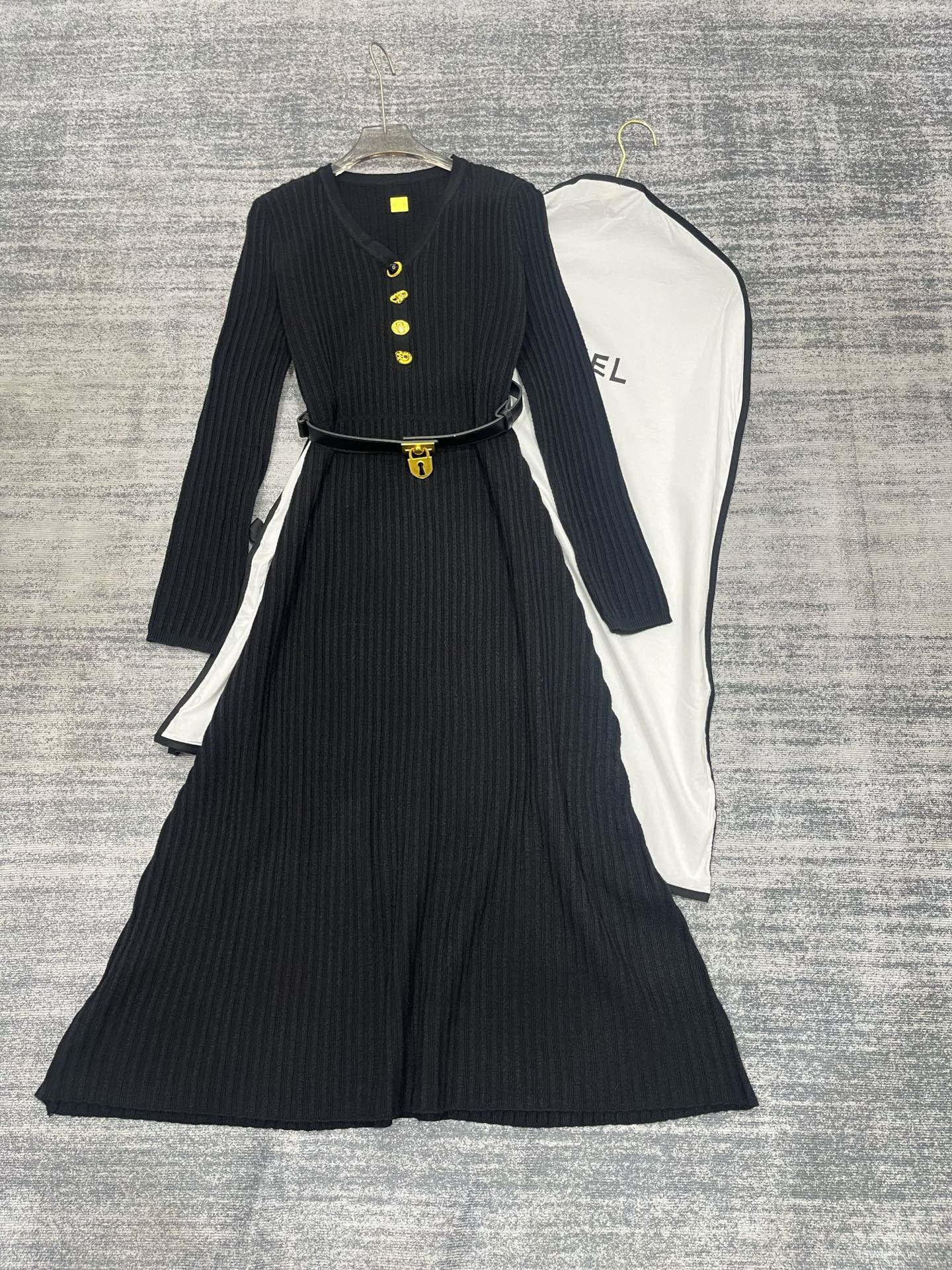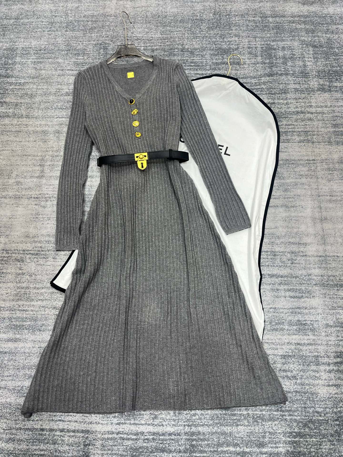 Details: Asymmetric Button V-neck Knit Belted Long Dress. Premium Custom, Fine Workmanship