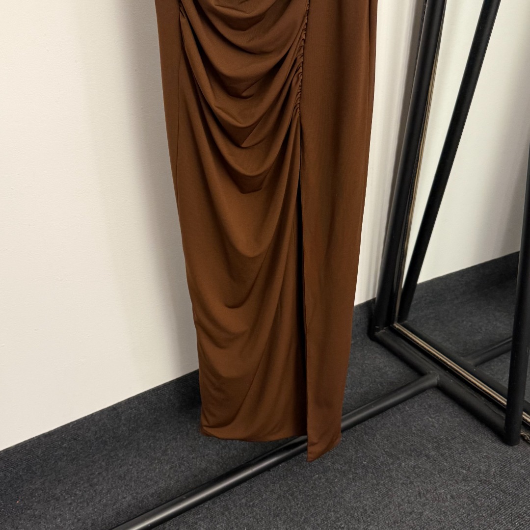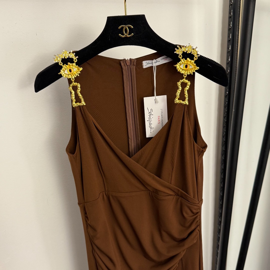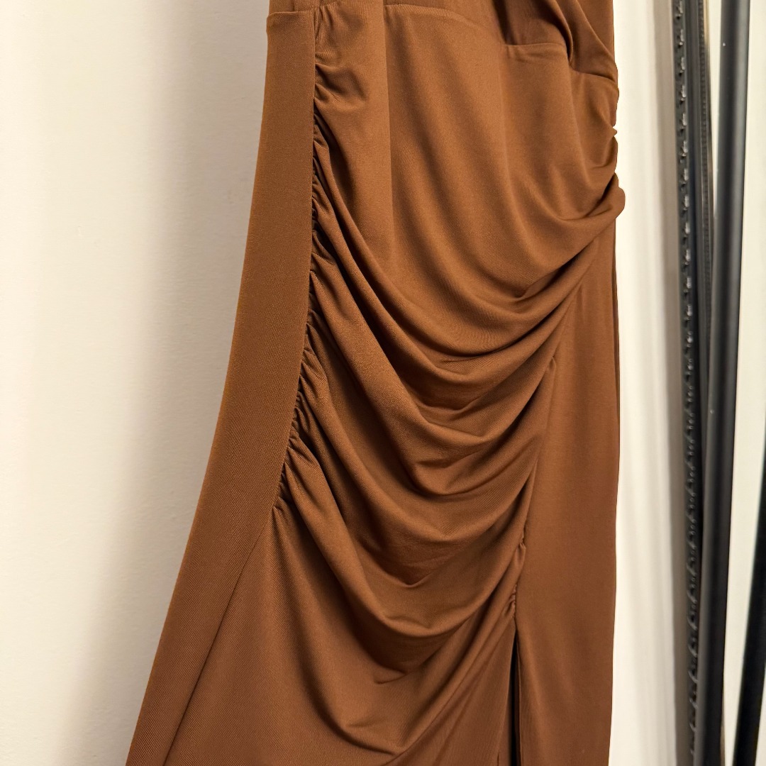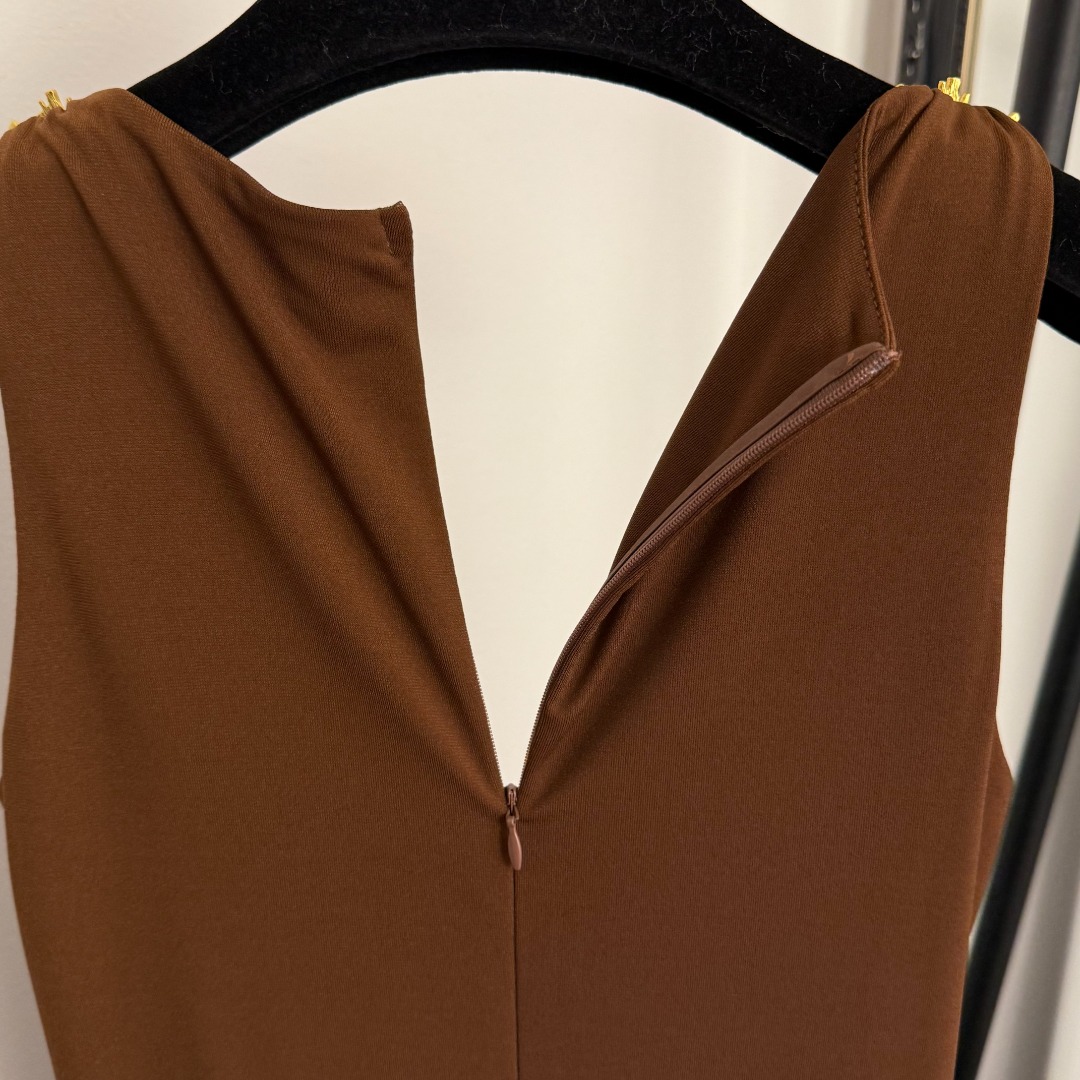 Details: New Ruffled Waist Cinching Split-back Dress with Big-eye Metal Buttons in Brown, Red, and Black, SML Sizes