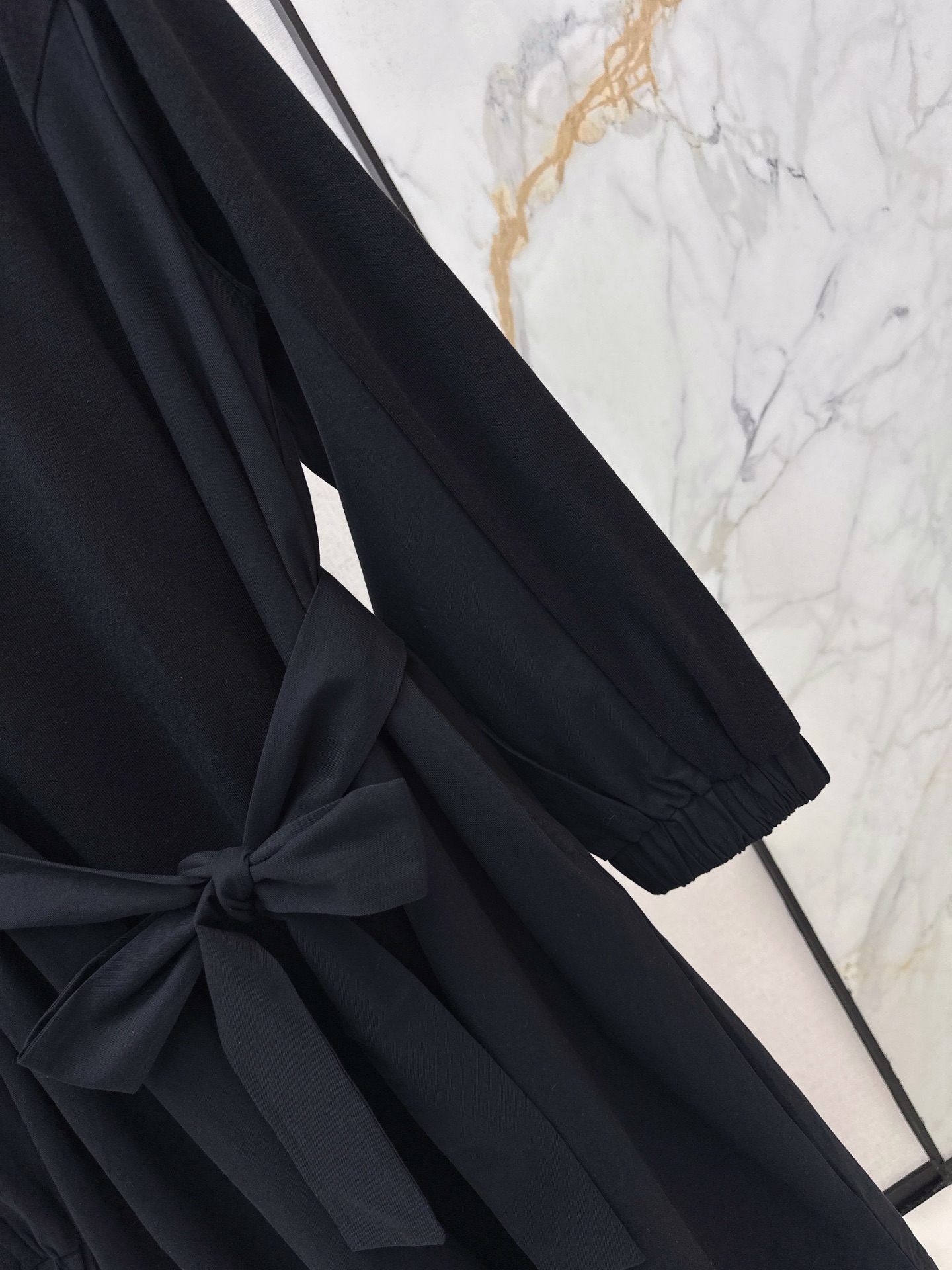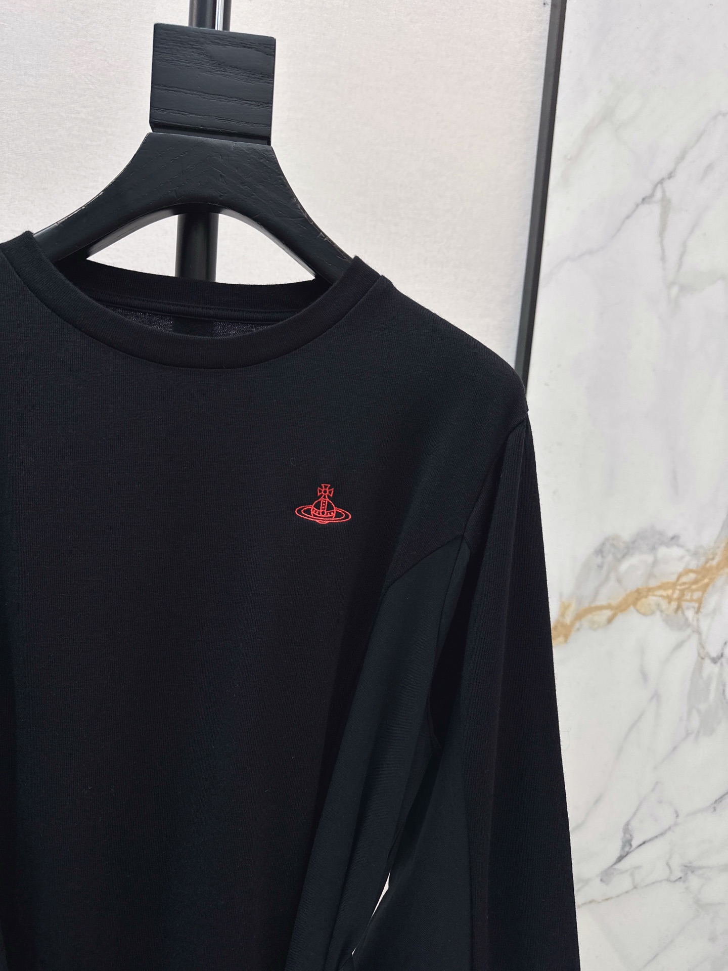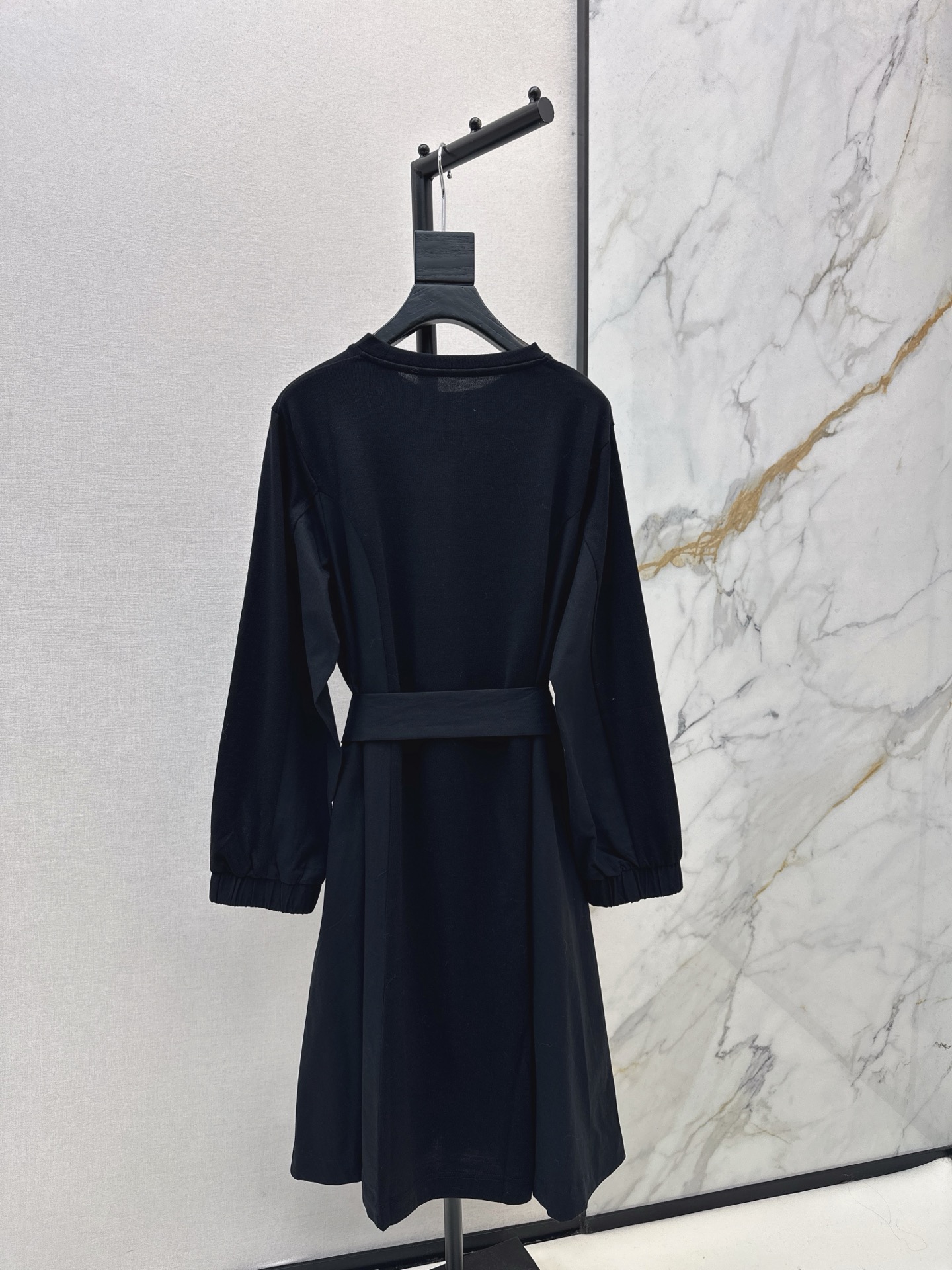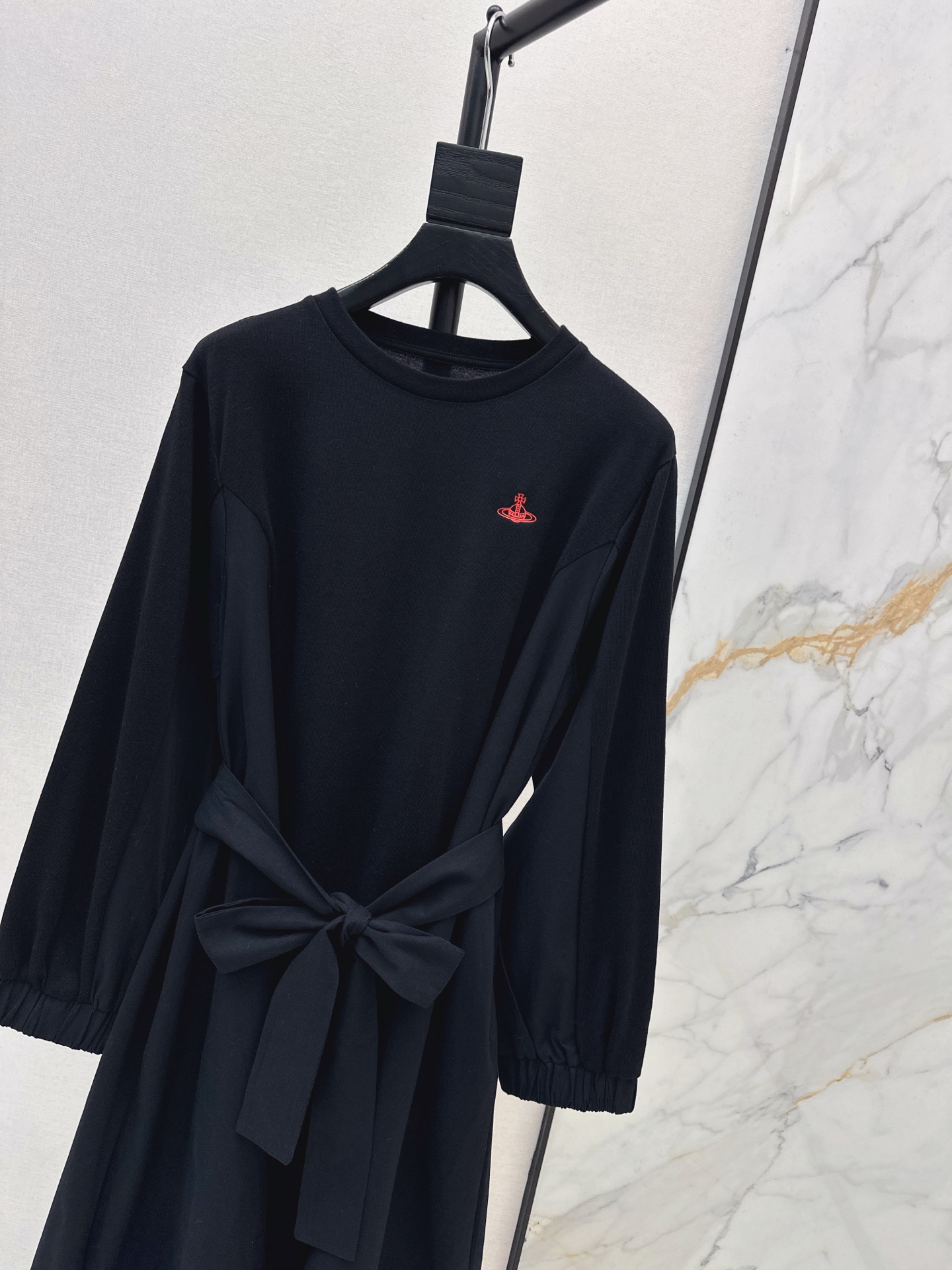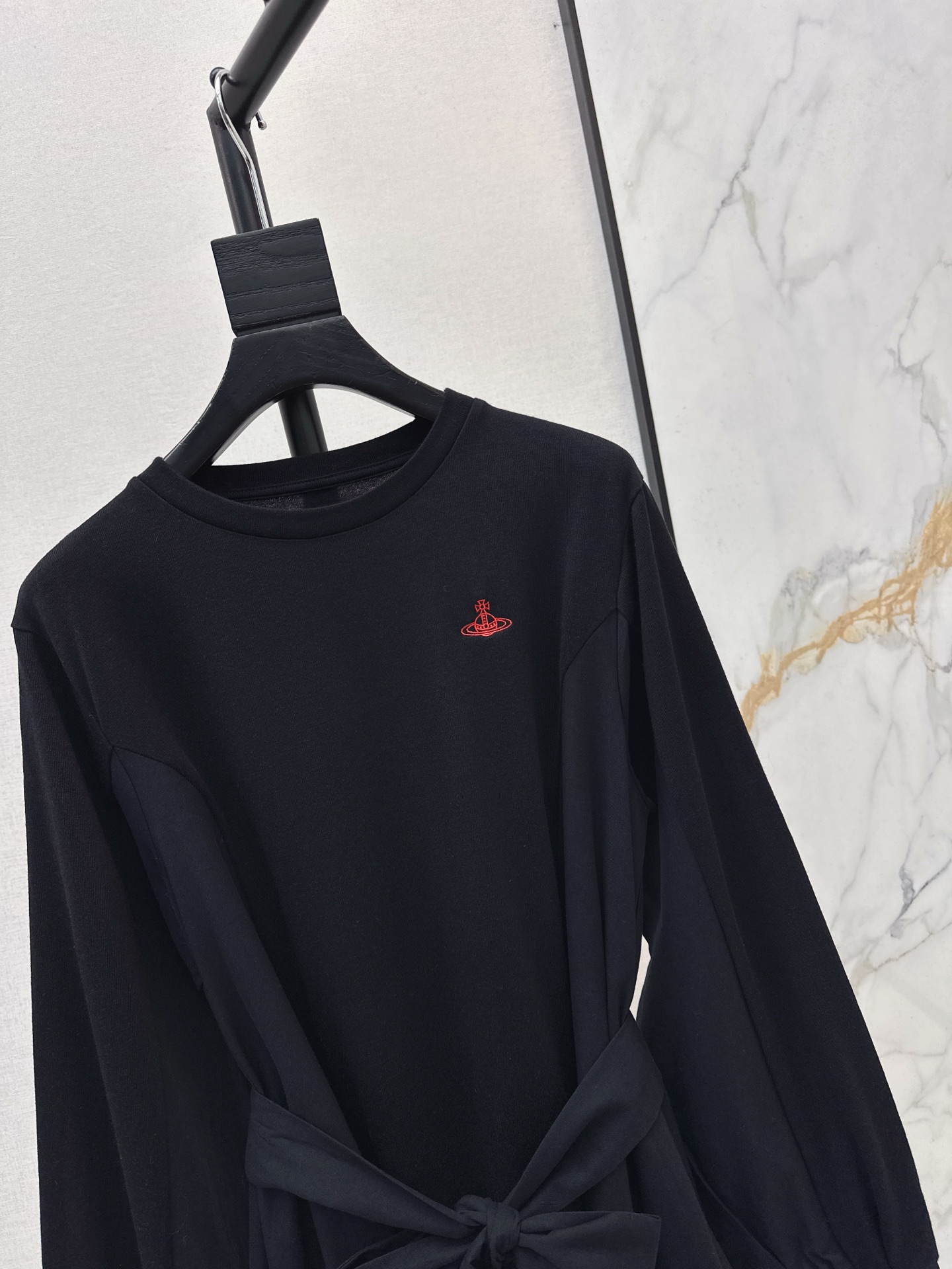 Details: Early spring black dress with waist strap, H - cut, red embroidery.