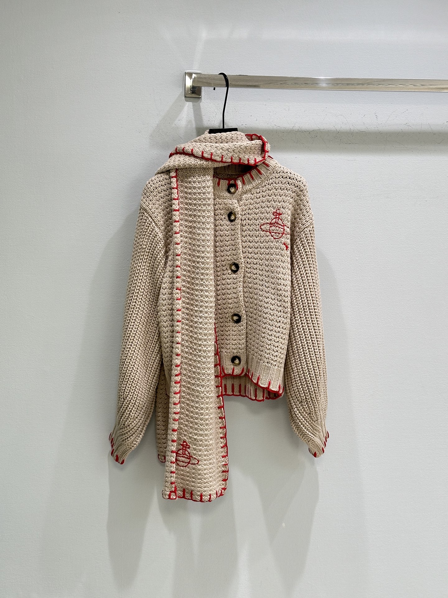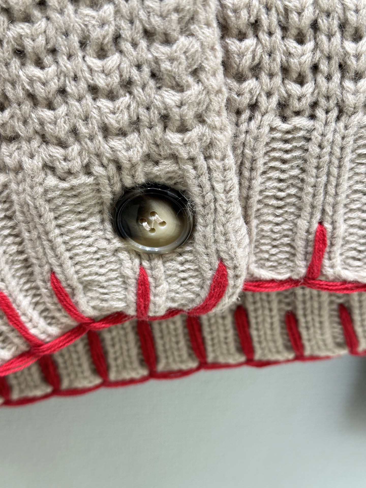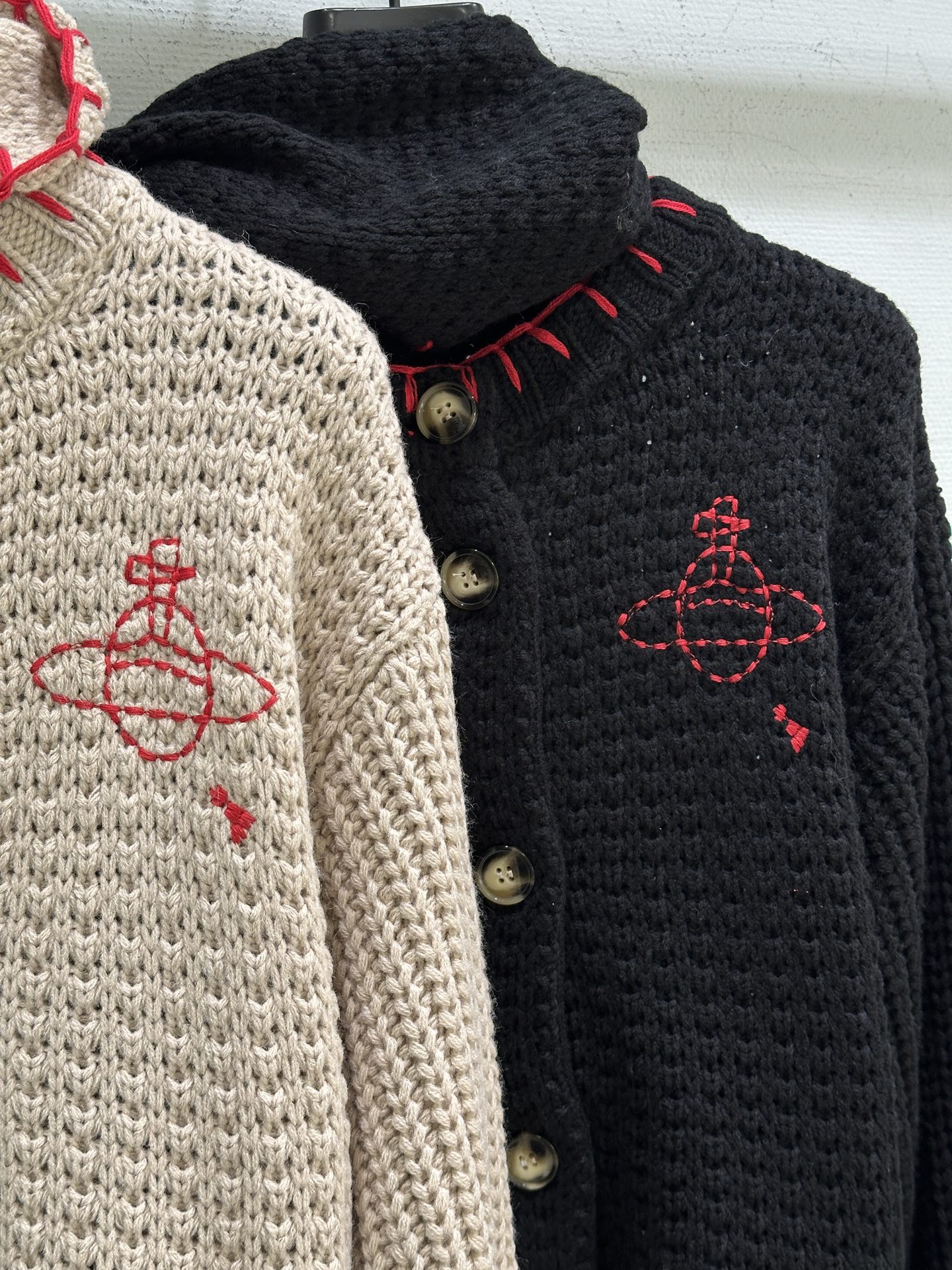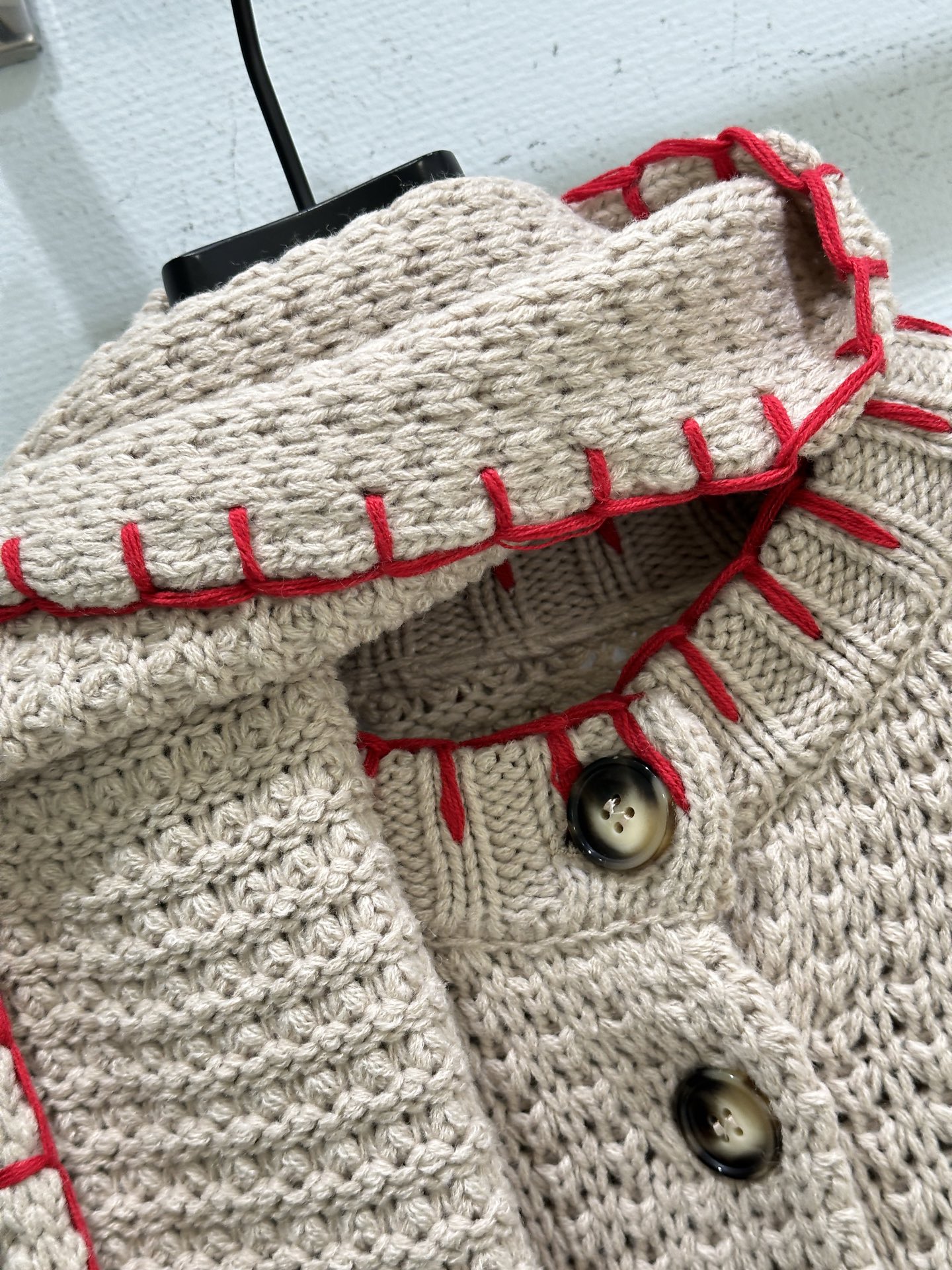 Details: Fall classic knitted cardigan with playful embroidery and red trim, suitable for winter with a scarf, available in black and beige.