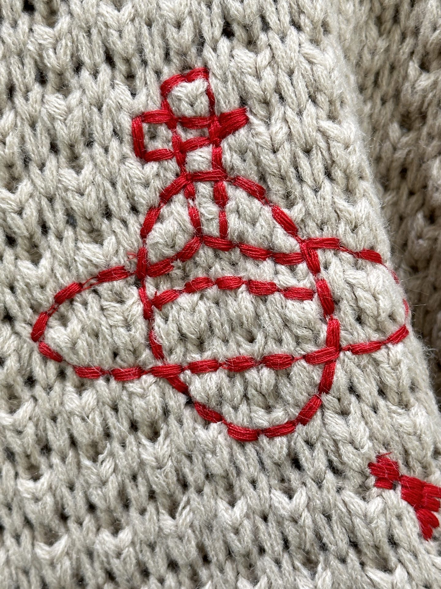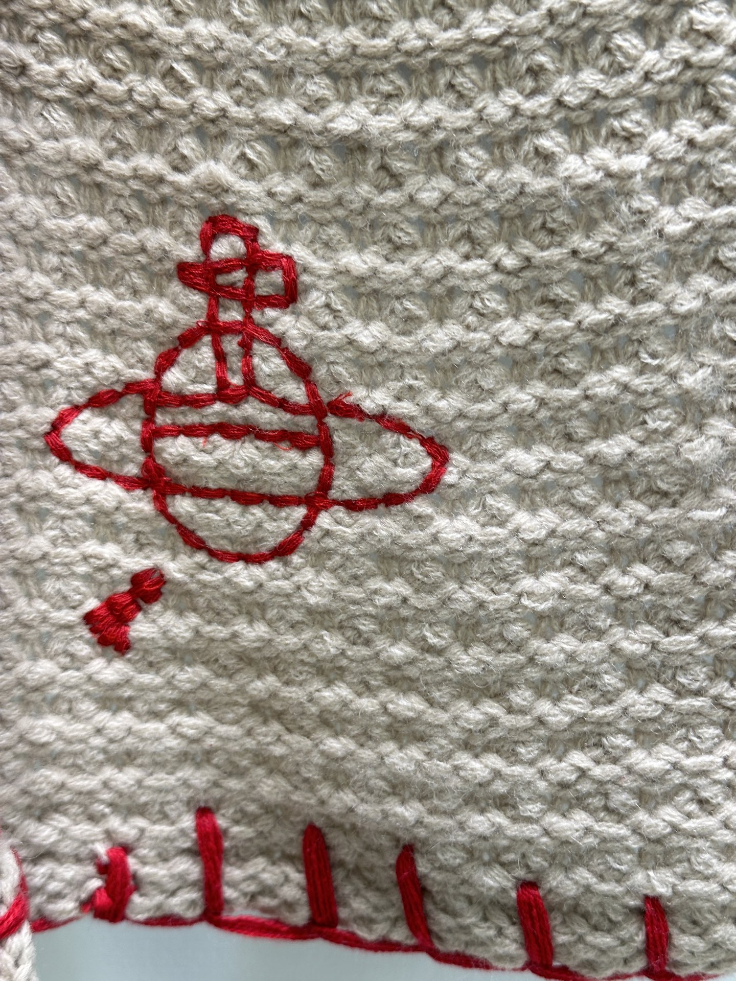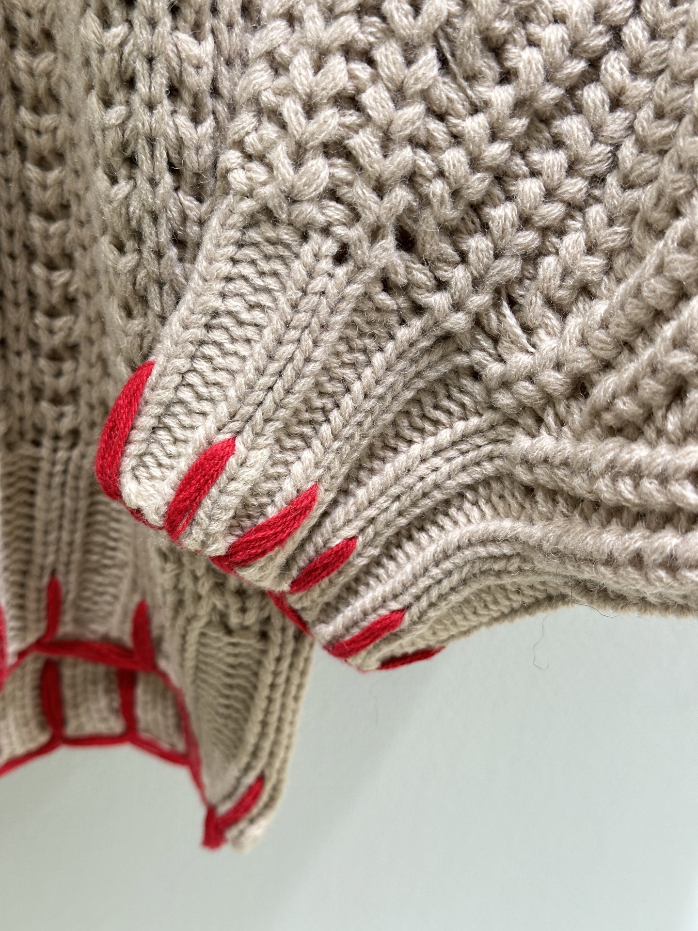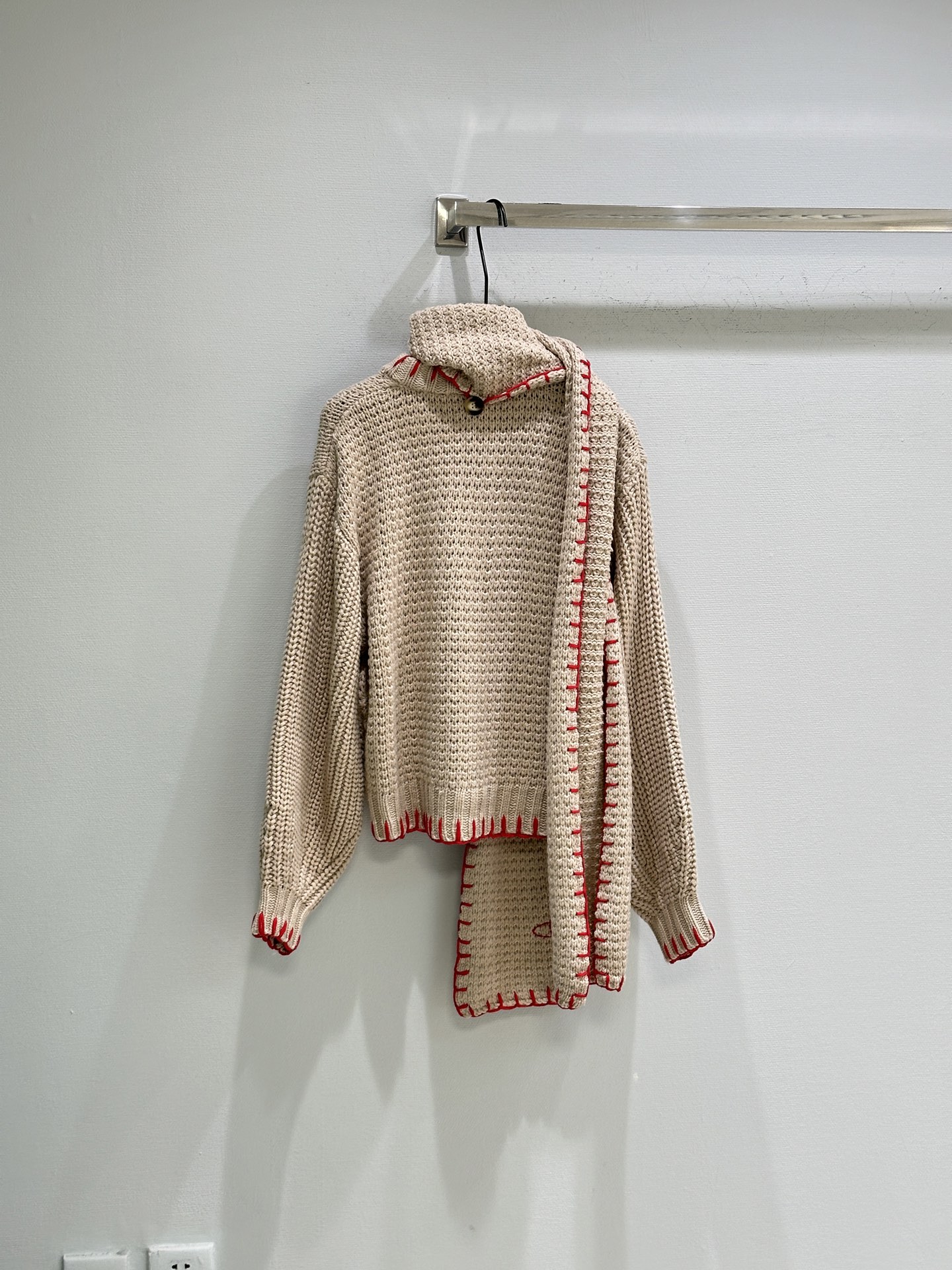 Details: Fall classic knitted cardigan with playful embroidery and red trim, suitable for winter with a scarf, available in black and beige.