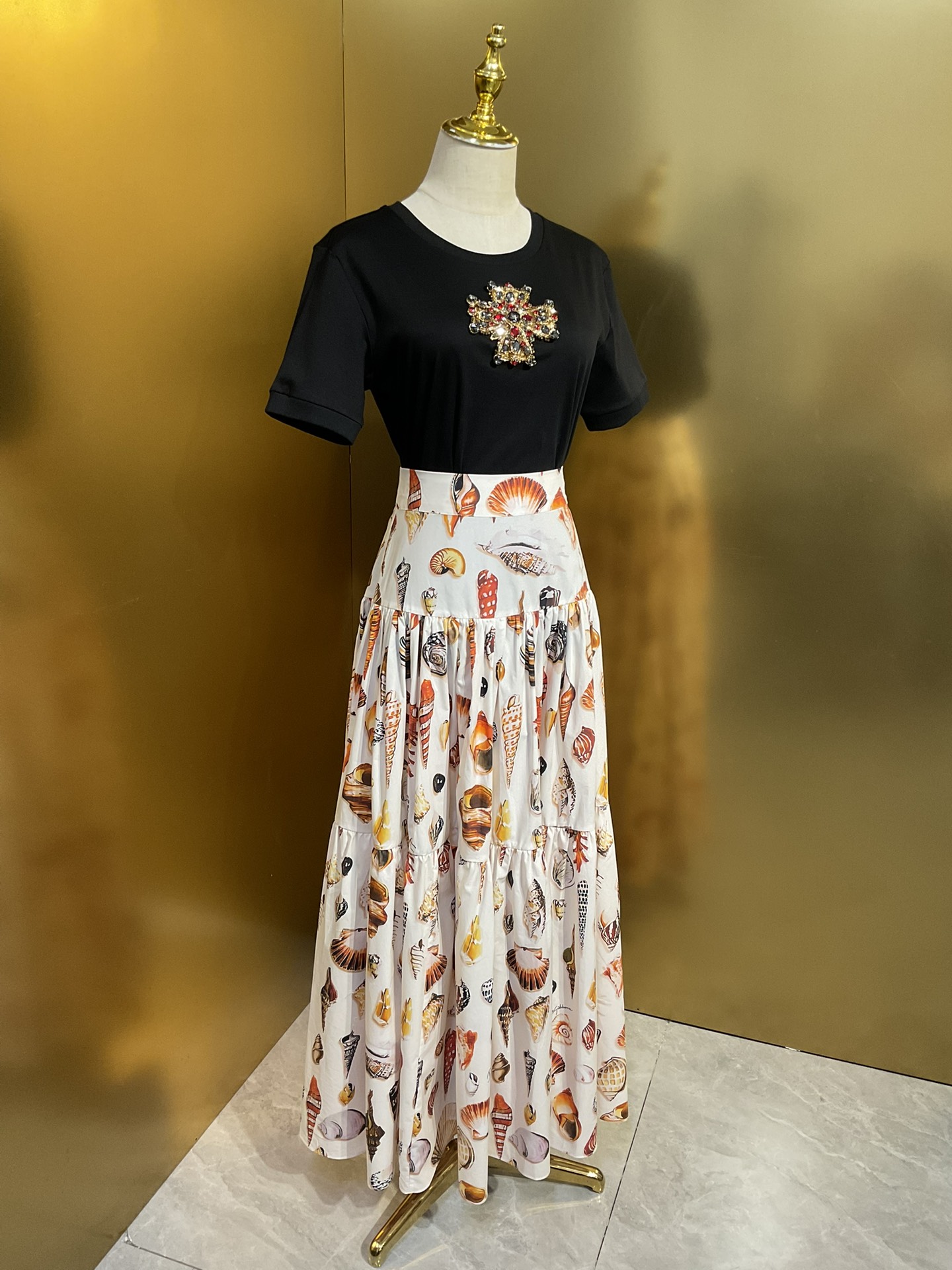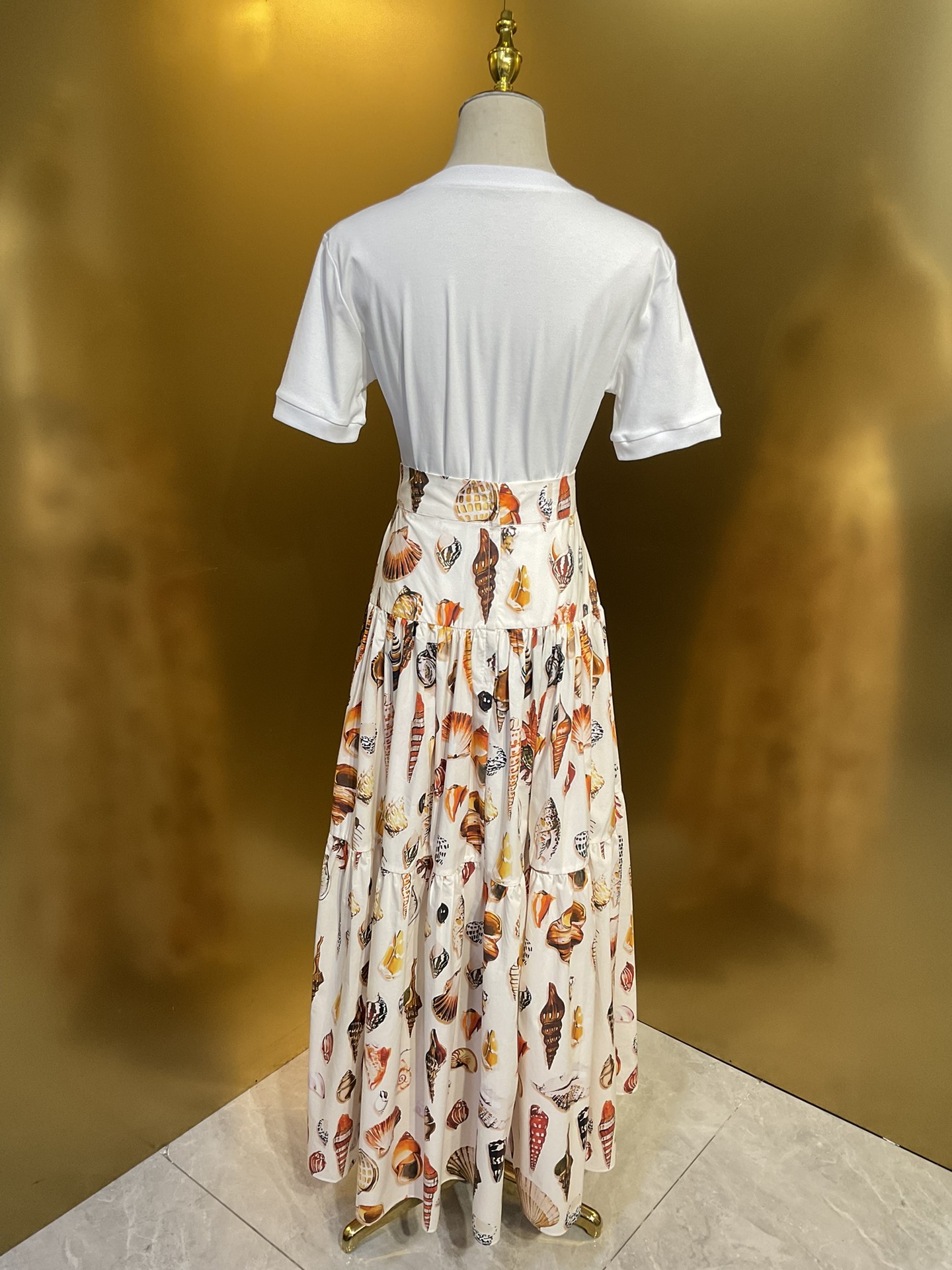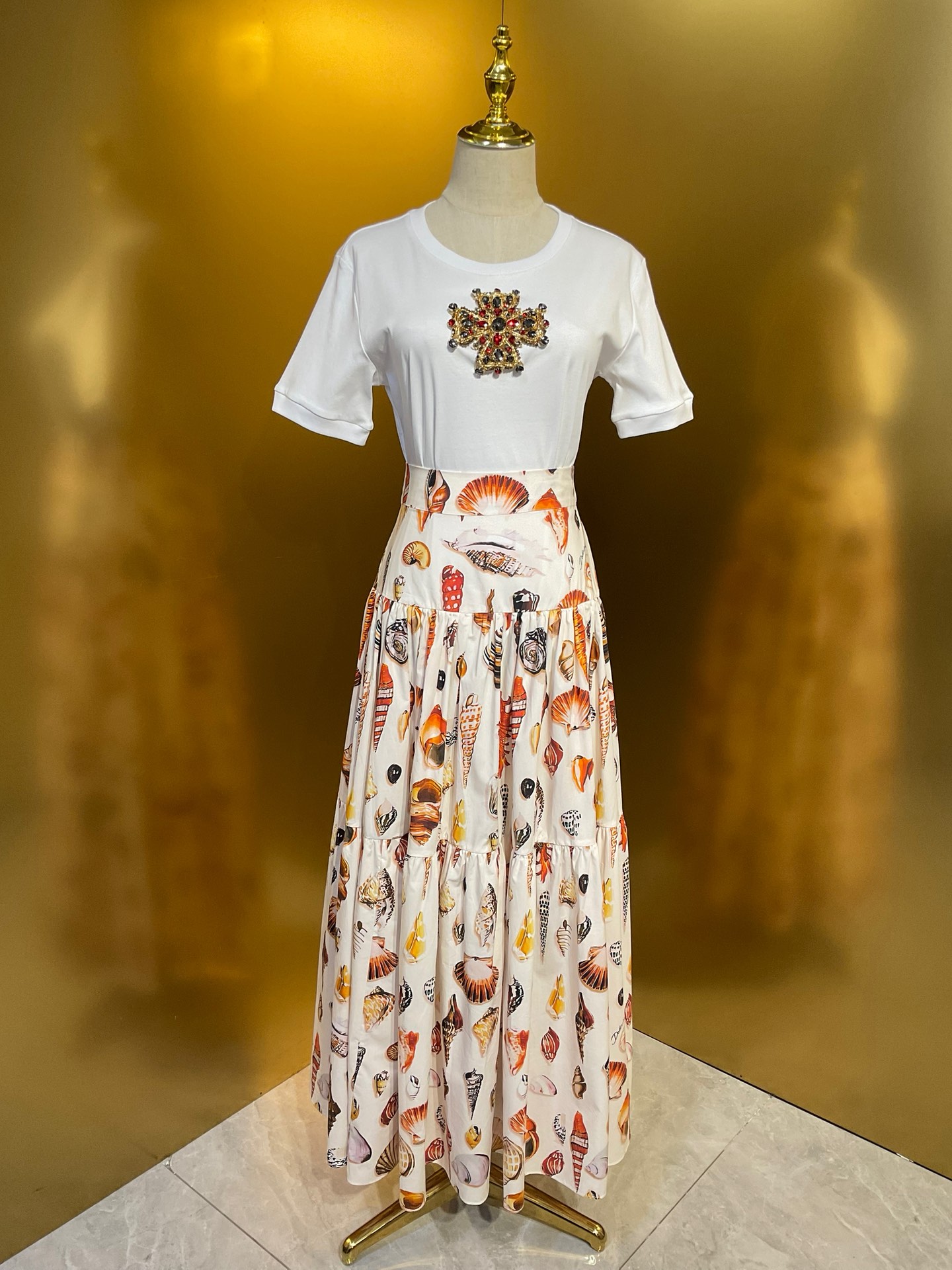 Details: Conch shell printed long skirt in multiple sizes.