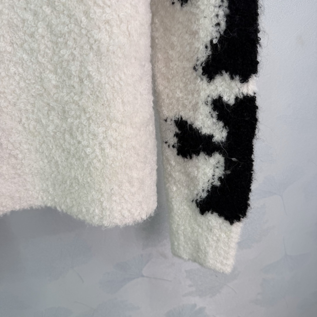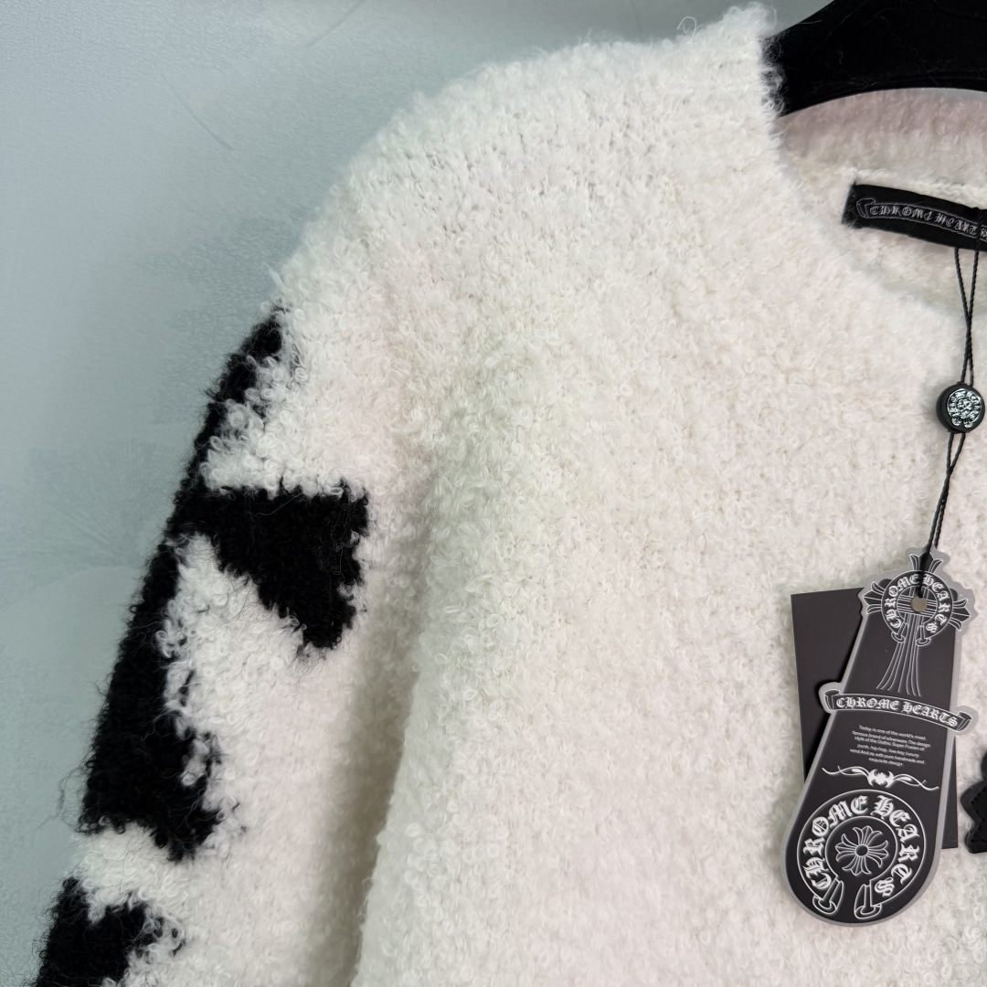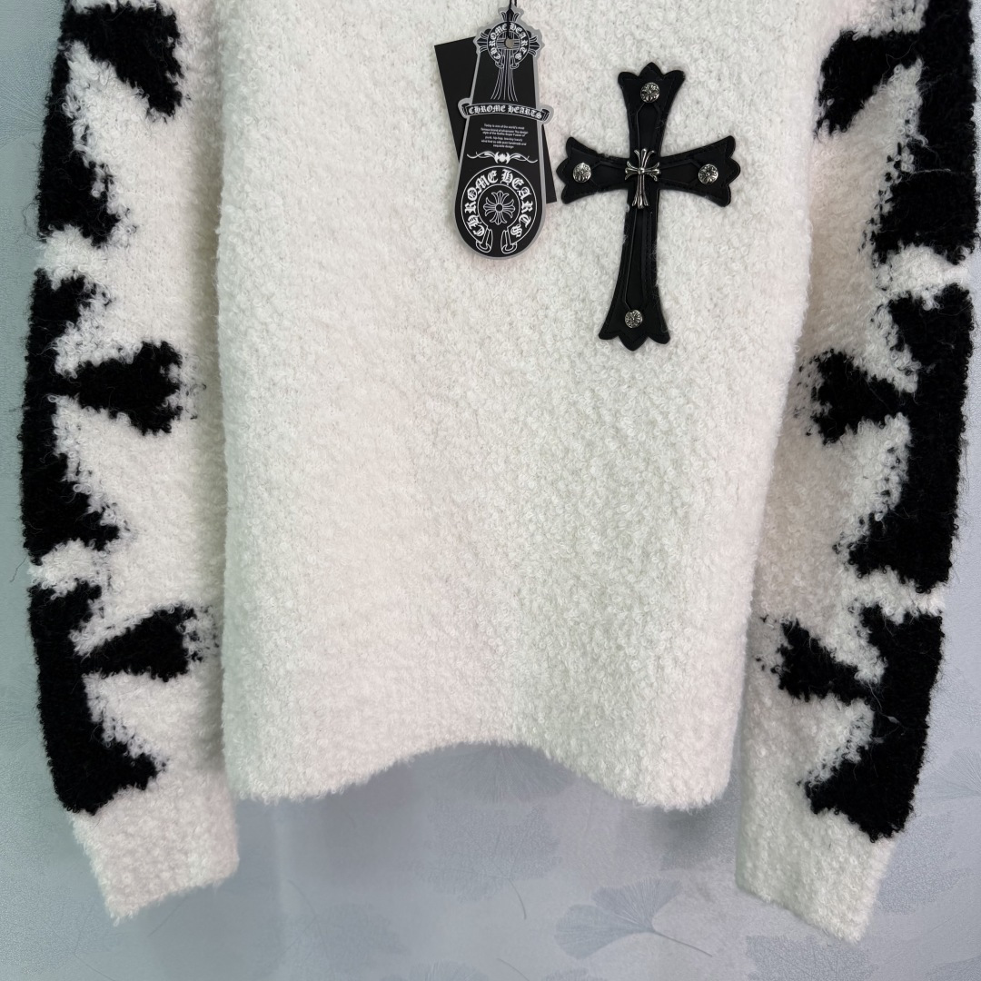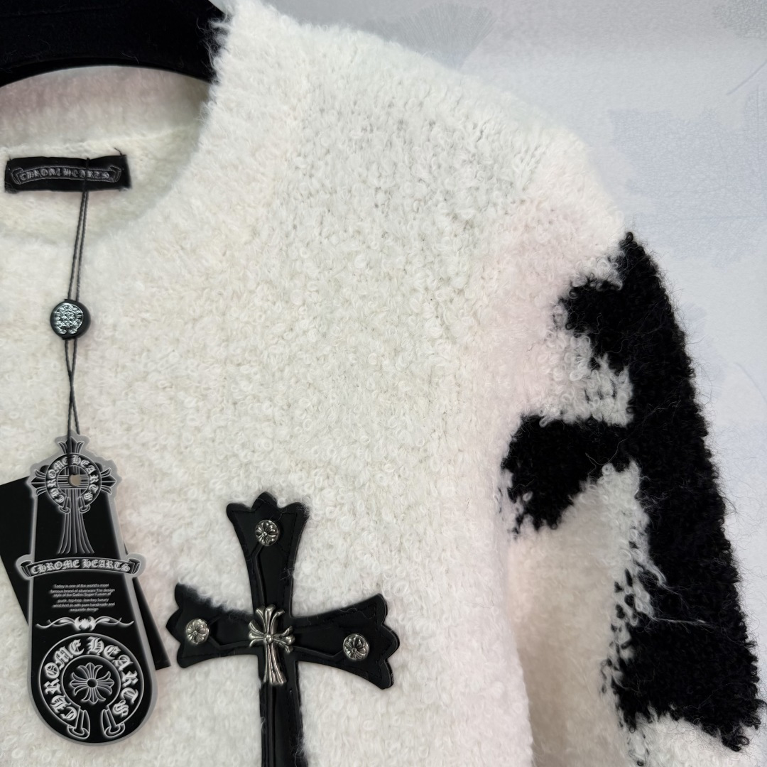 Details: Autumn-Winter Black and White Contrast Knit with Plush Fabric, Chest Cross Decoration, Loose Fit for Casual or Street Style