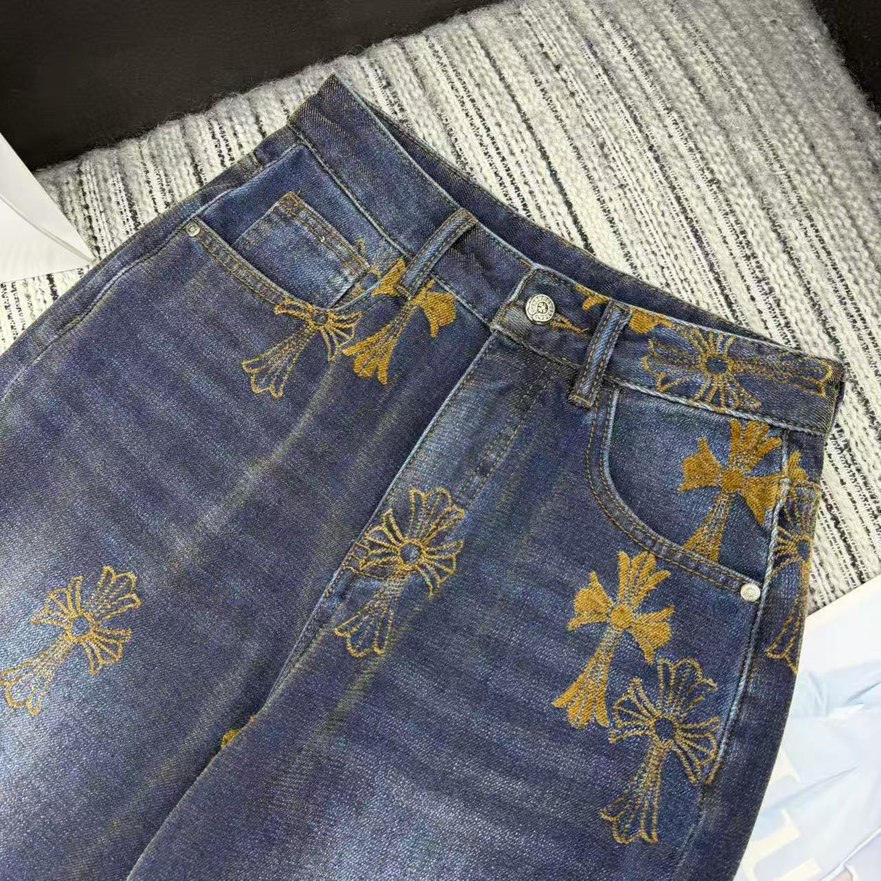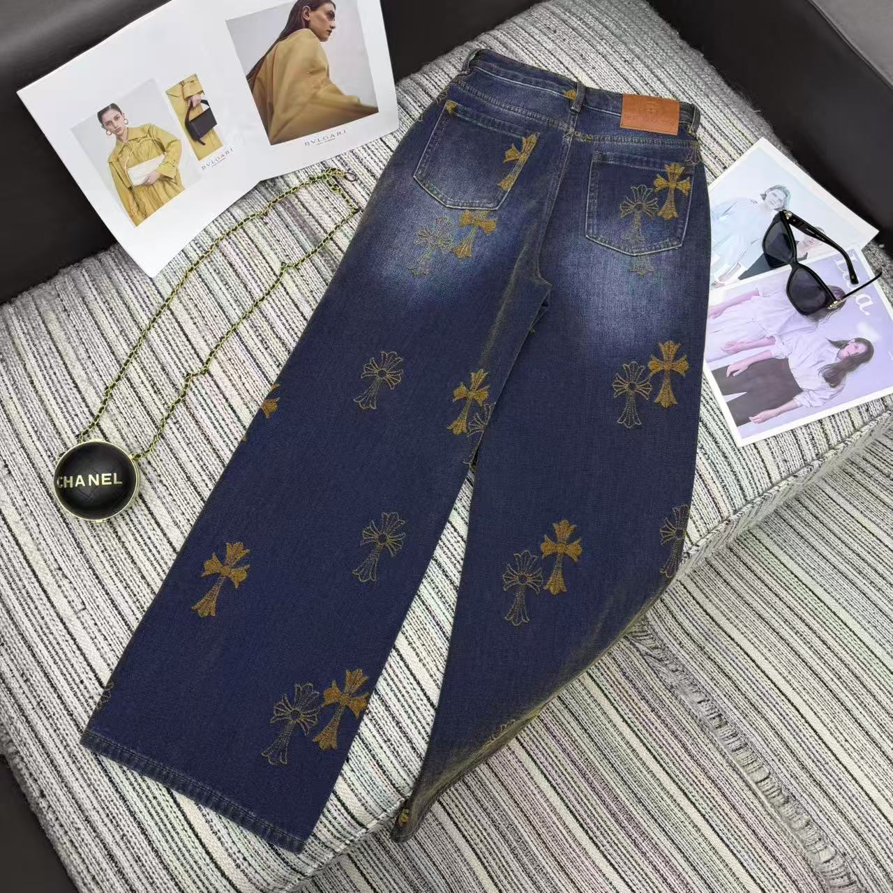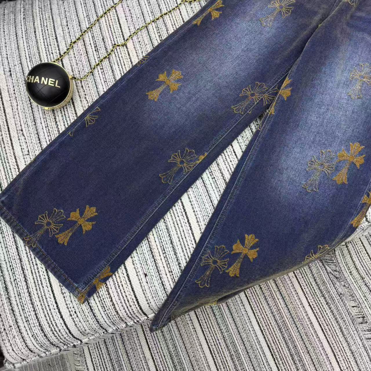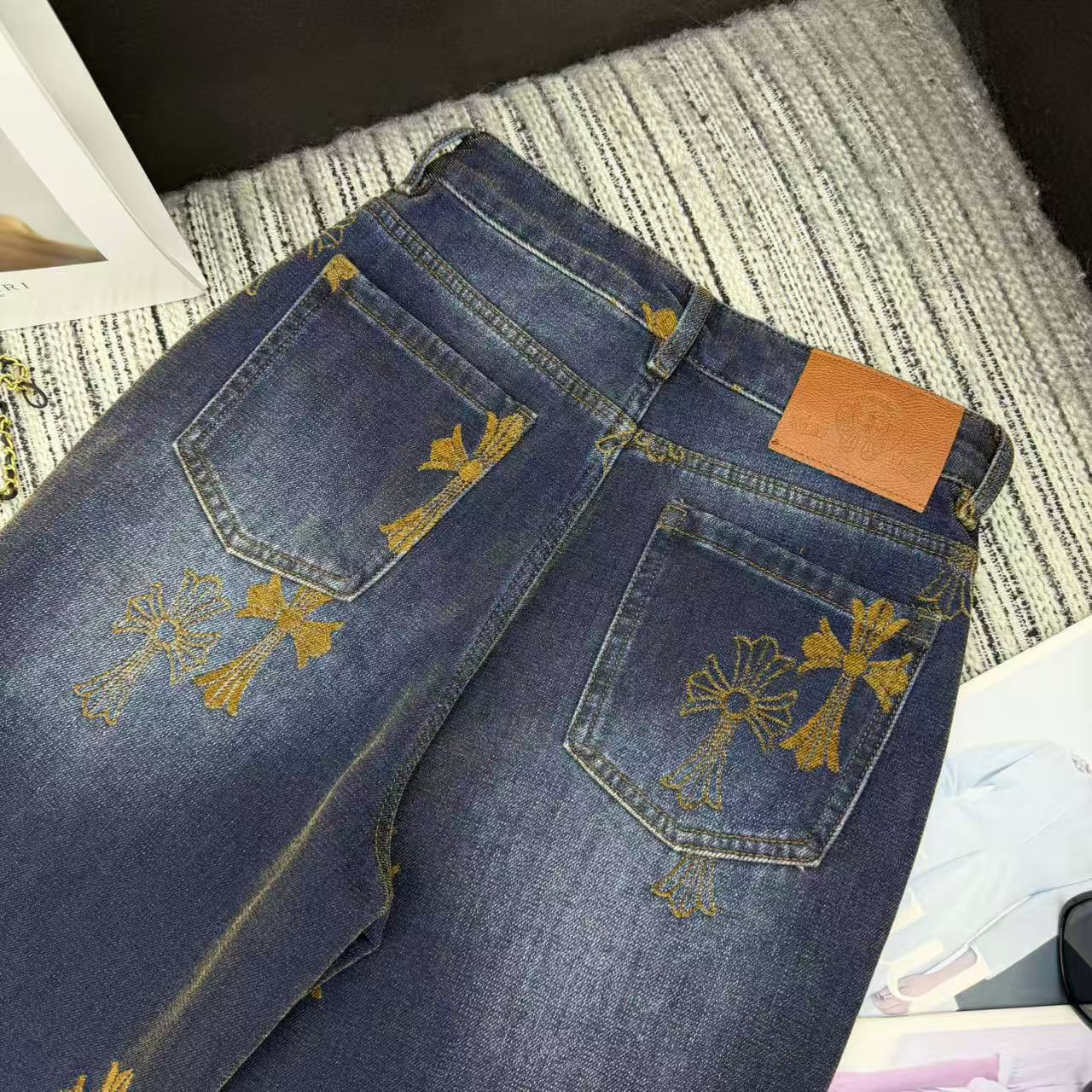 Details: Highly recommended for early autumn and winter, new embroidered cross denim straight-leg pants, warm and available in two colors.