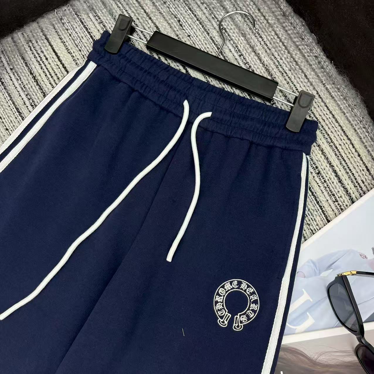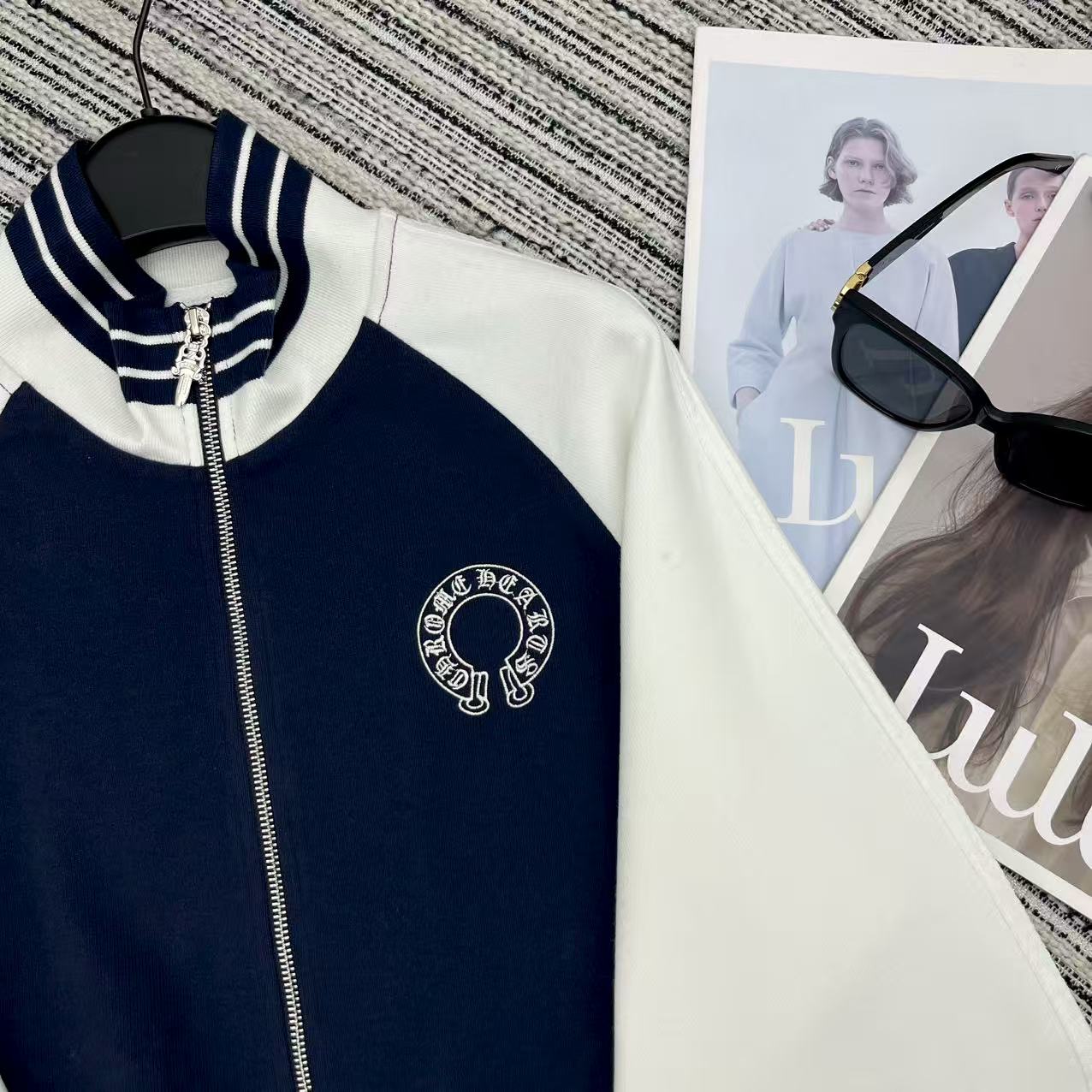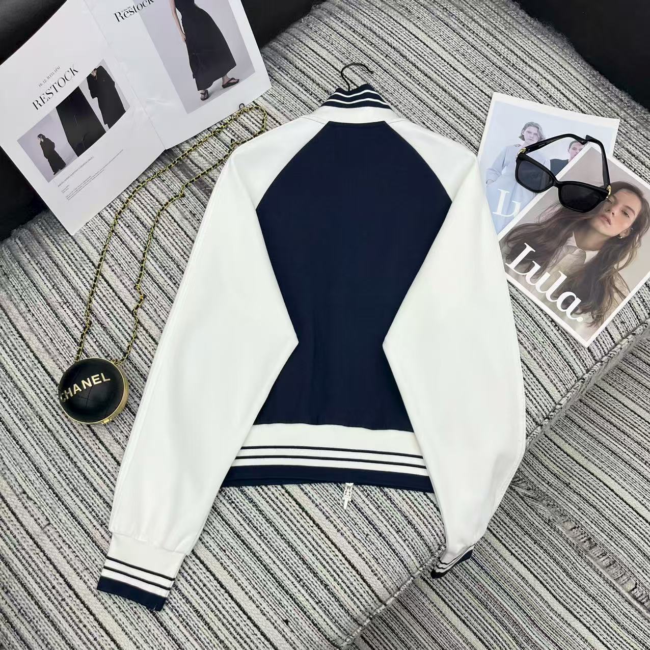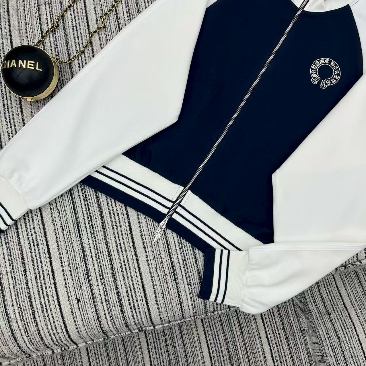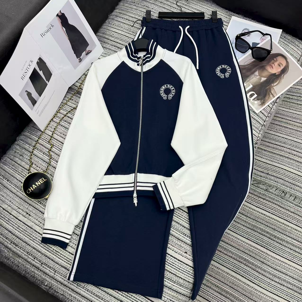 Details: Highly recommended color-blocked stand-up collar zippered sweatshirt and straight-leg pants set with embroidered logo for early autumn .