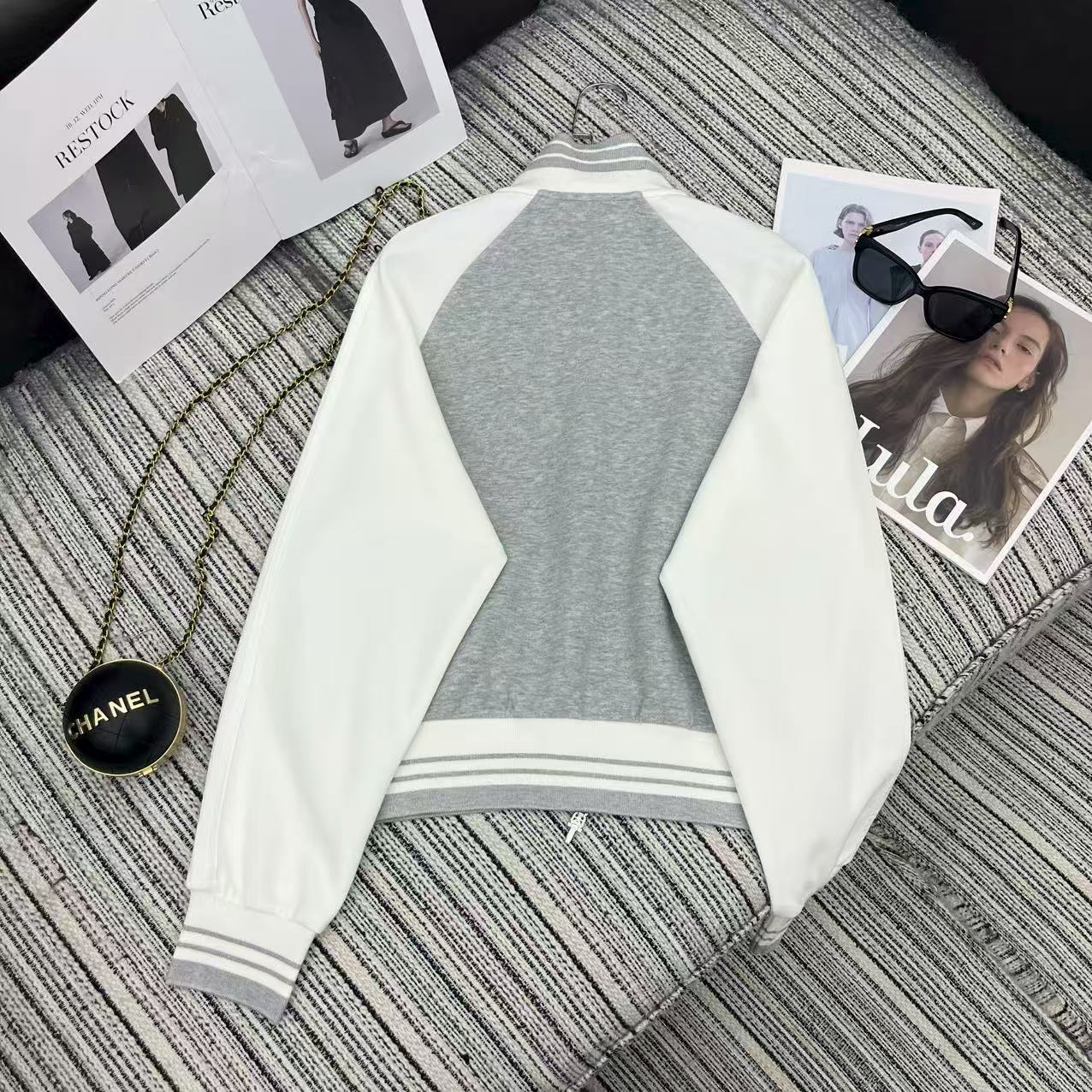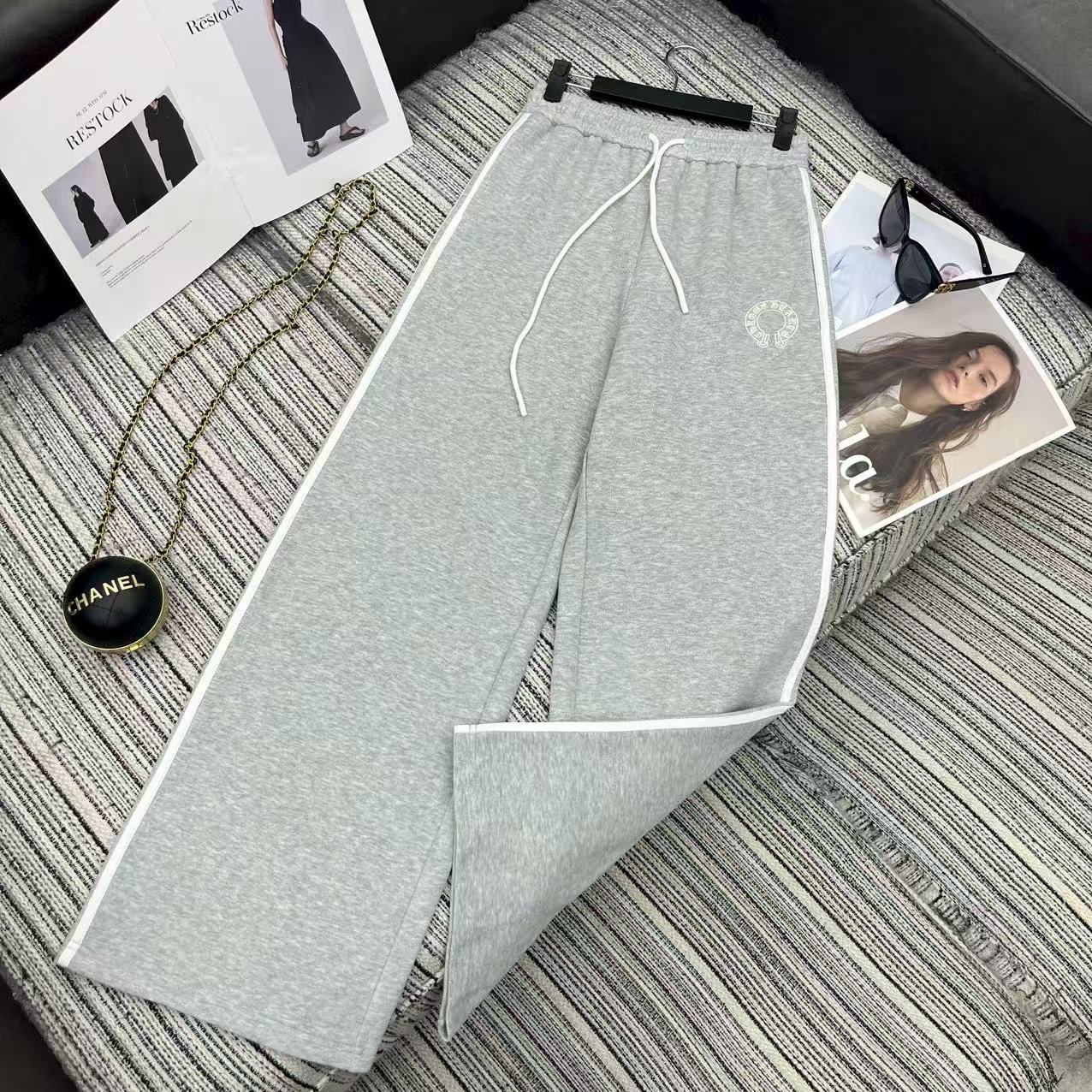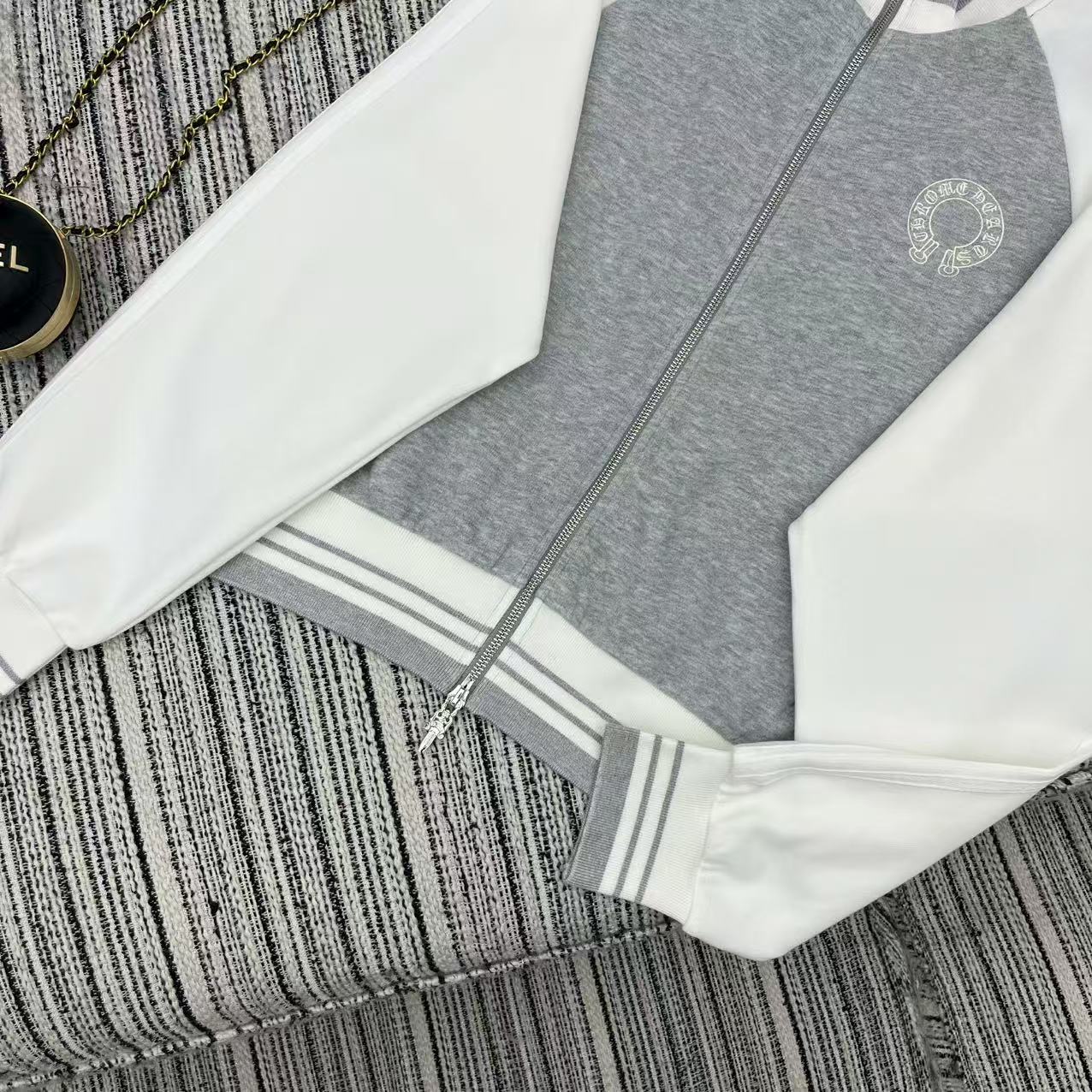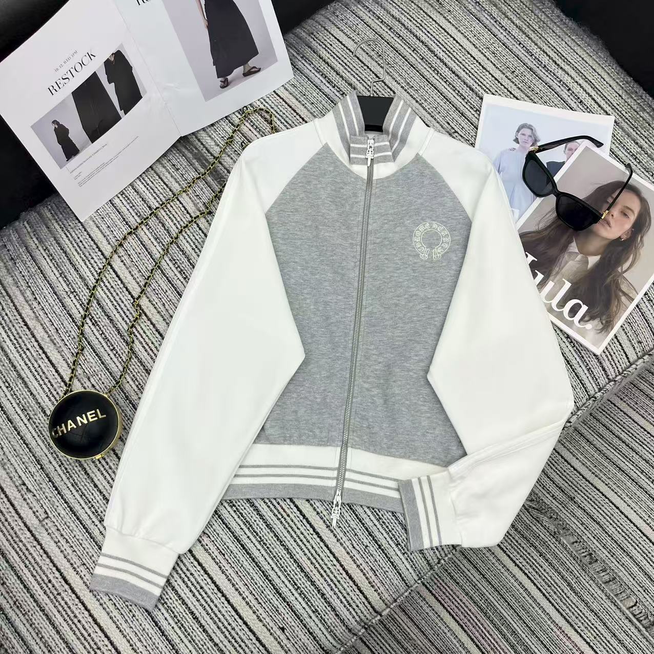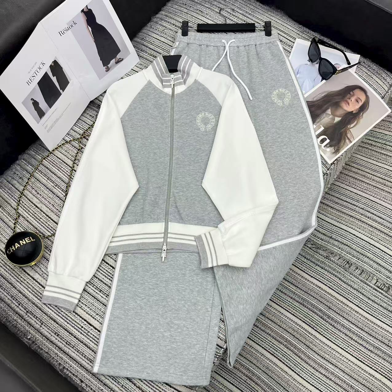 Details: Highly recommended color-blocked stand-up collar zippered sweatshirt and straight-leg pants set with embroidered logo for early autumn .