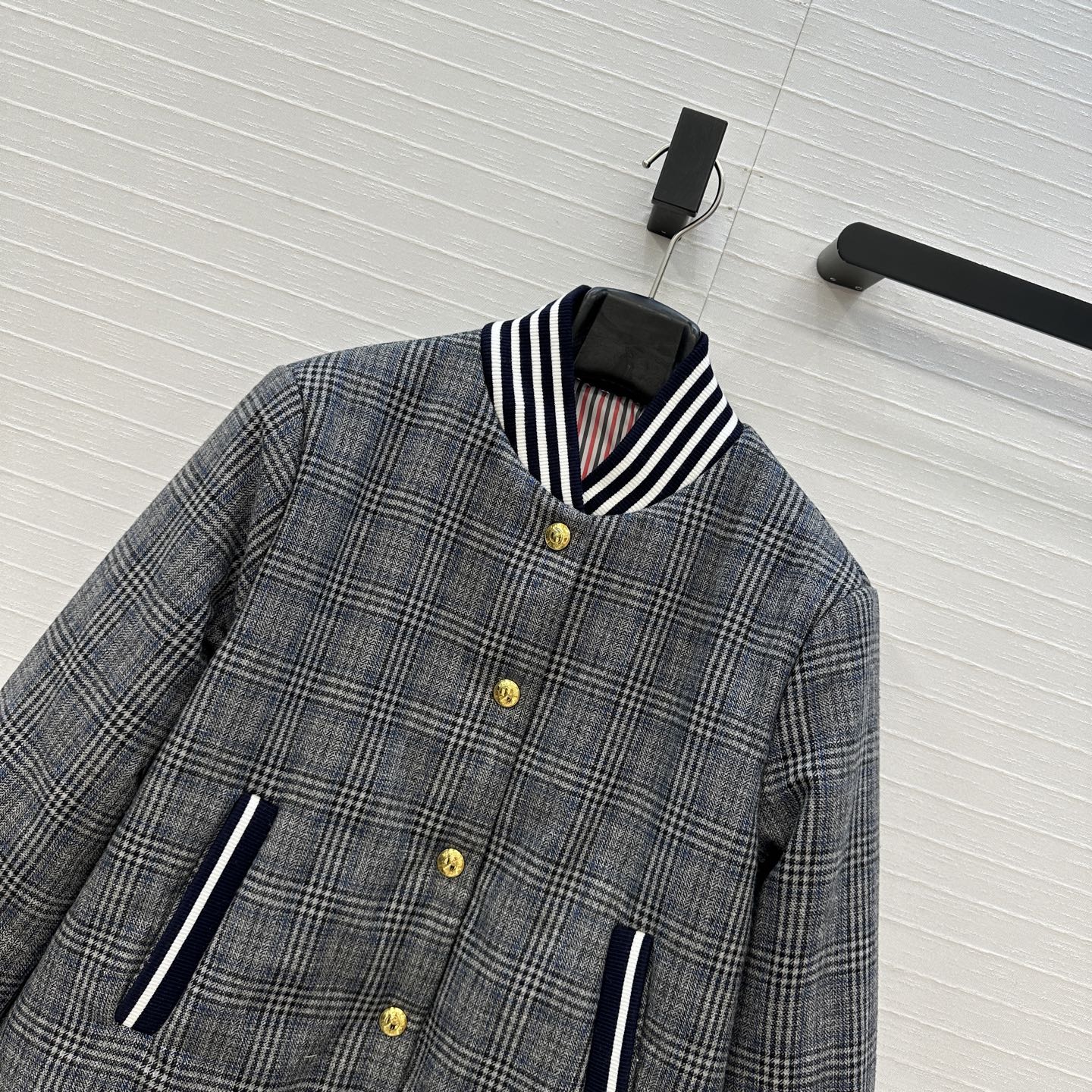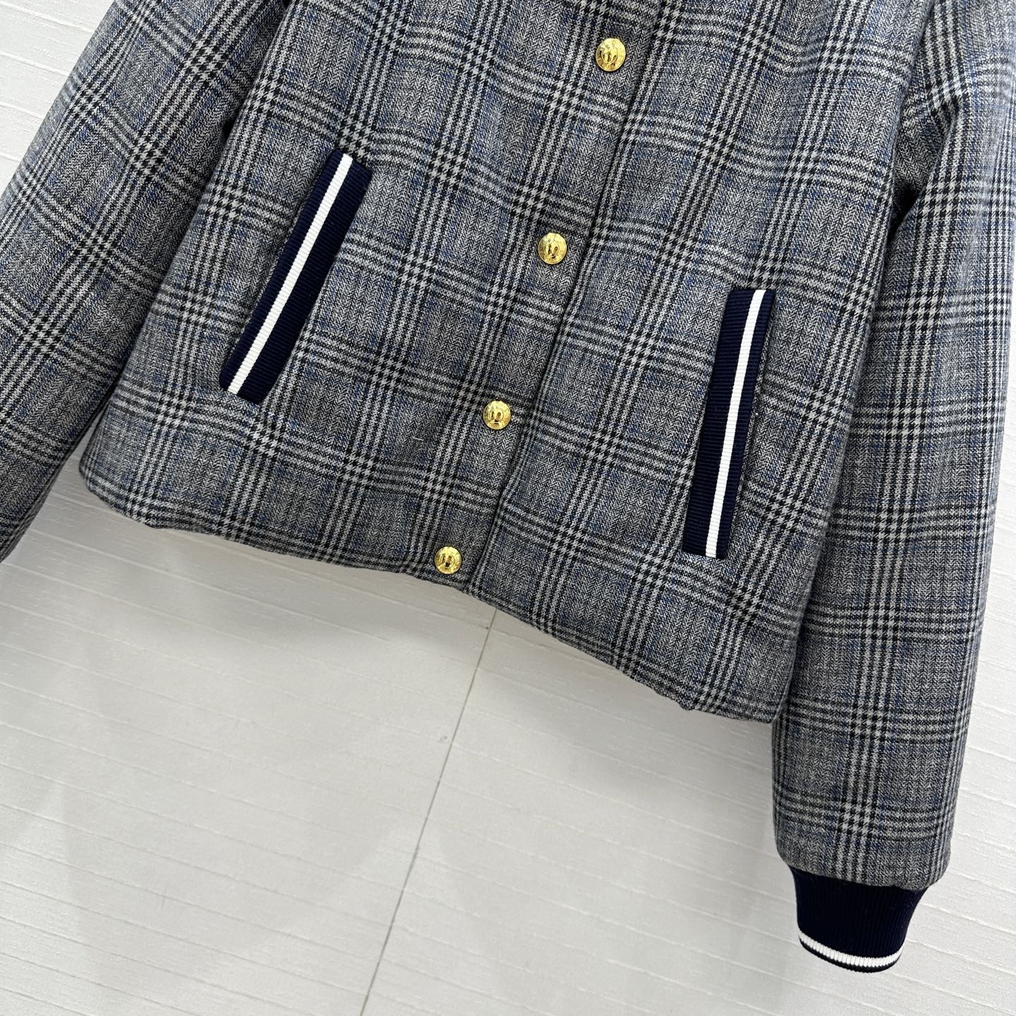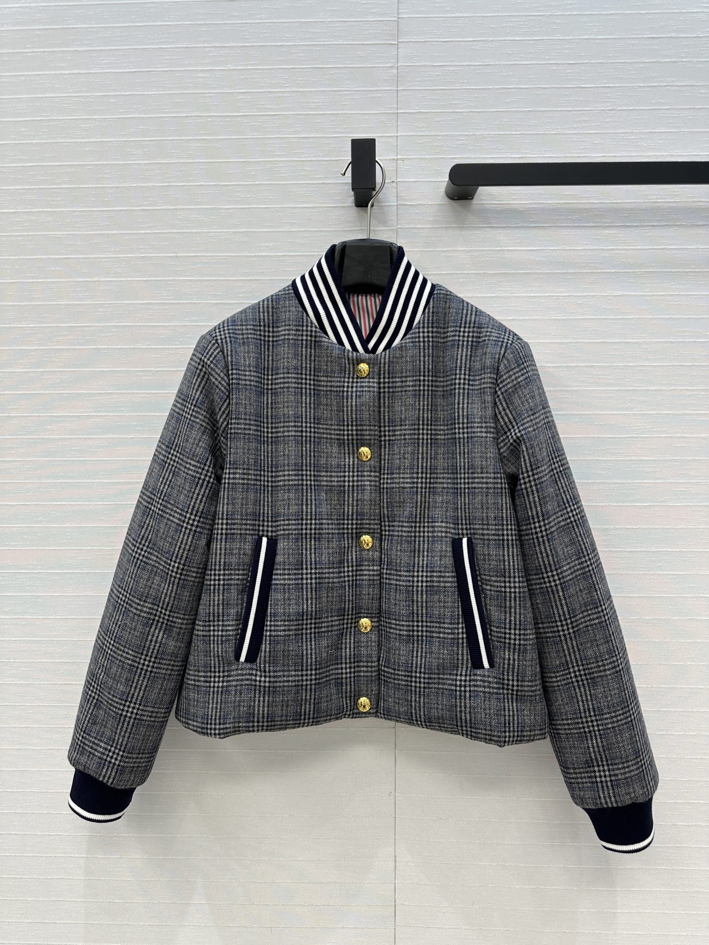 Details: Autumn gray plaid cotton coat, iconic stripes, metal buttons, short cut.