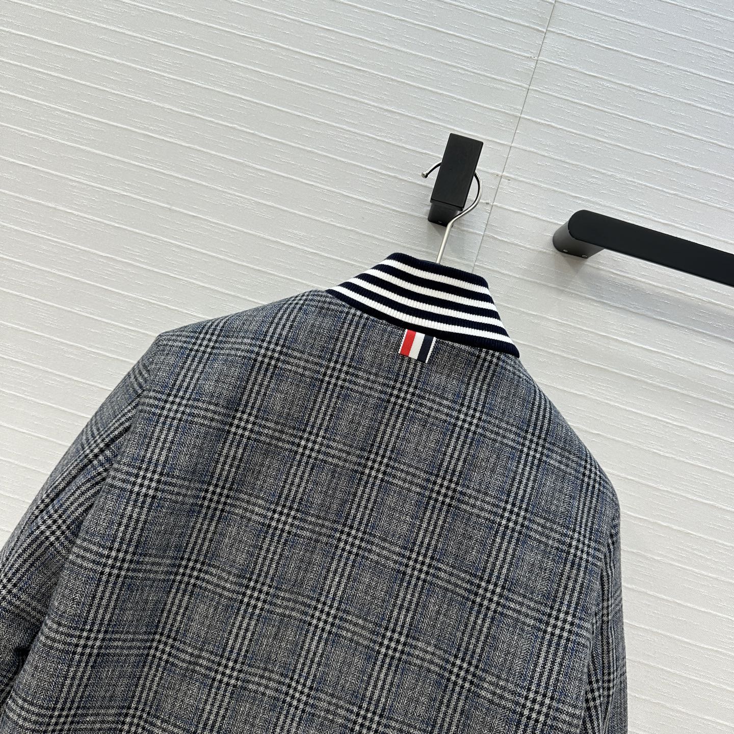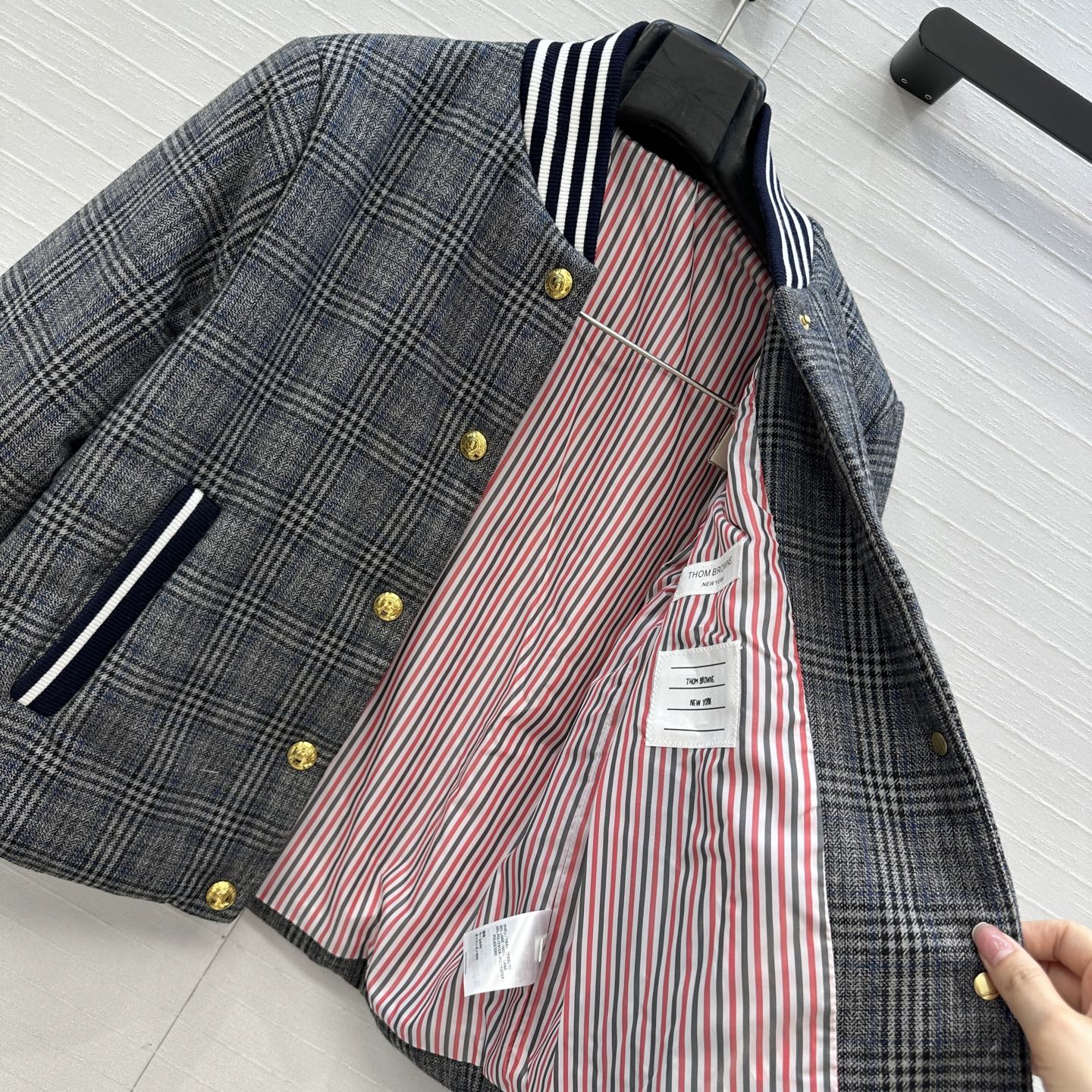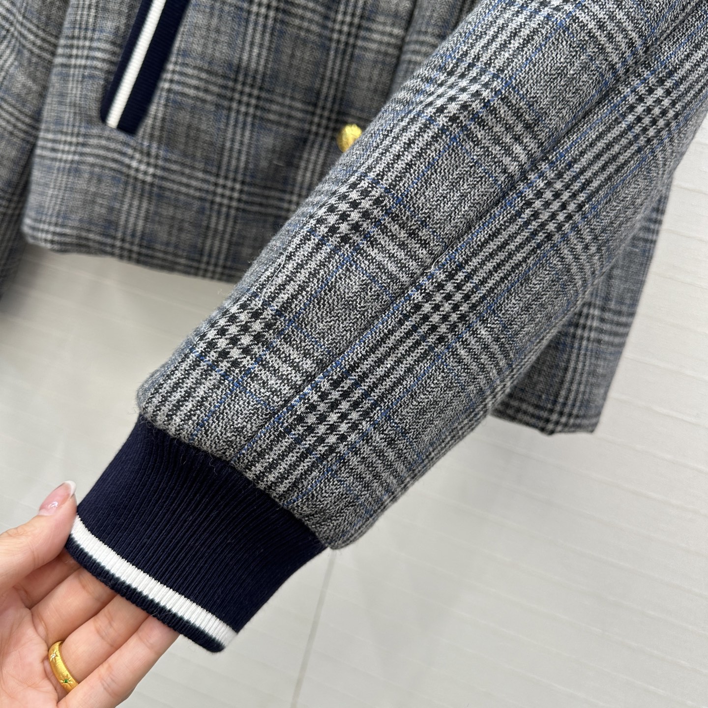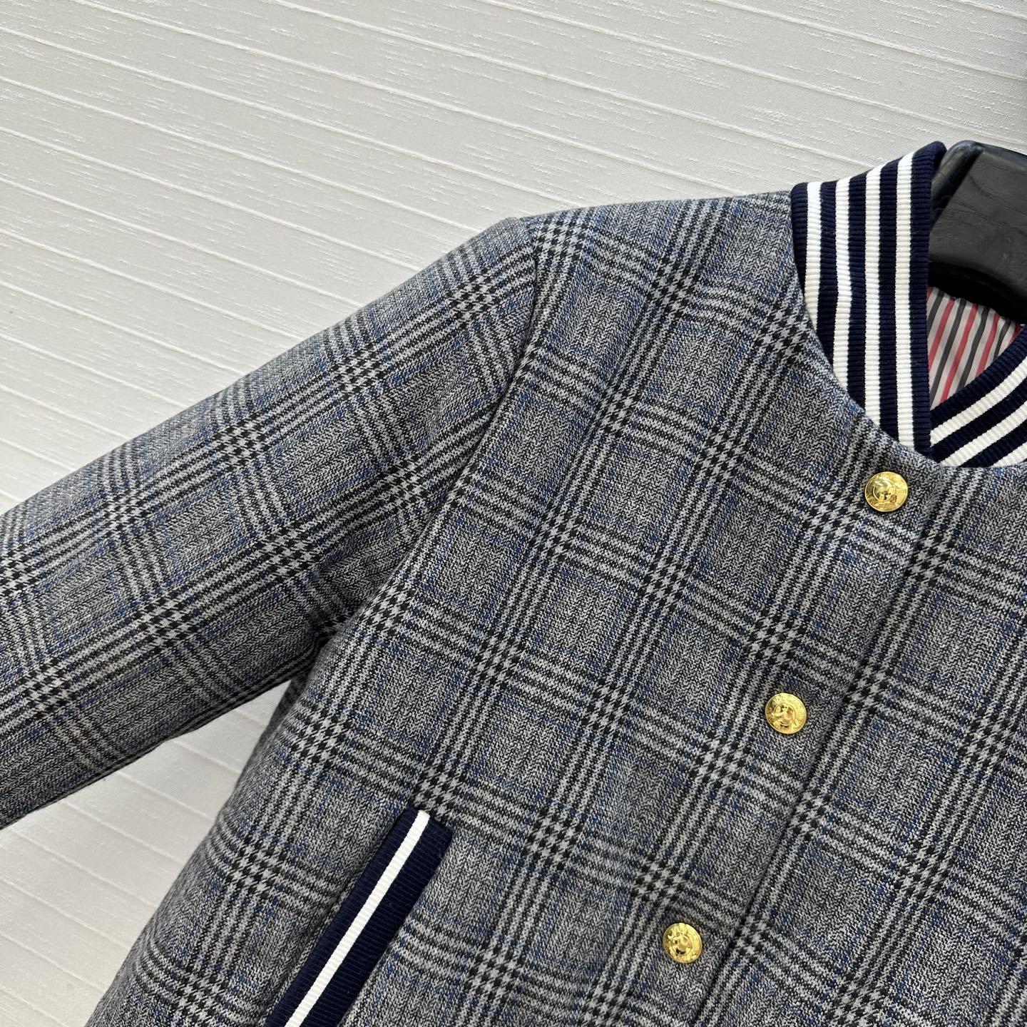 Details: Autumn gray plaid cotton coat, iconic stripes, metal buttons, short cut.
