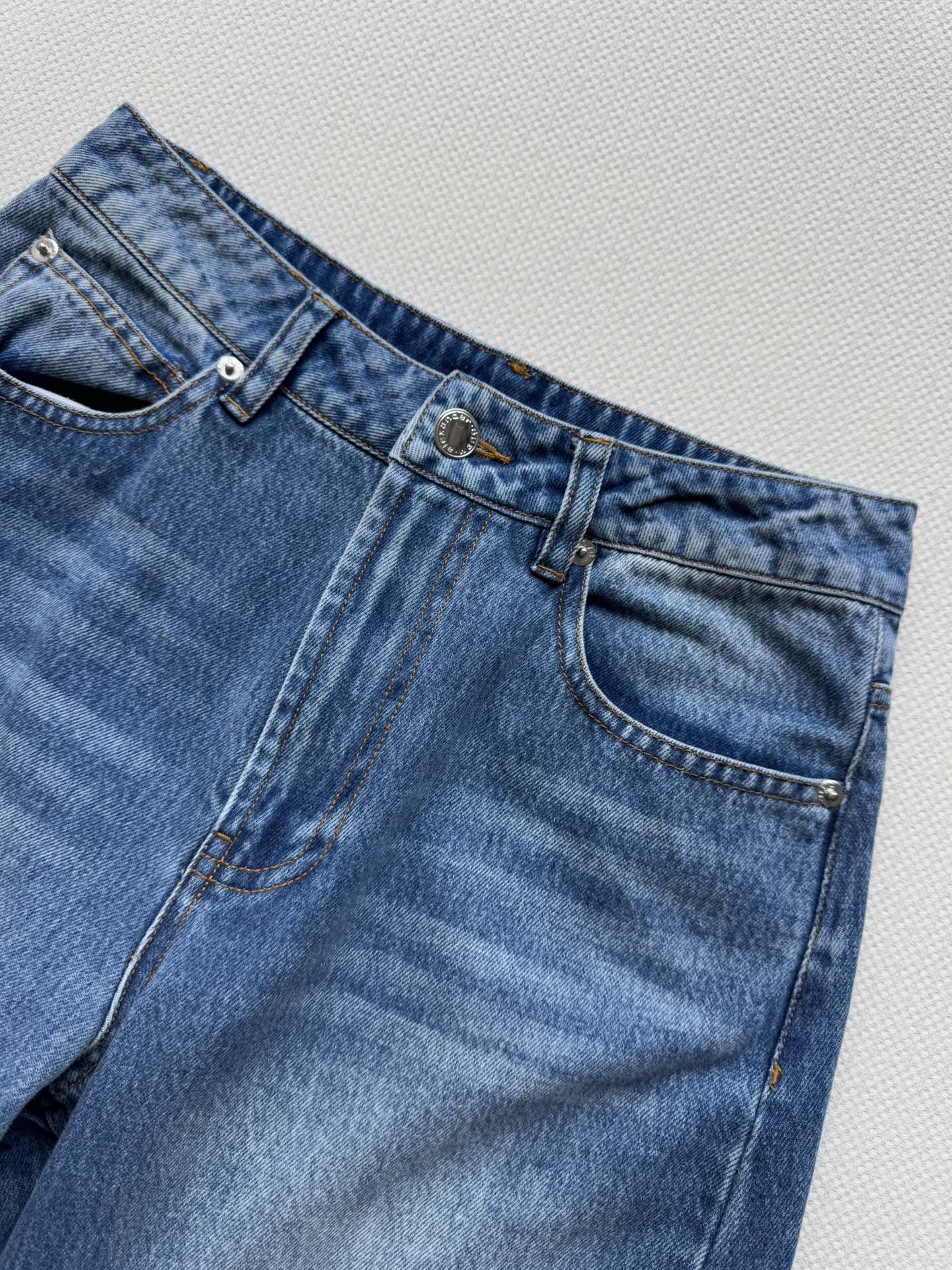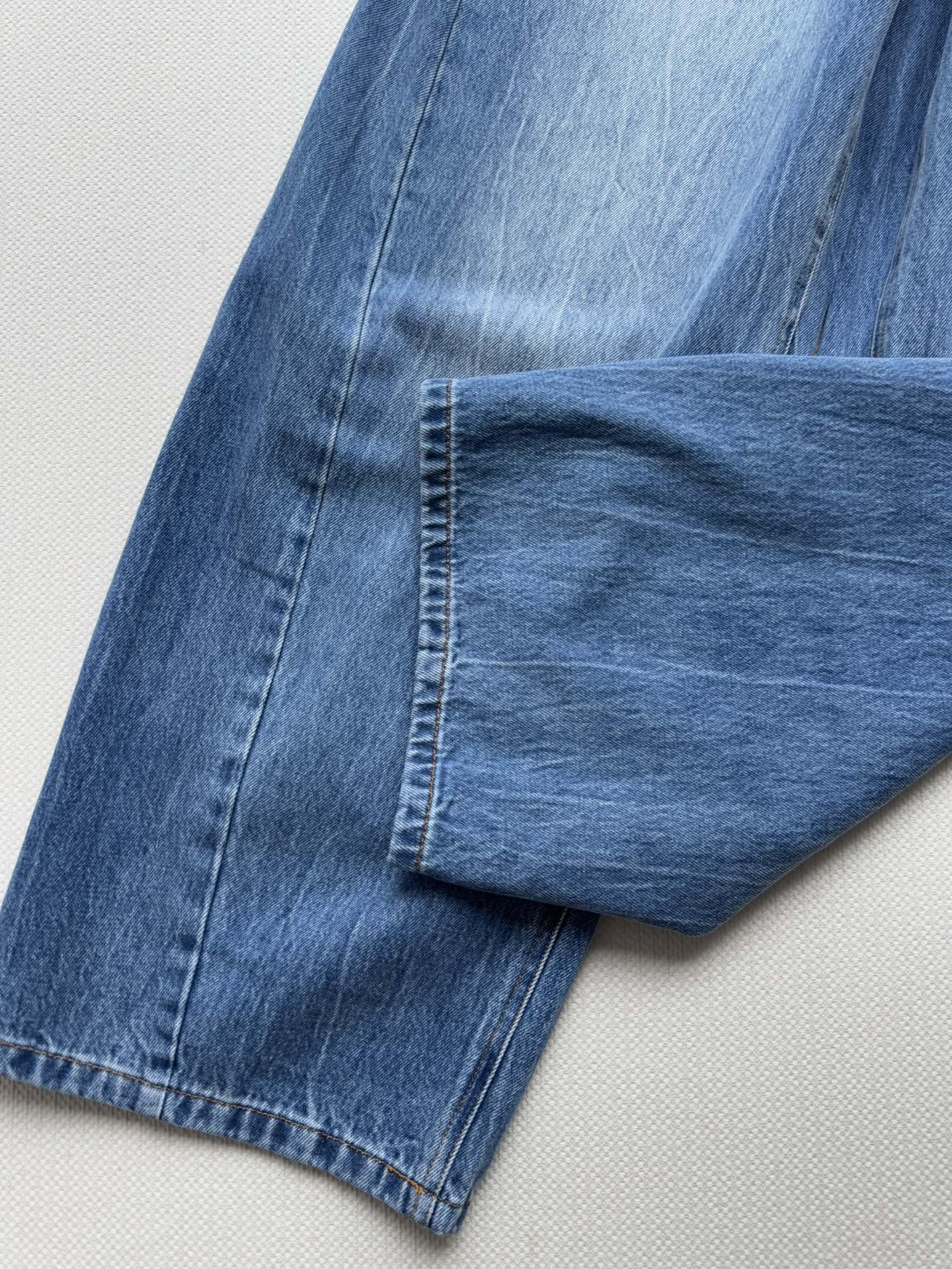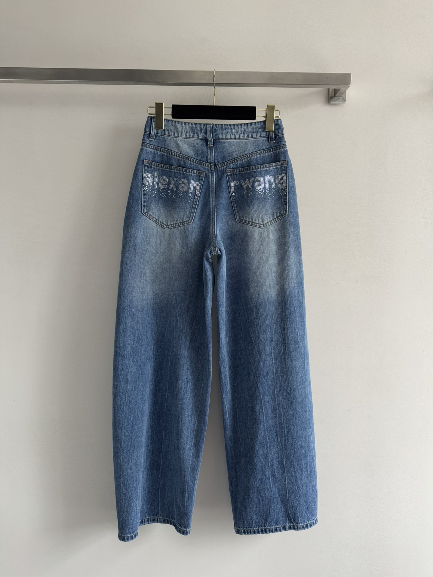 Details: New washed - fabric high - waisted jeans, lazy and stylish, with logo - studded back pockets, available in 2 colors, sizes SML. High - end customization, fine workmanship