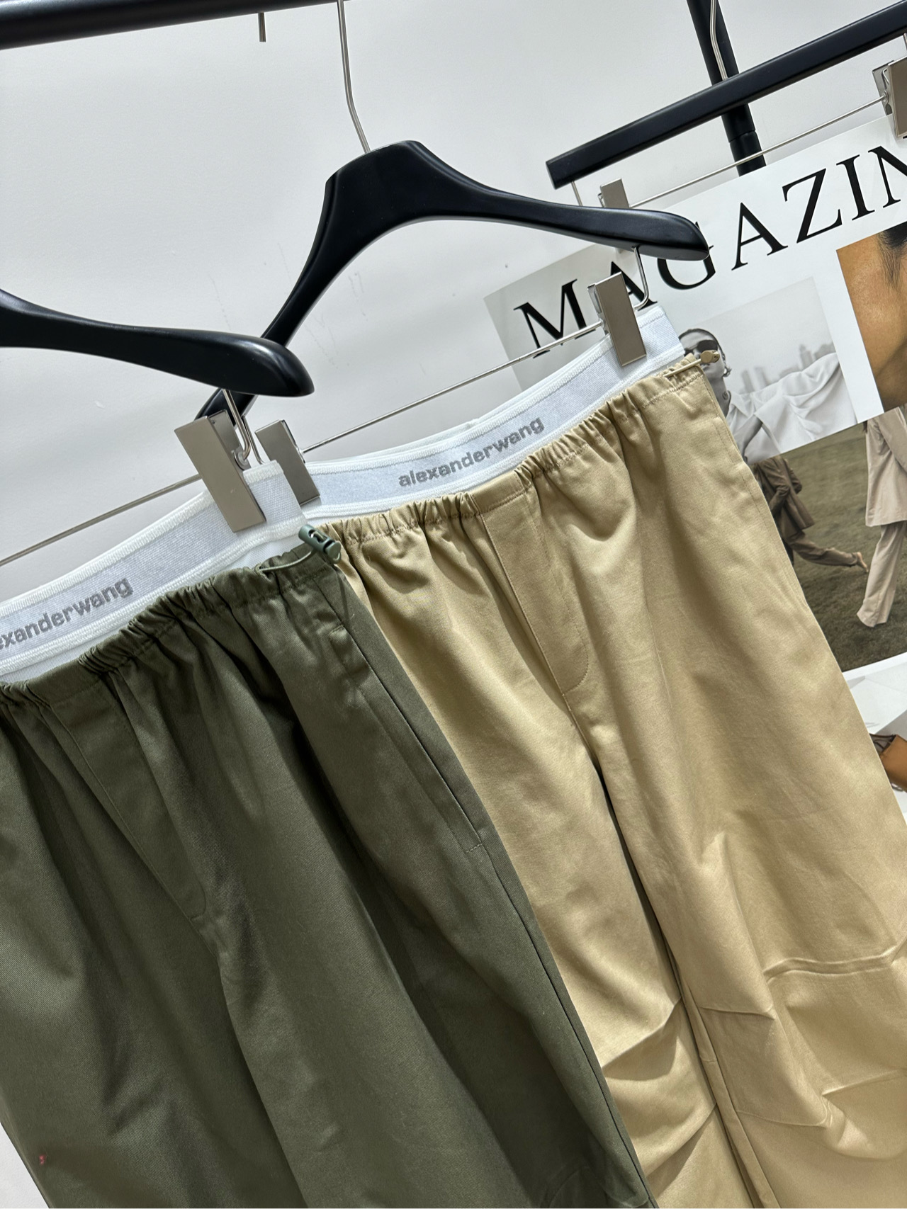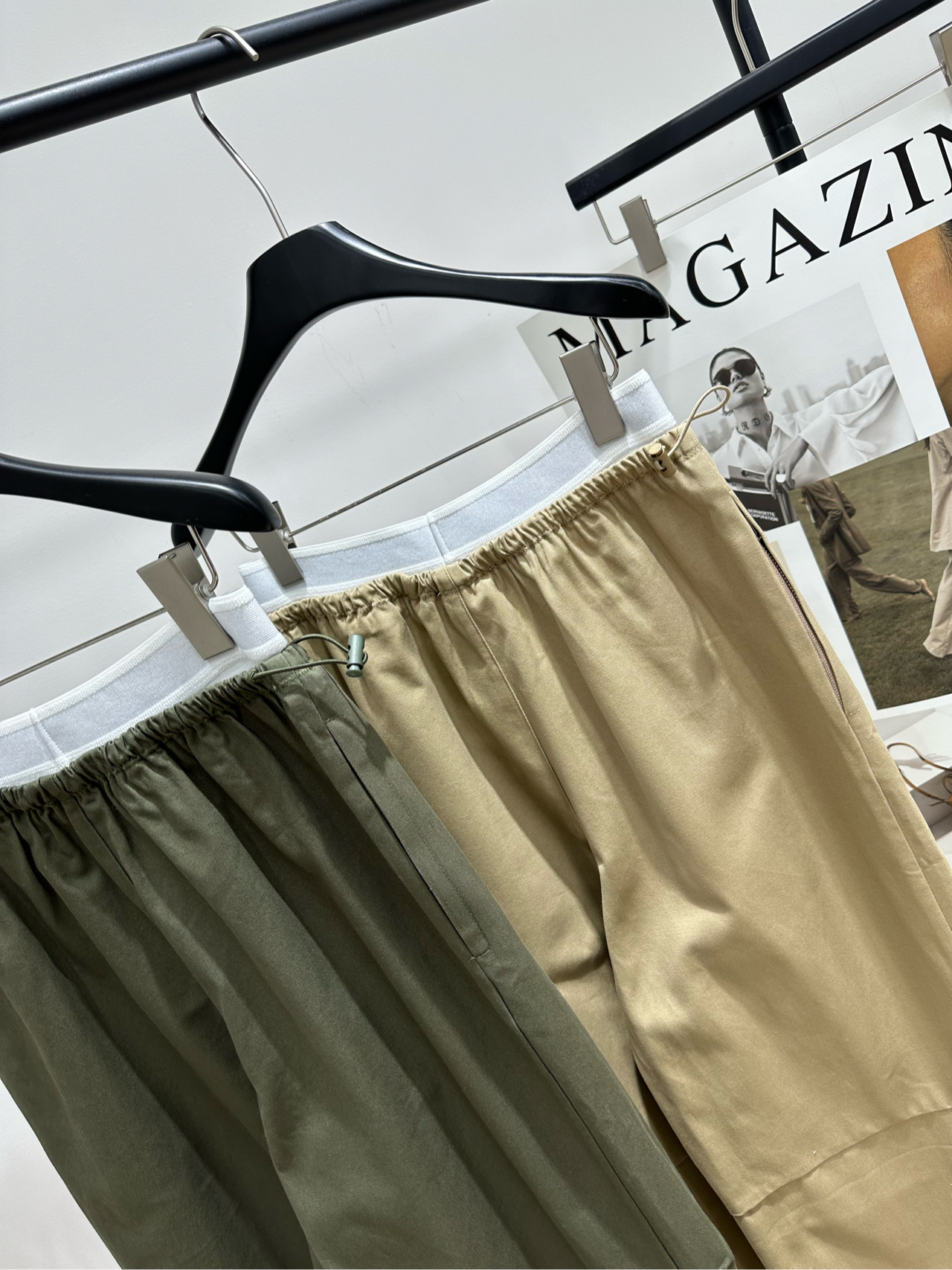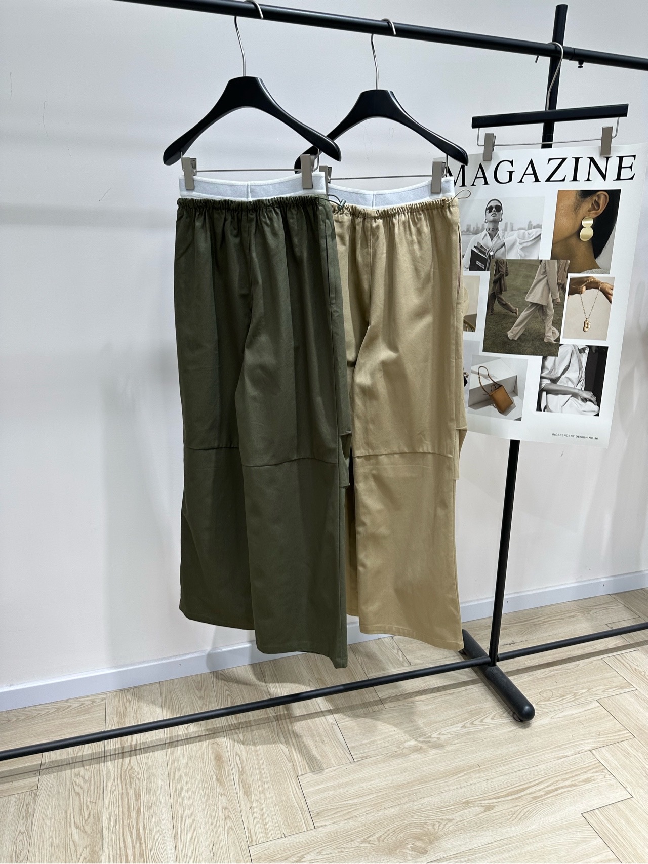 Details: Cotton utility pants in Khaki or Army Green, with elastic waist, adjustable cuffs and multiple pockets
