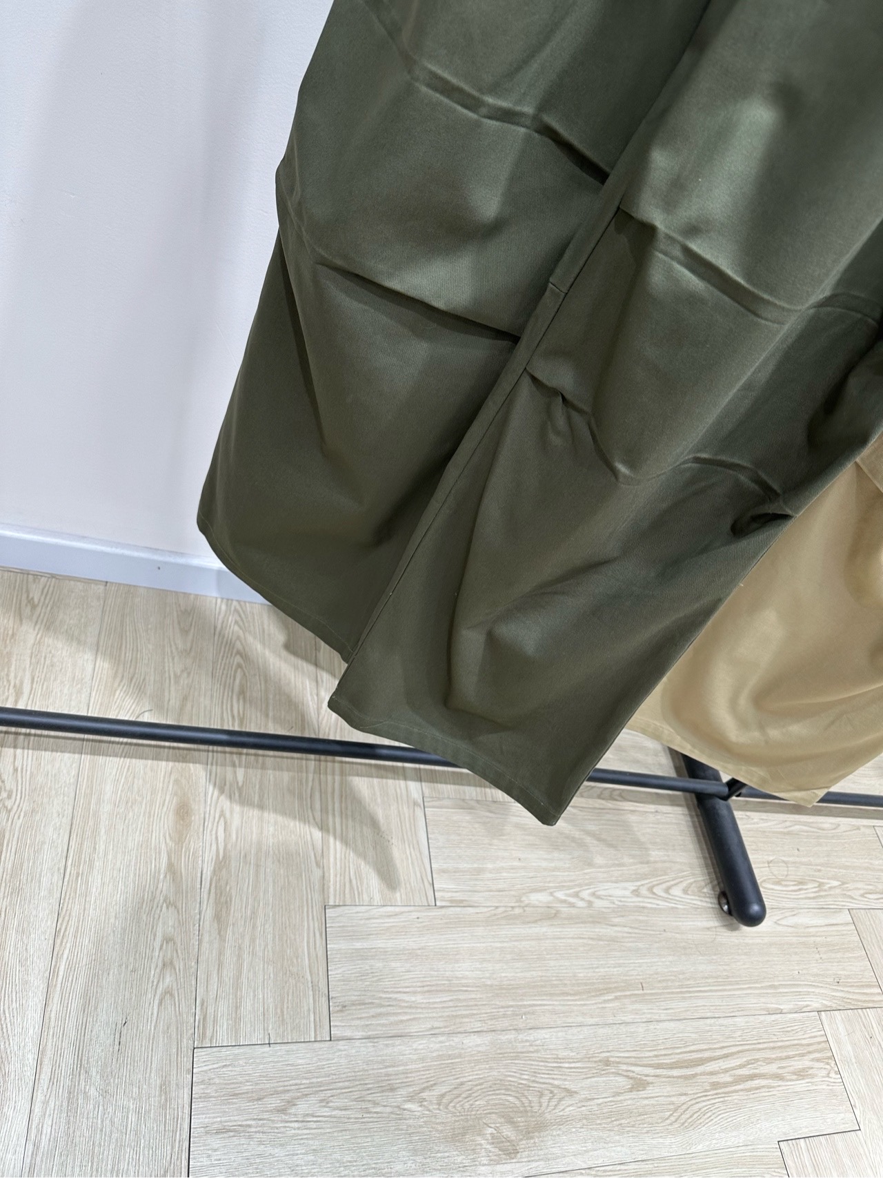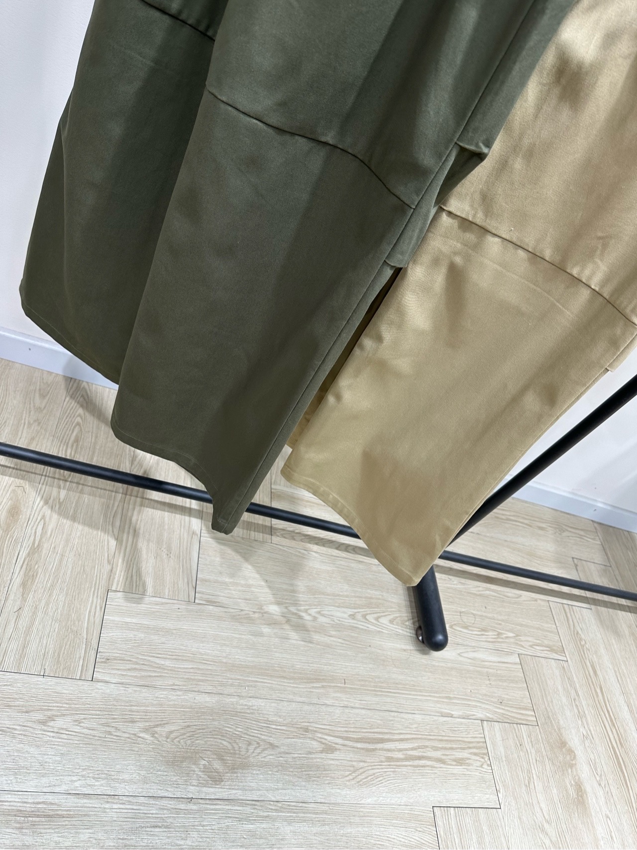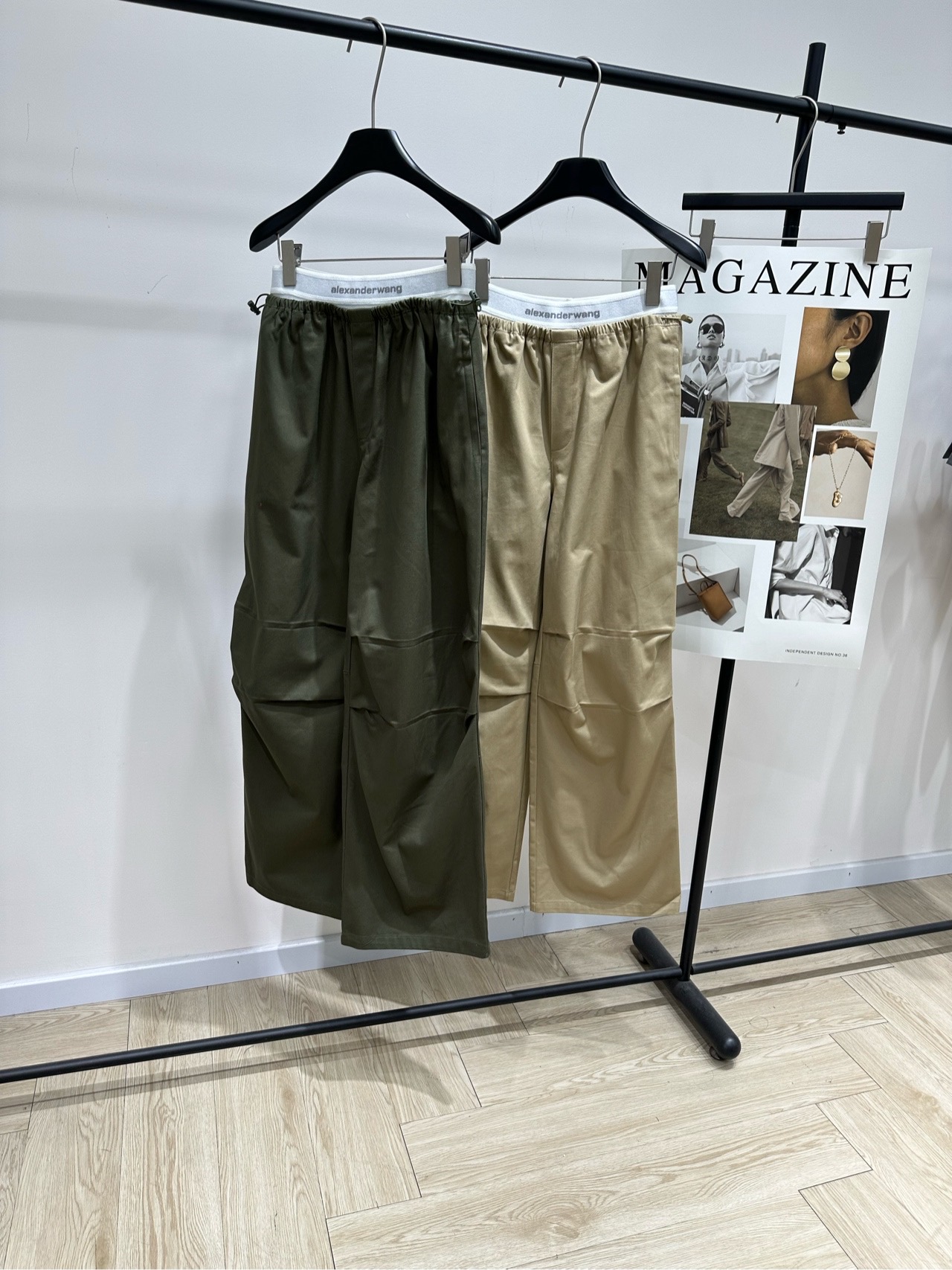 Details: Cotton utility pants in Khaki or Army Green, with elastic waist, adjustable cuffs and multiple pockets