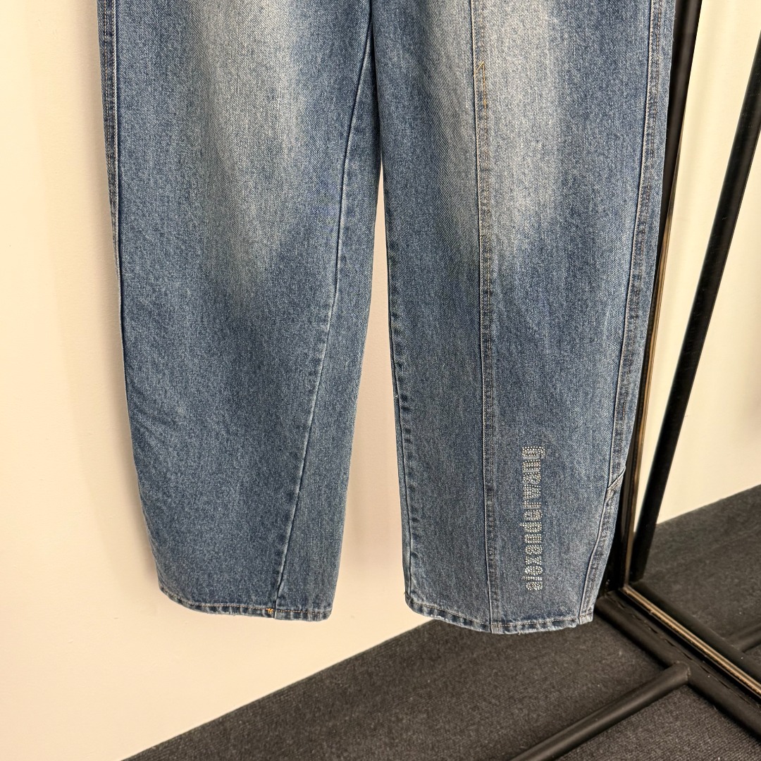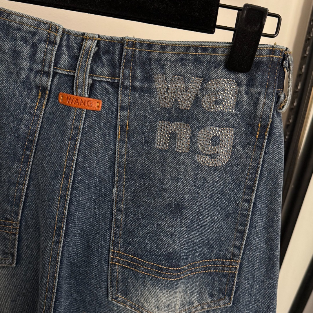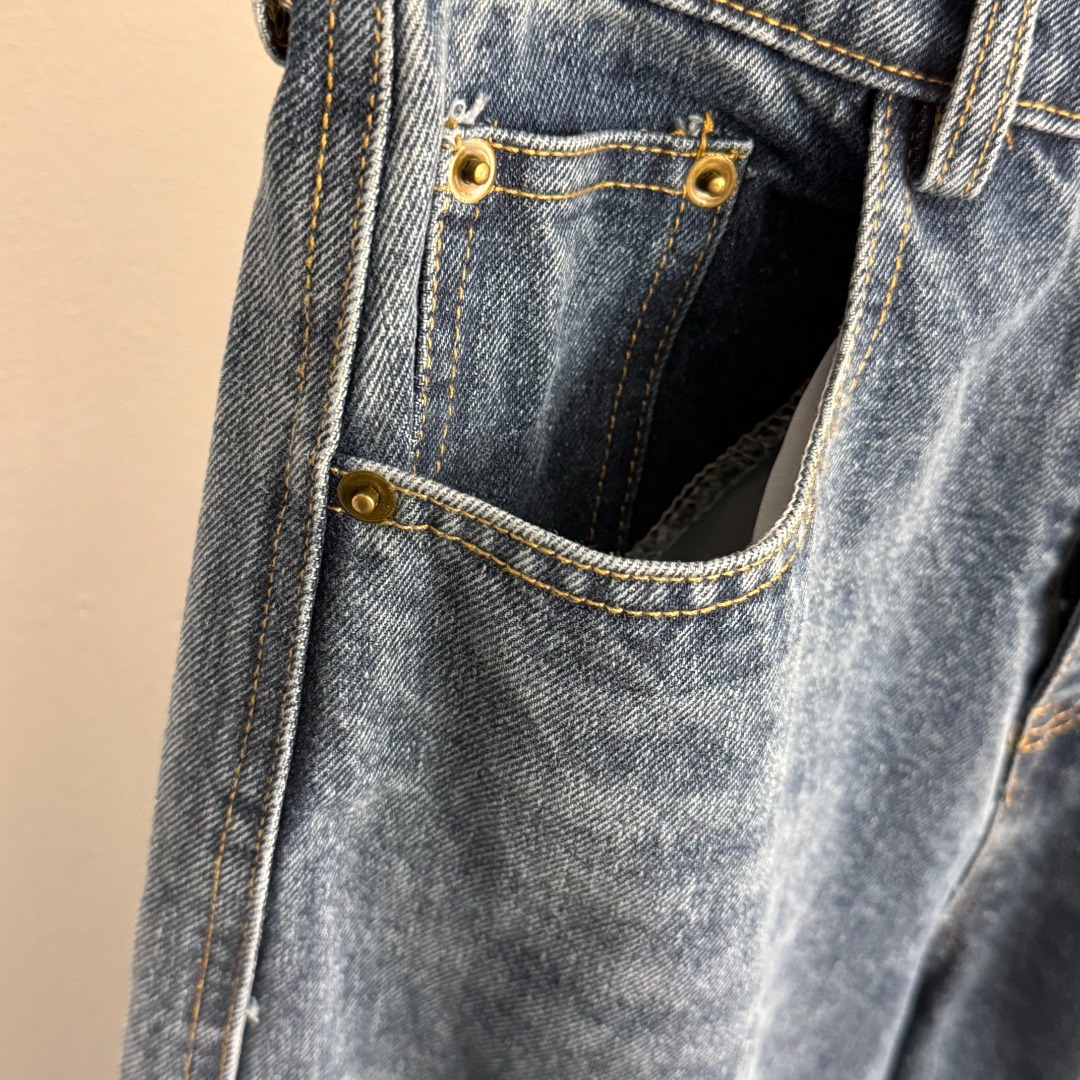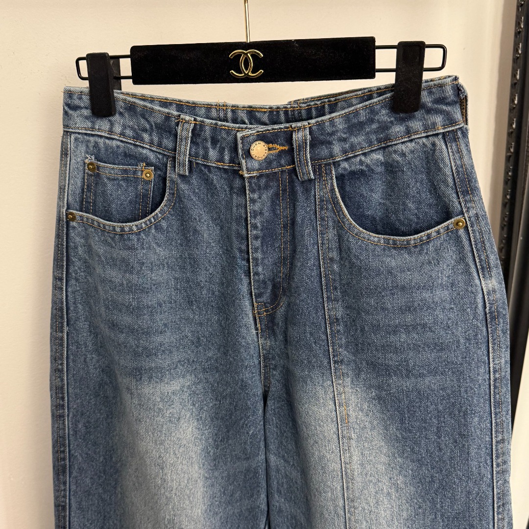 Details: New Blue denim flare wide-leg pants with logo. Size M. High-end custom with fine craftsmanship