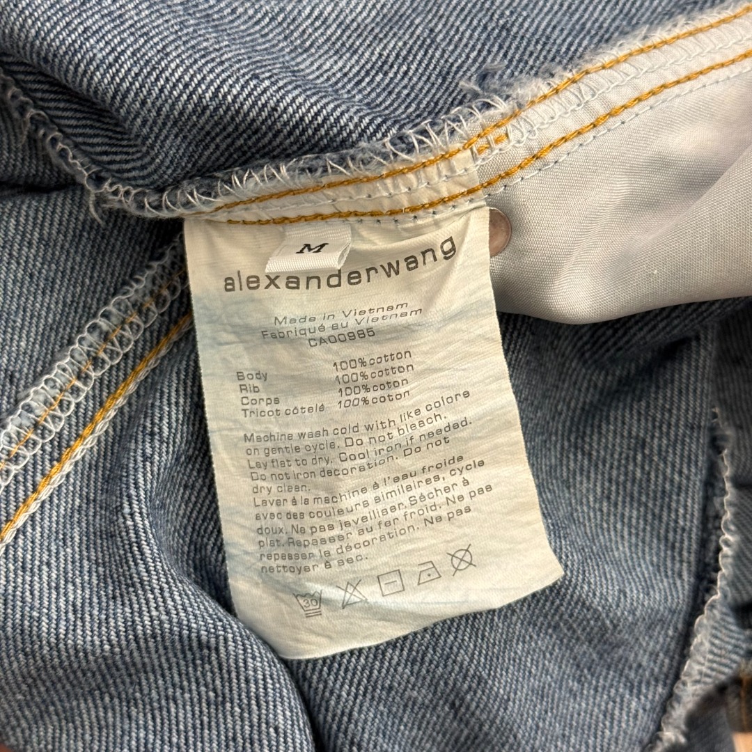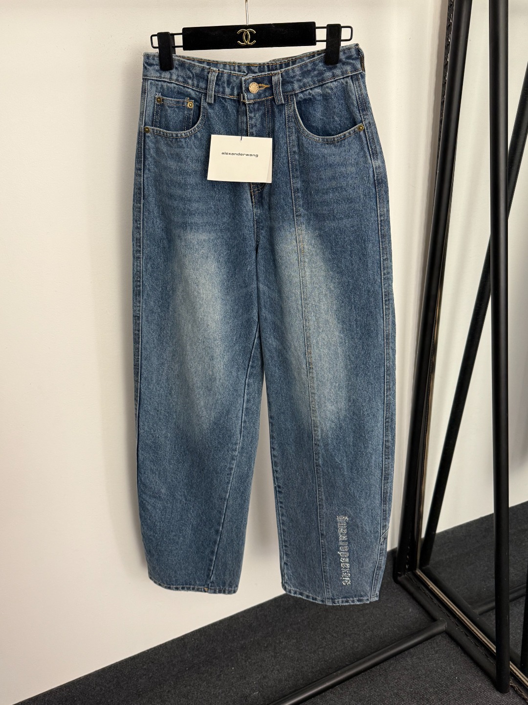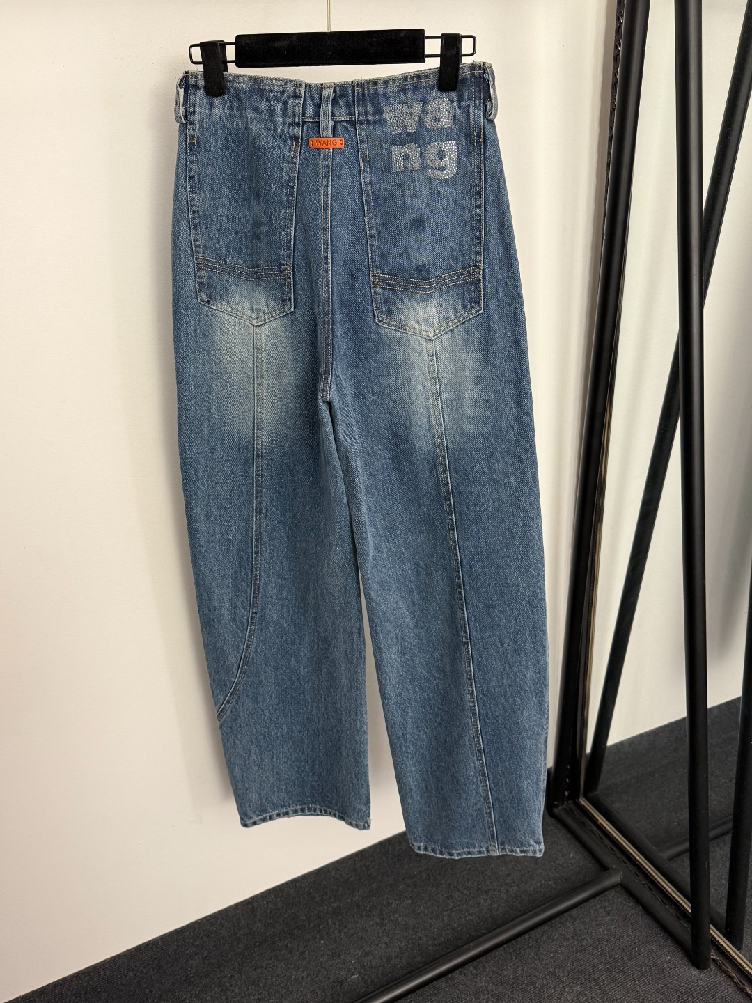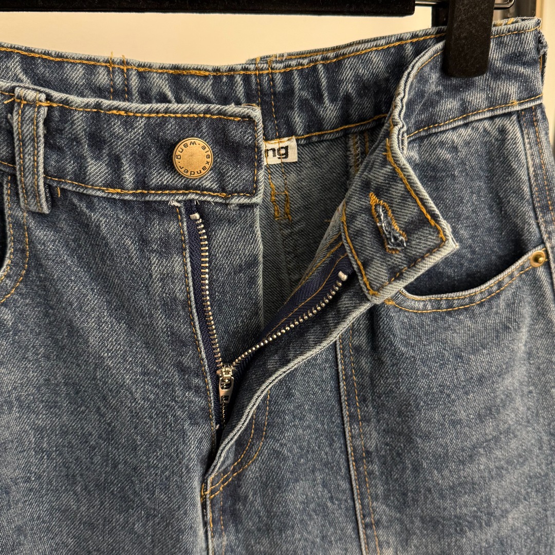 Details: New Blue denim flare wide-leg pants with logo. Size M. High-end custom with fine craftsmanship