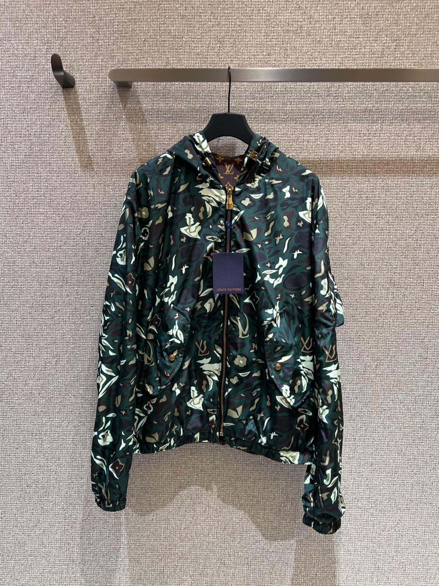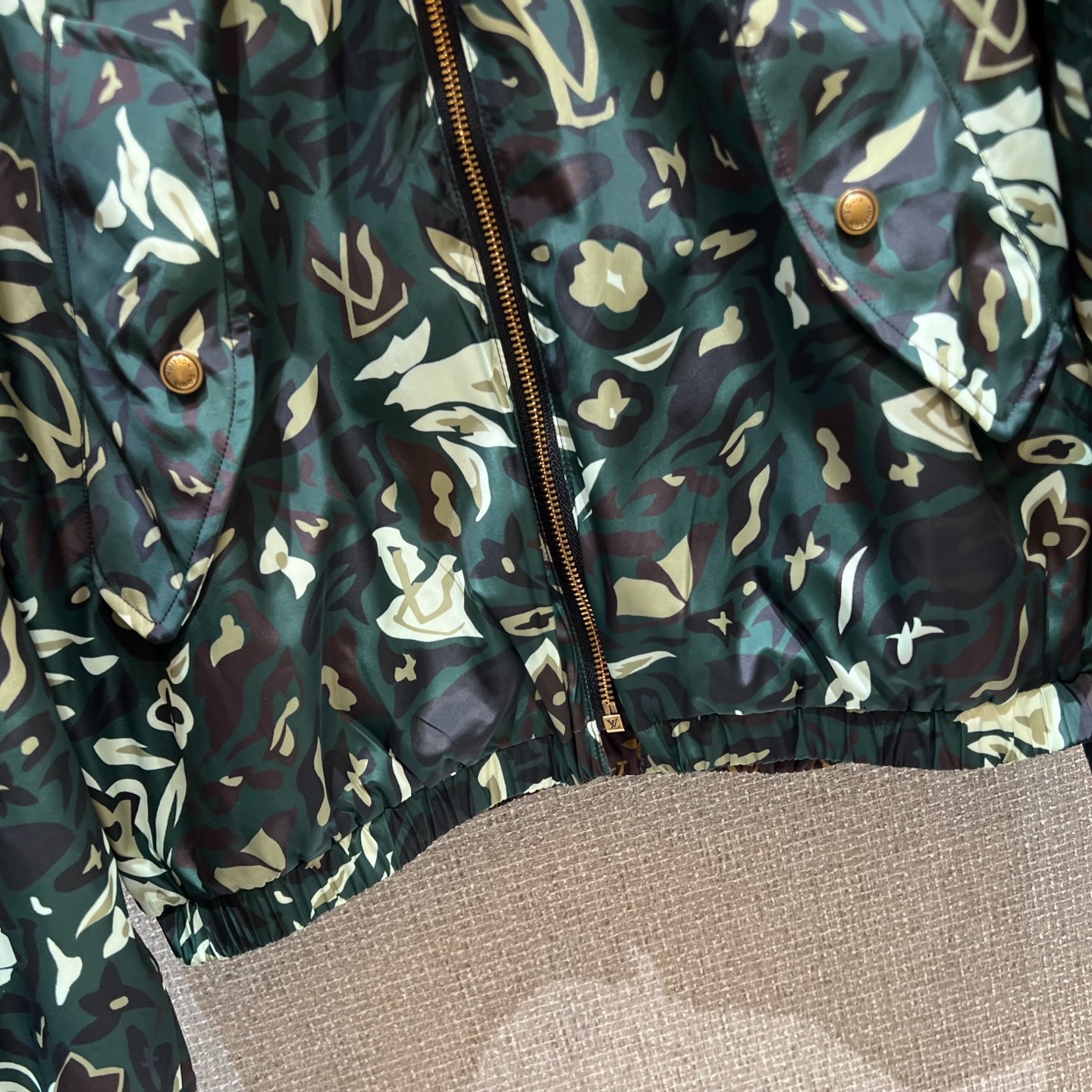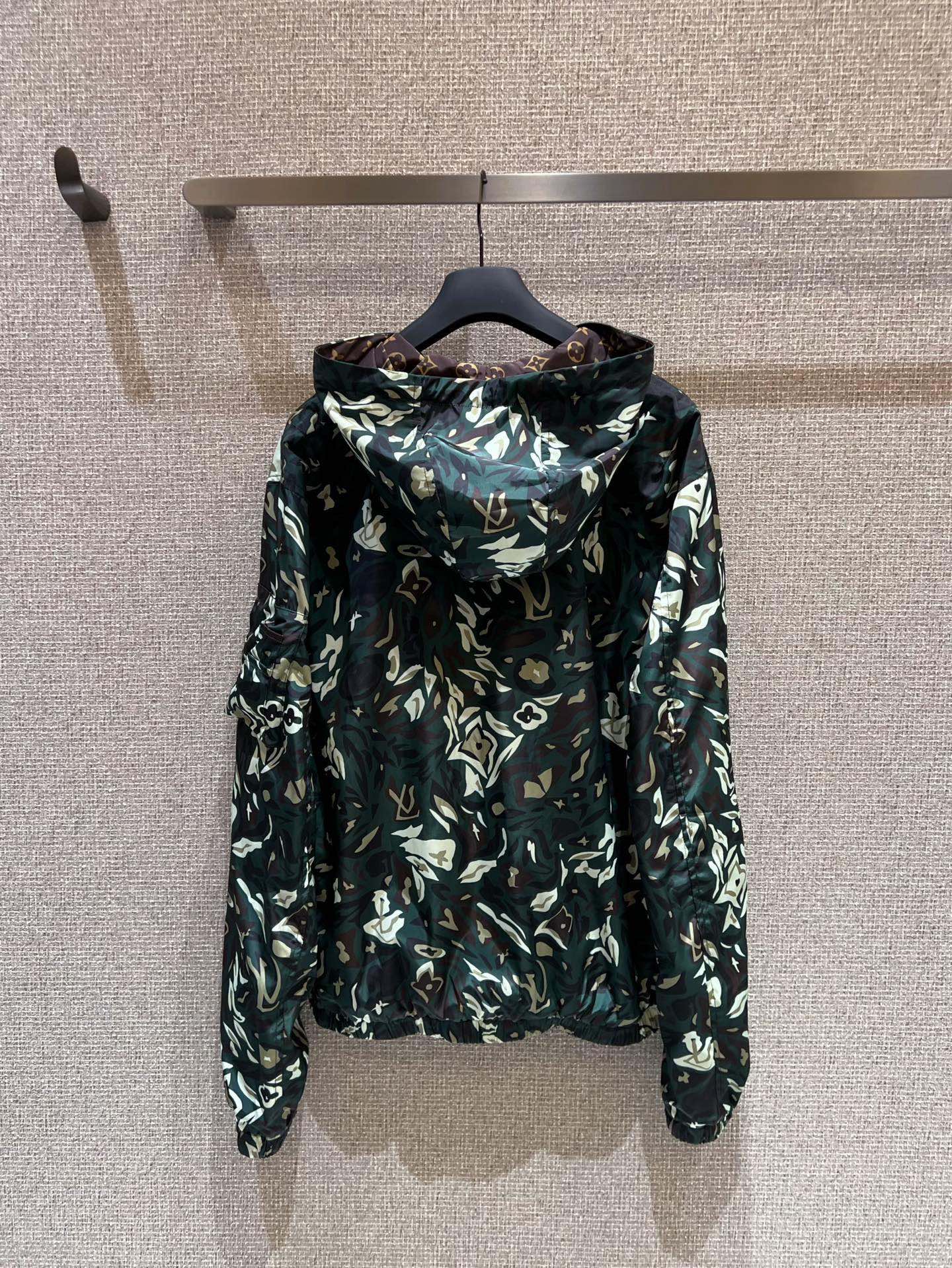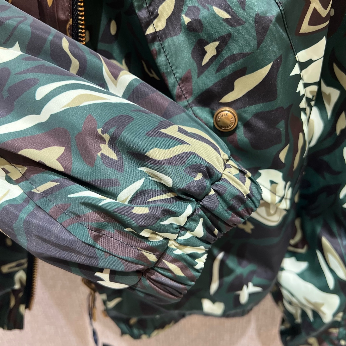 Details: Double-sided hooded jacket crafted from camouflage print cotton fabric, equipped with original mold hardware, a copper logo zipper, and a loose fit, suitable for various occasions