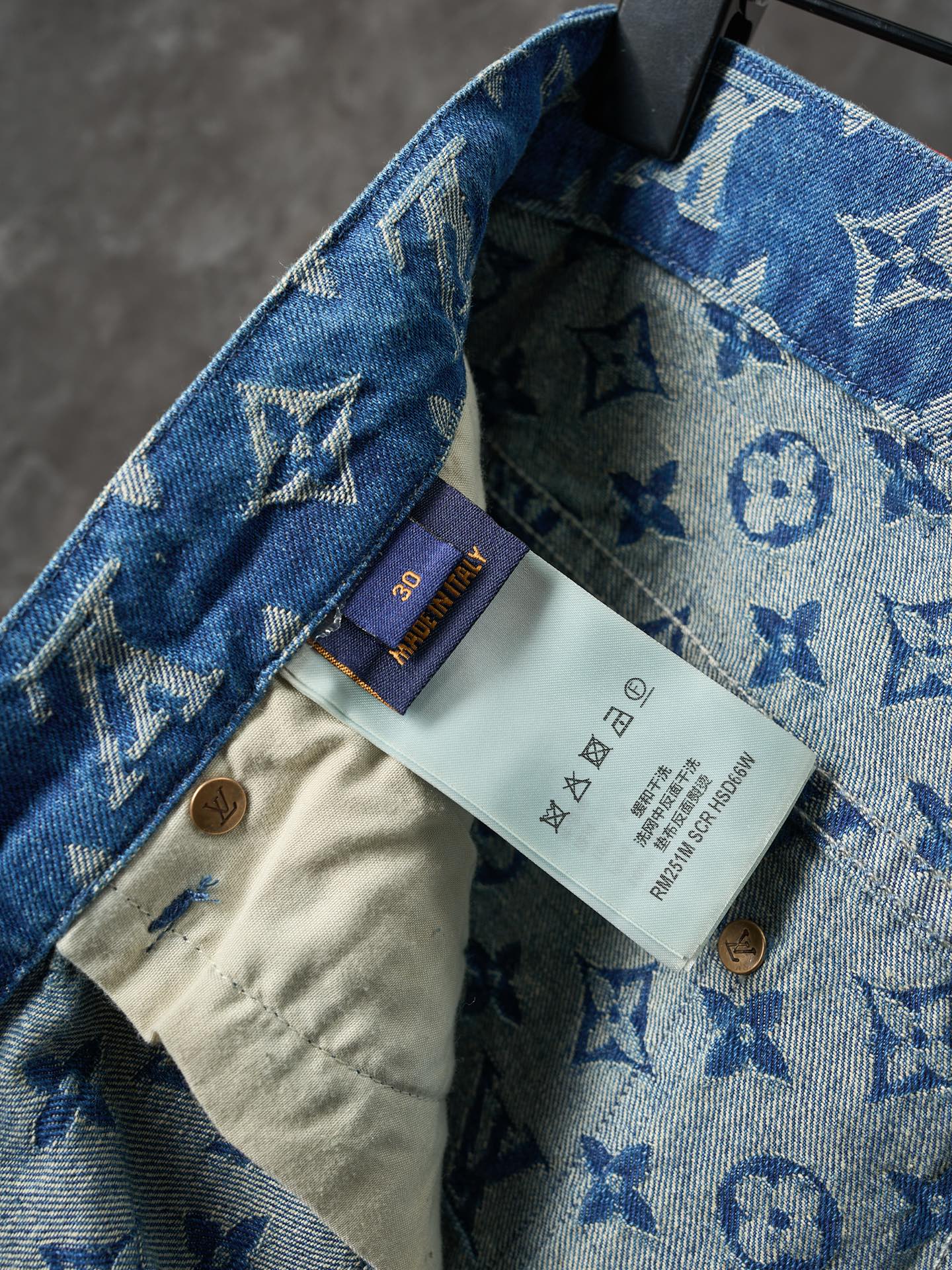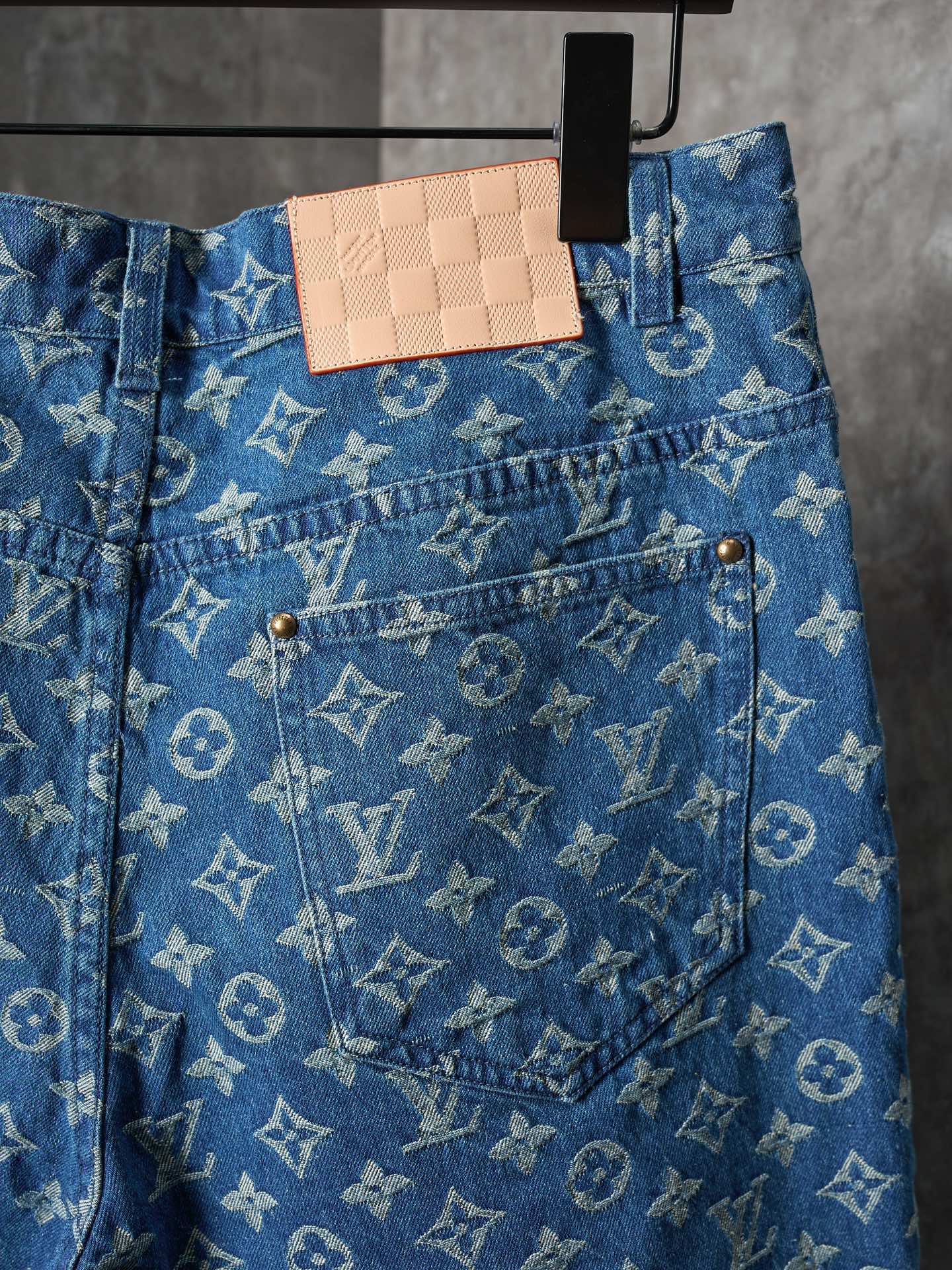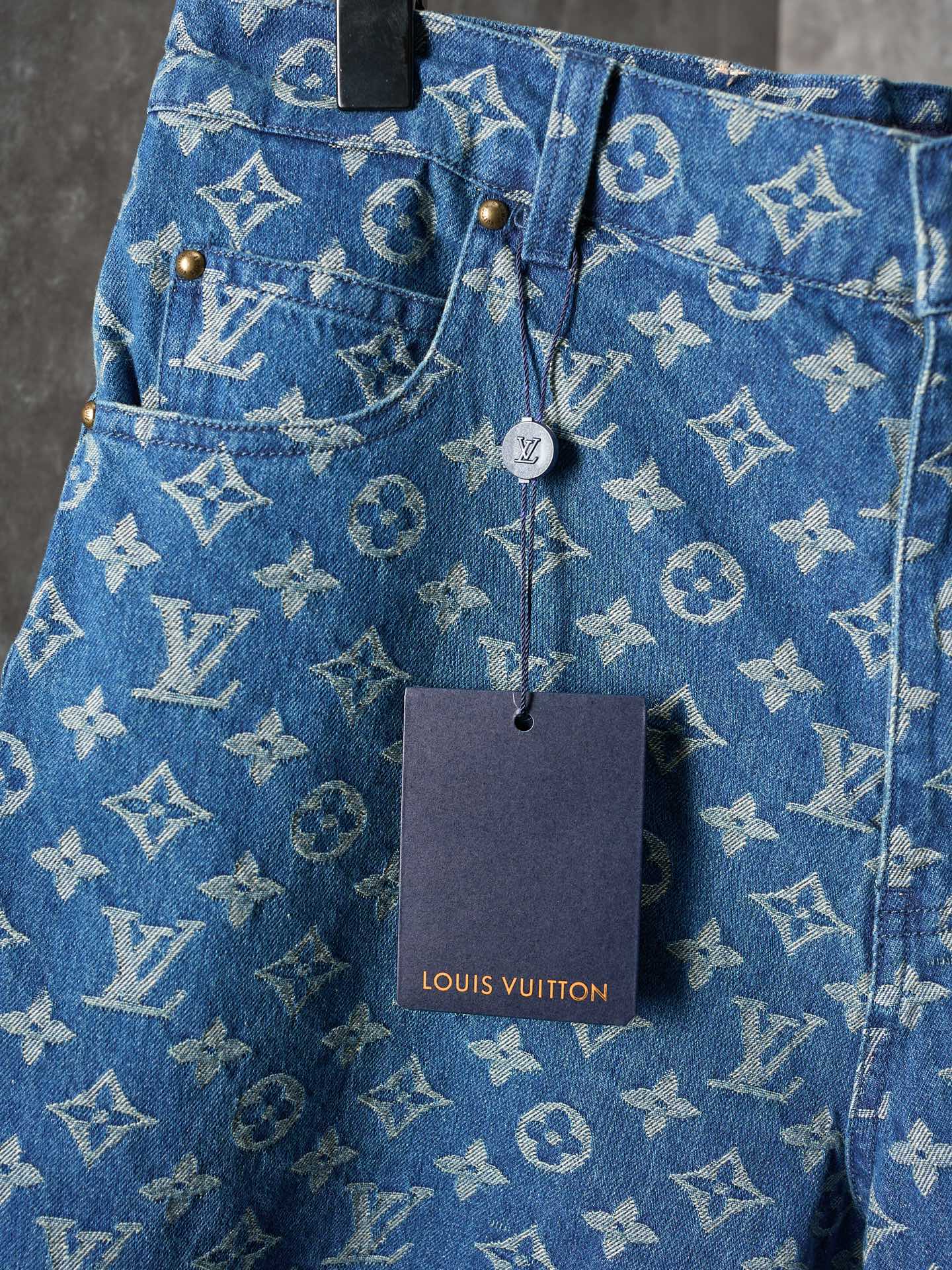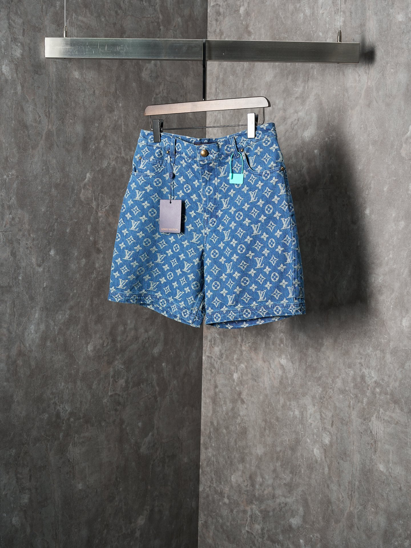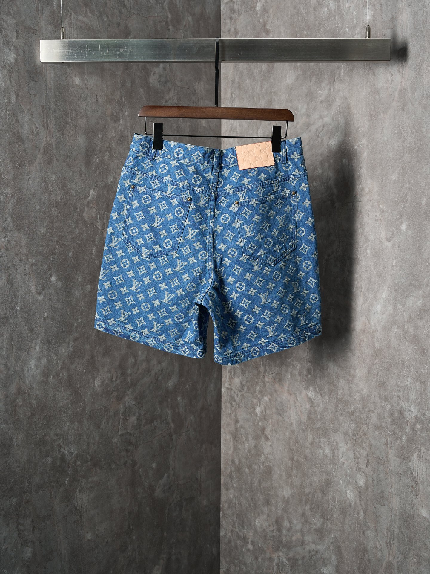 Details: Denim shorts with a monogram pattern, made of medium wash fabric, easy to match with daily outfits
