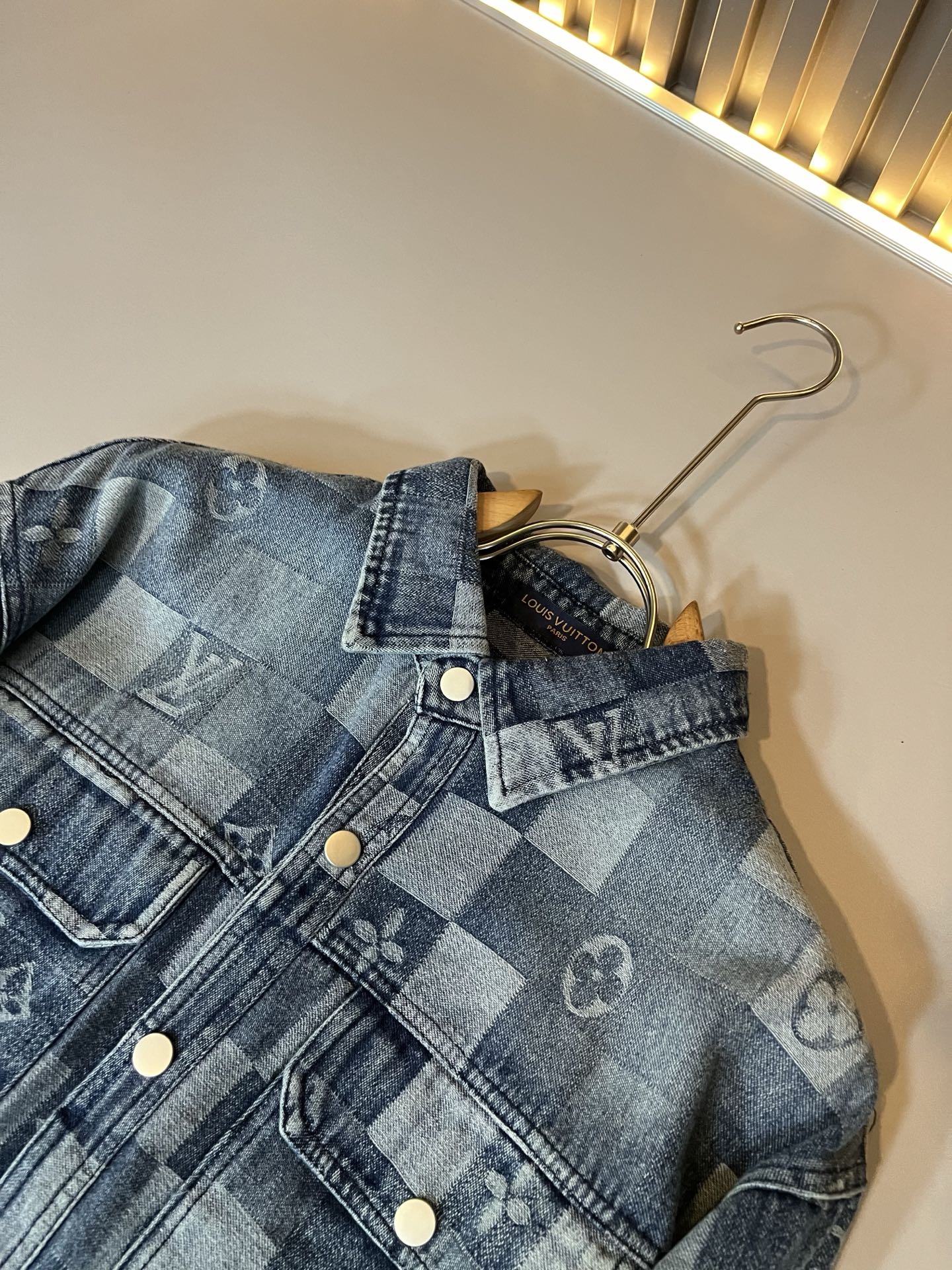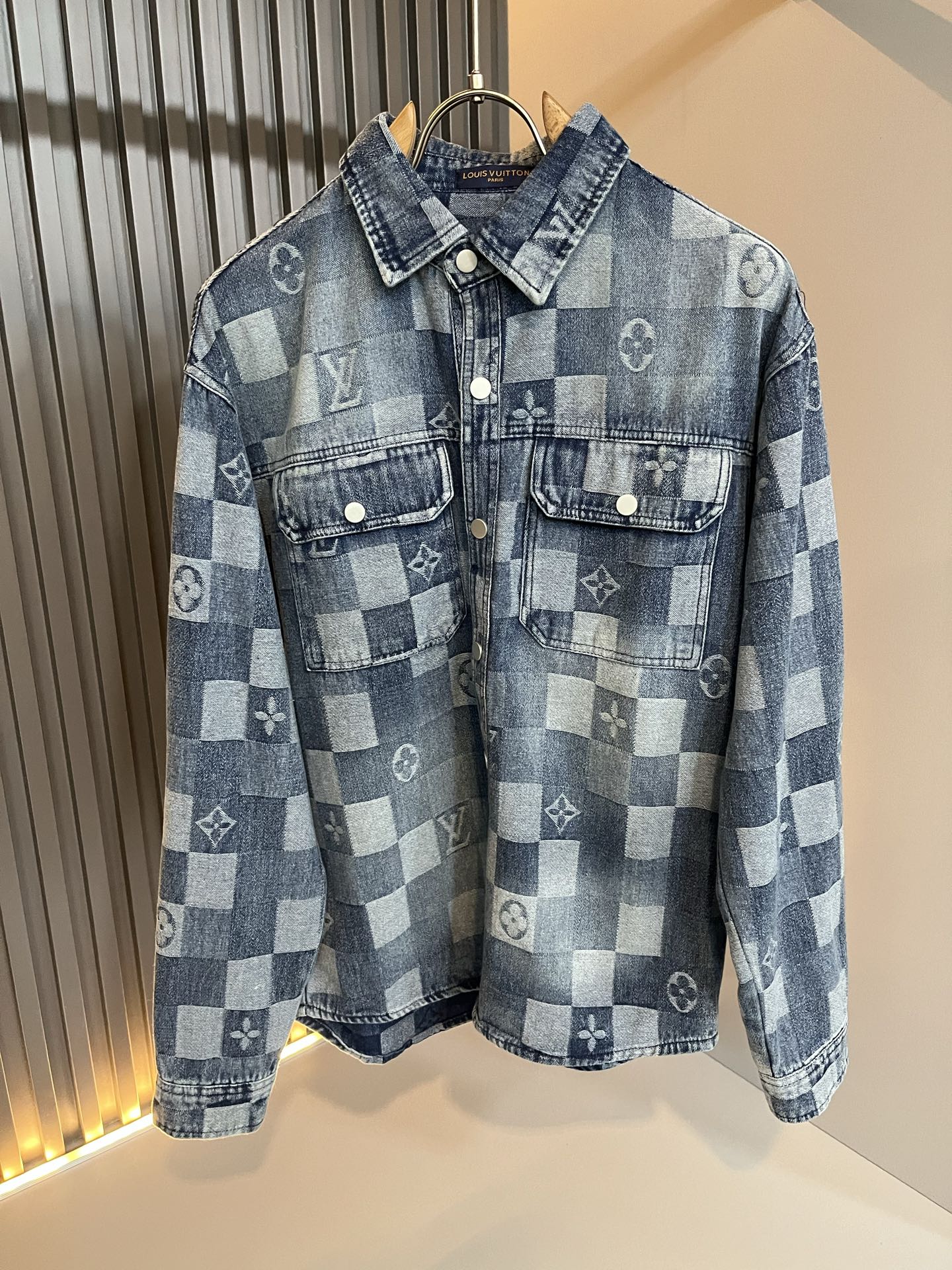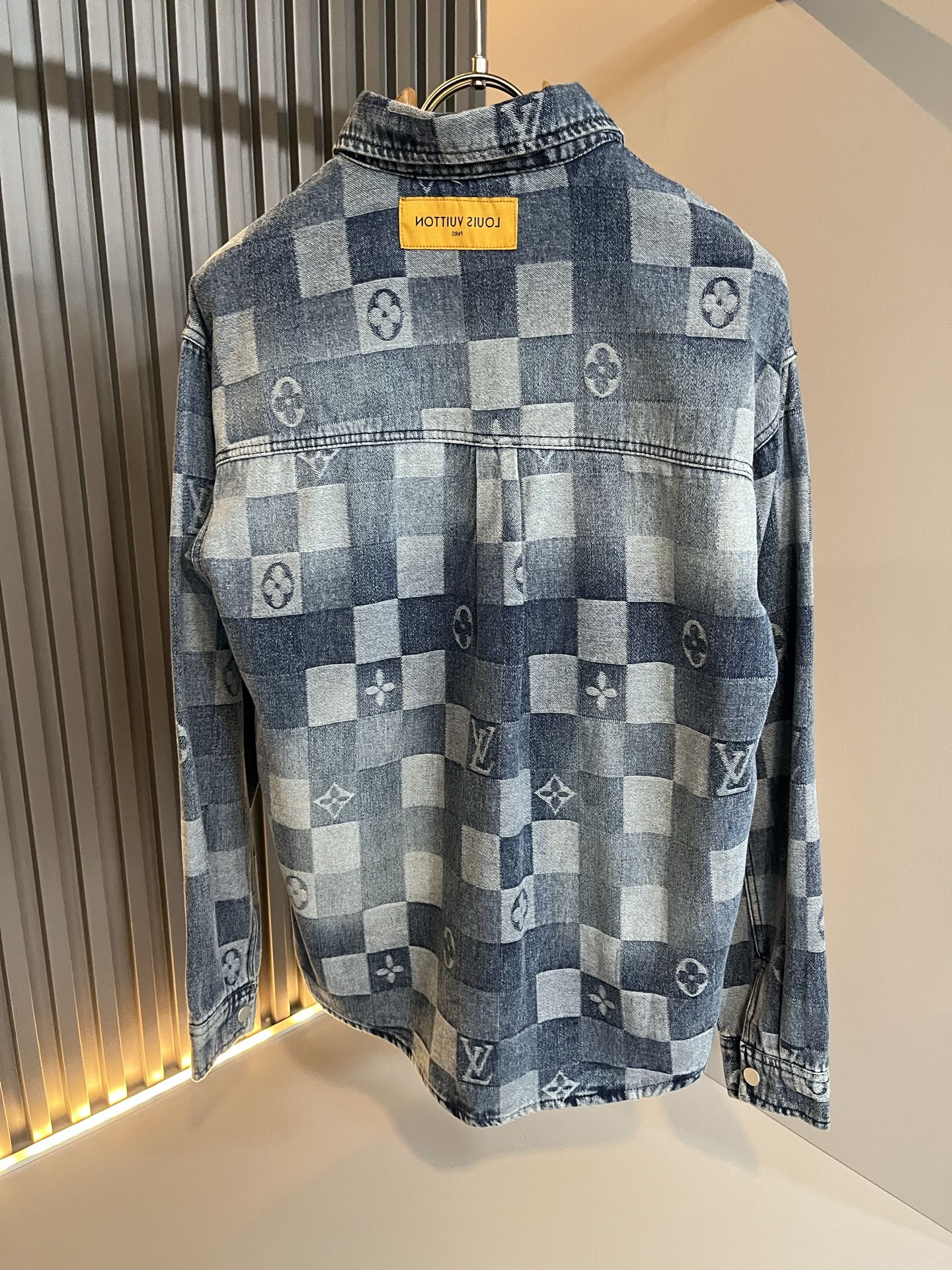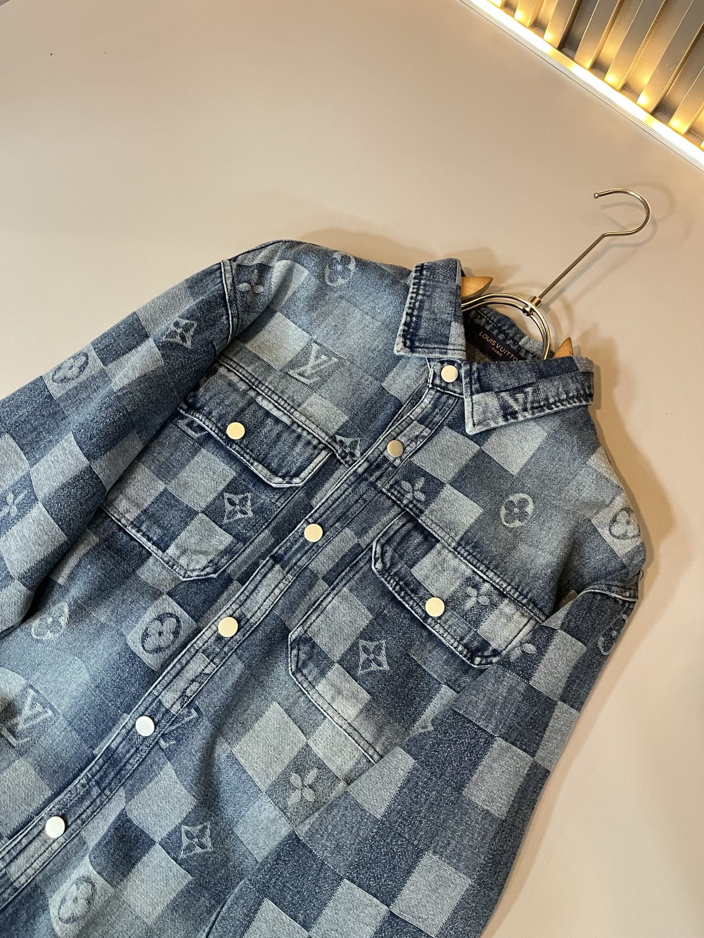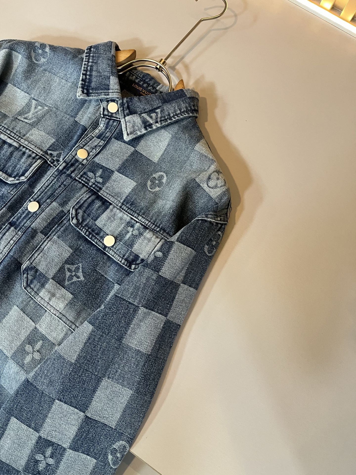 Details: Denim shirt crafted from custom fabric, with a creative logo, rare, and well - made.