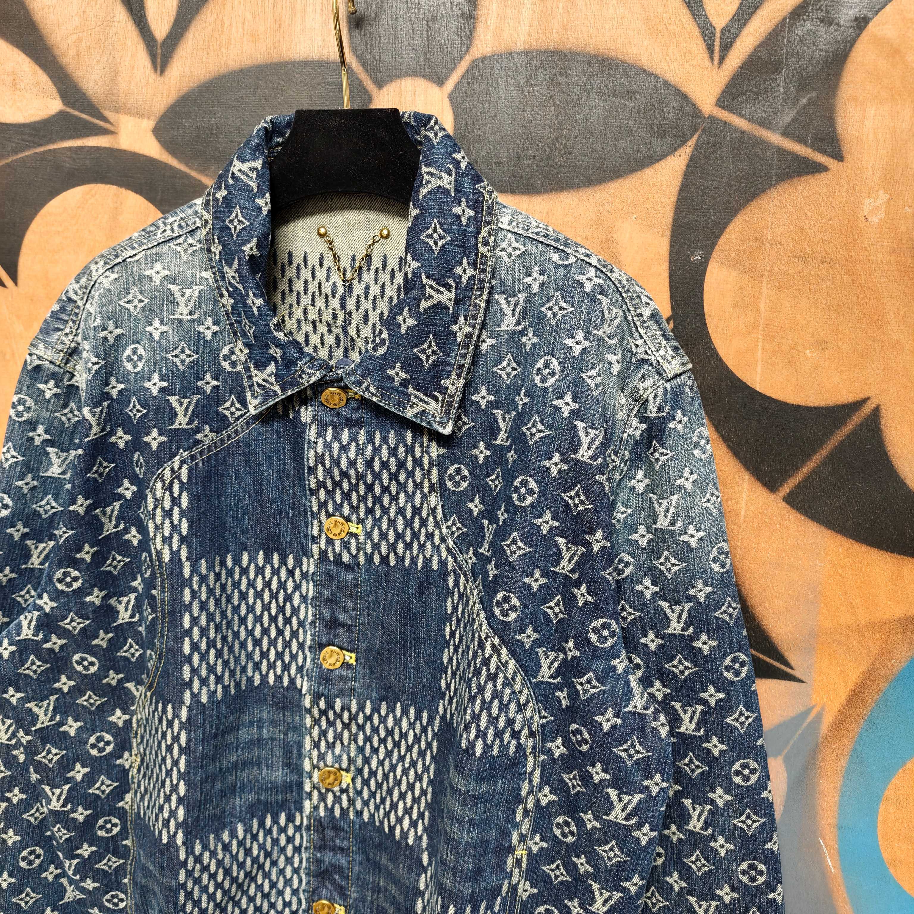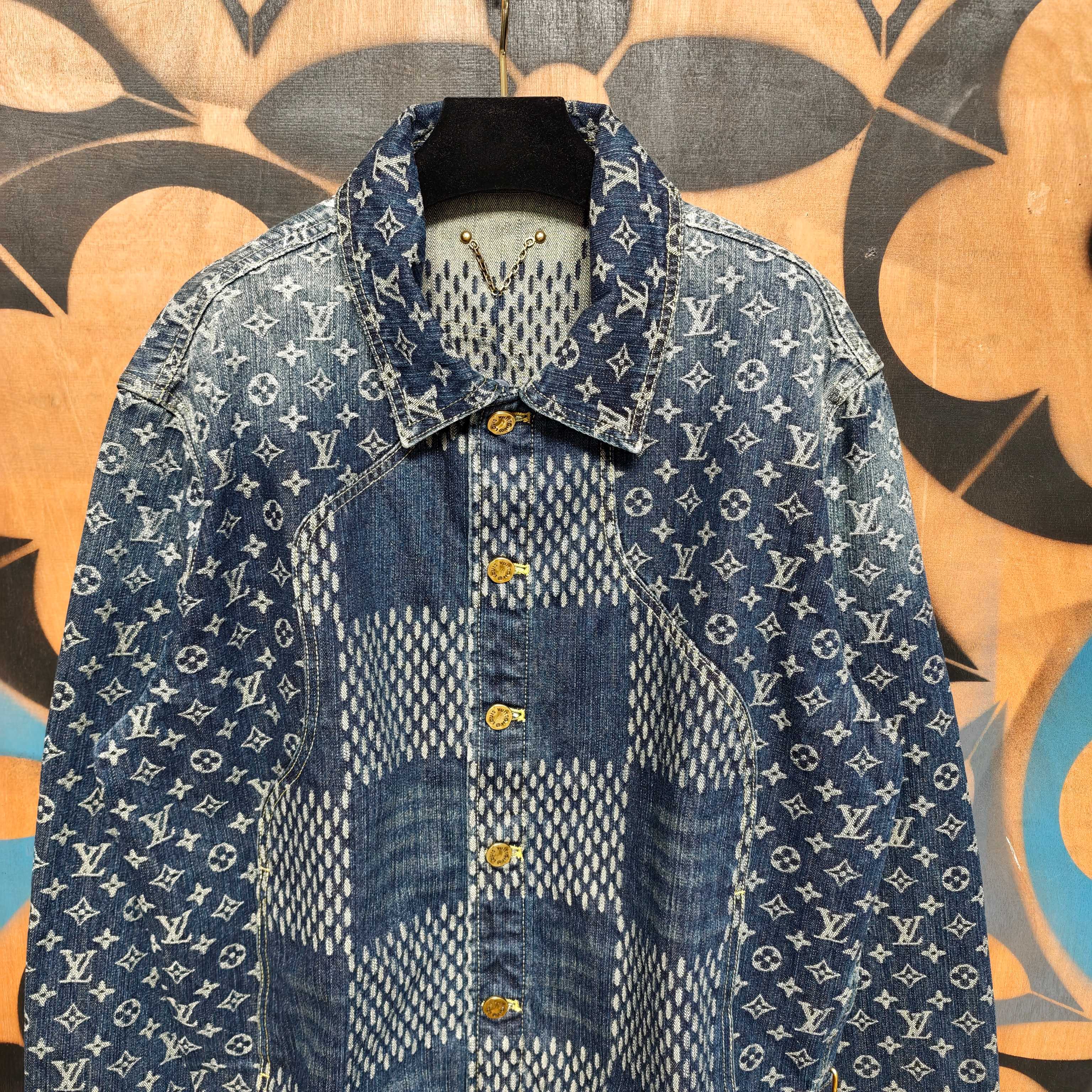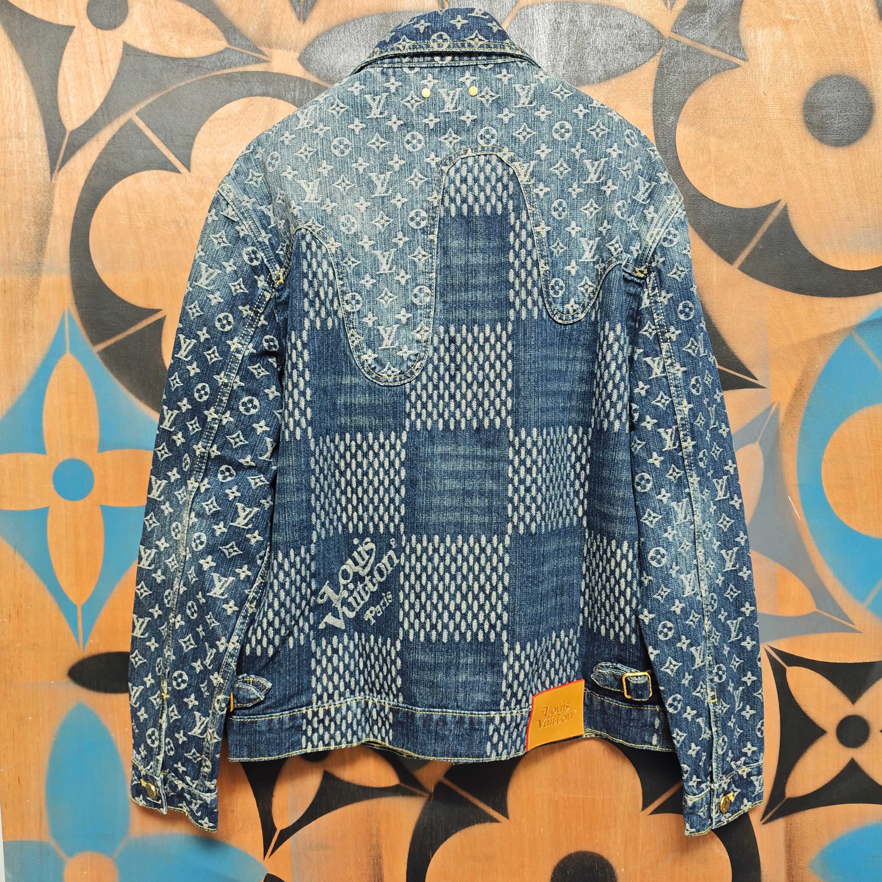 Details: Collaborative denim jacket with distinctive patterns, made of cotton, with a logo label and metal parts