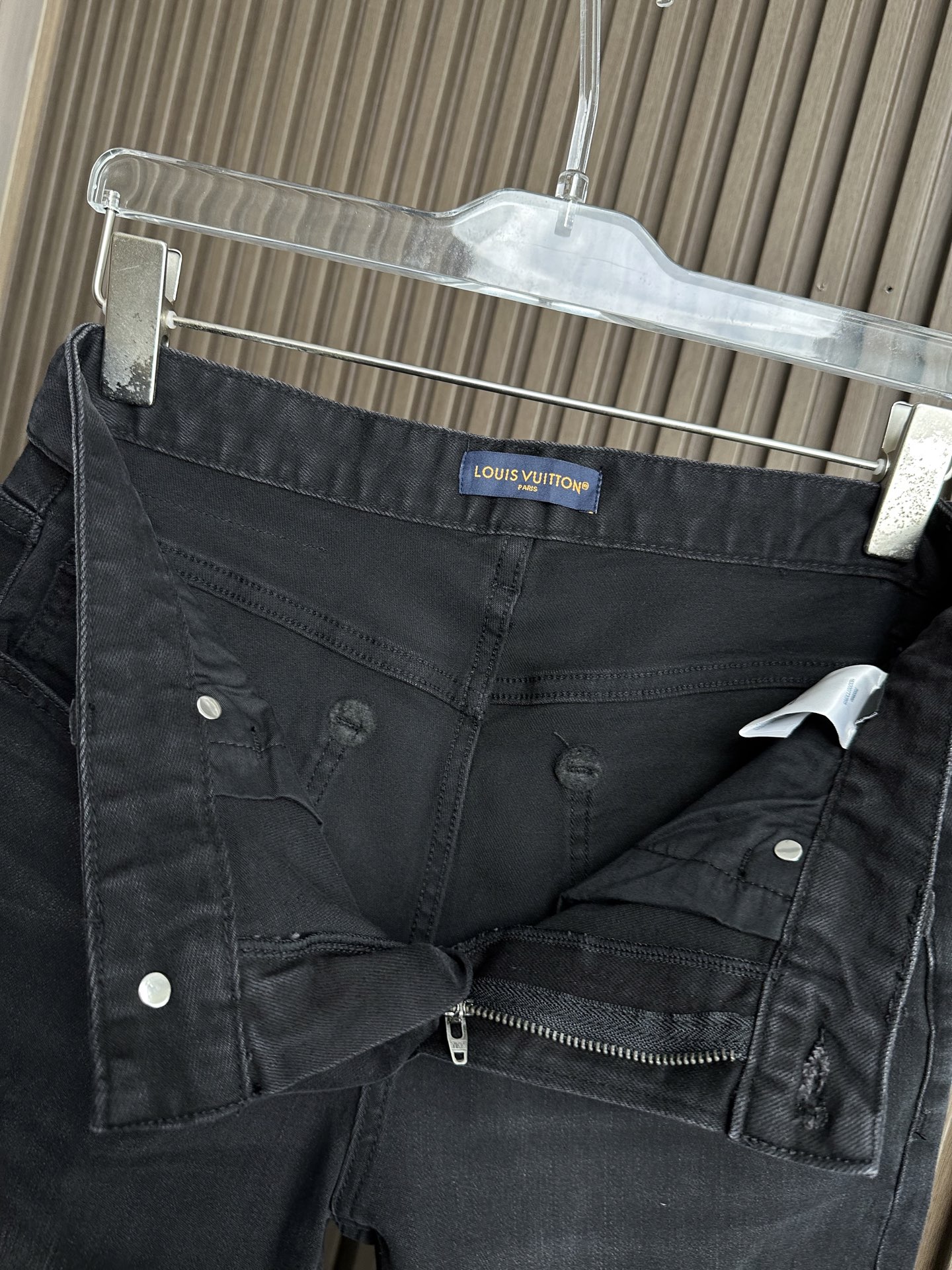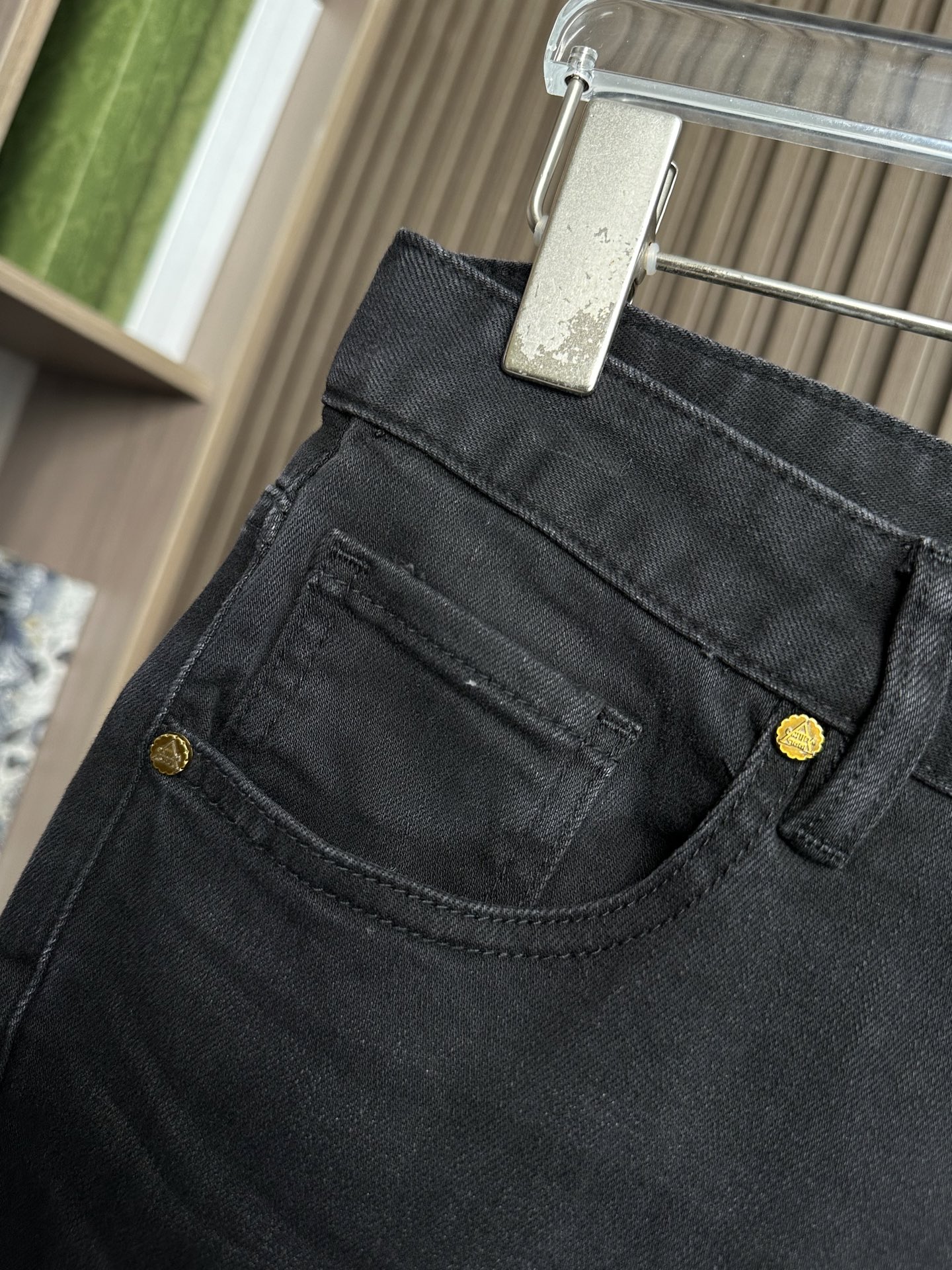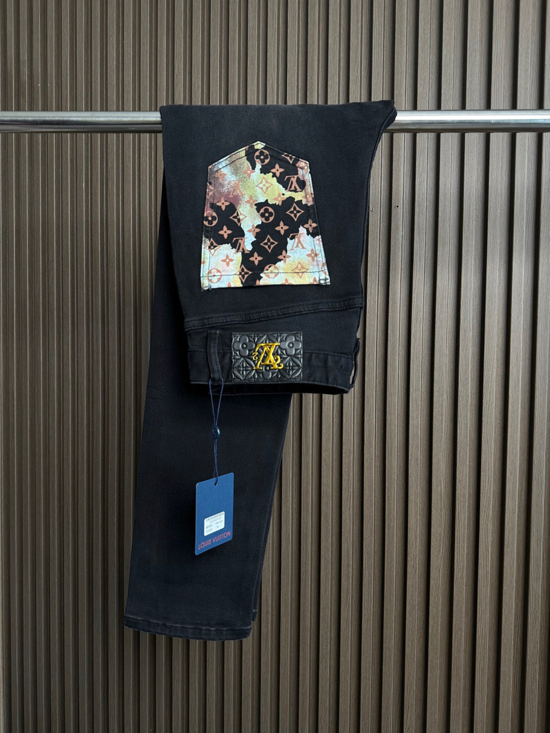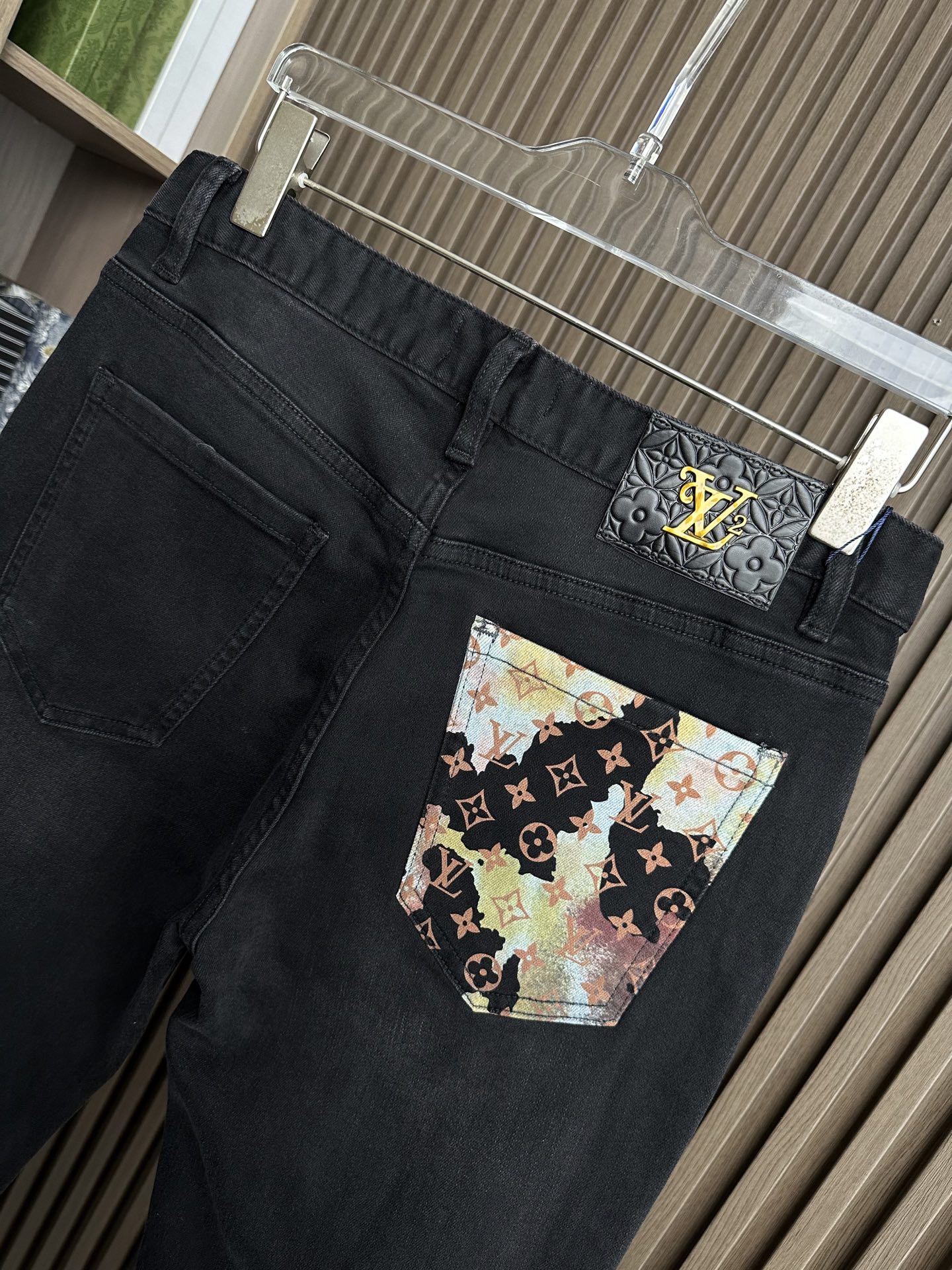 Details: New stretchy jeans with a small straight fit and a colorful brand pattern print on the back pocket, suitable for various styles.