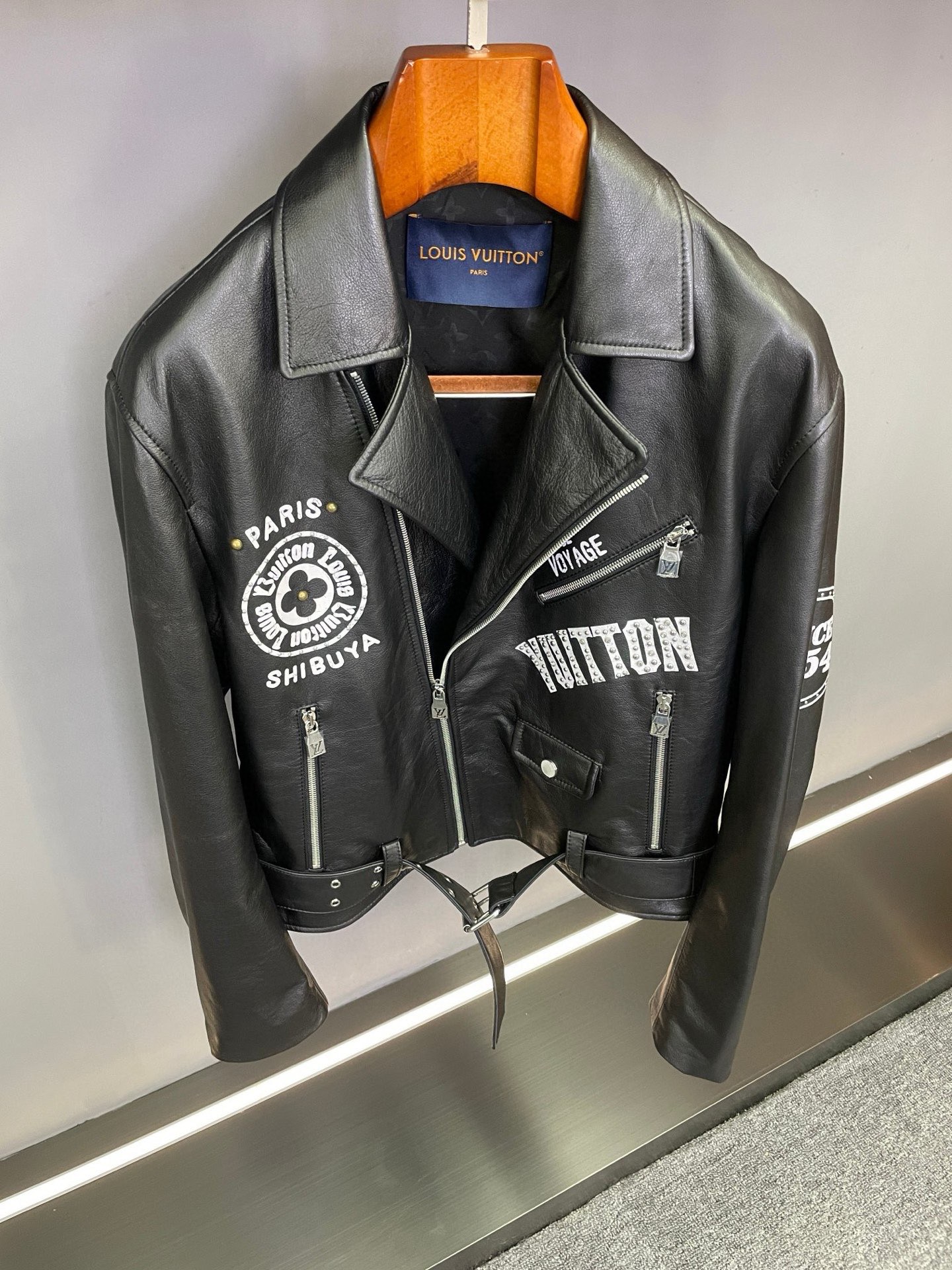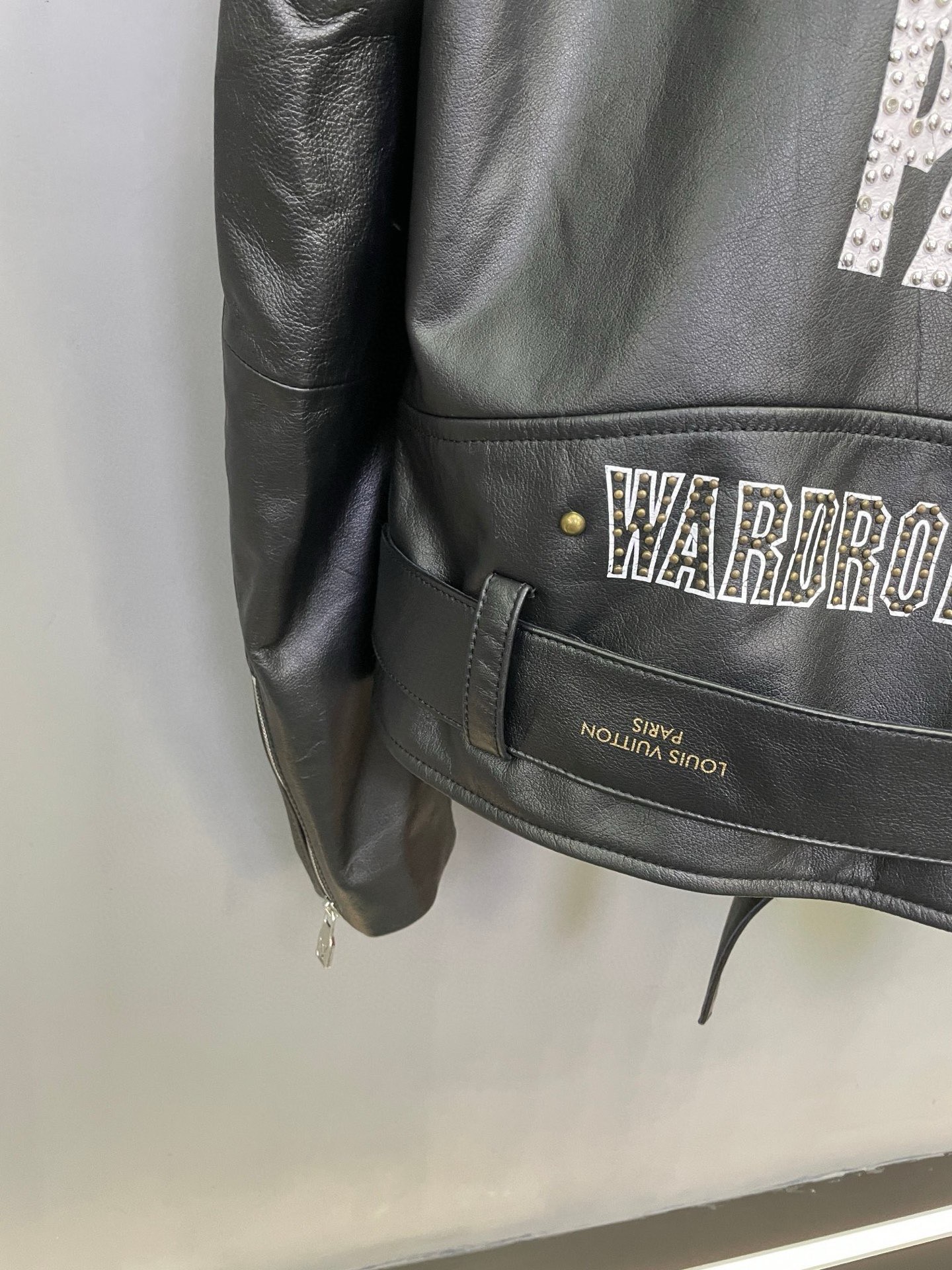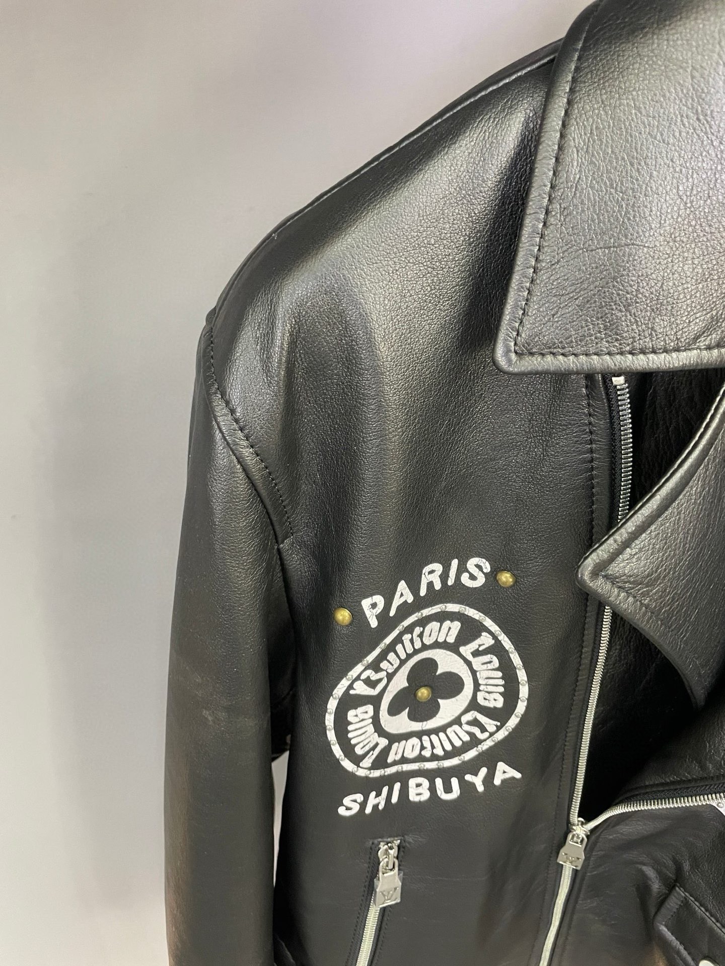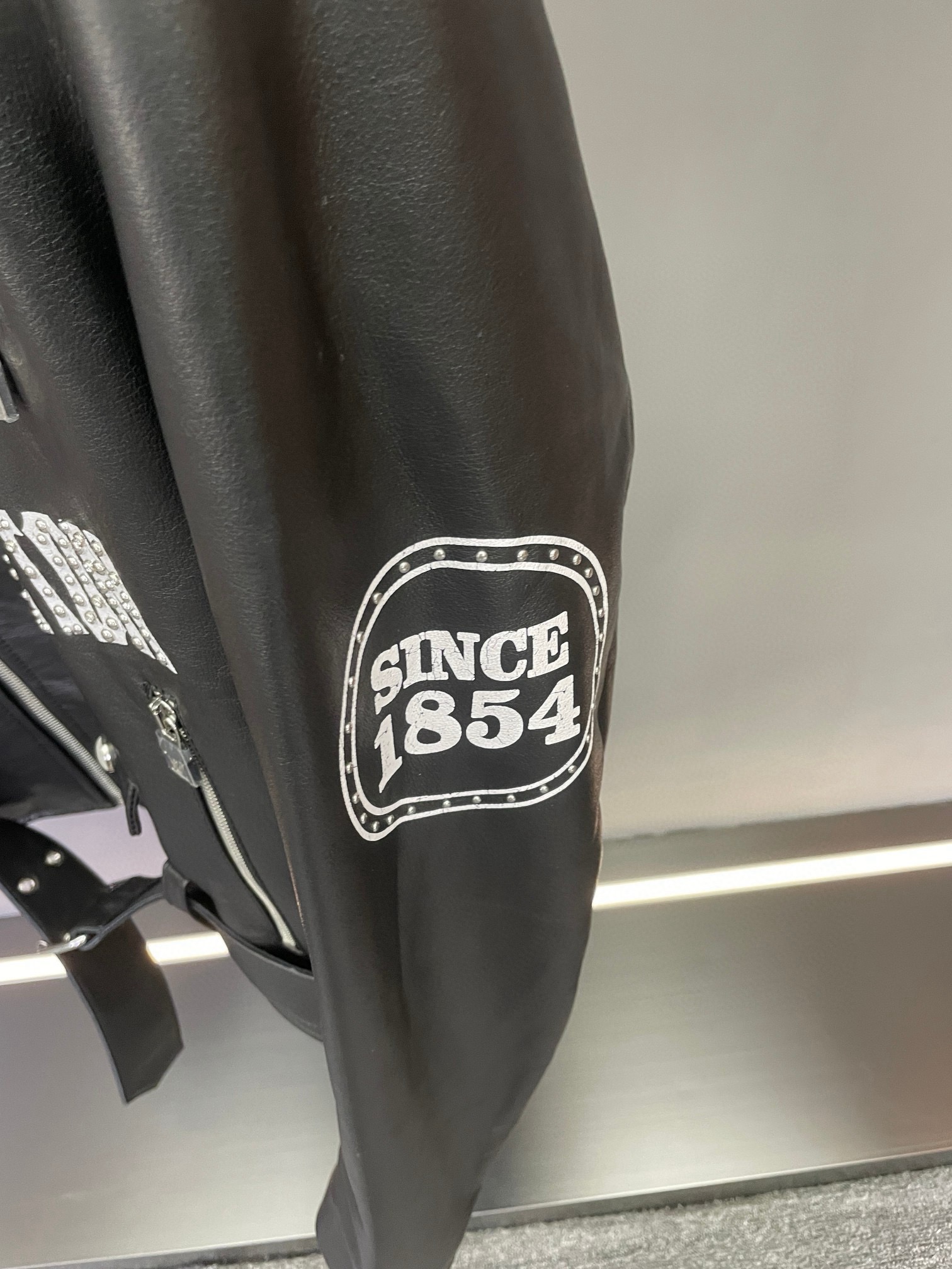 Details: Motorcycle jacket crafted from imported sheepskin, with logo print and rivets