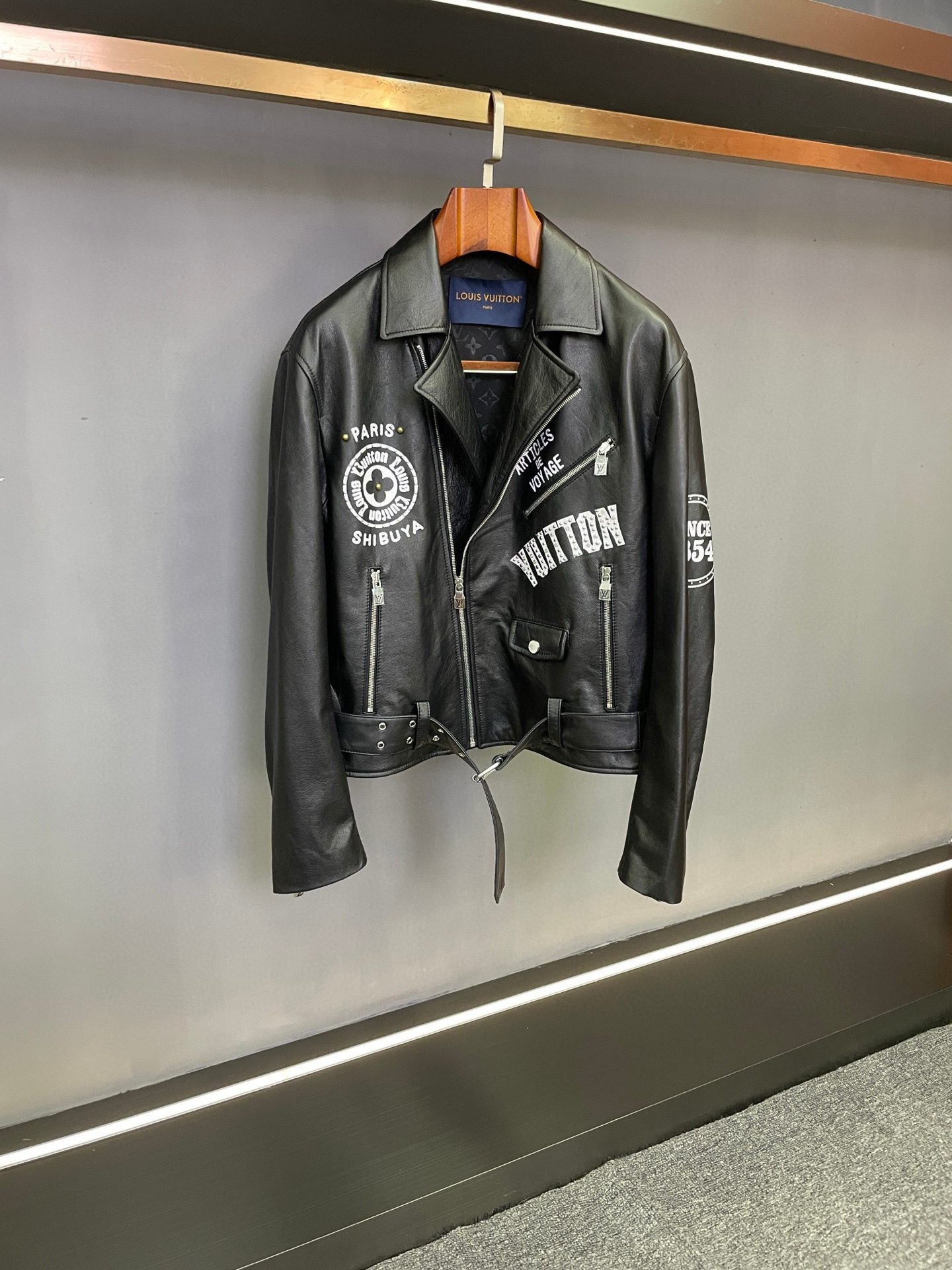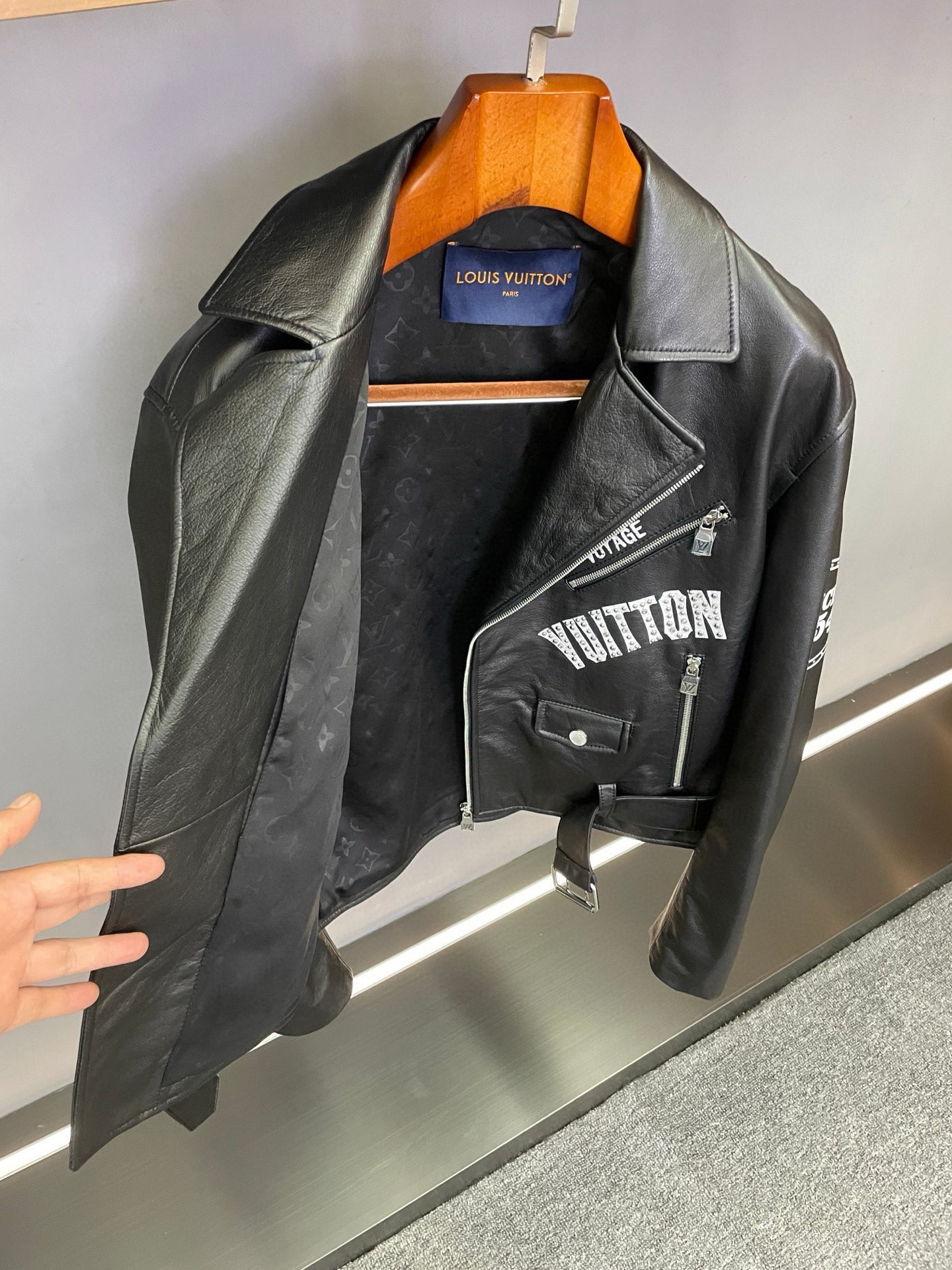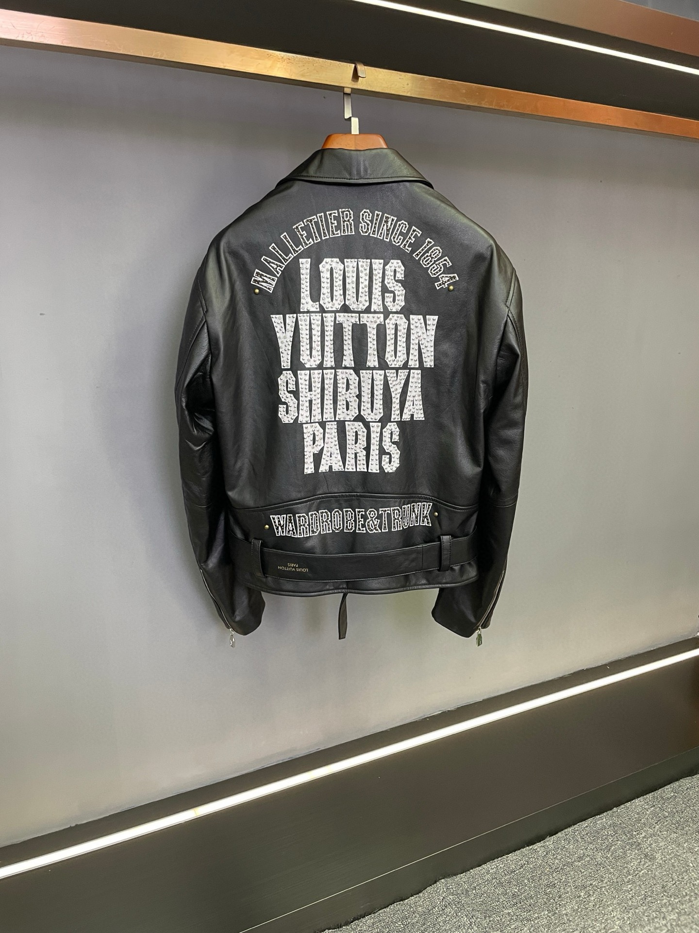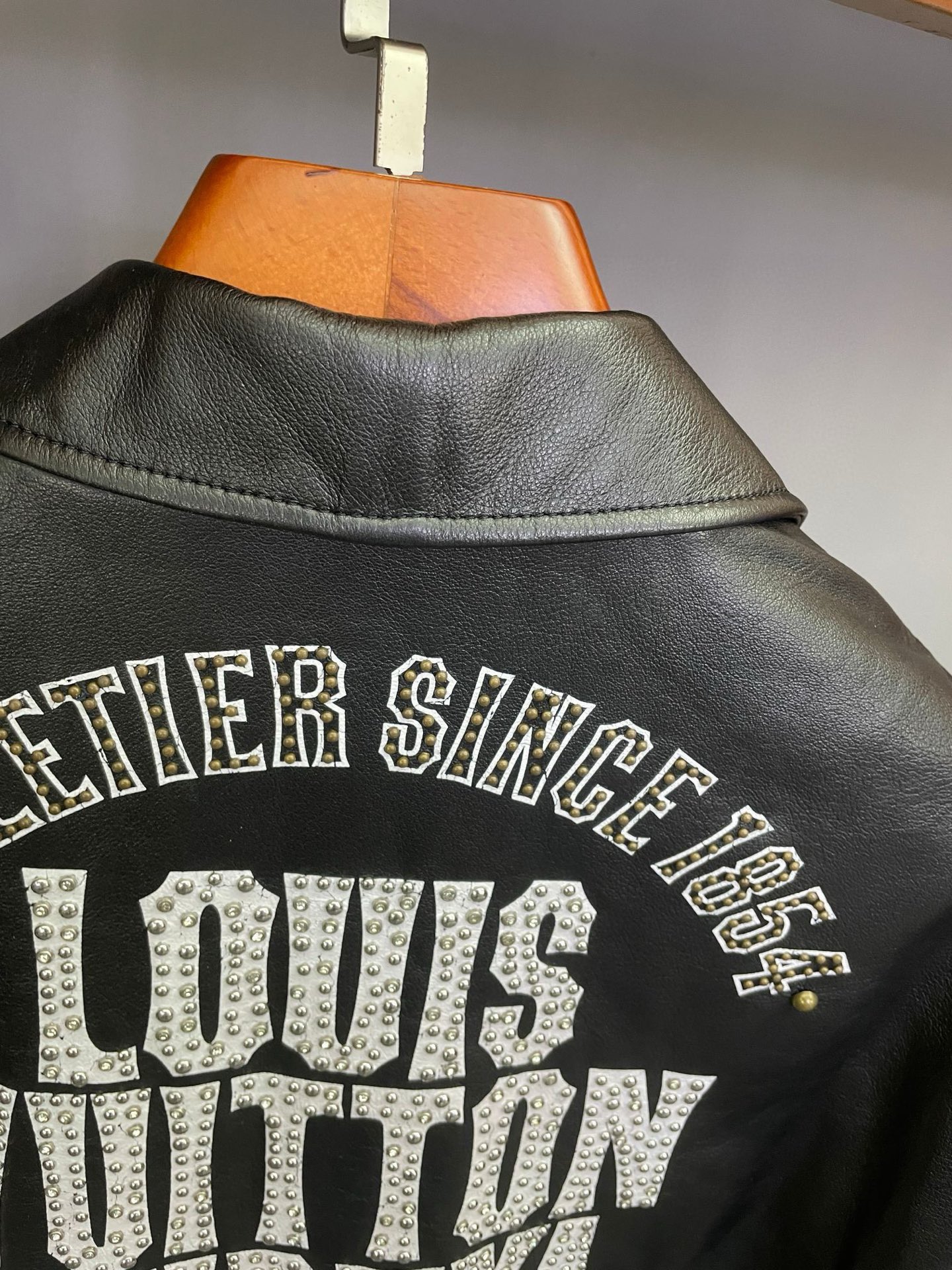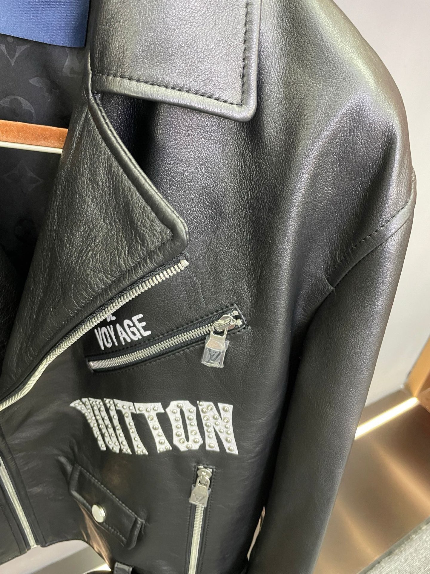Details: Motorcycle jacket crafted from imported sheepskin, with logo print and rivets
