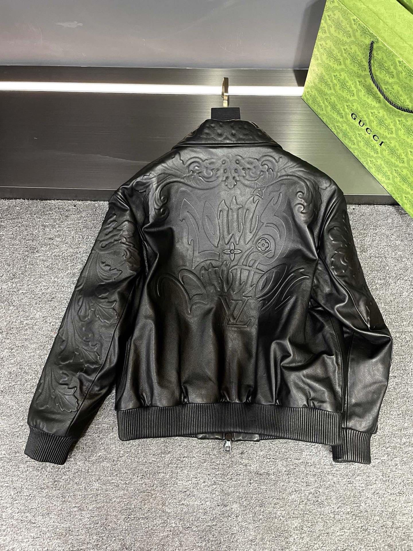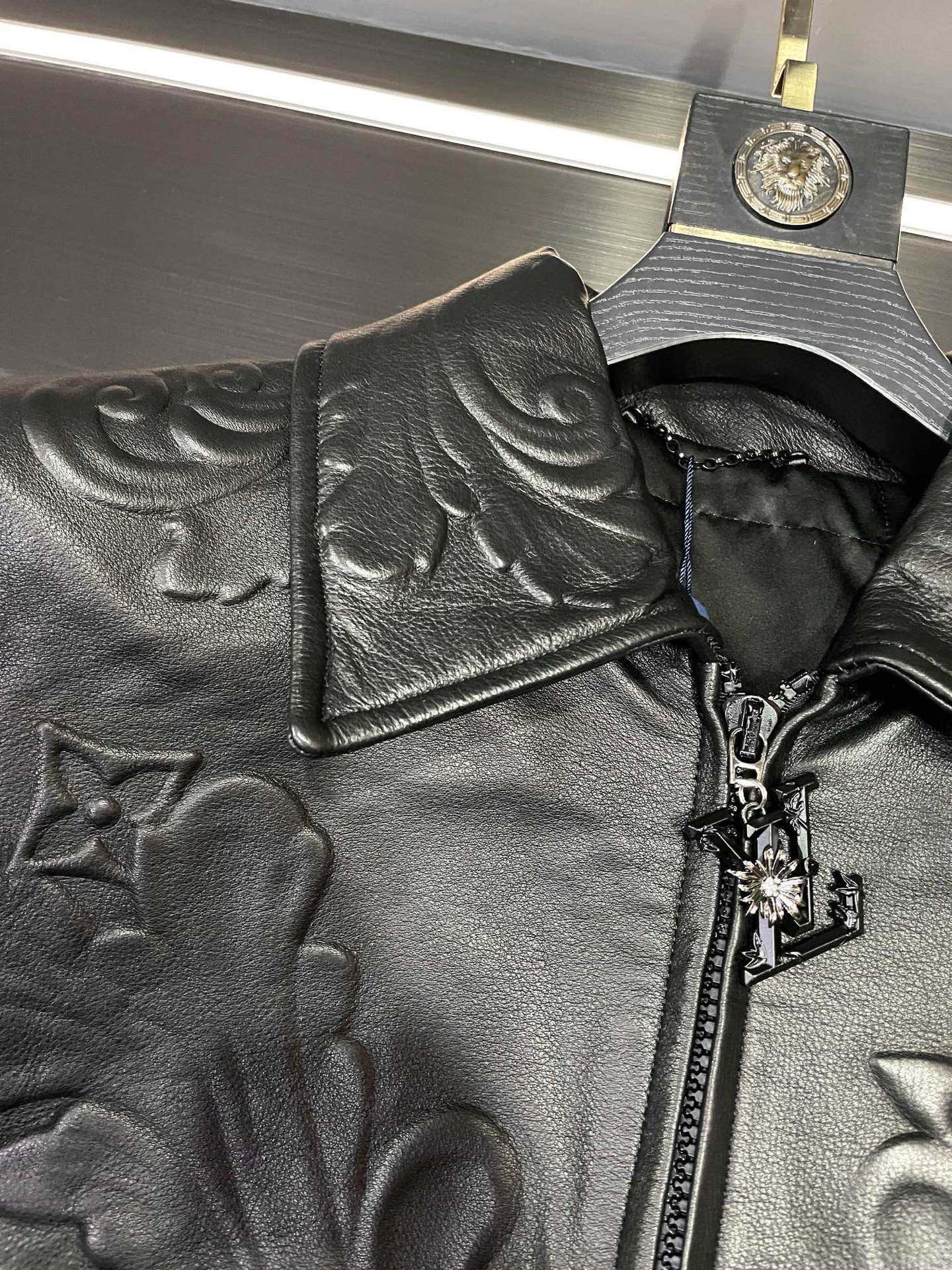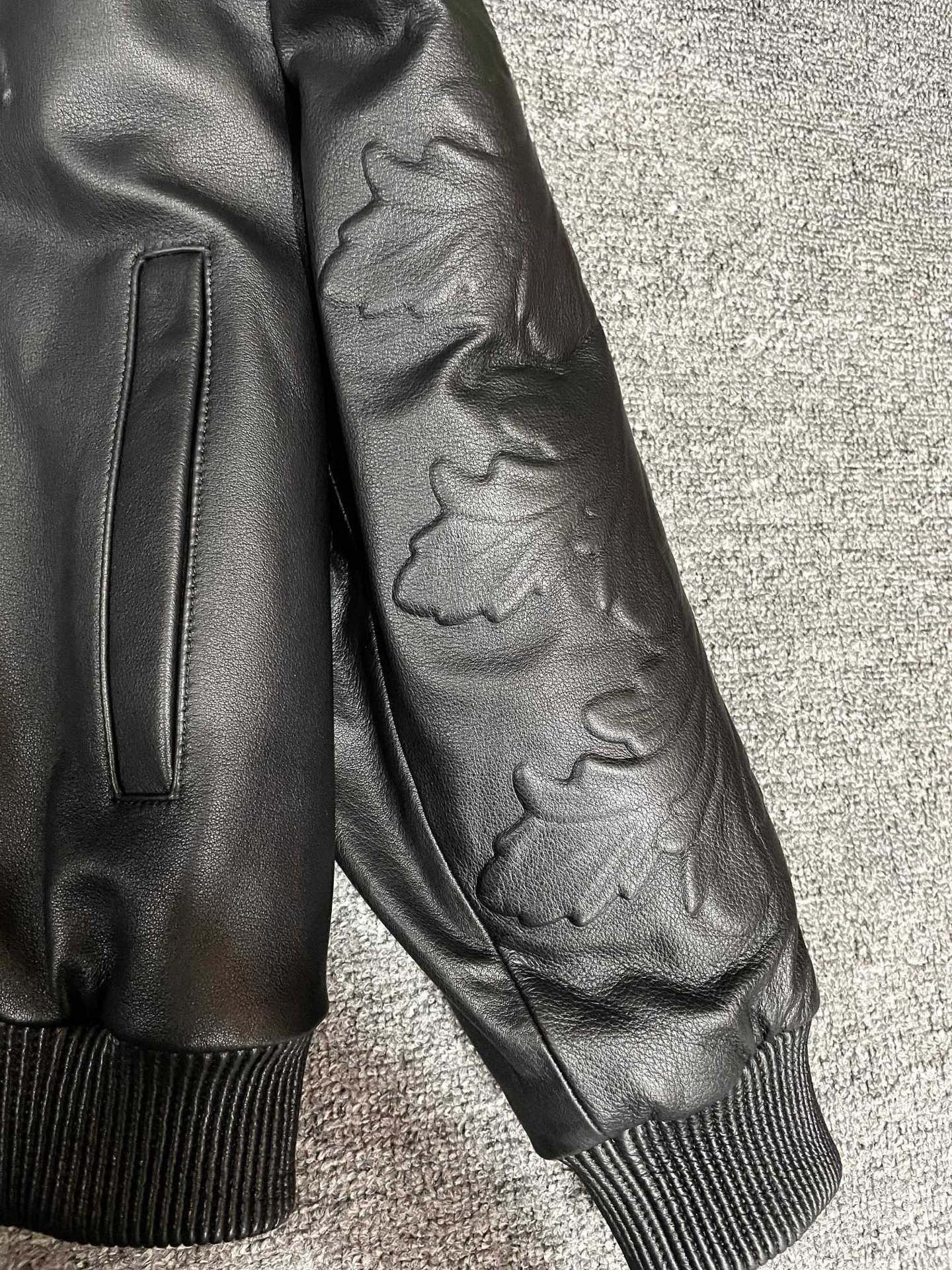 Details: Leather jacket made of imported calfskin, featuring relief craftsmanship and a stylish zipper pull