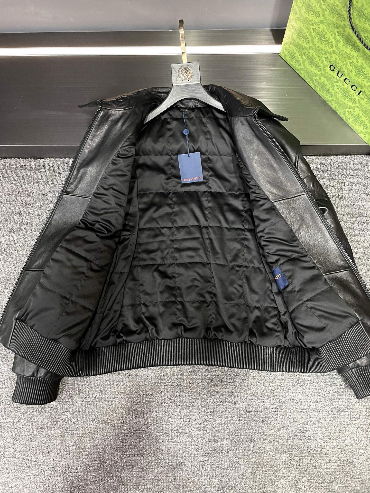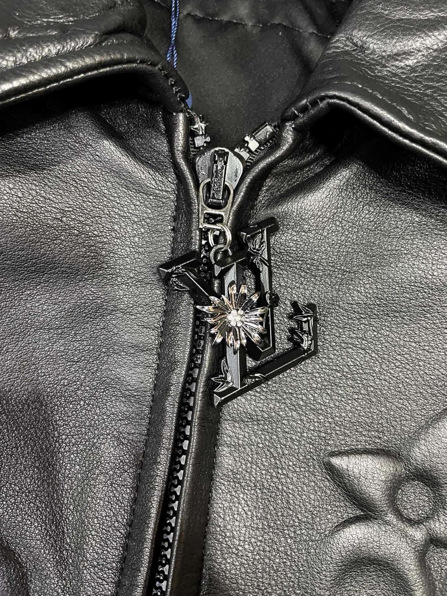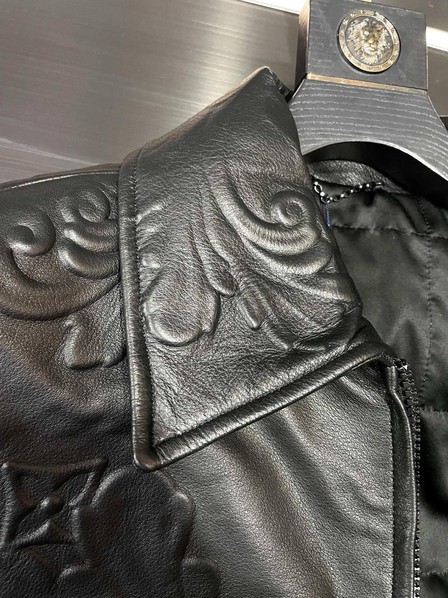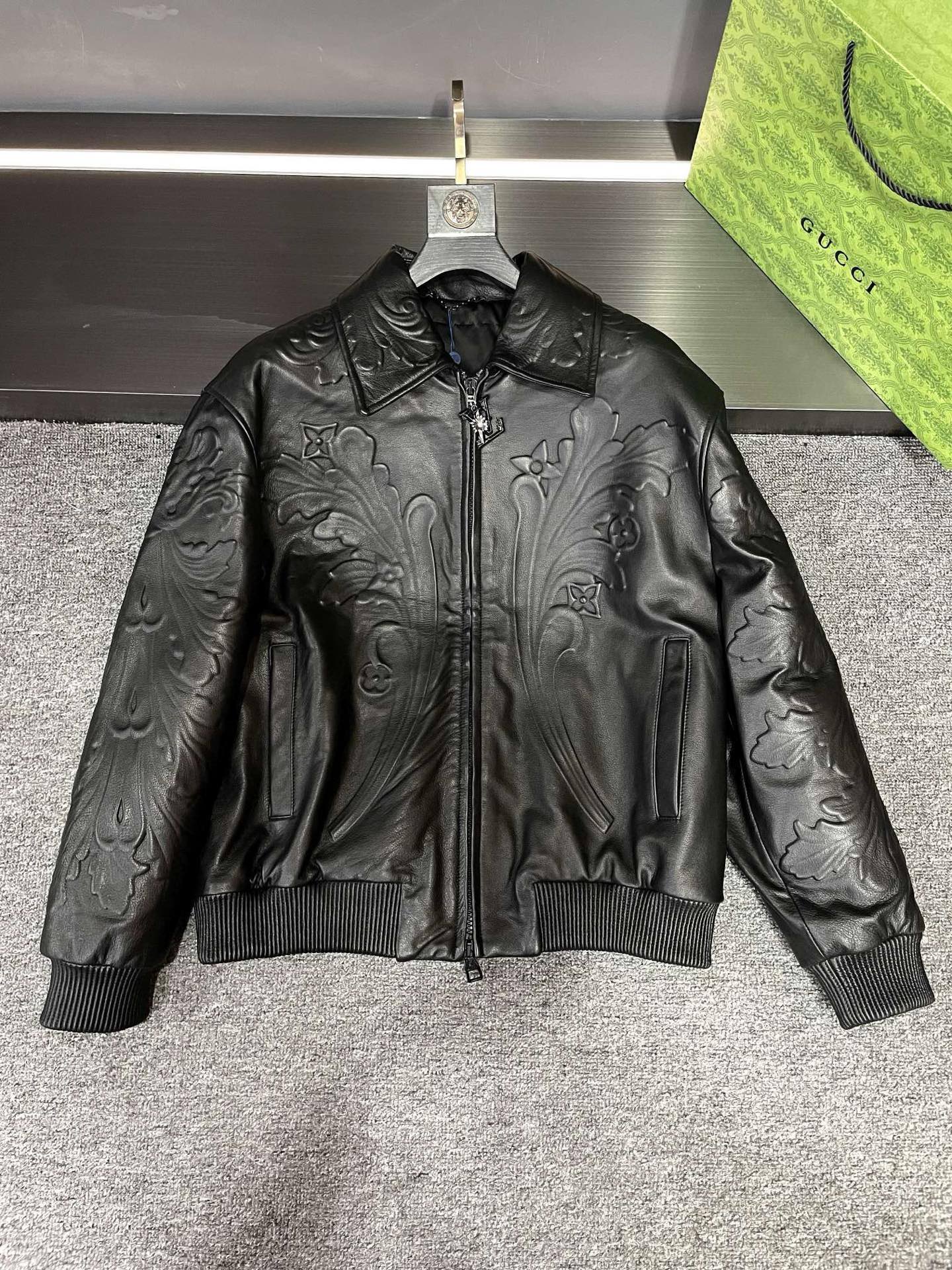 Details: Leather jacket made of imported calfskin, featuring relief craftsmanship and a stylish zipper pull