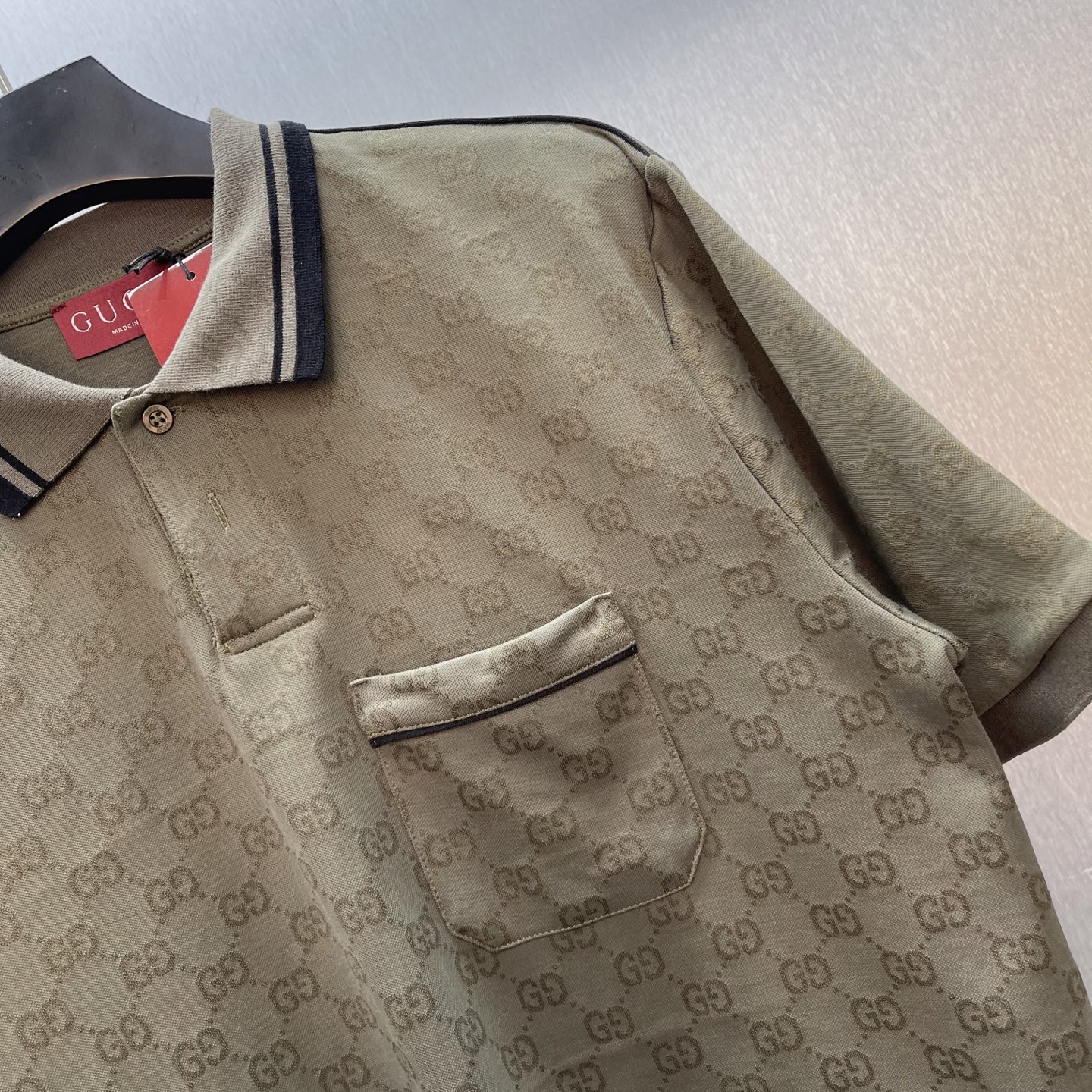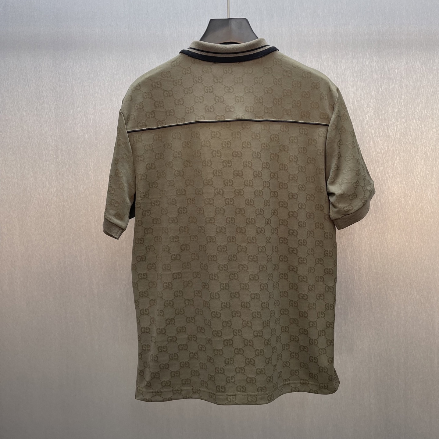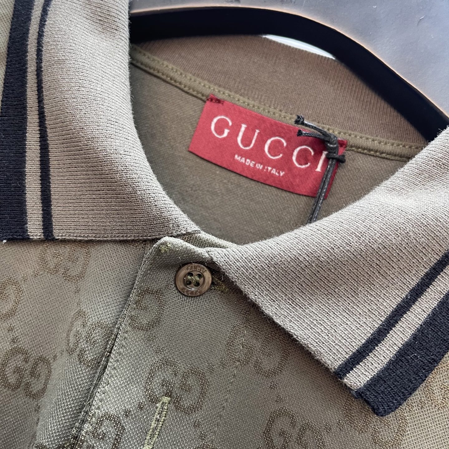 Details: Forest green knitted polo shirt with striped collar, showing good taste