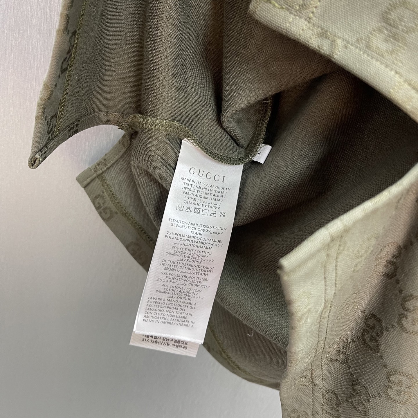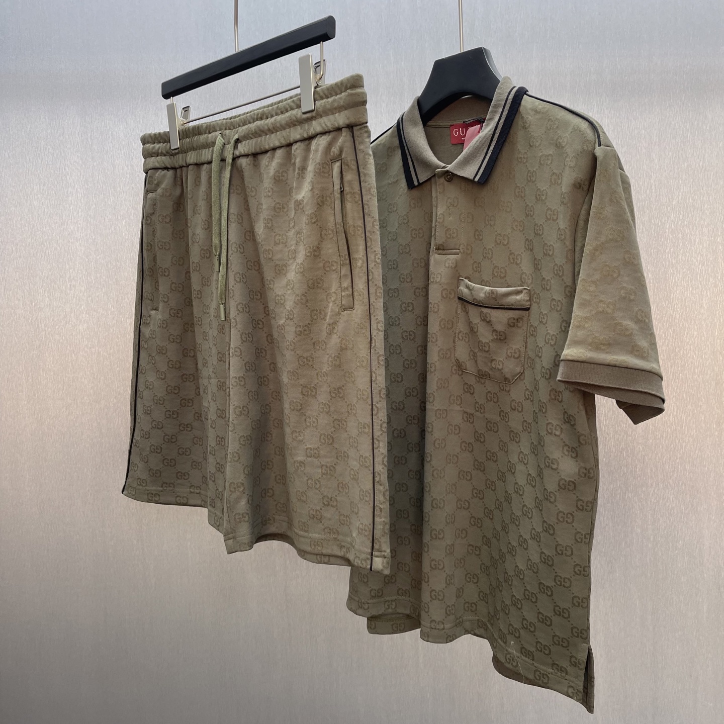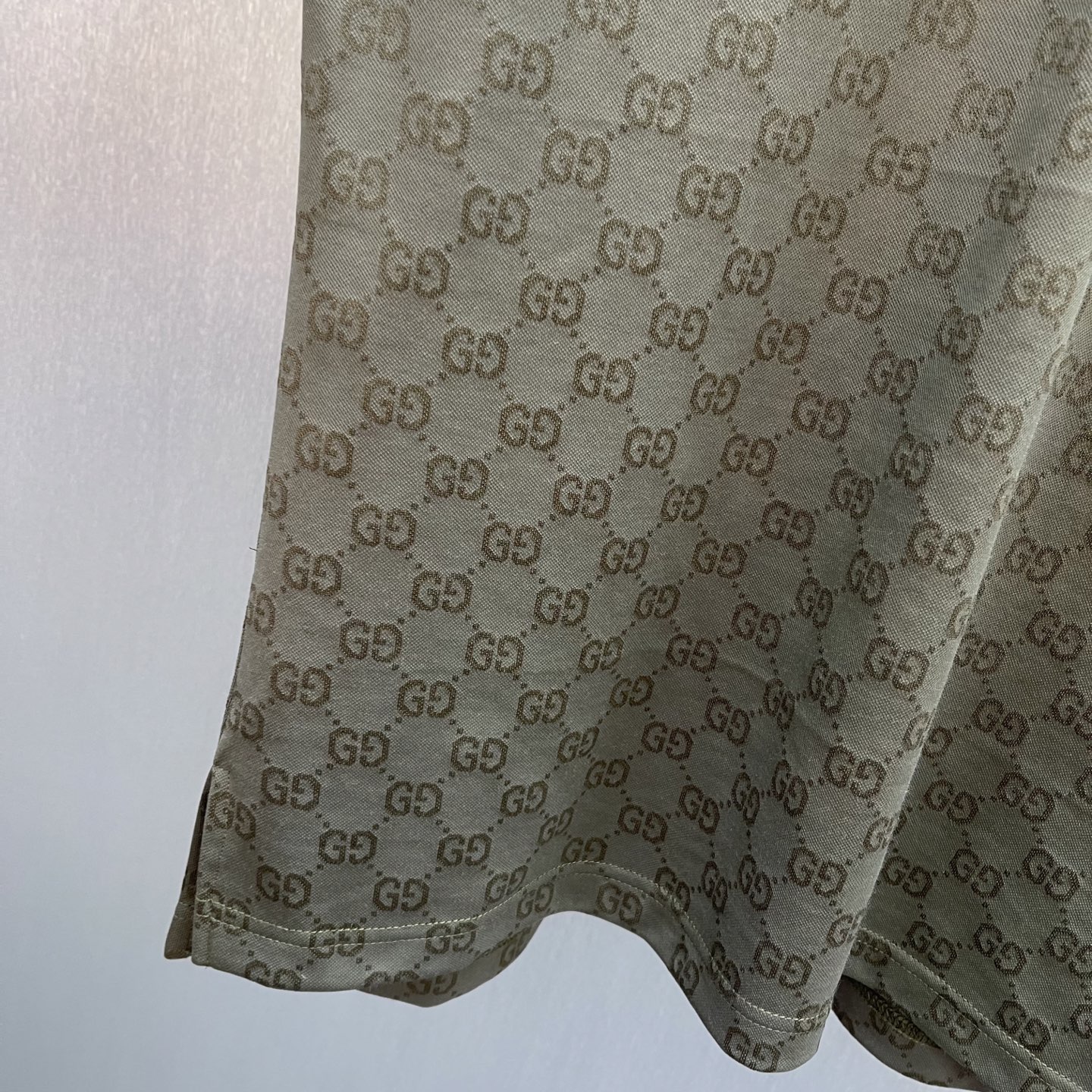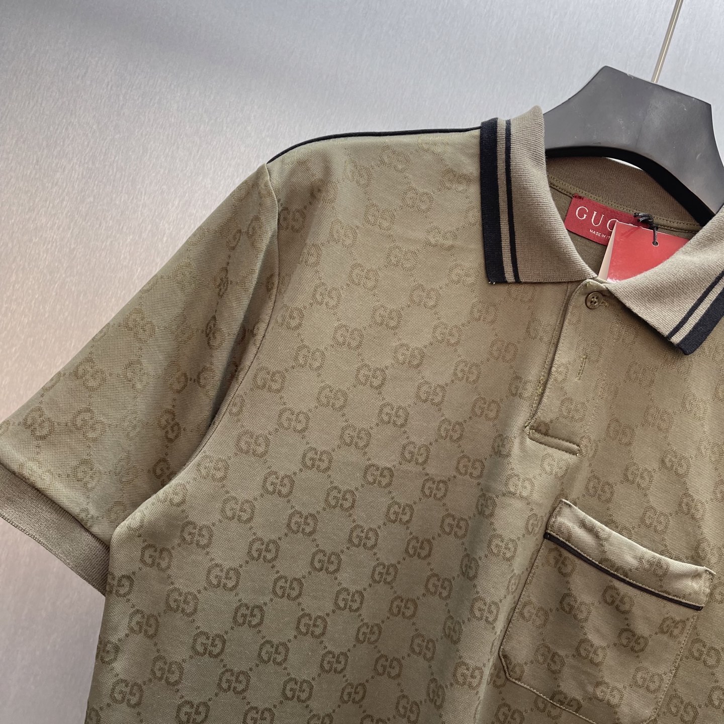 Details: Forest green knitted polo shirt with striped collar, showing good taste