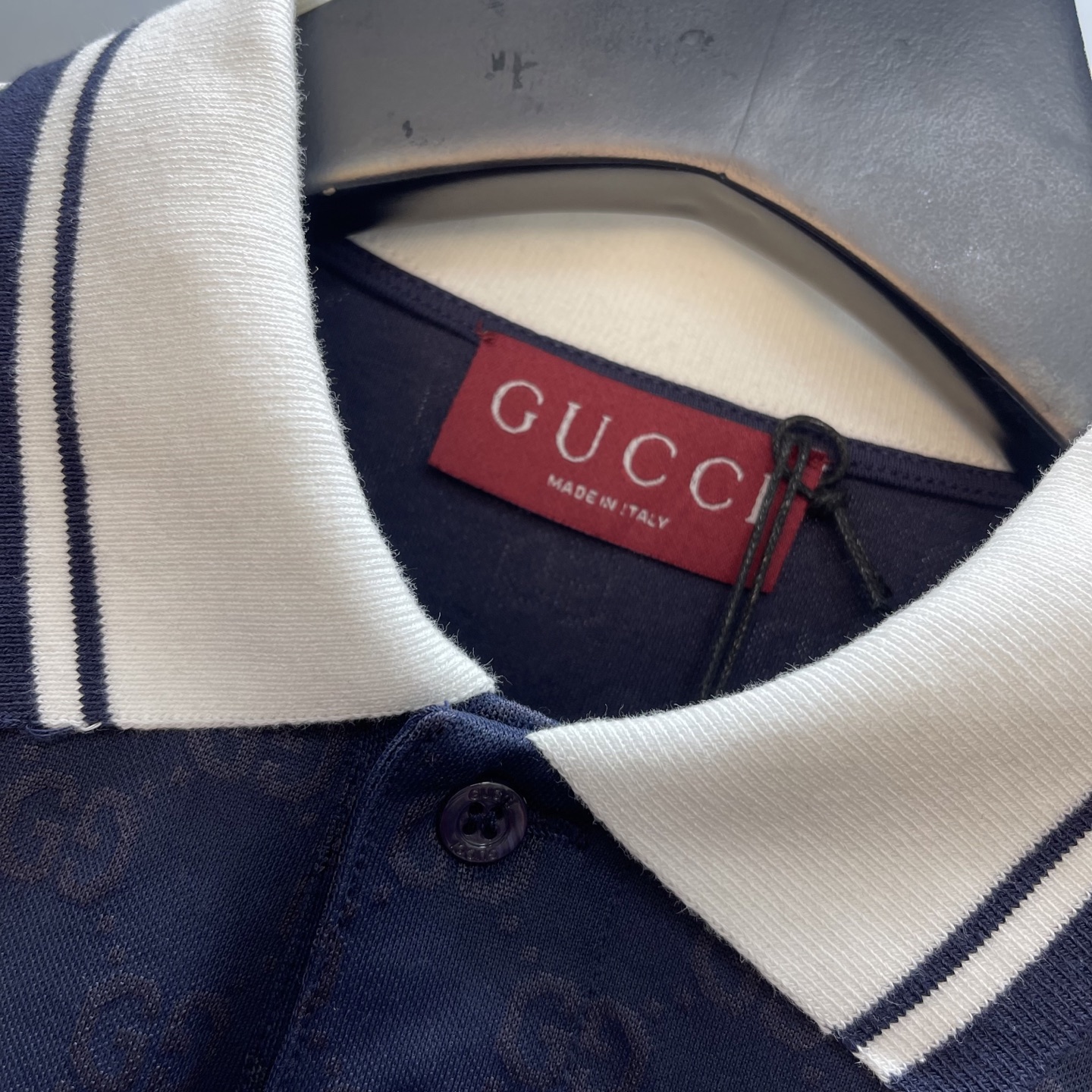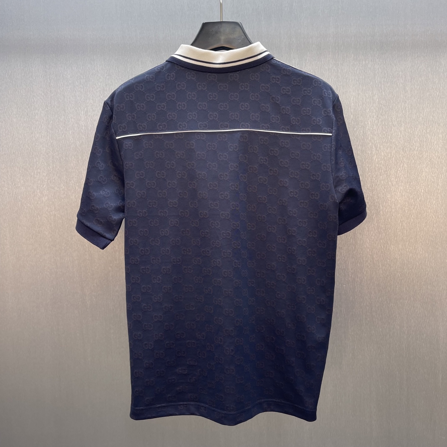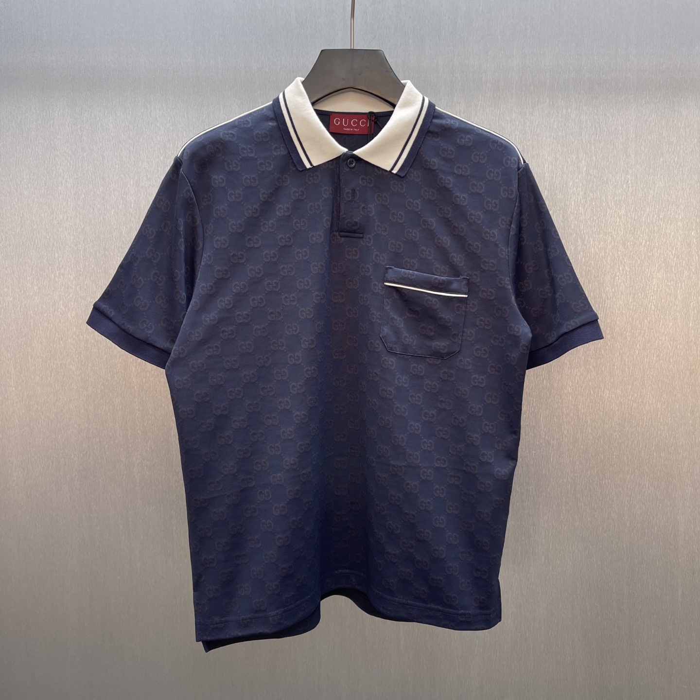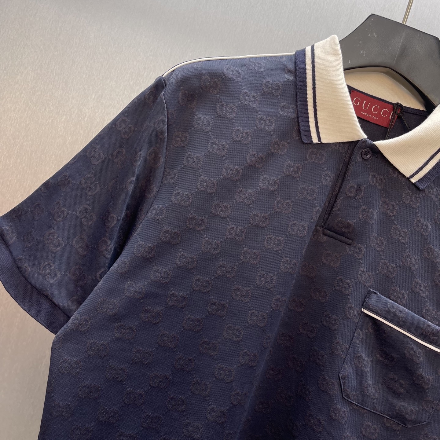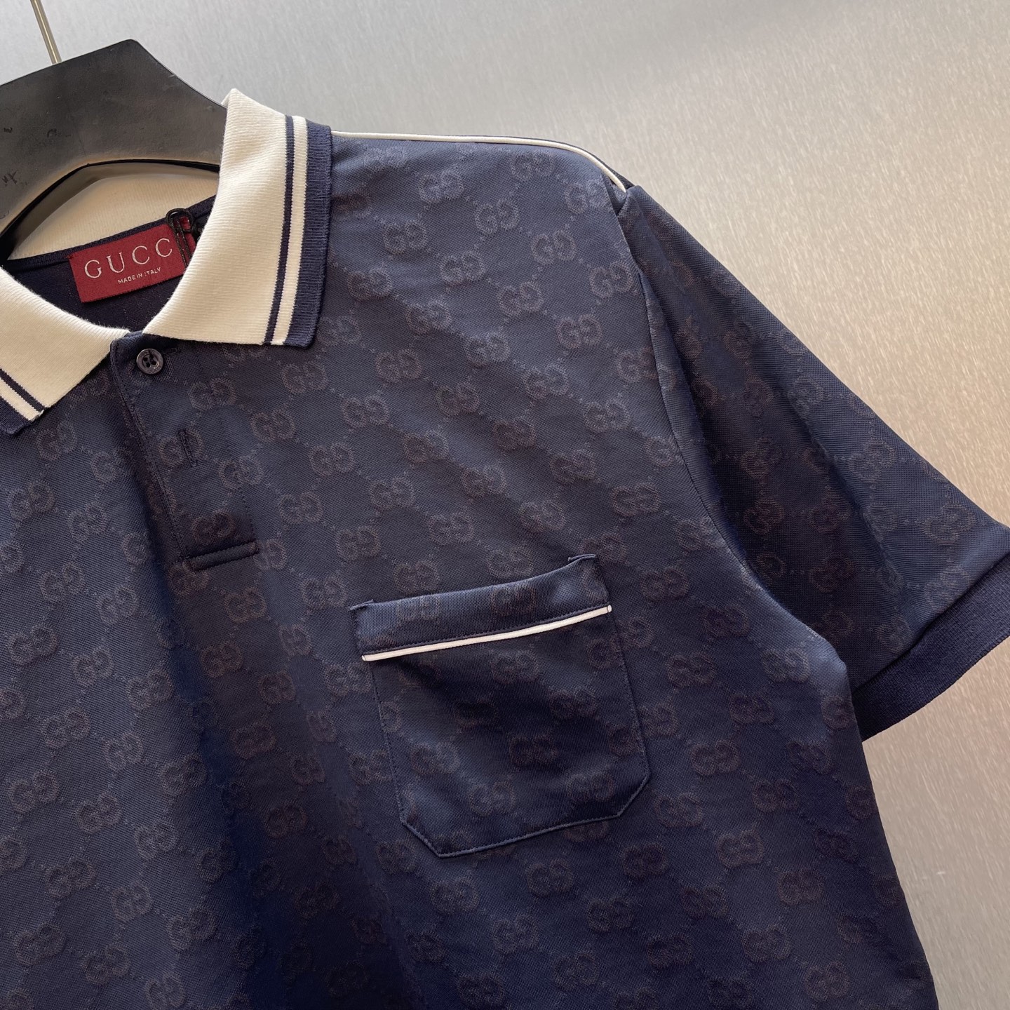 Details: Navy blue knitted polo shirt with floral embroidery, featuring tasteful details