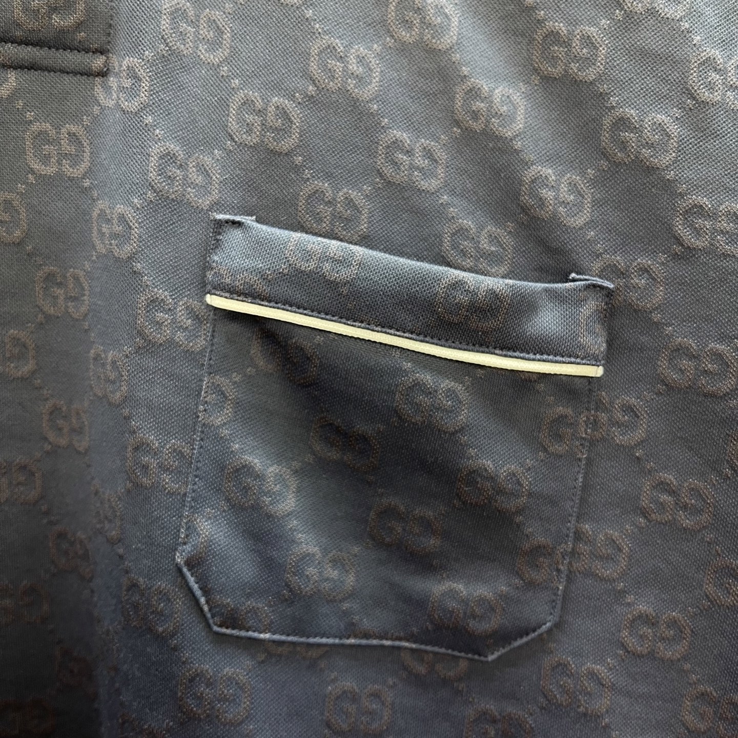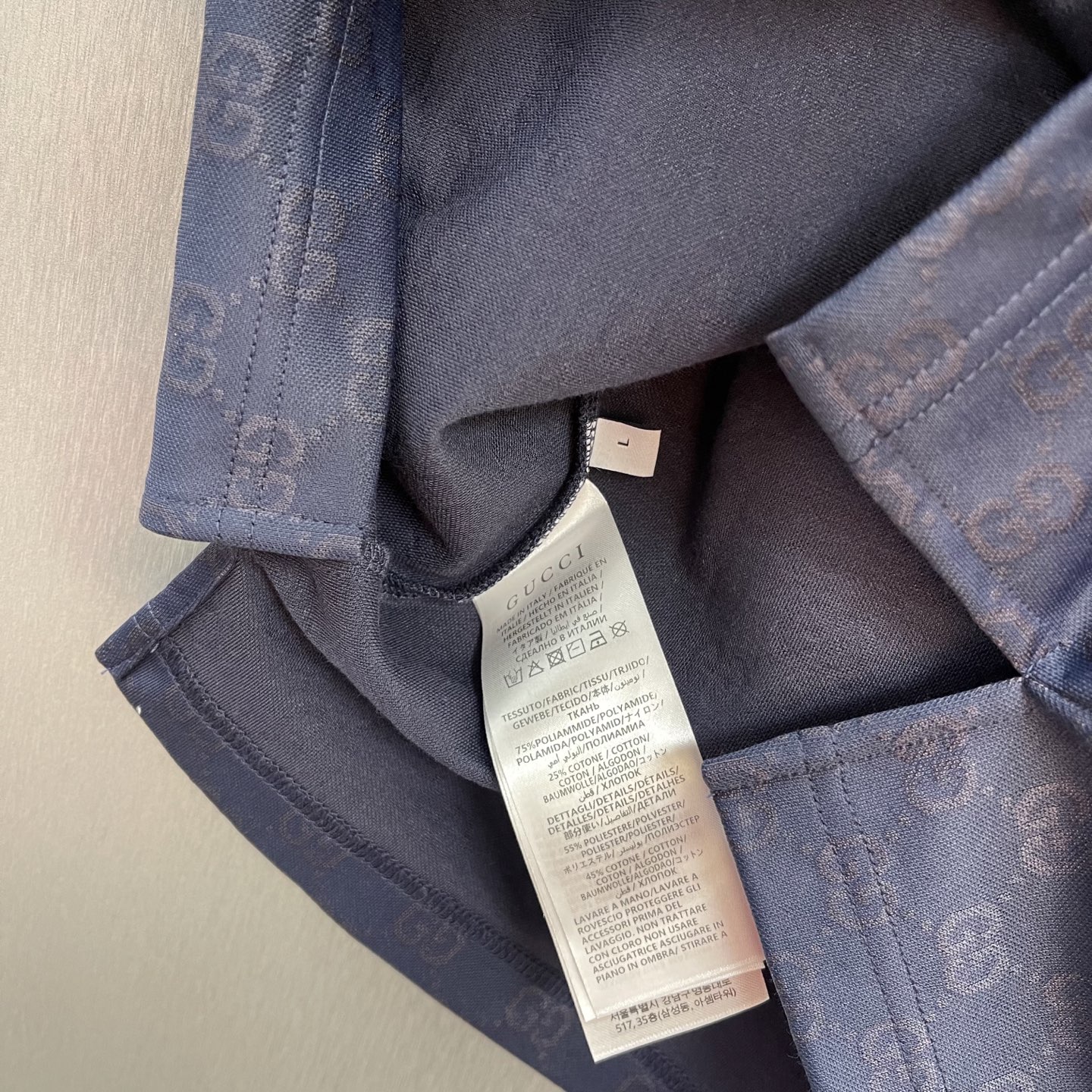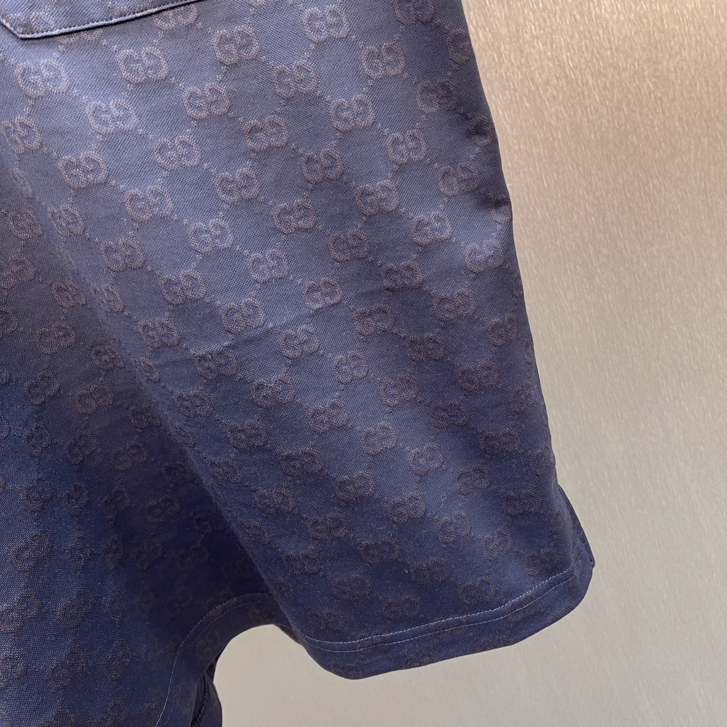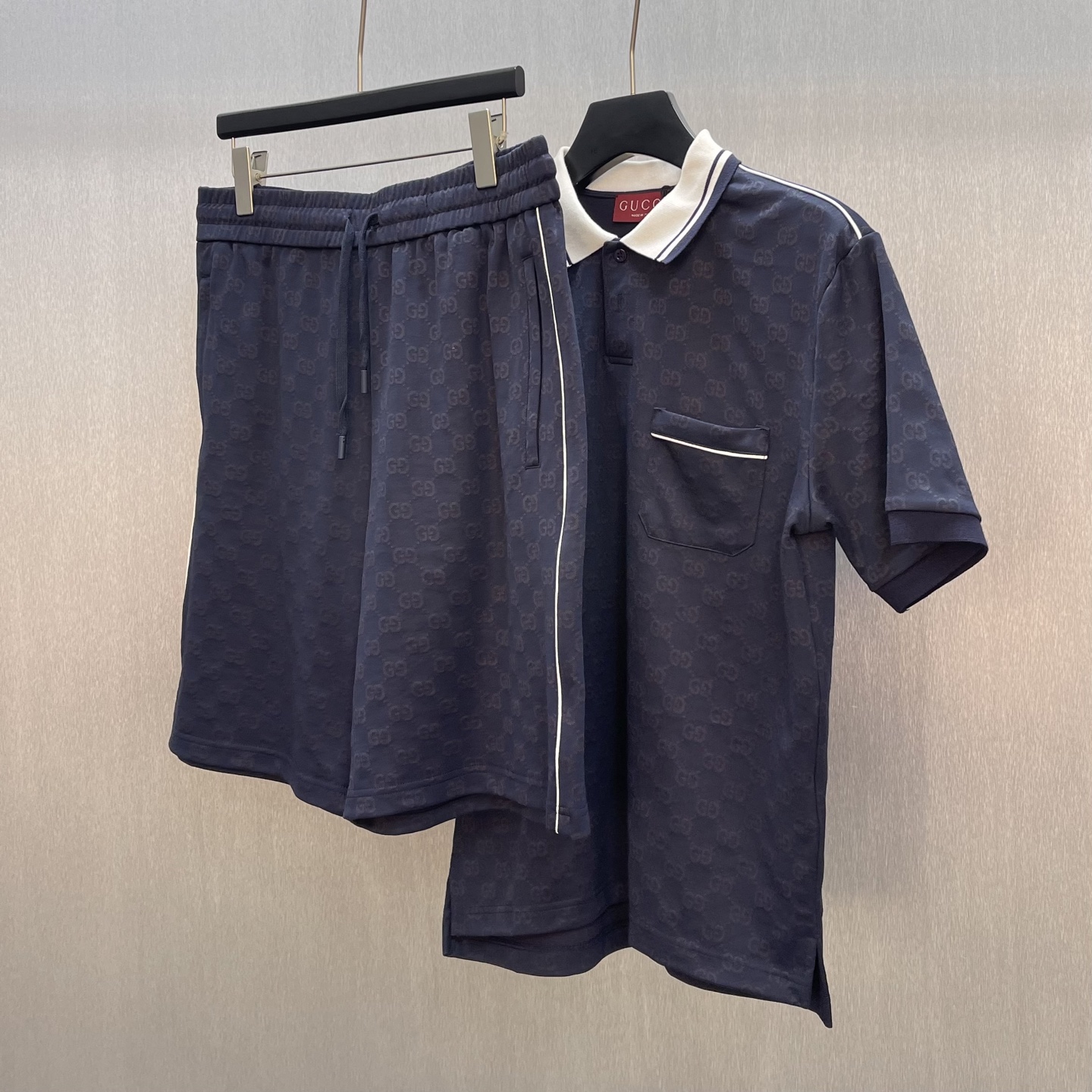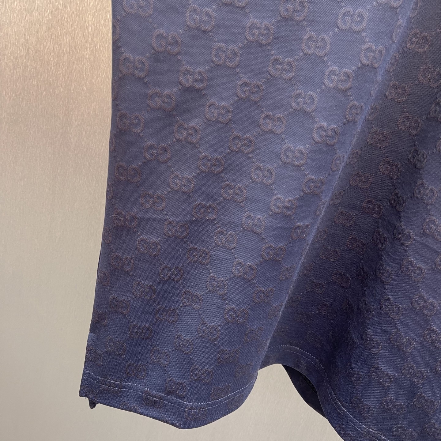 Details: Navy blue knitted polo shirt with floral embroidery, featuring tasteful details