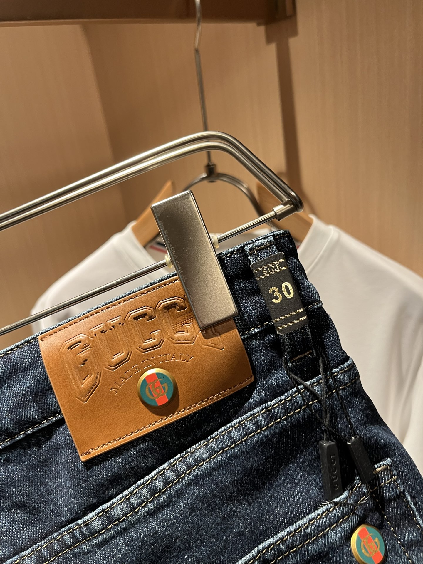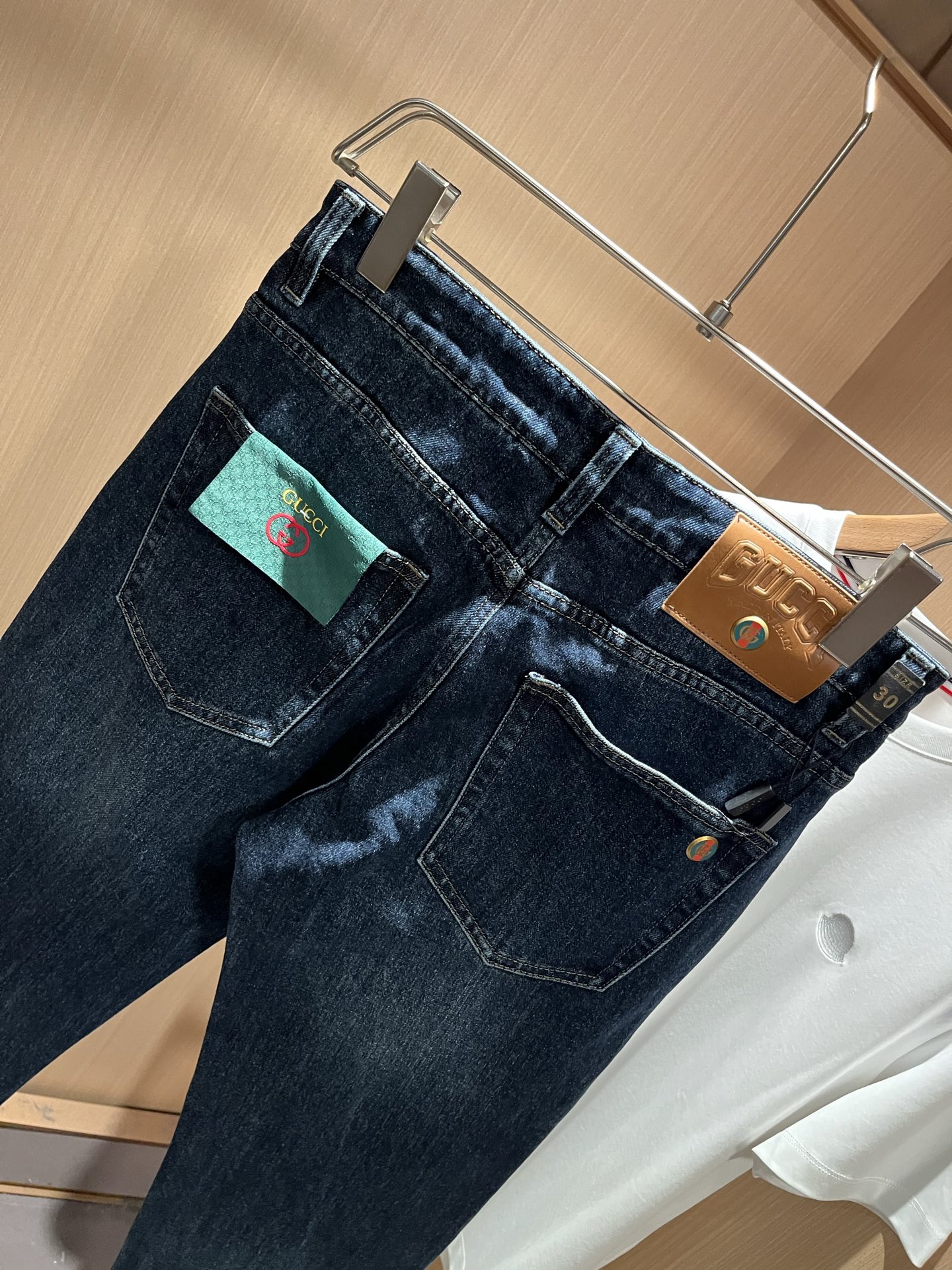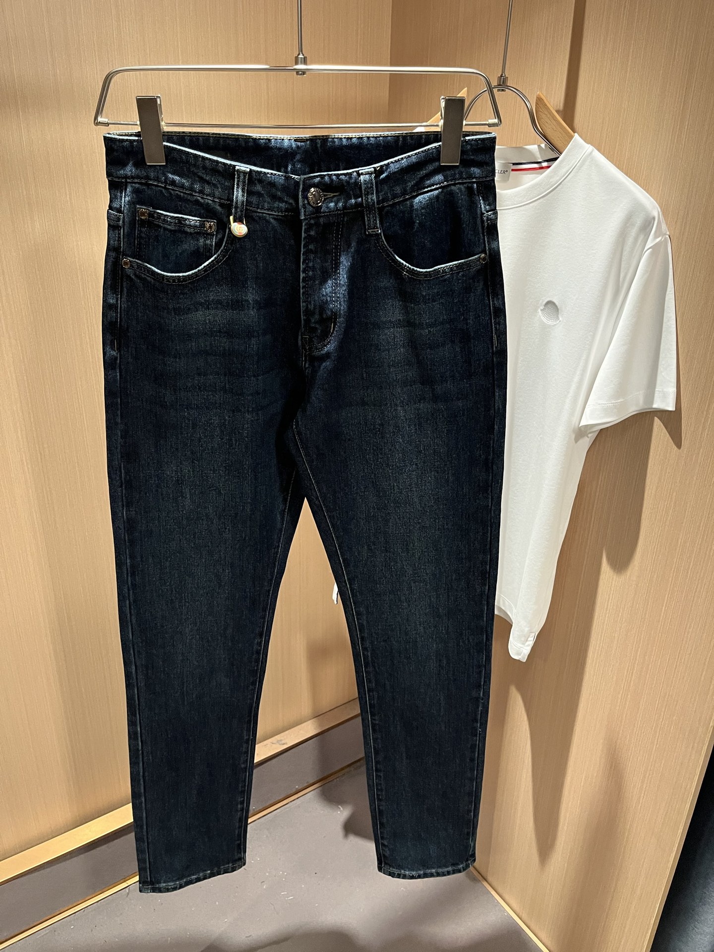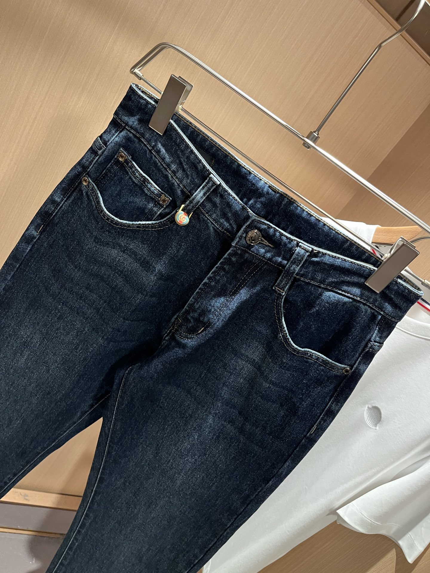 Details: Classic slim - cut jeans with a logo waist card and high comfort