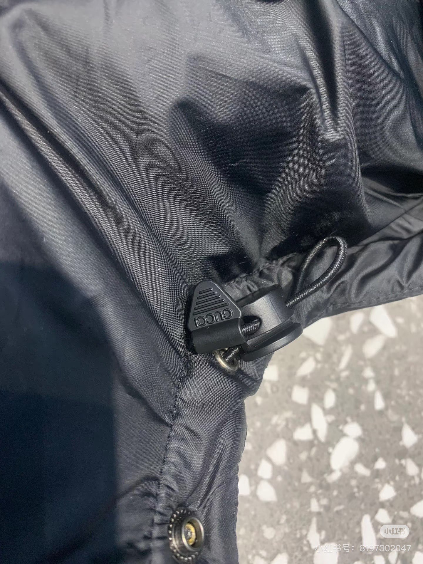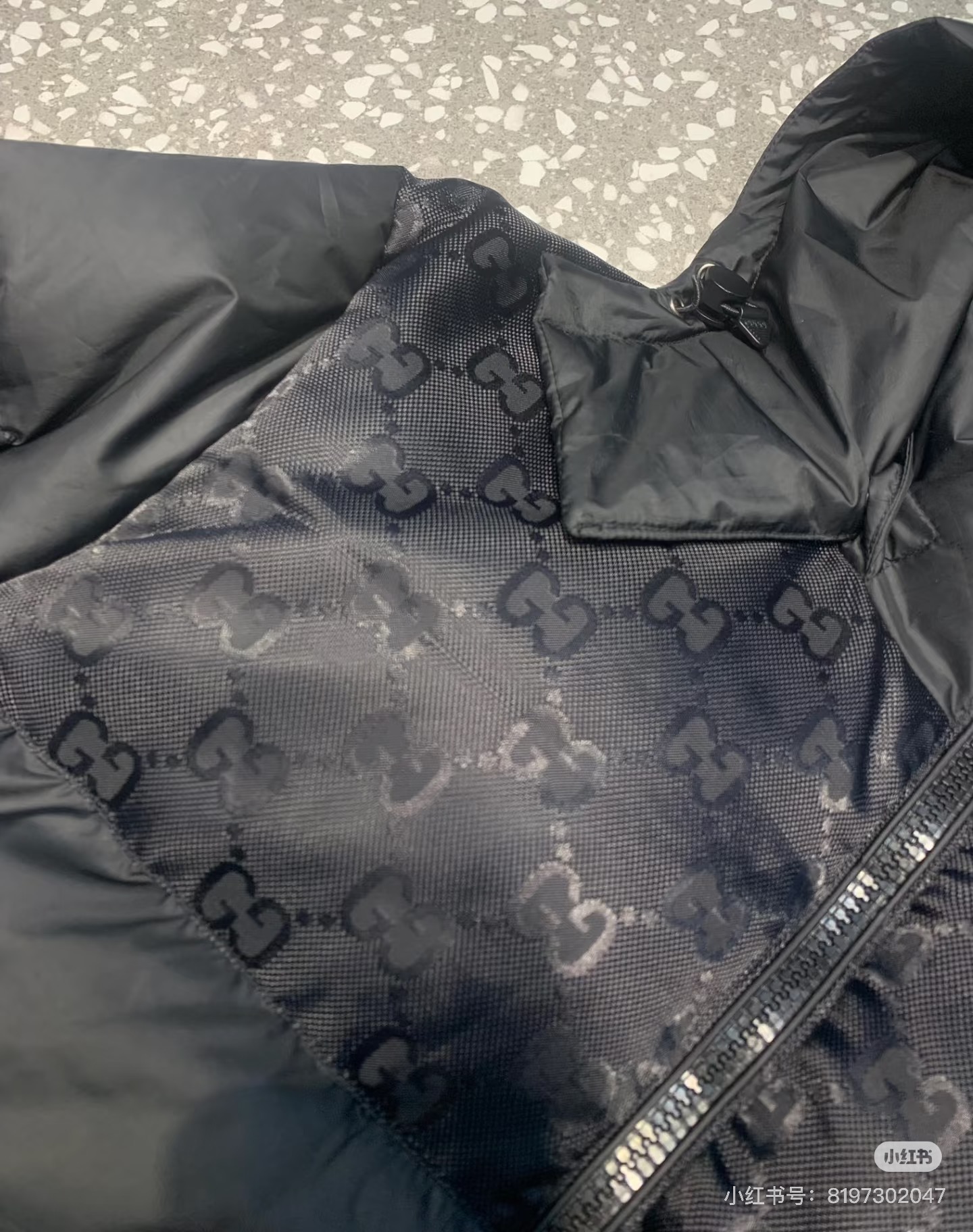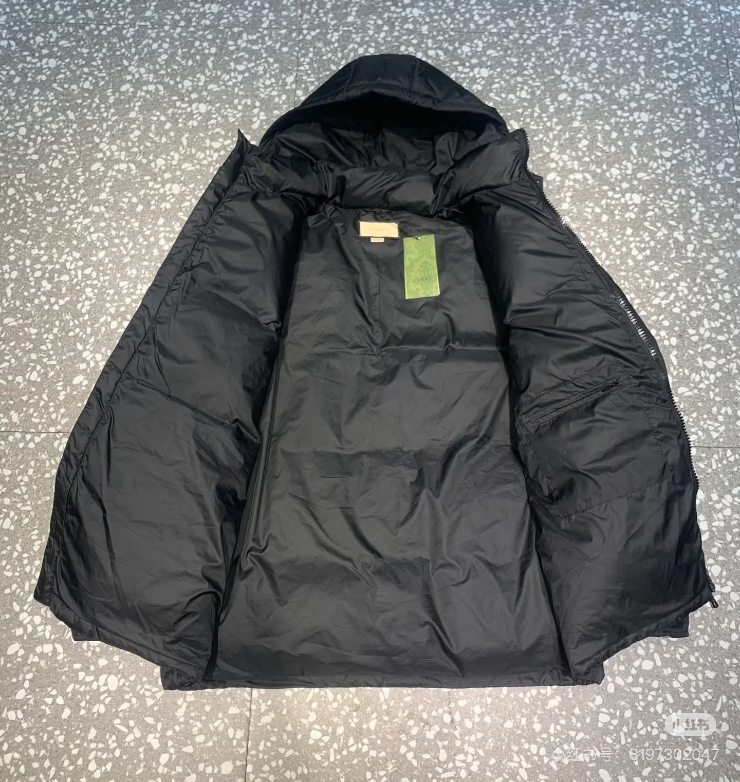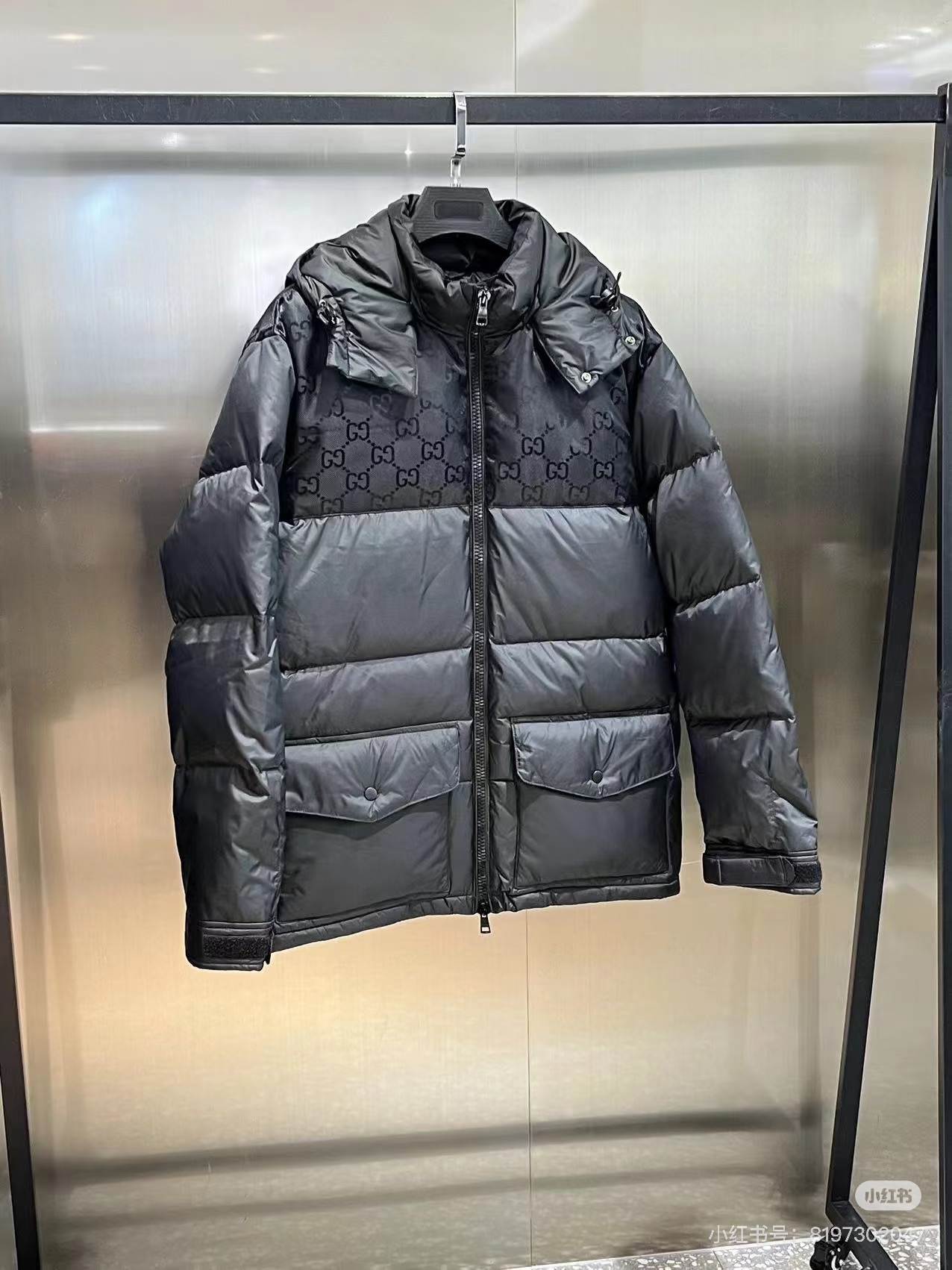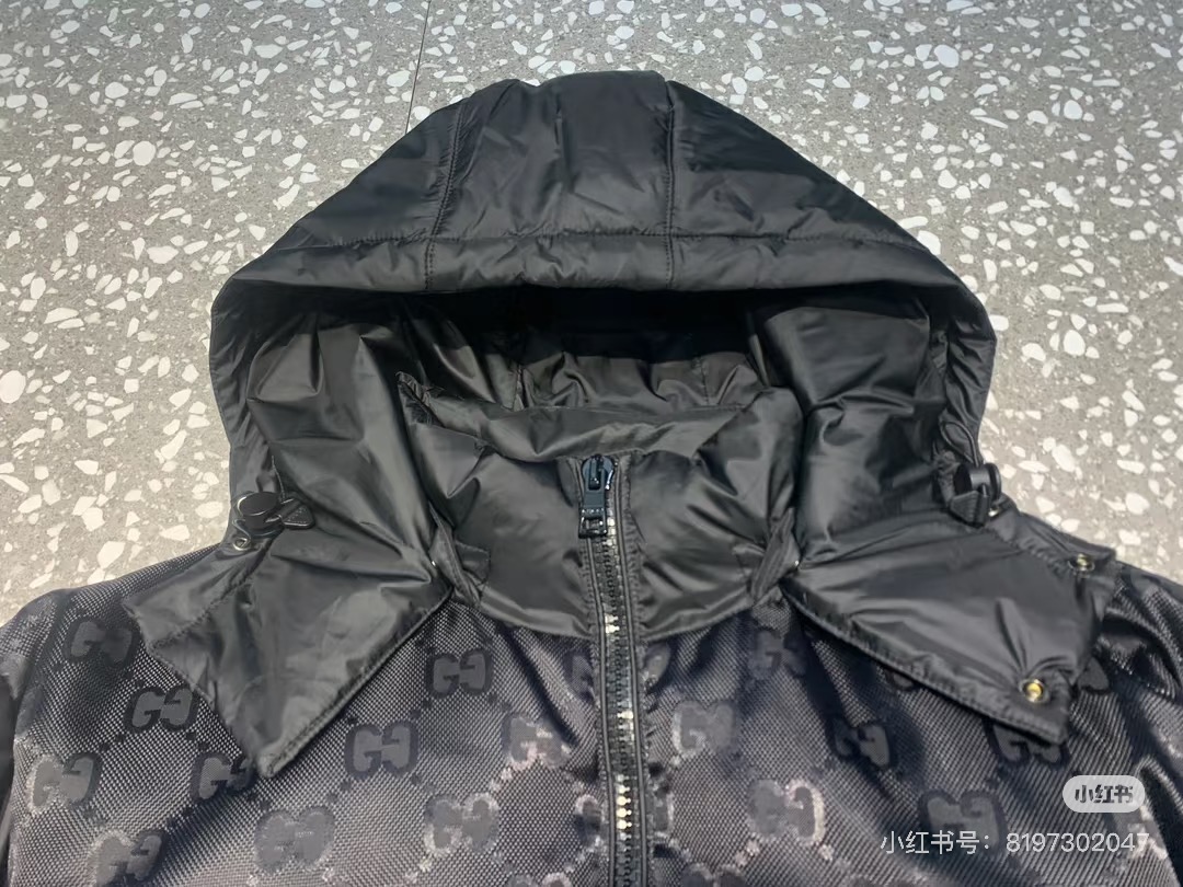 Details: New Hooded Mid-Length Down Jacket. Made of waterproof high-density nylon, features a color-block GG pattern, metal zipper, detachable hood, and premium down filling for warmth and comfort.
