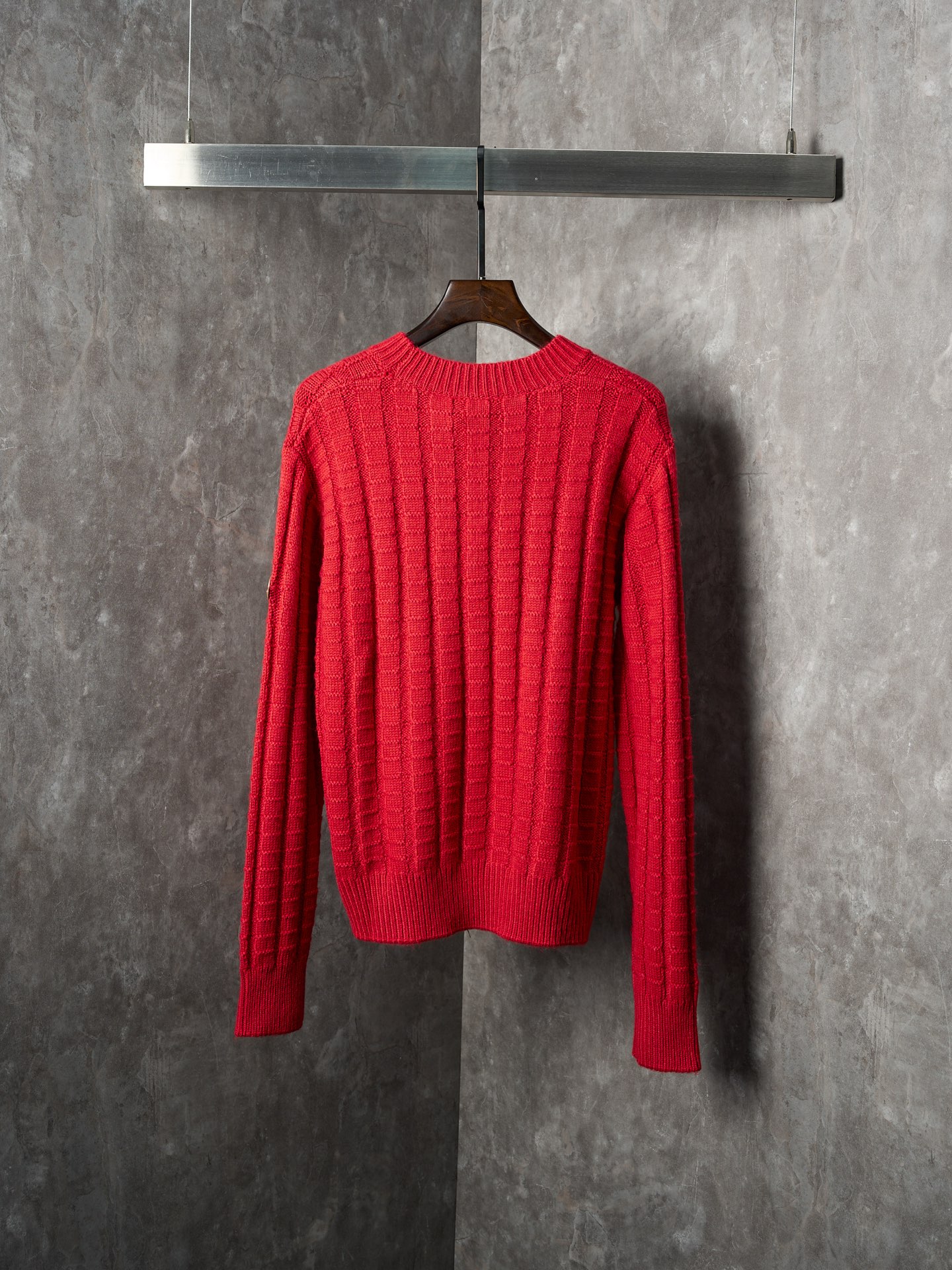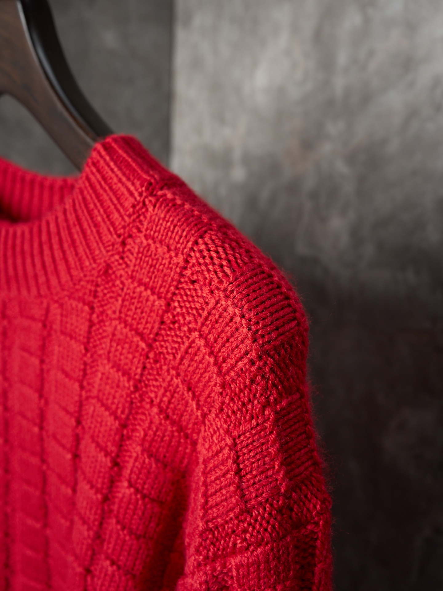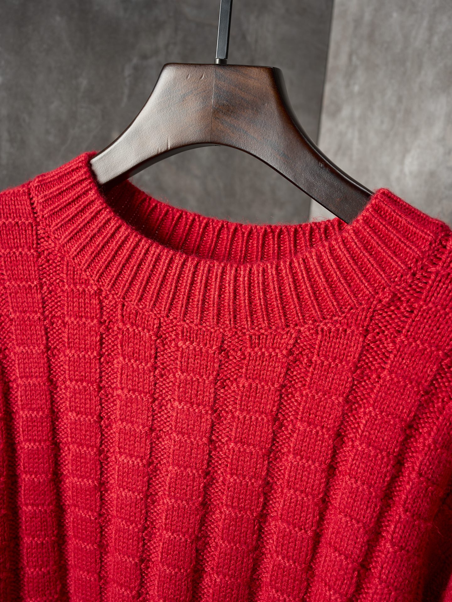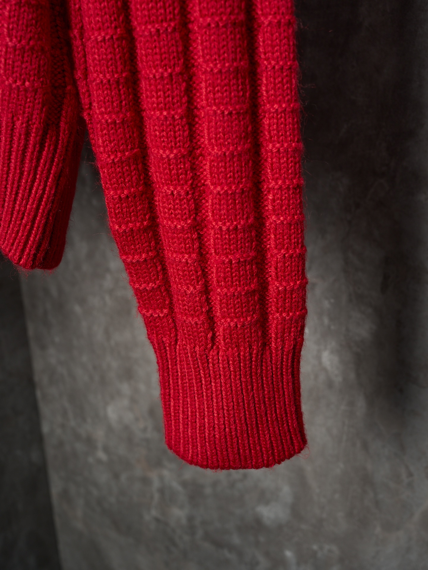Details: Relief-knit wool sweater in red, soft, with an embossed vertical pattern