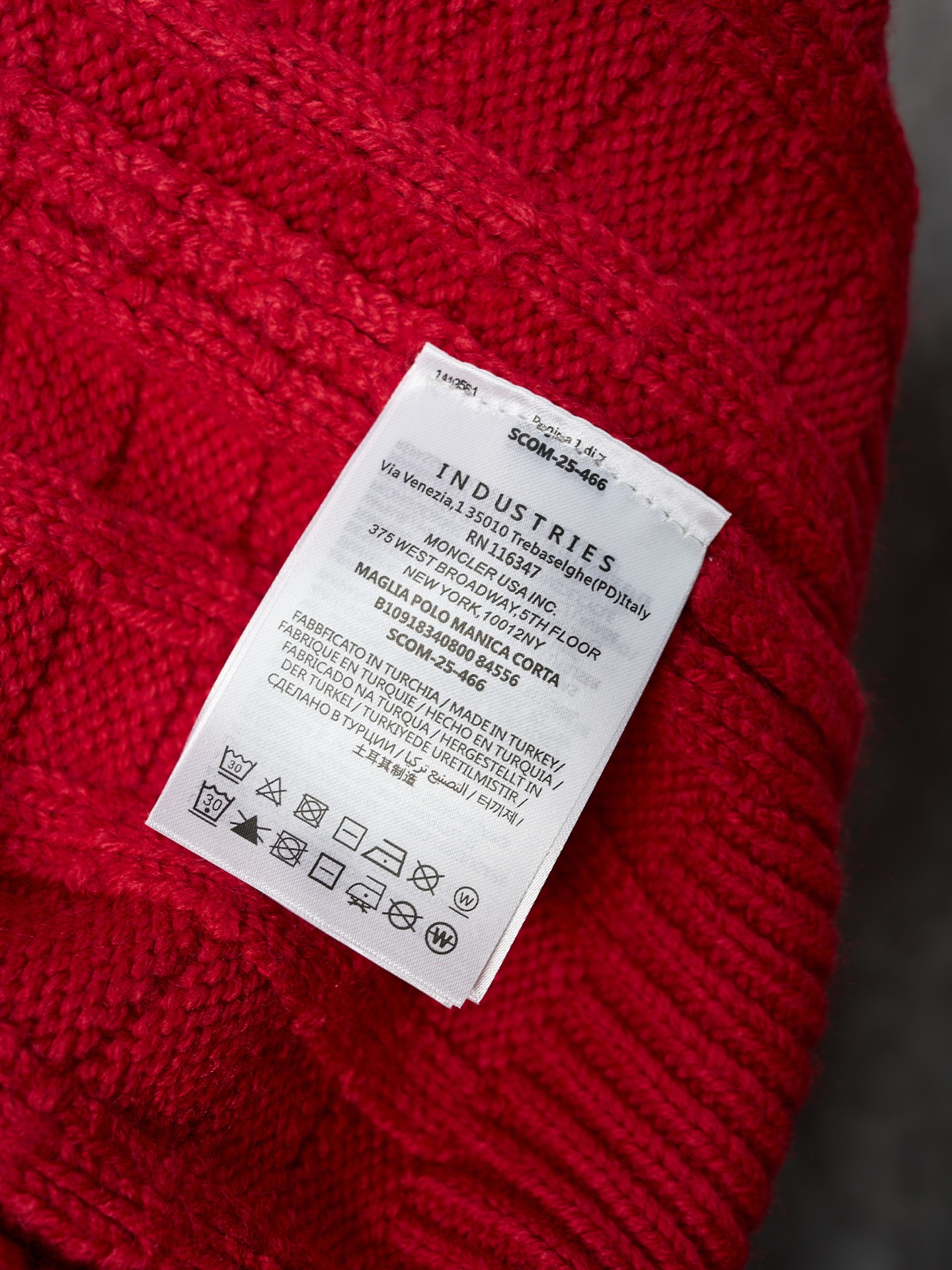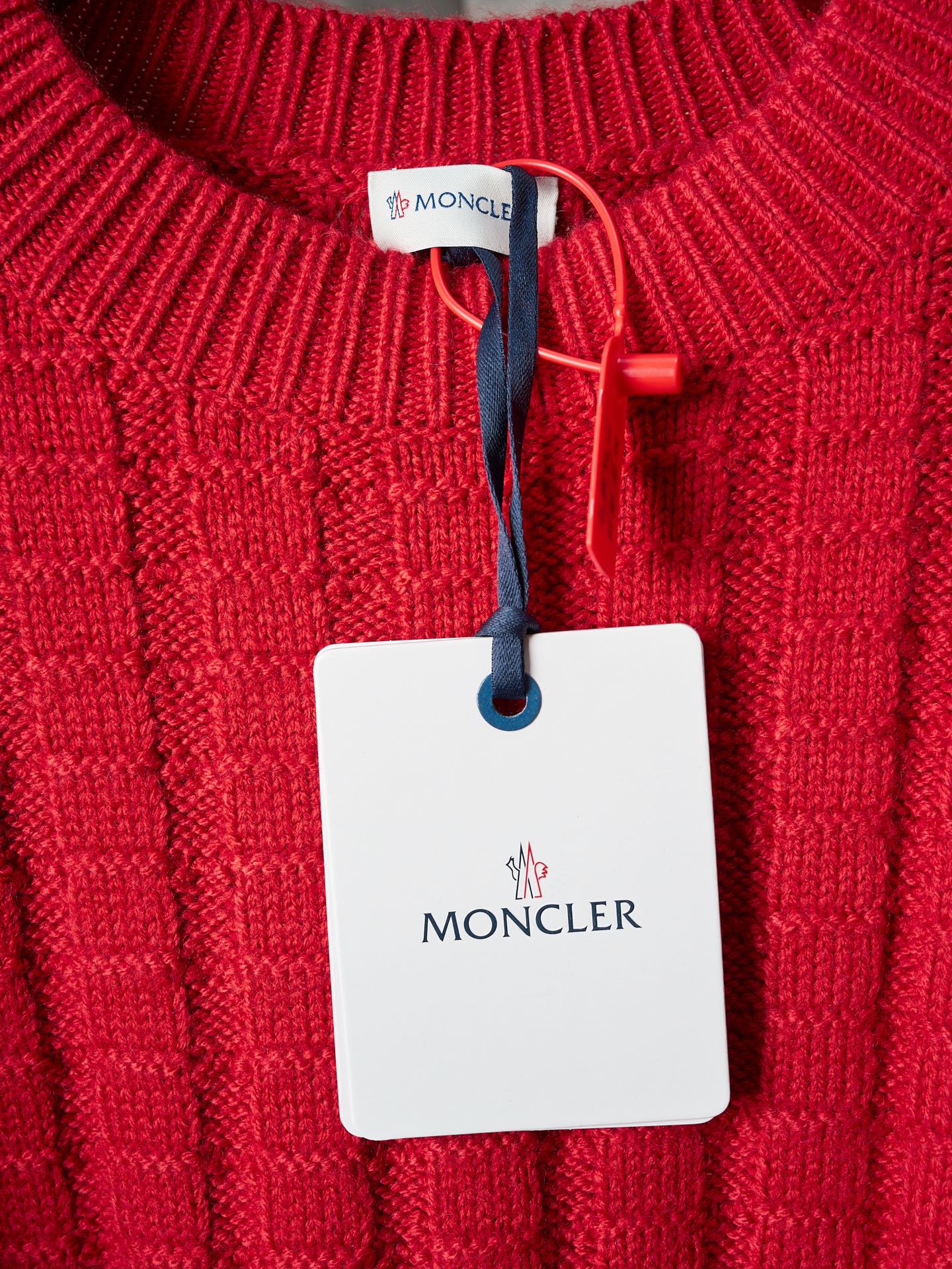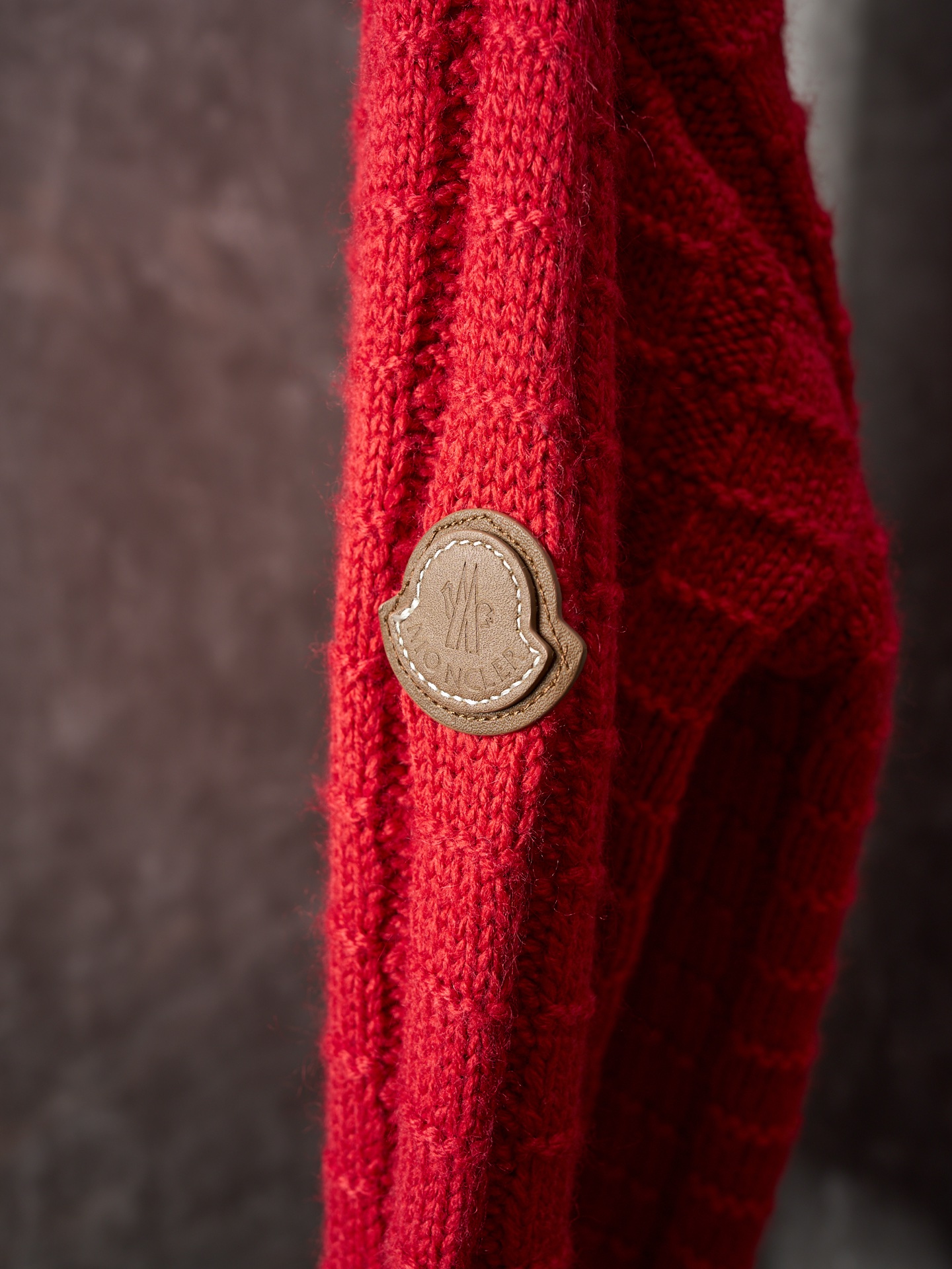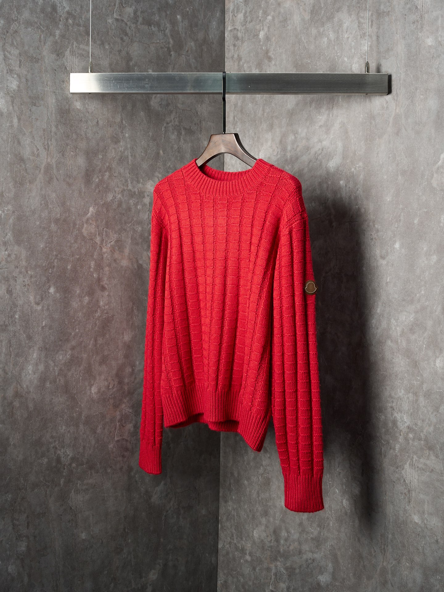 Details: Relief-knit wool sweater in red, soft, with an embossed vertical pattern