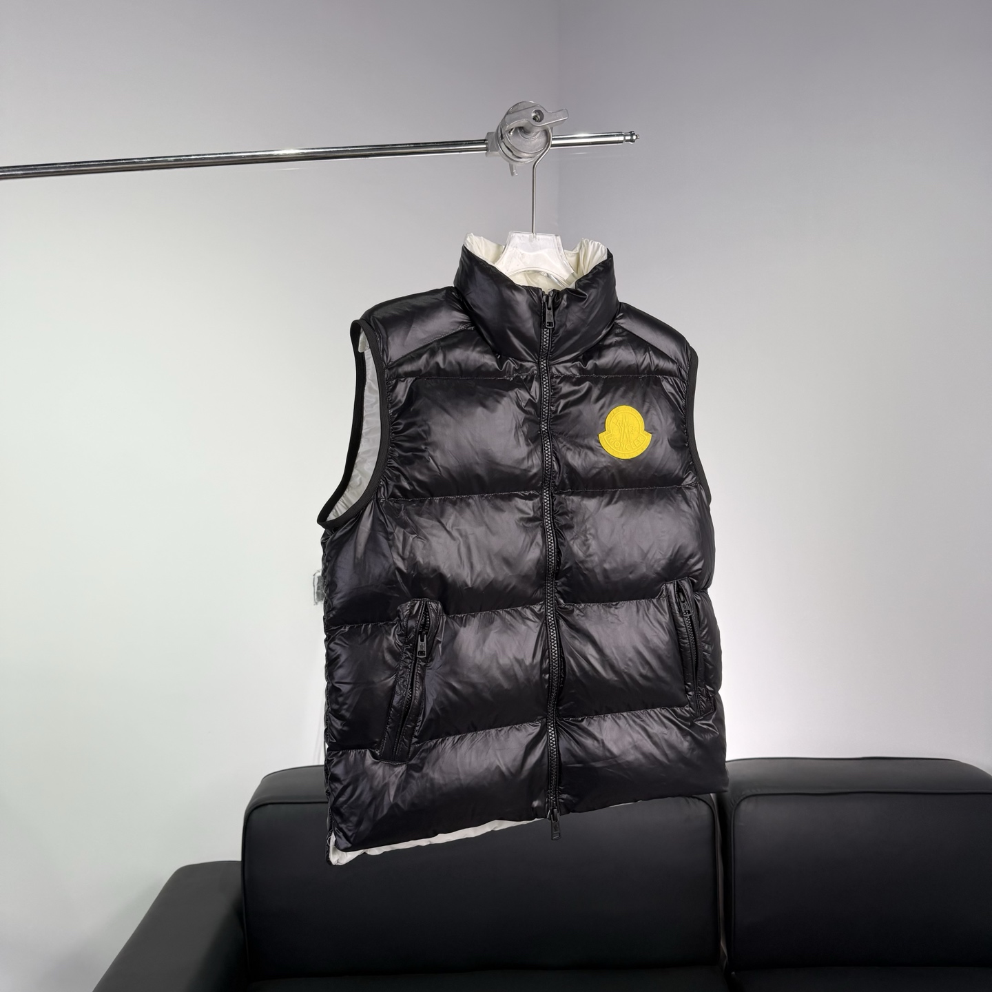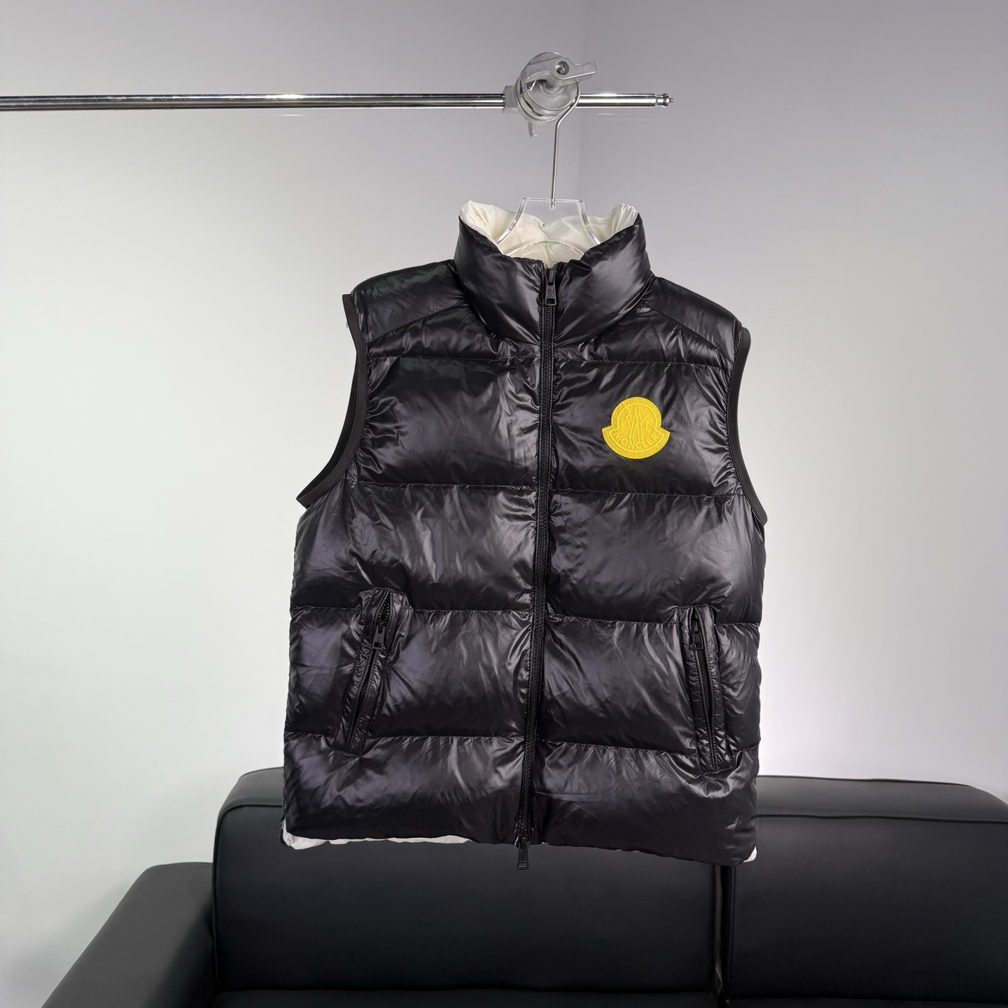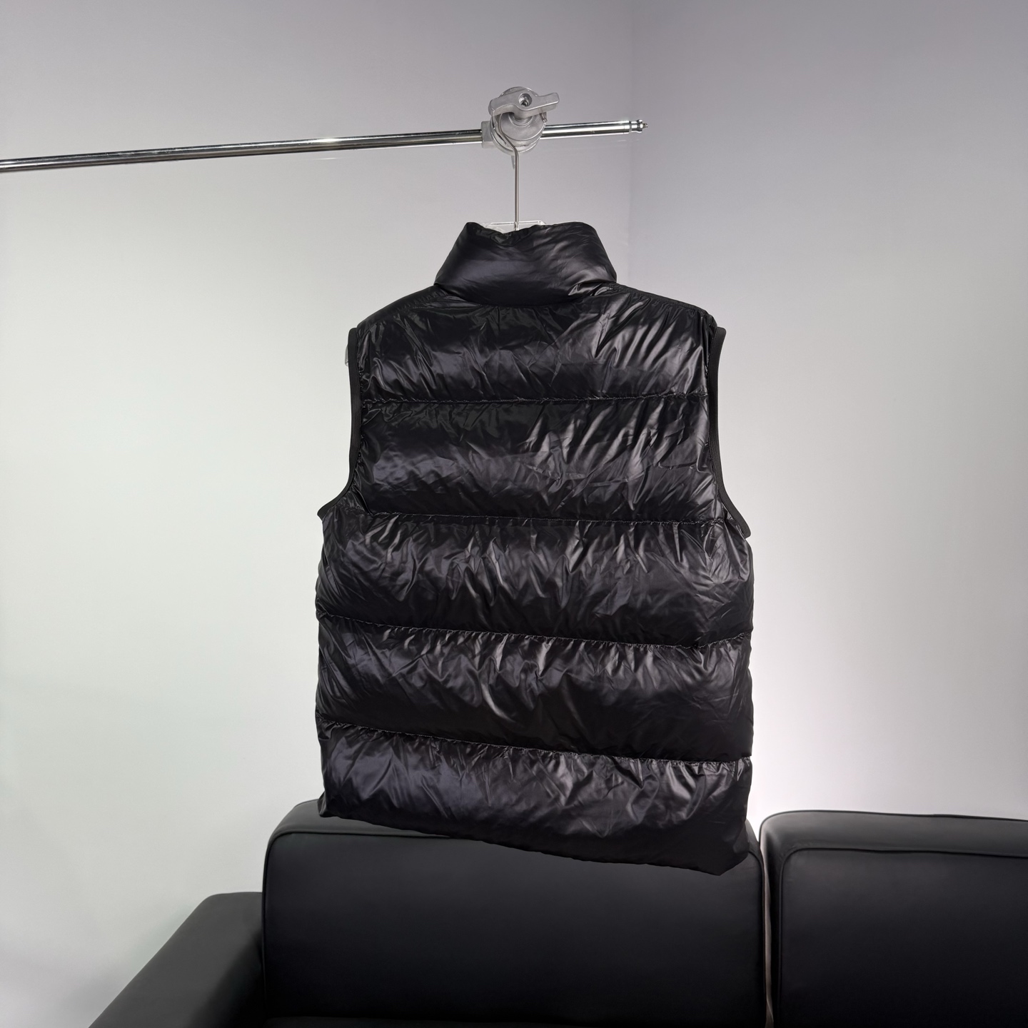 Details: Black shiny down vest, warm and practical, suitable for daily use