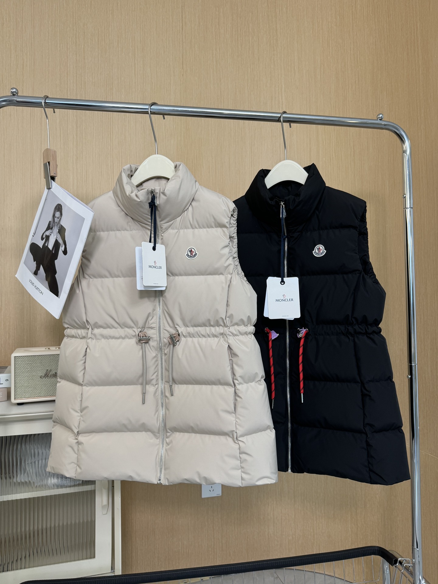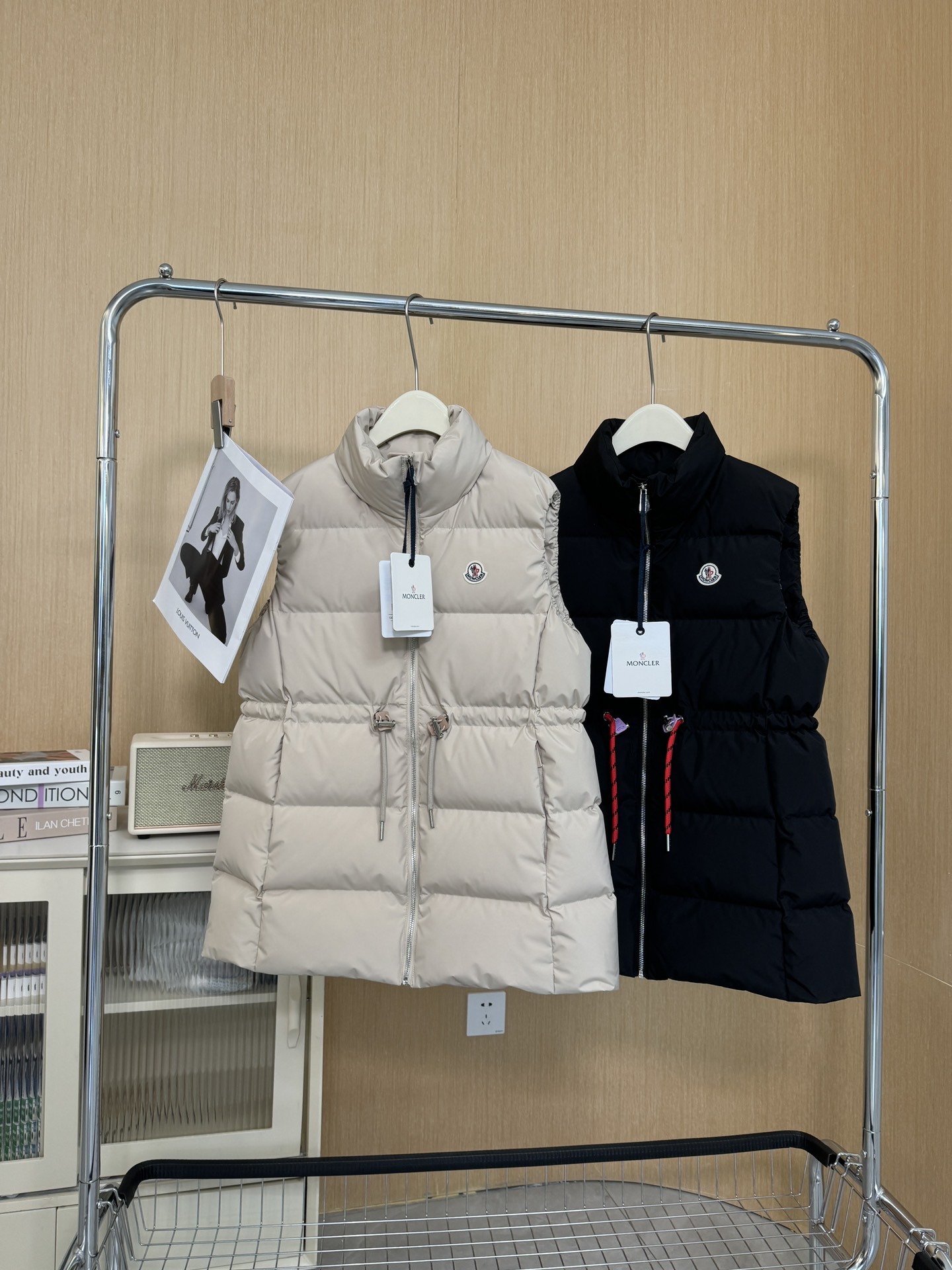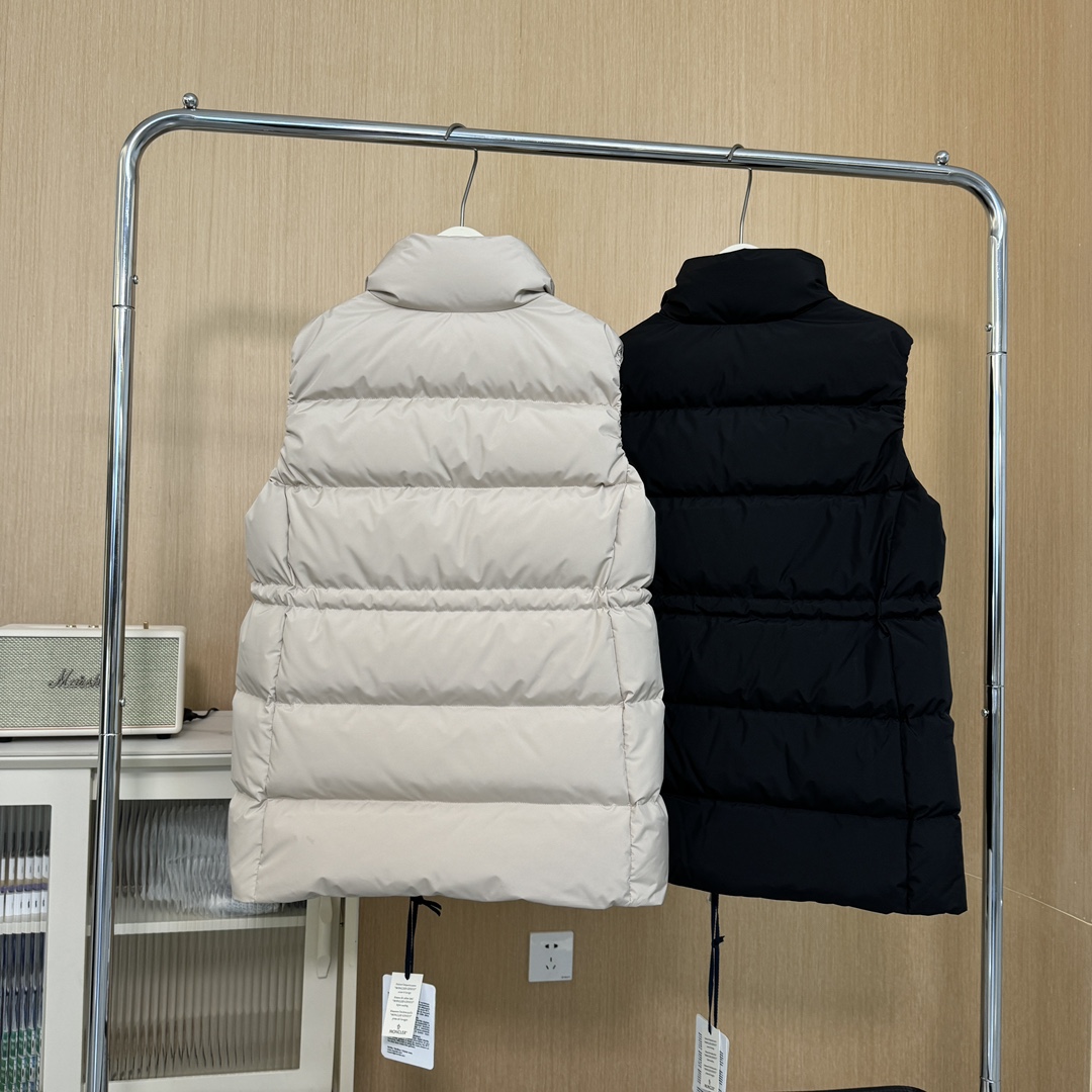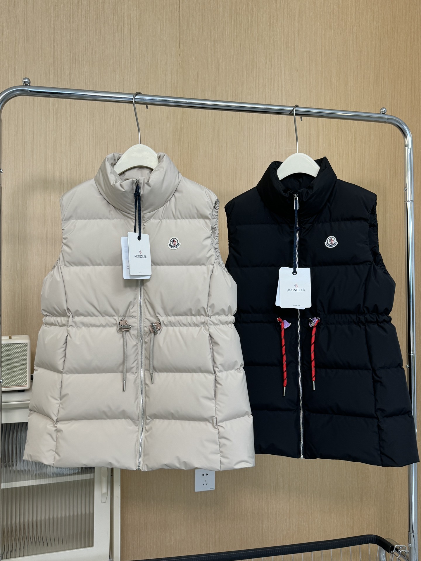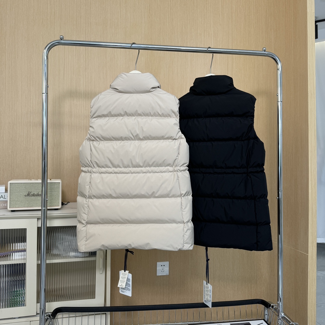 Details: Drawstring waist, stand - collar down vest available in black or white
